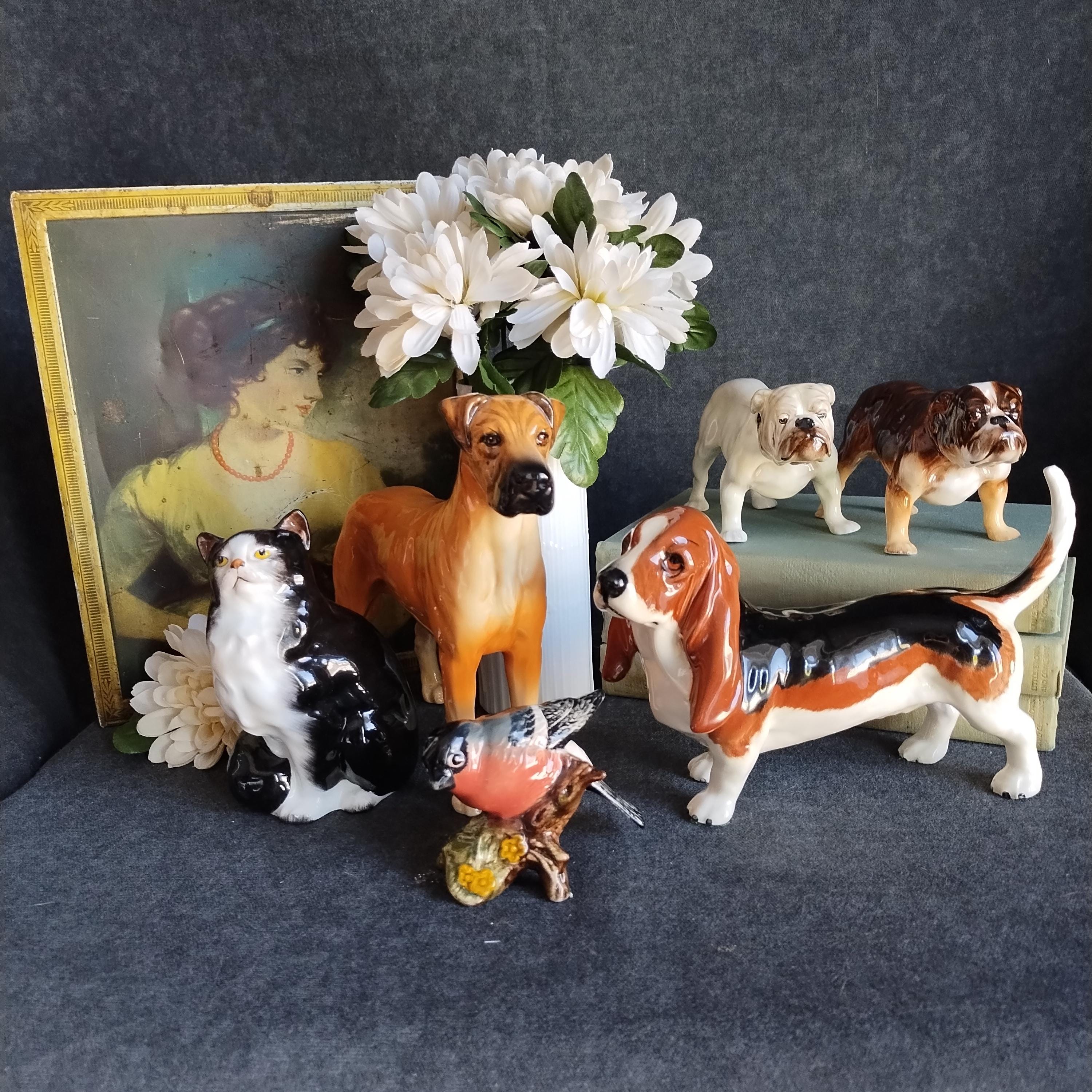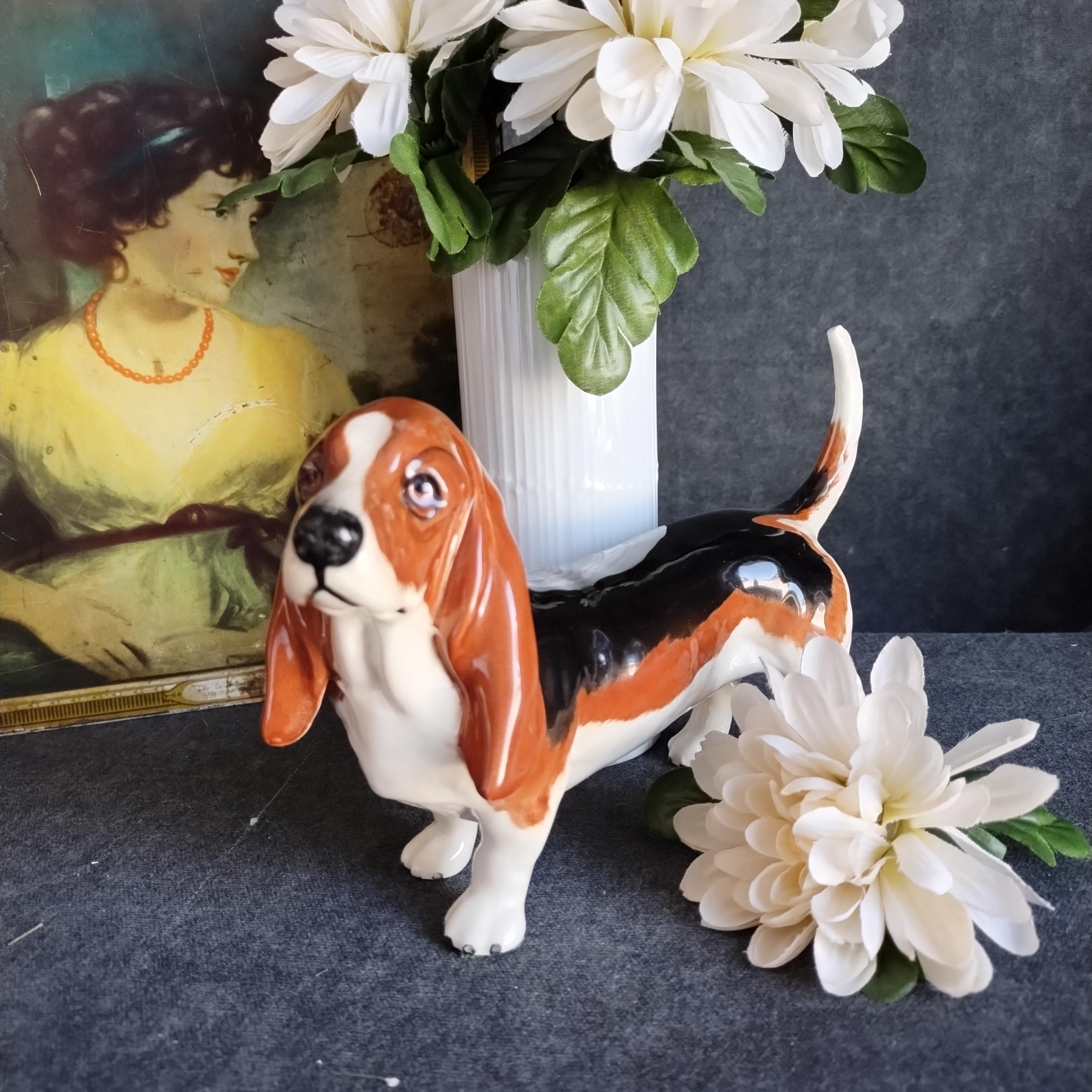 Beswick produced a series of pure breed dog figurines based on Champion Show Dogs. This is "Foncho Trinket" the Basset Hound. Tri color with a wonderful expressive face and those long velvet ears.