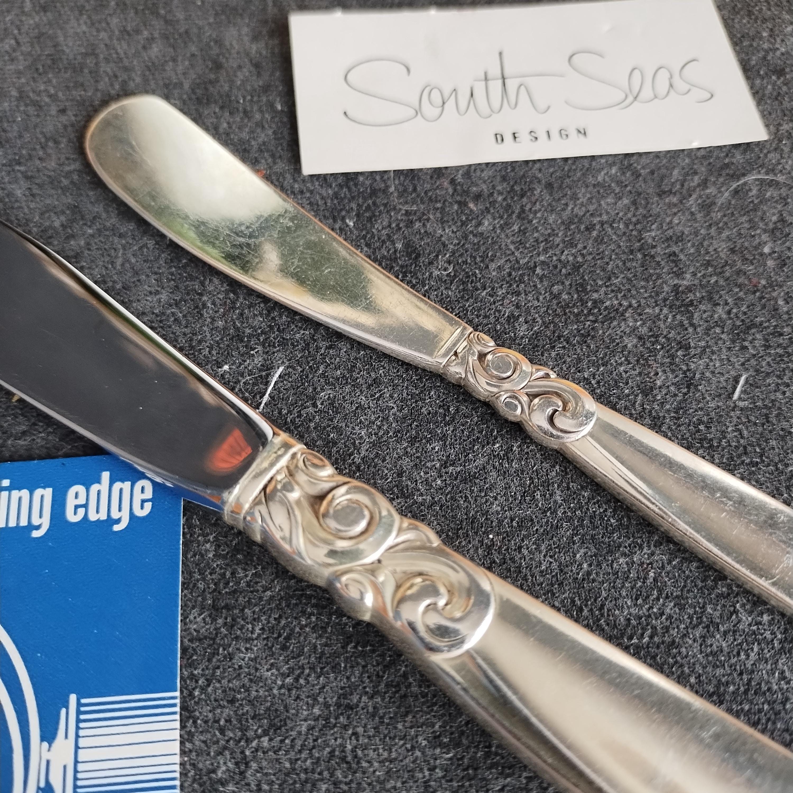 South Seas features a beautiful scroll design at the top of the handle which widens toward the base and is finished with an angle cut. Produced from 1955 to 1965, the design will appeal to both traditionalists and lovers of MCM. Sets are in good used condition with surface scratches consistent with age and gentle use. Hand washing is recommended to maintain the beauty of silverplate. All pieces are freshly polished and ziploc sealed to minimize tarnishing.
