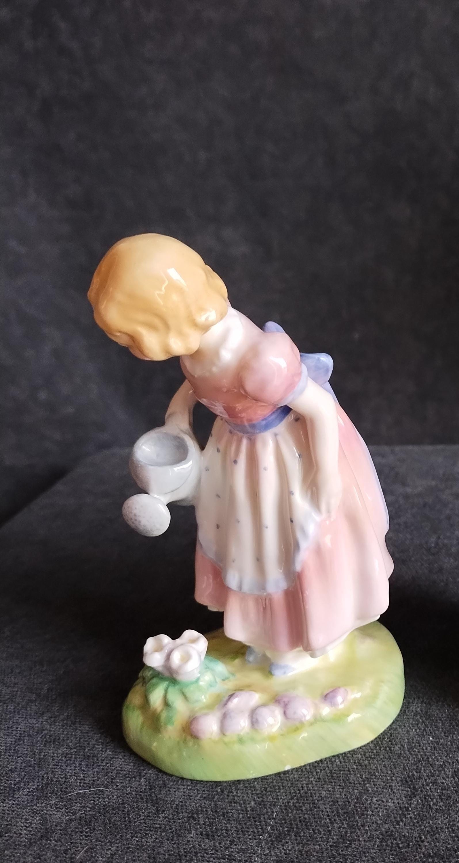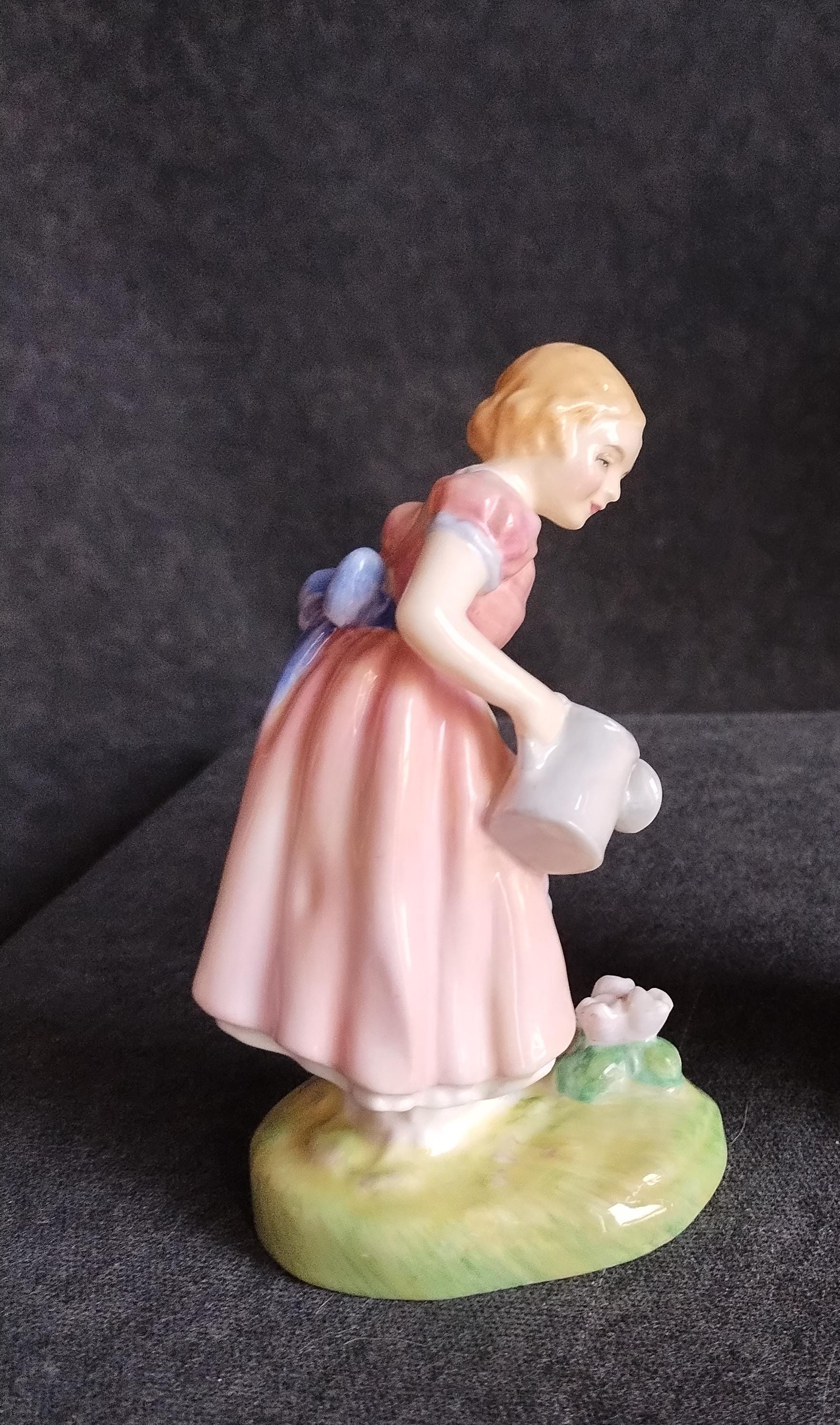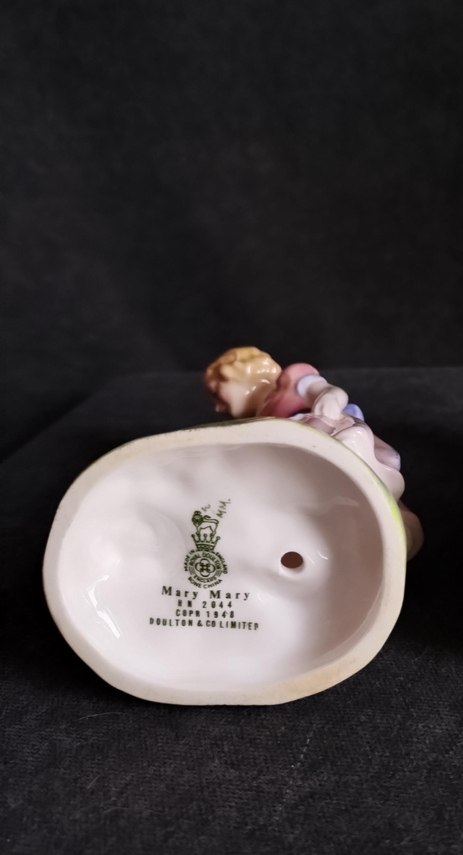 Charming Doulton from the original Nursery Rhyme series. Mary is watering some purple crocus wearing a pink dress and polka-dot apron. Featured on a grass green base marked underneath with the Royal Doulton crown and lion mark.