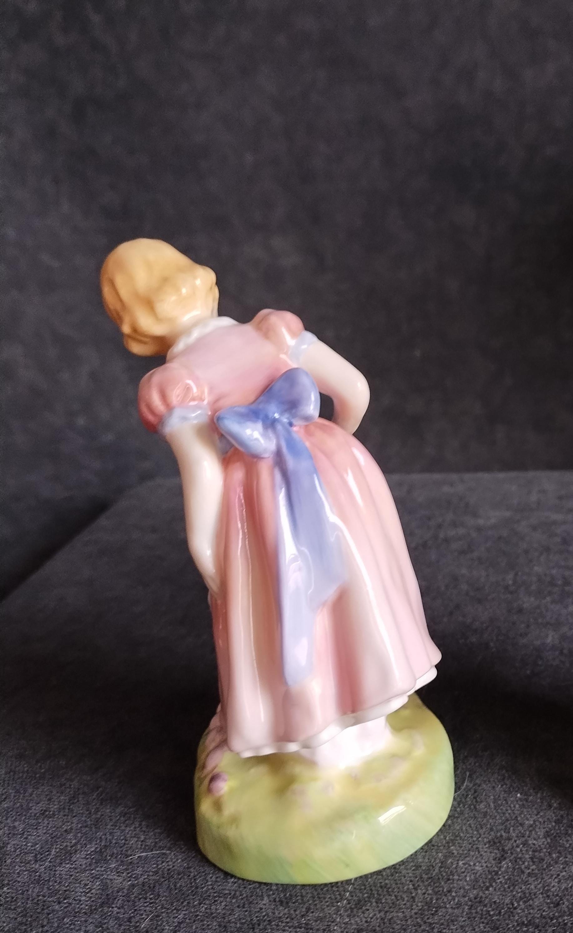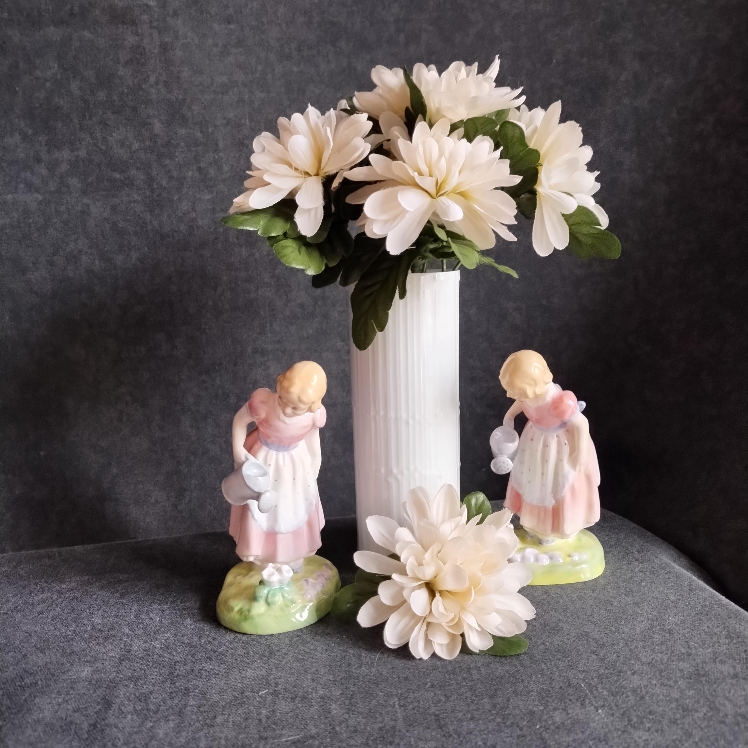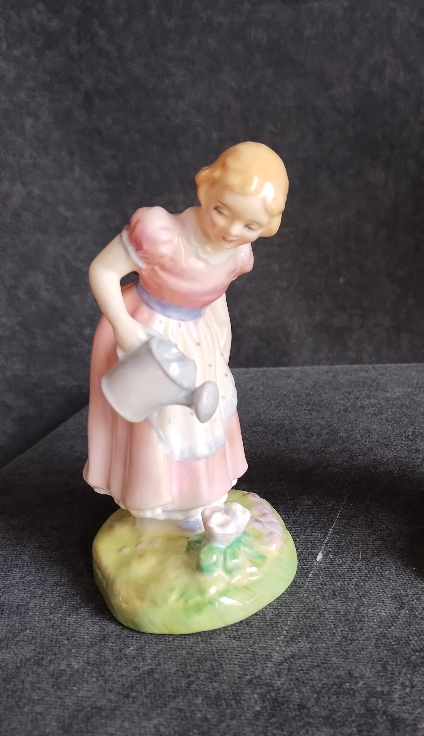 Charming Doulton from the original Nursery Rhyme series. Mary is watering some purple crocus wearing a pink dress and polka-dot apron. Featured on a grass green base marked underneath with the Royal Doulton crown and lion mark.
