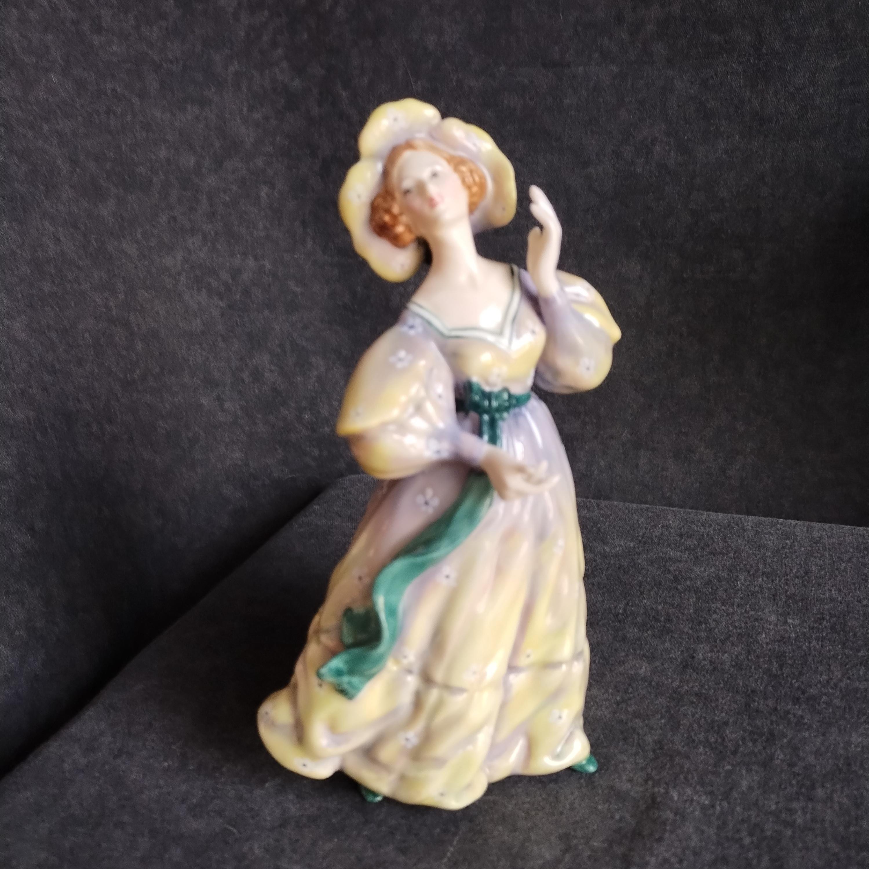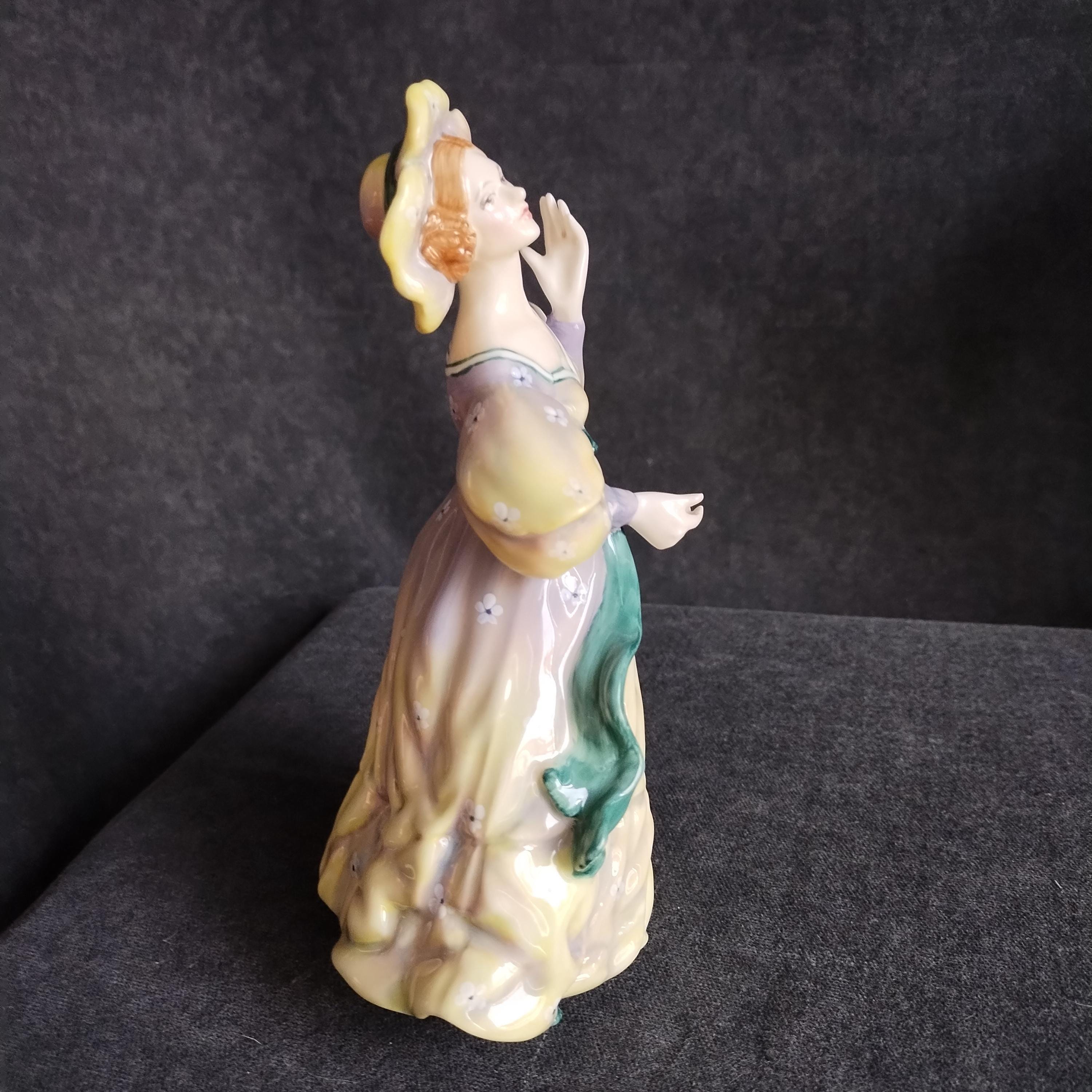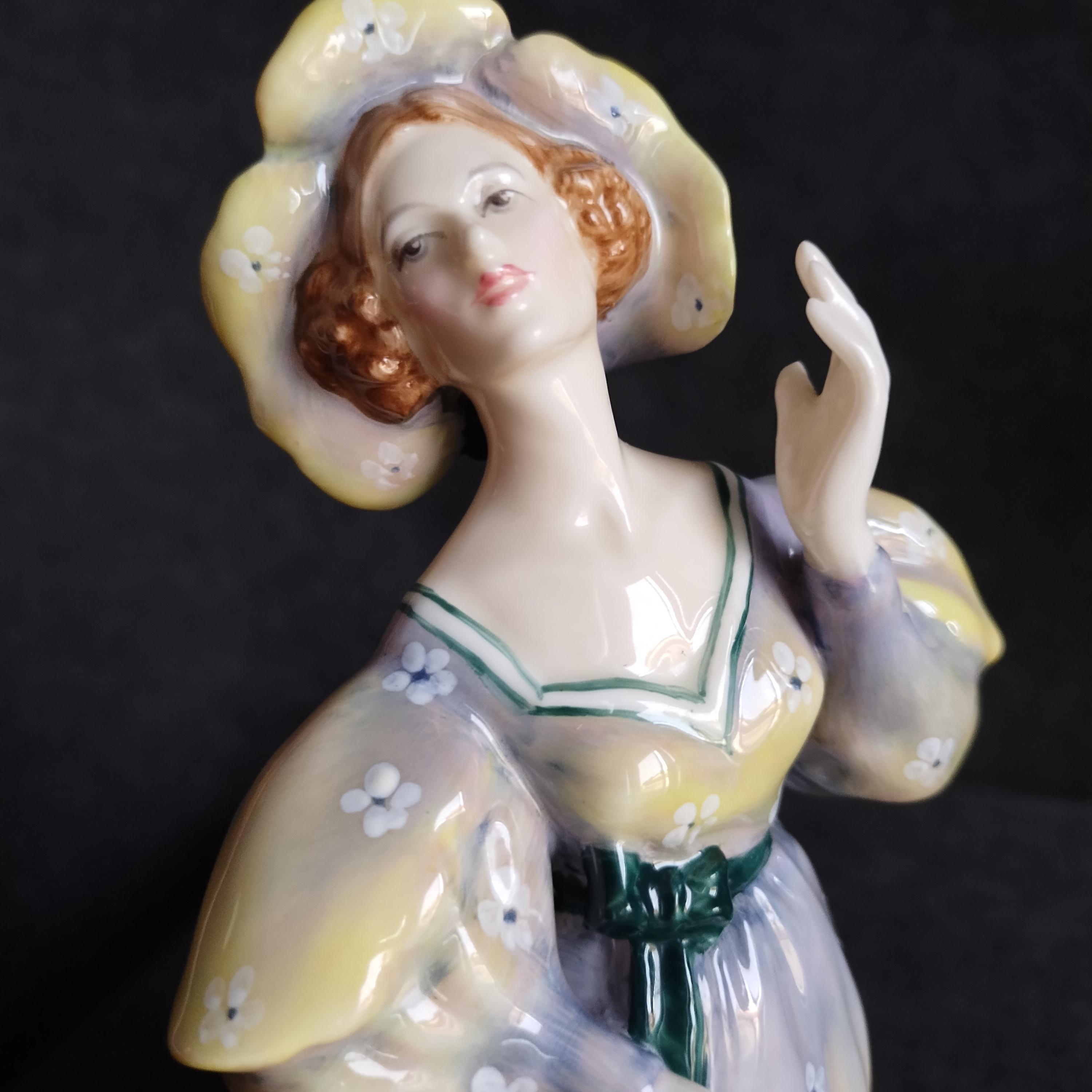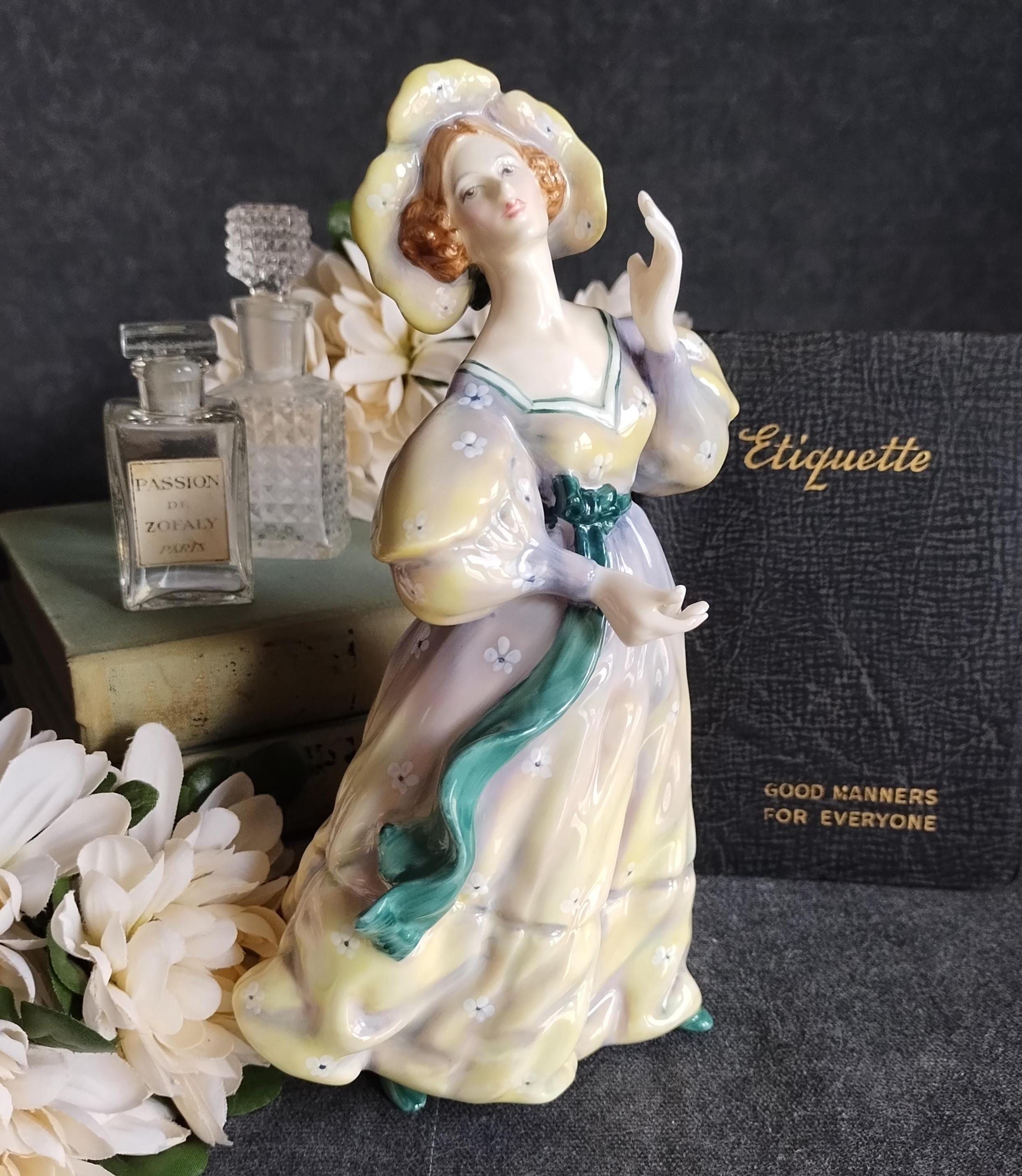 A rare redhead in flowing two-tone gown with tiny delicate flowers and trim and matching hat and gloves. Royal Doulton "Grand Manner" features the incredible hand painted detail of the 1940s productions in a newer production piece.