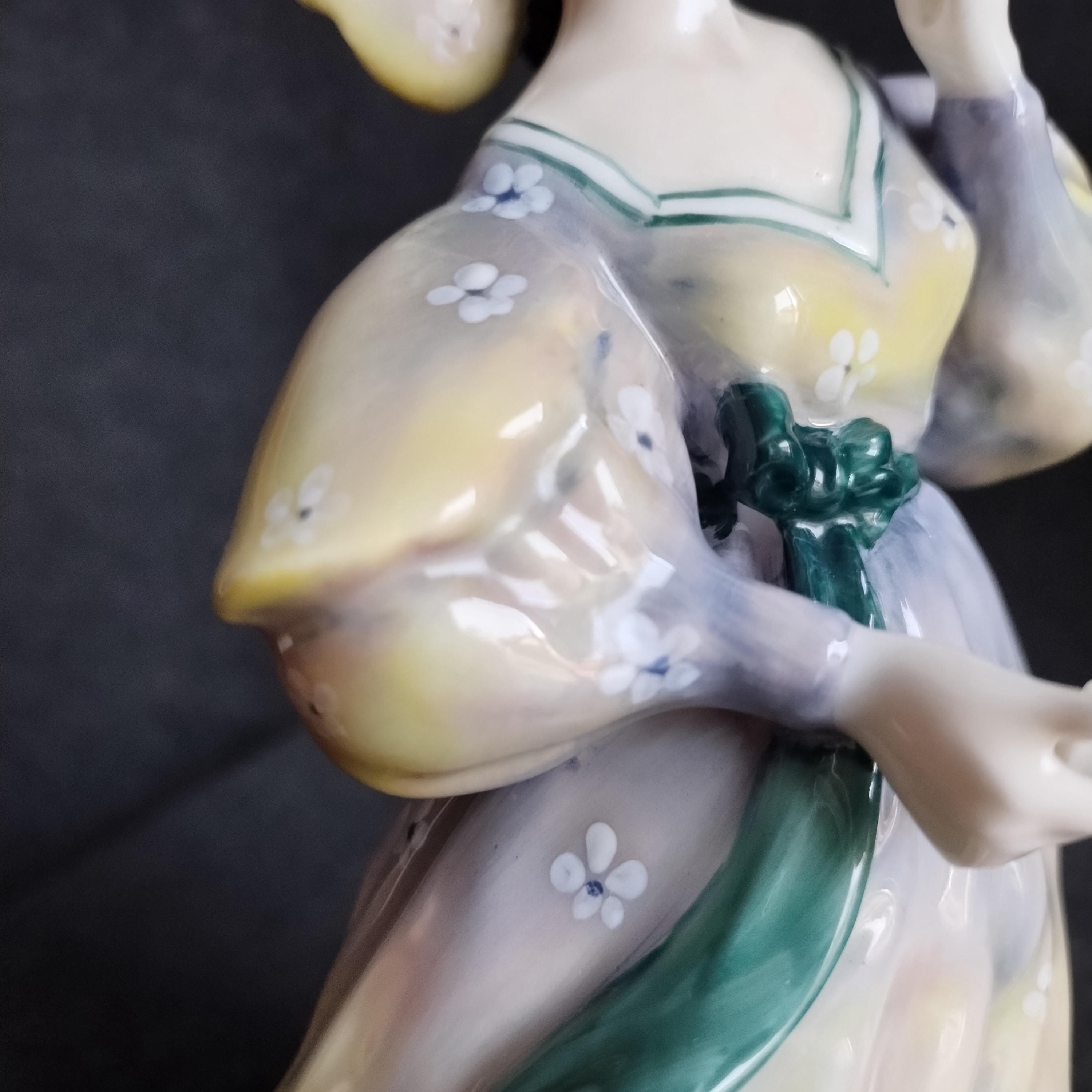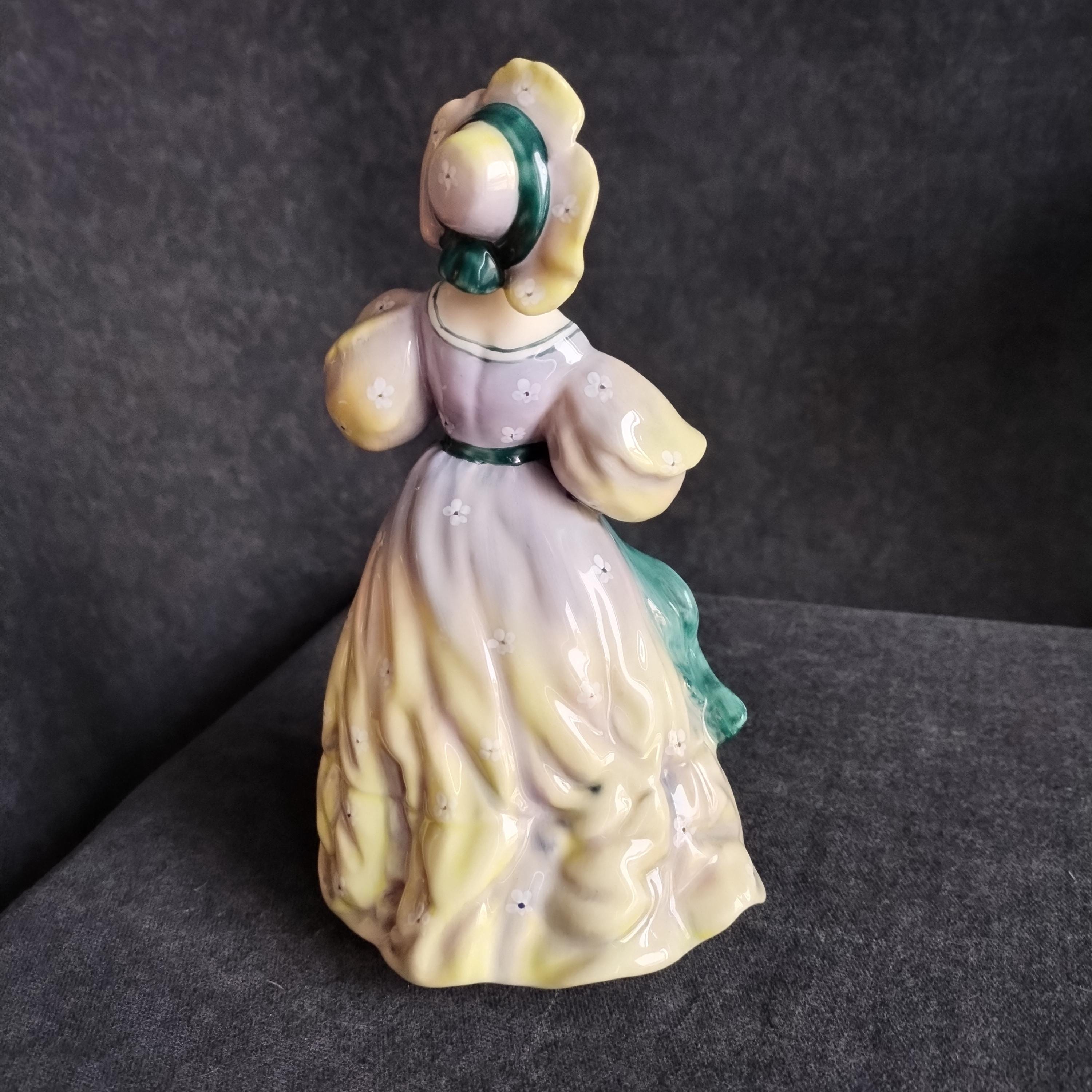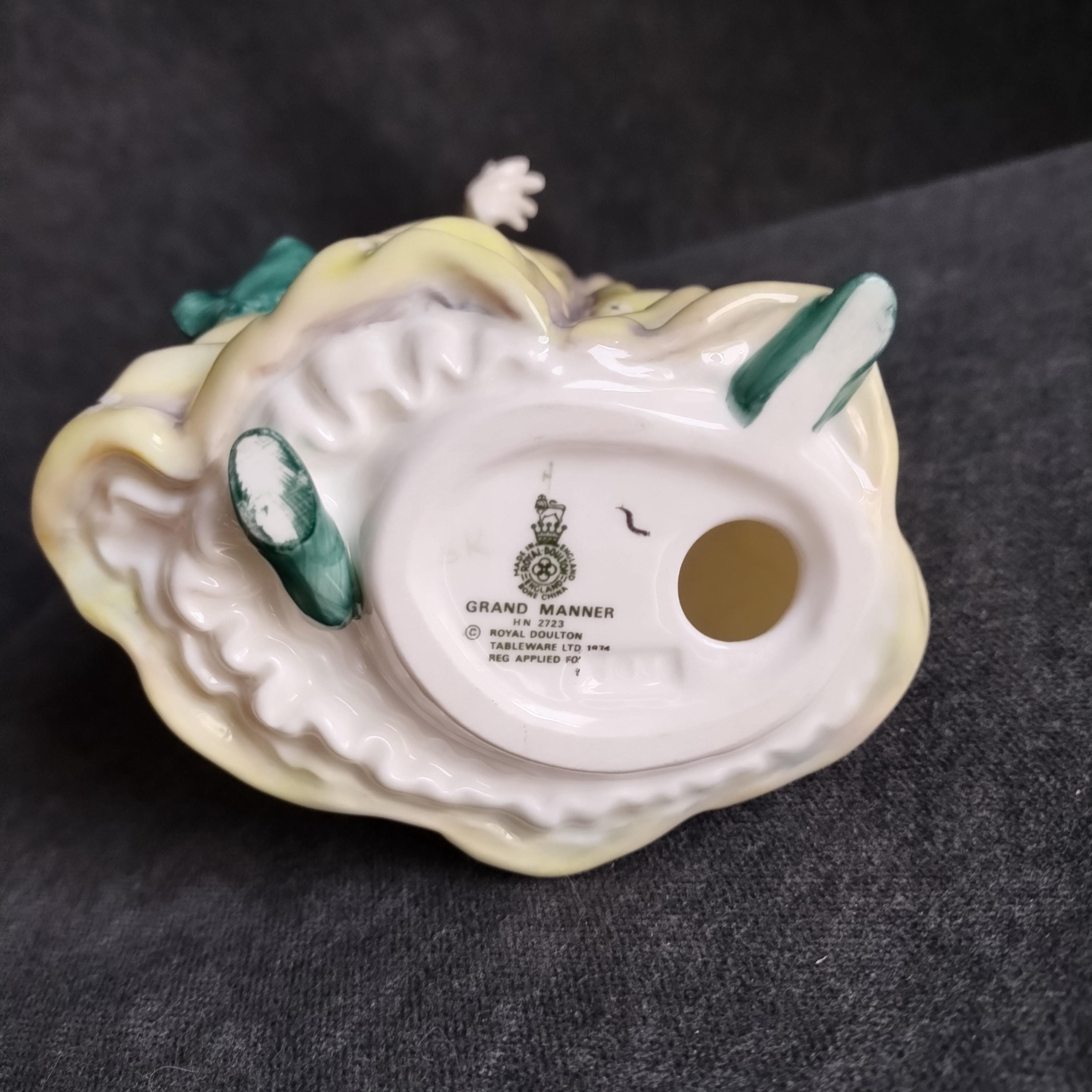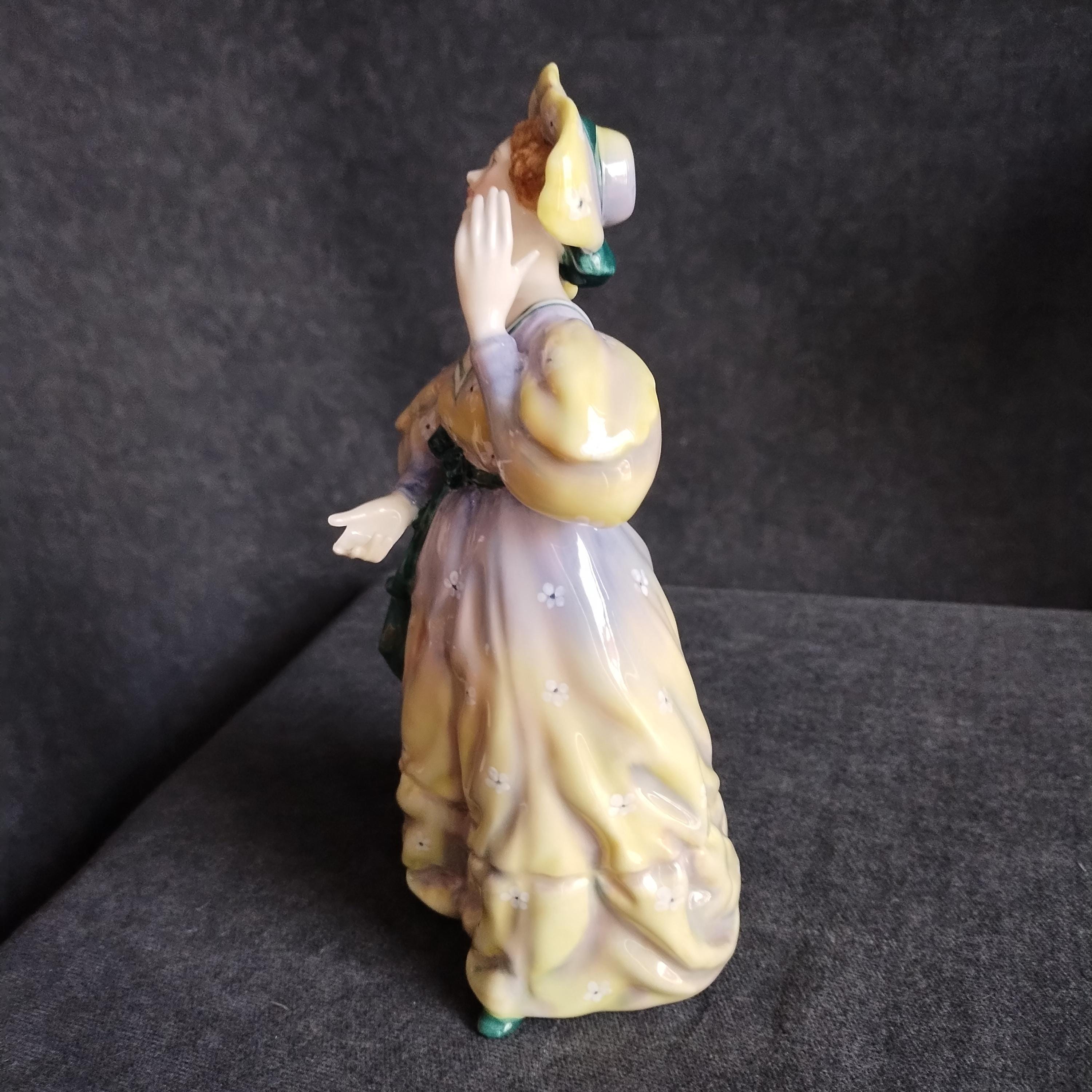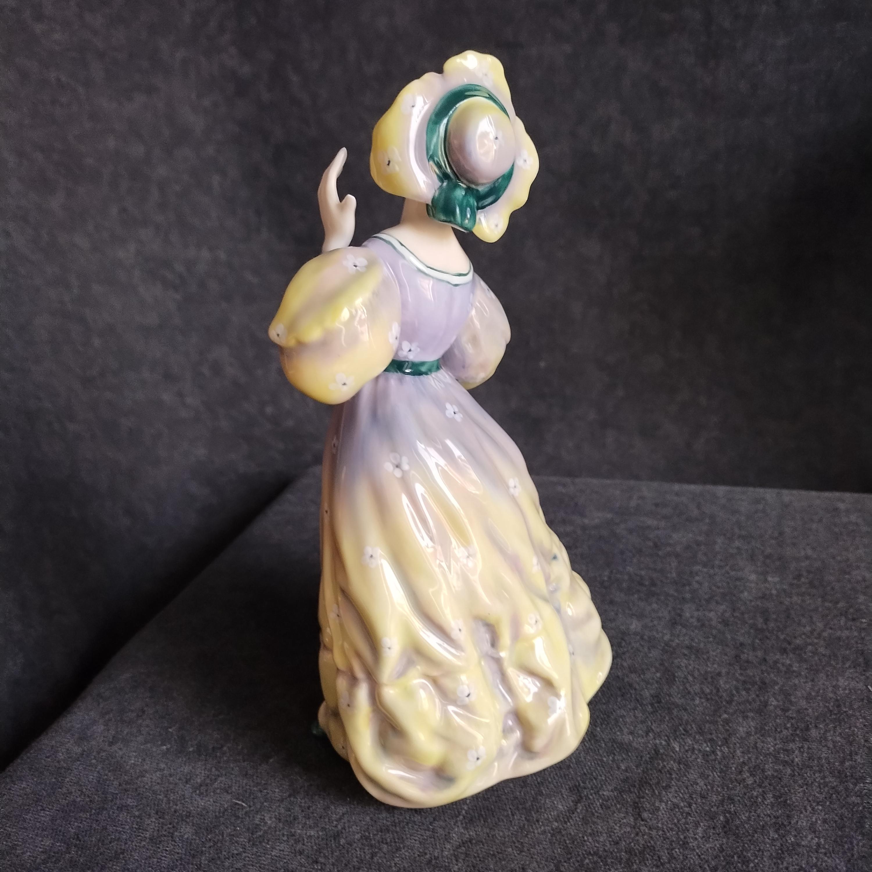 A rare redhead in flowing two-tone gown with tiny delicate flowers and trim and matching hat and gloves. Royal Doulton "Grand Manner" features the incredible hand painted detail of the 1940s productions in a newer production piece.