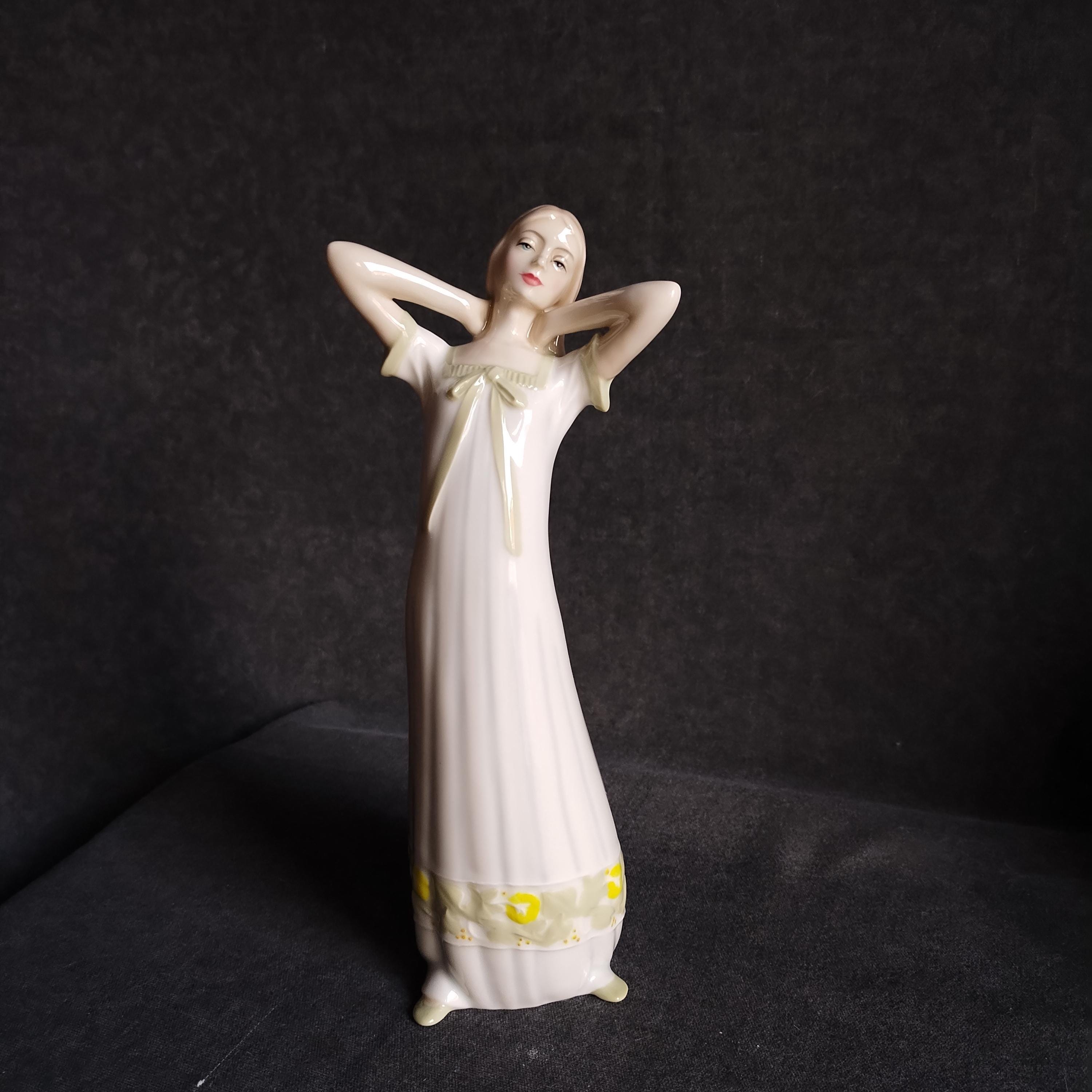 Fantastic Art Nouveau style 12 inch tall "Daybreak" by Royal Doulton. The long, slender shape and pastel colour pallet are typical of the "Reflections" series. Daybreak is wearing a long nightgown adorned with a bright floral band at the hemline. You can feel the release as she stretches her arms to welcome the new day. Each figurine is hand painted and unique. Perfectly suited as a statement piece or as part of a collection.