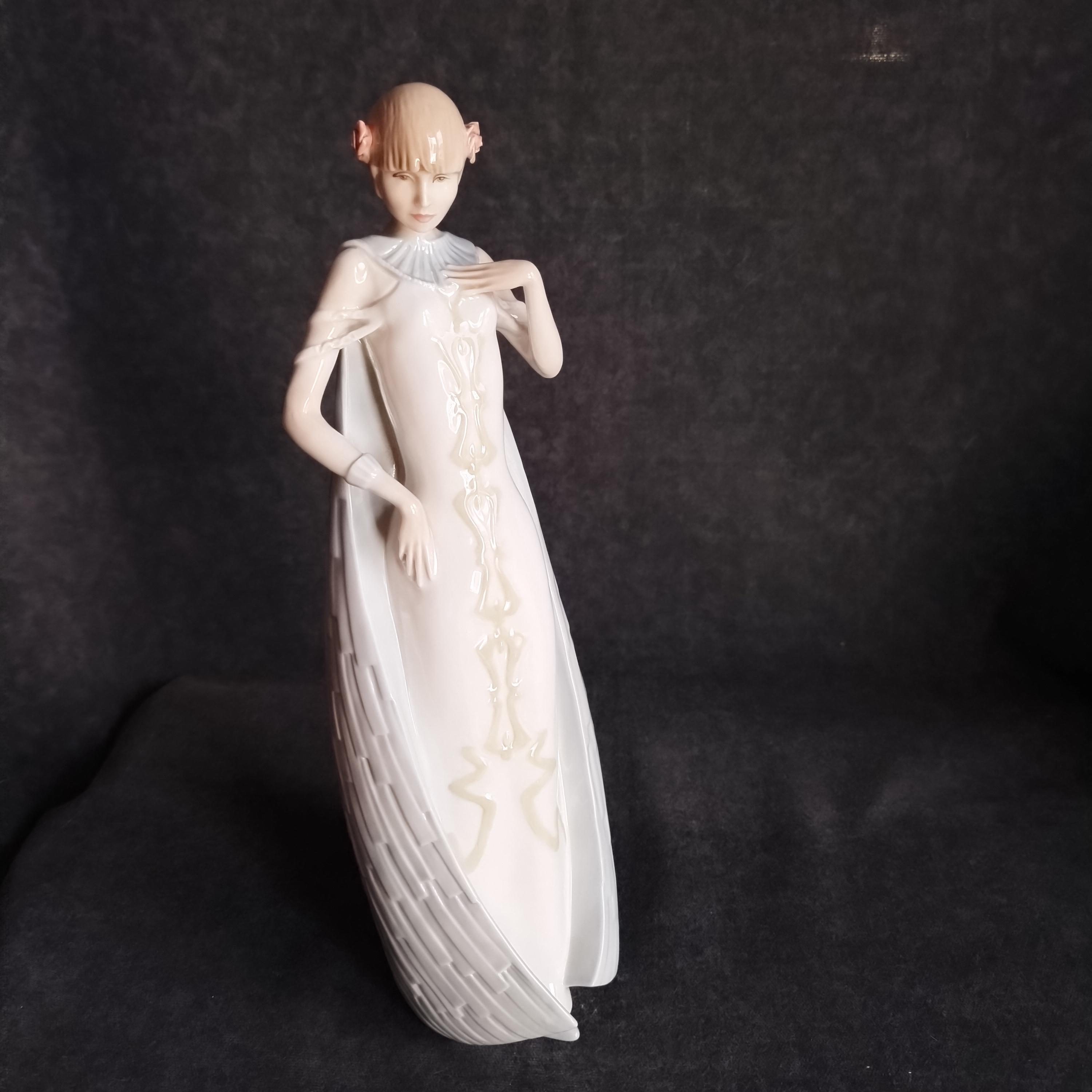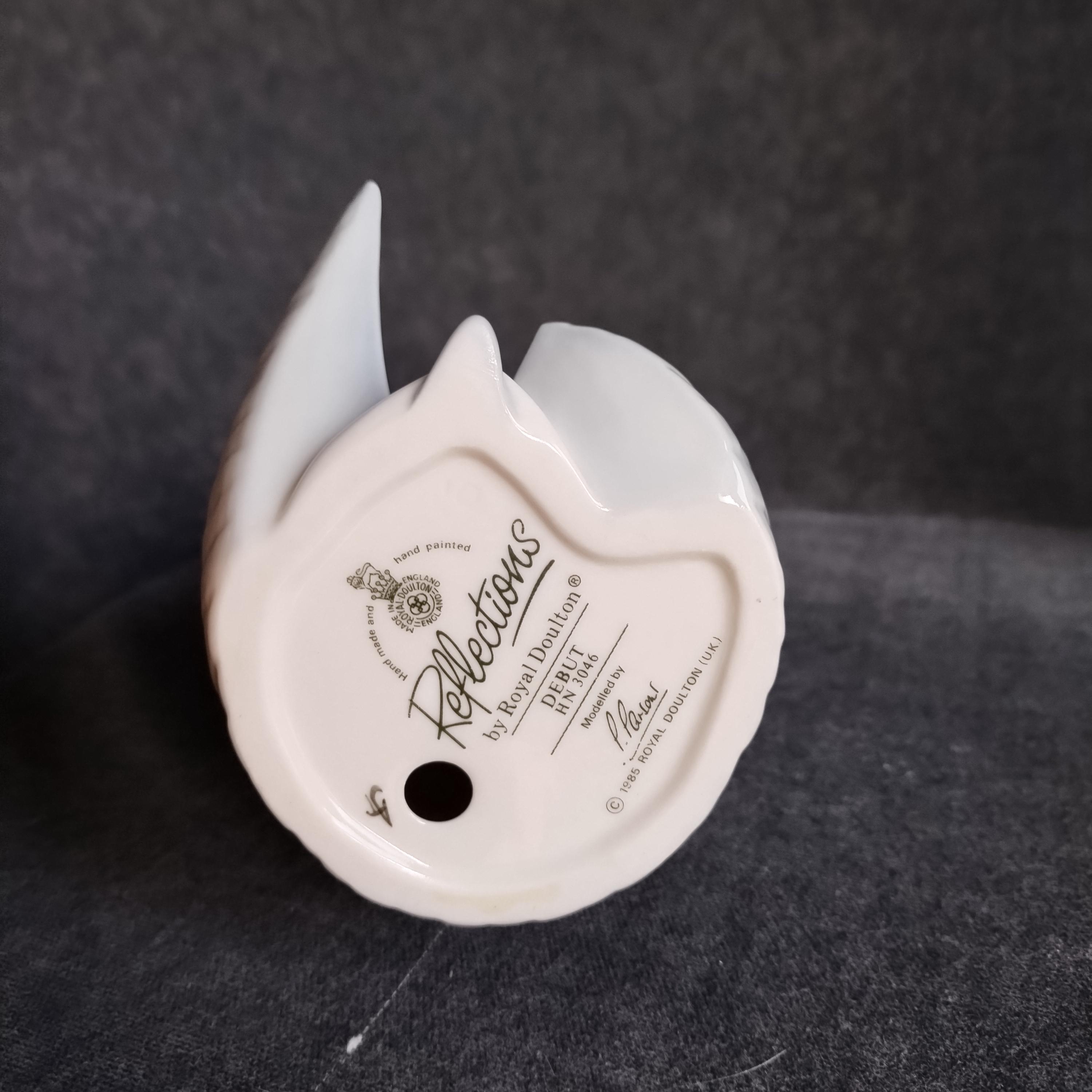 Fantastic Art Nouveau style 12 inch tall "Debut" by Royal Doulton. The long, slender shape and pastel colour pallet are typical of the "Reflections" series. Debut features a bob haistyle with long bangs adorned with two roses and the most amazing cape draped over her slightly sassy pose. Each figurine is hand painted and unique. Perfectly suited as a statement piece or as part of a collection.