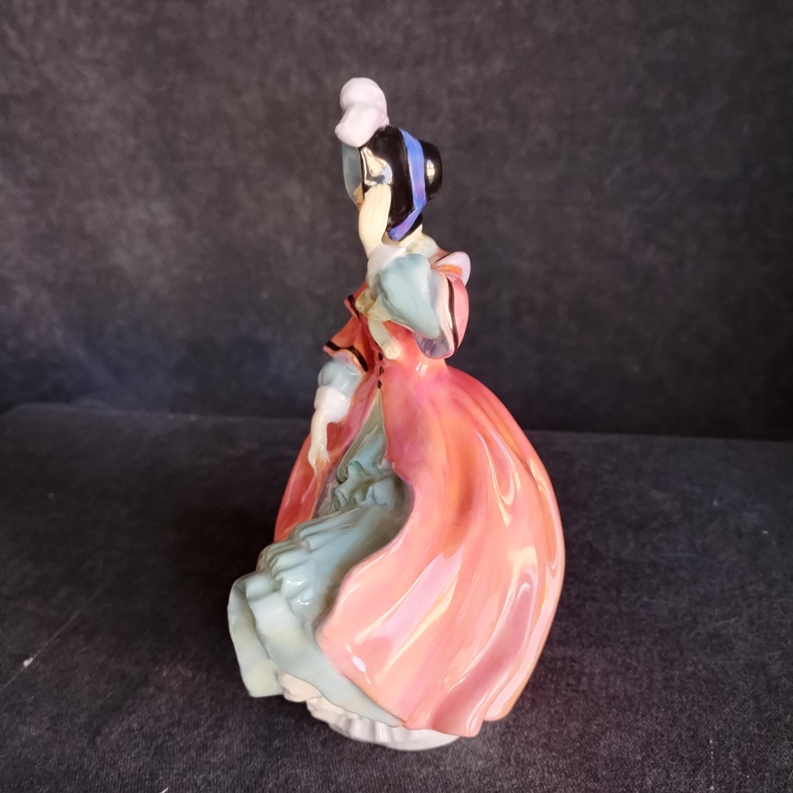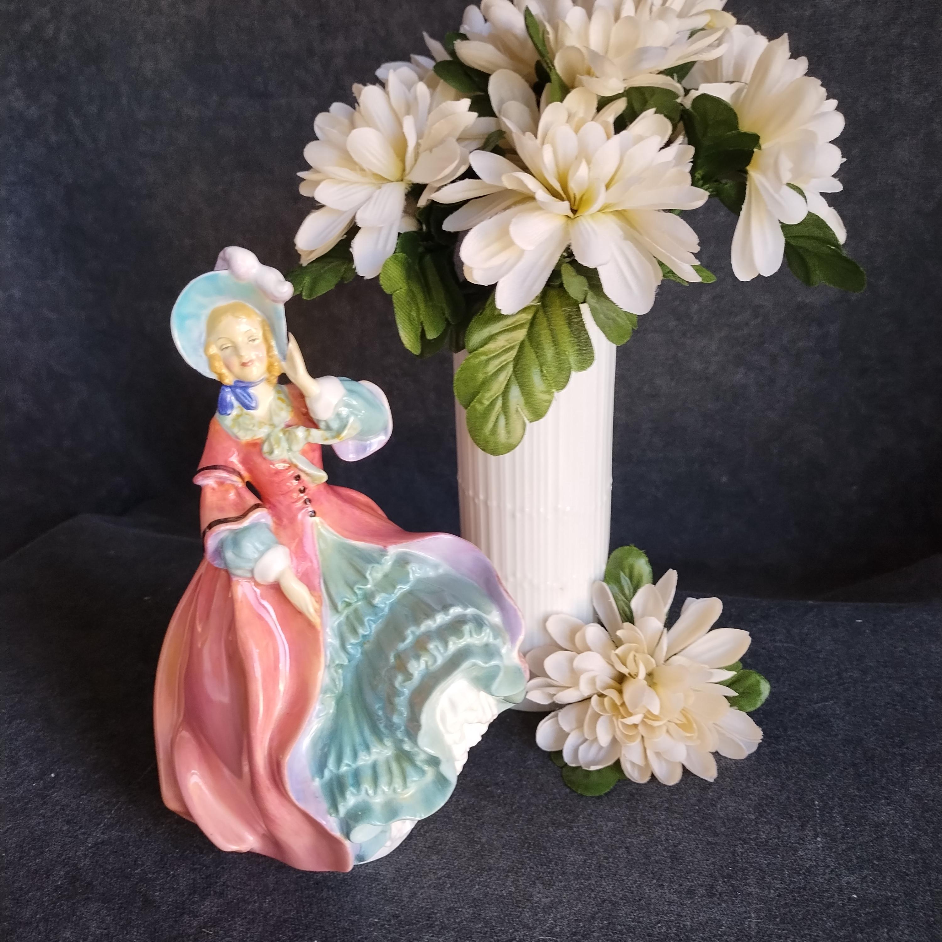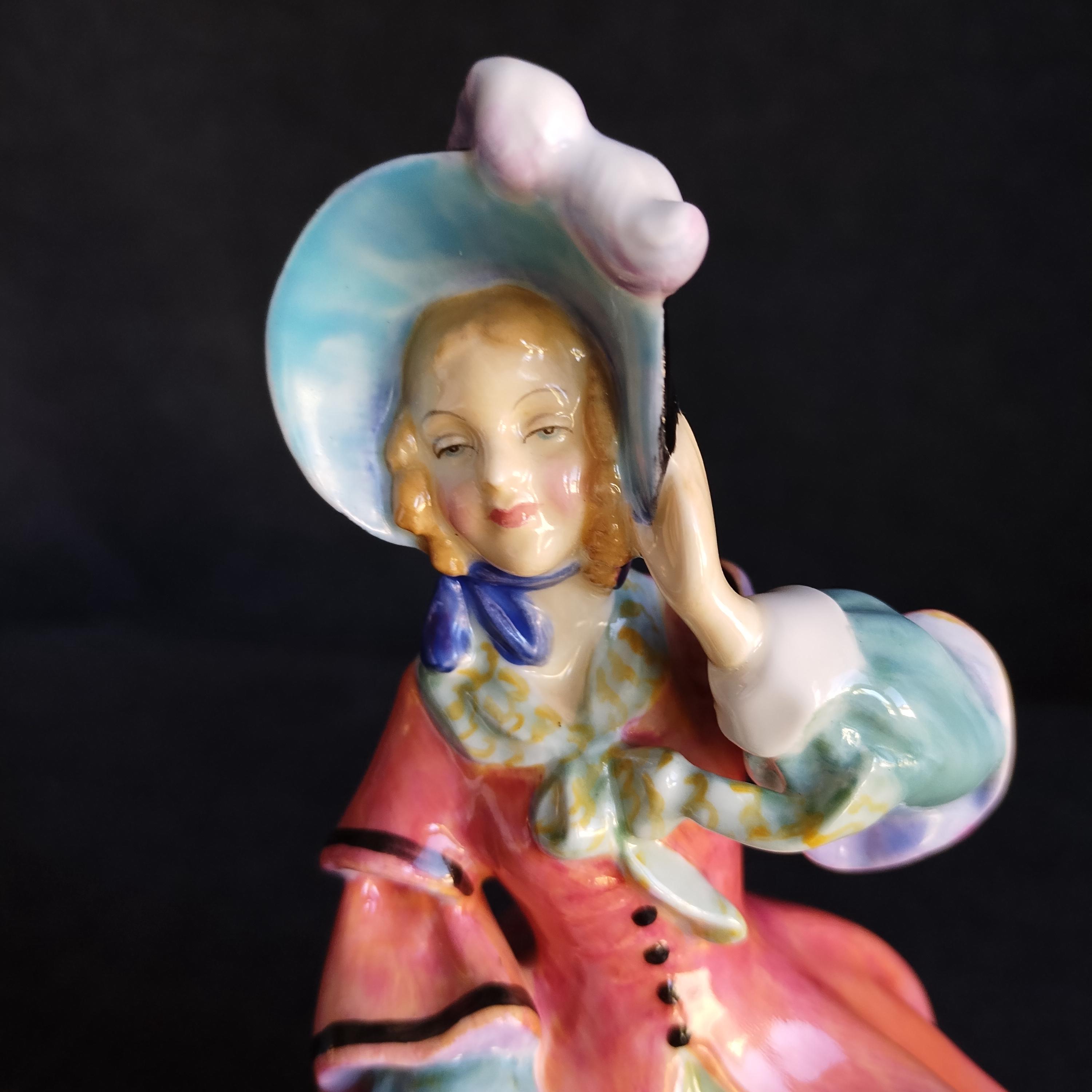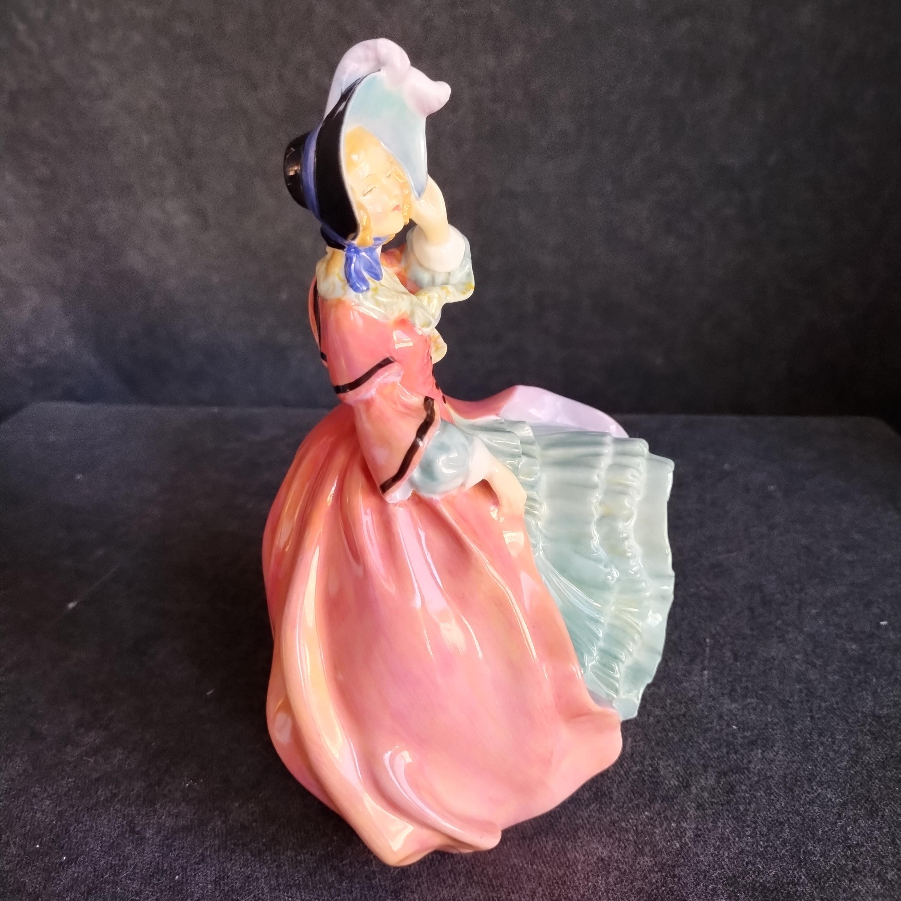 You can picture this Royal Doulton figure out for a stroll in the crisp air of an early spring morning. Warm sun shining but a strong breeze catching her skirt. Very early production of this design.
