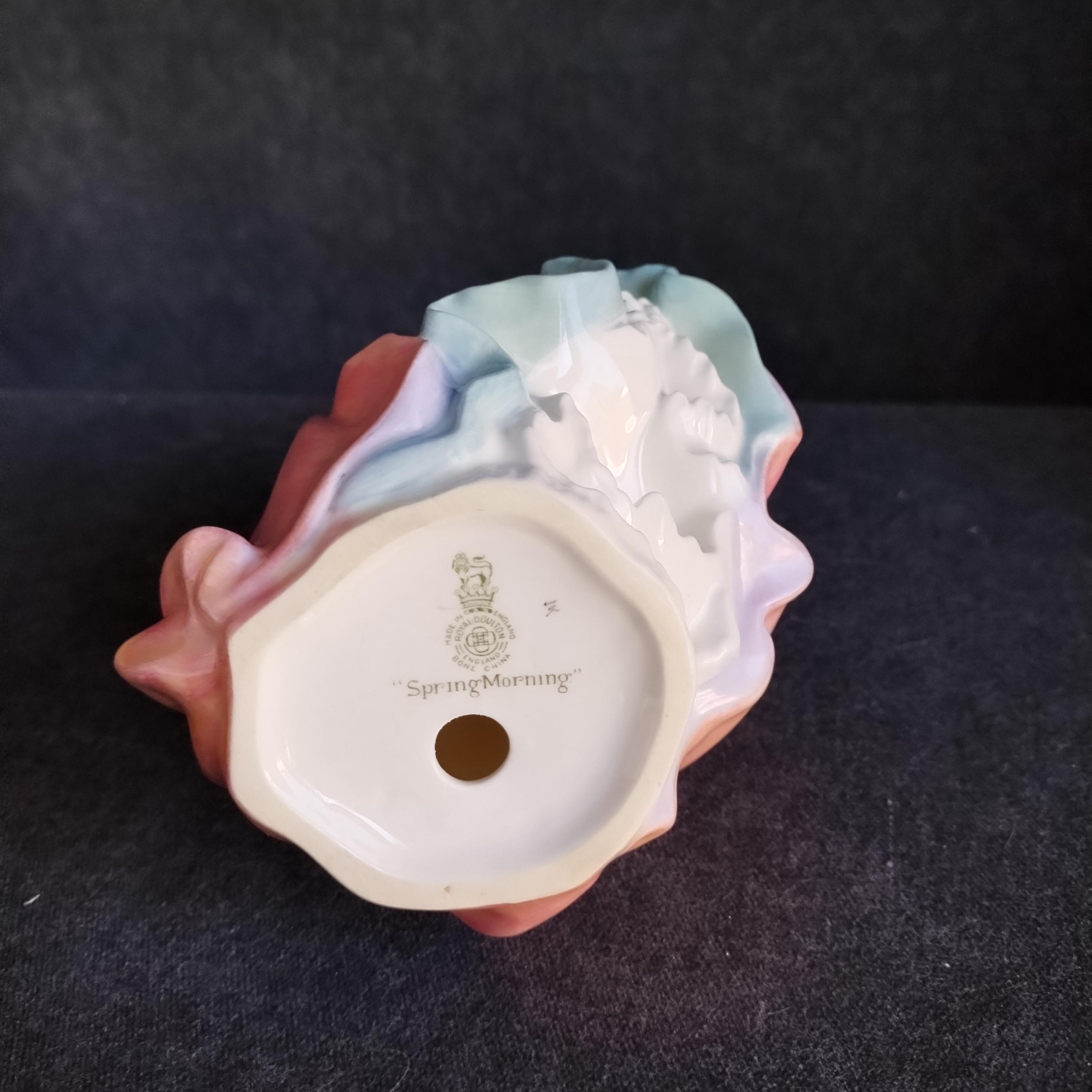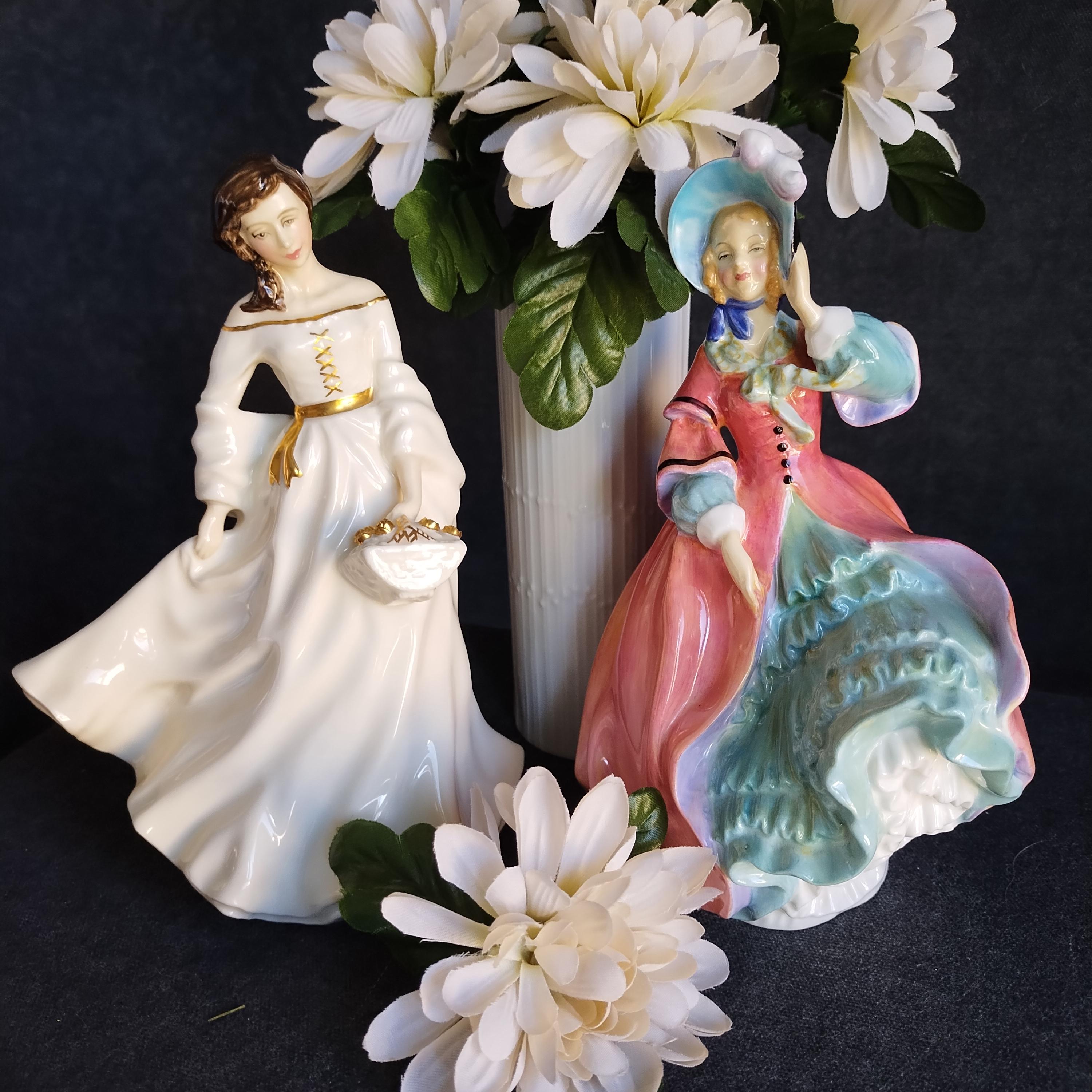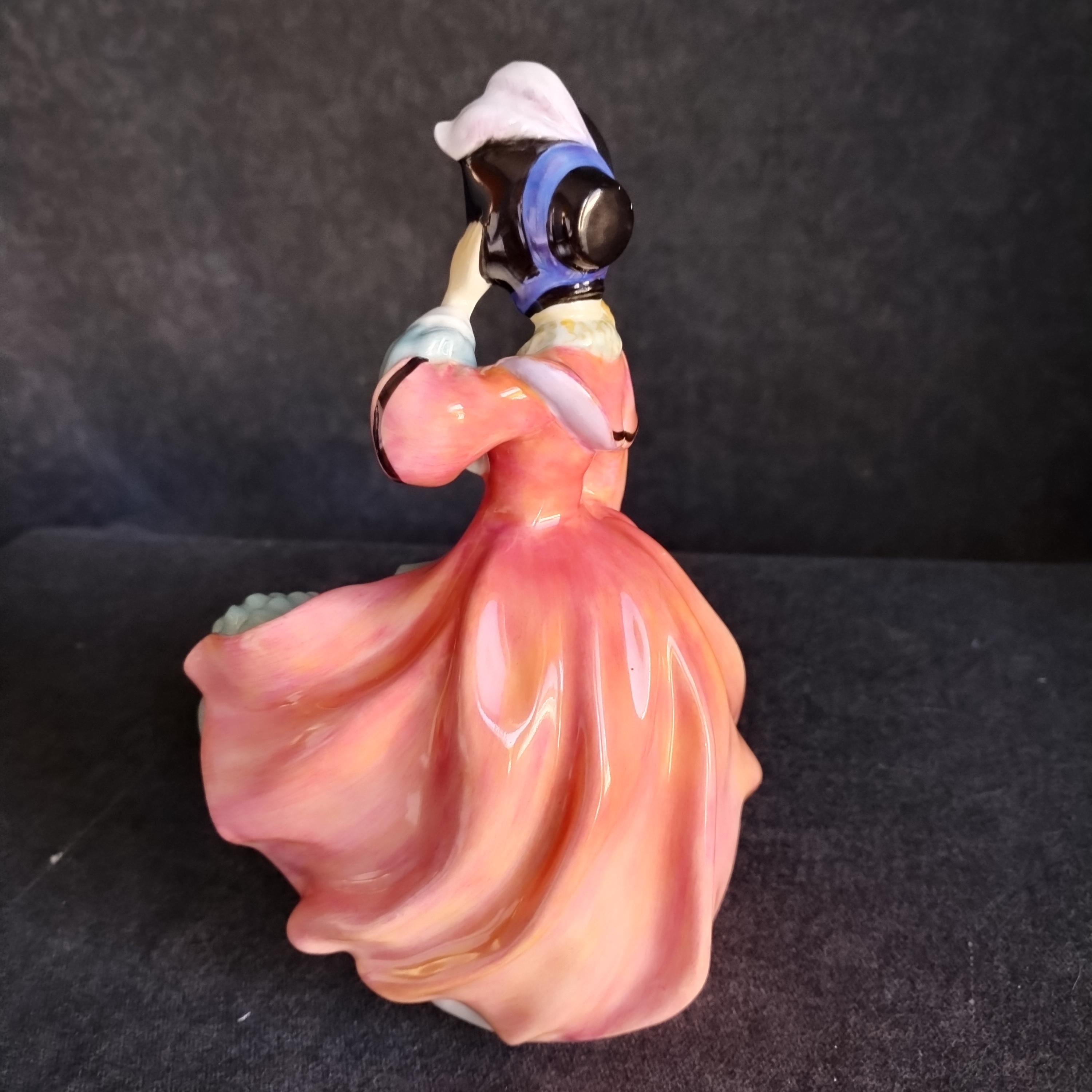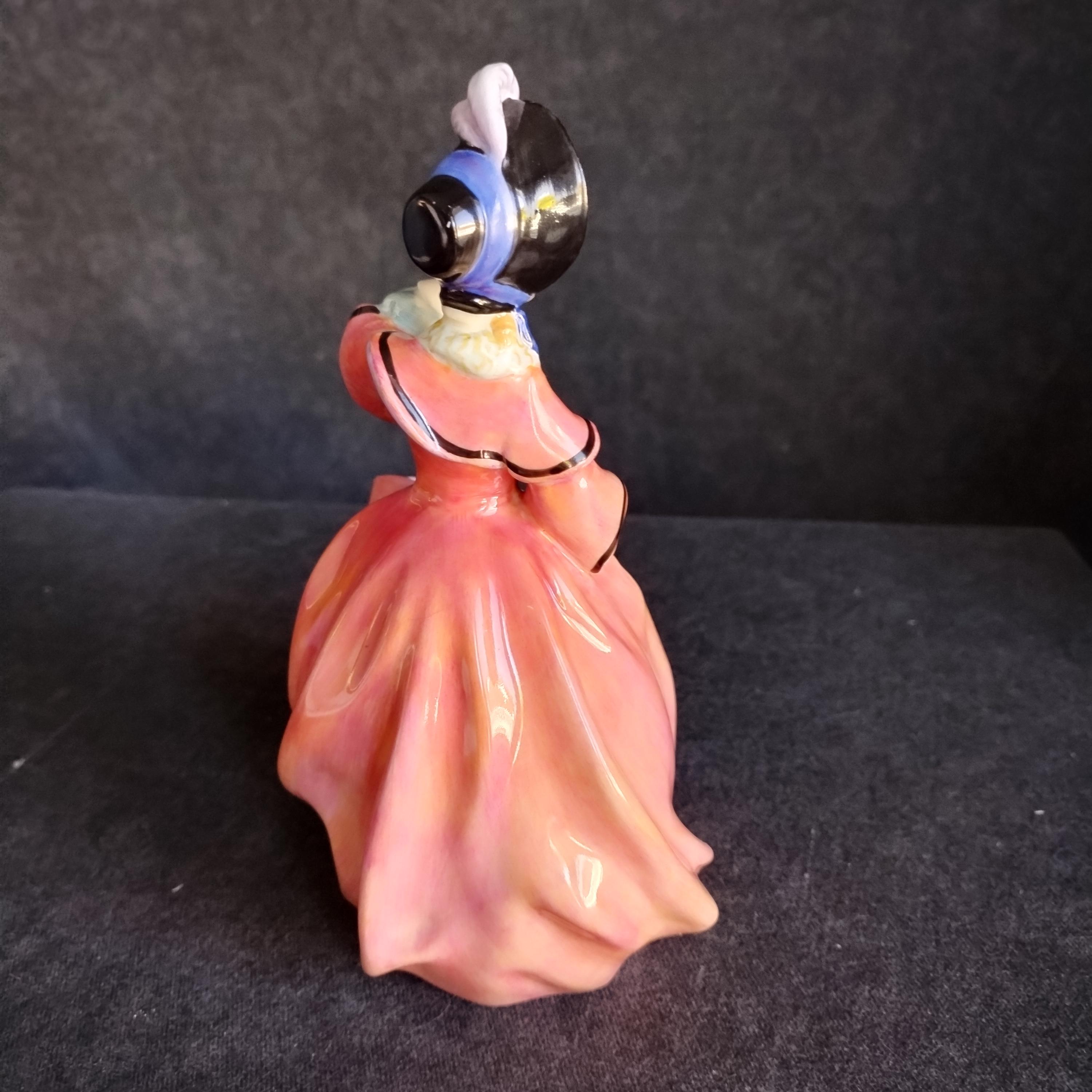 You can picture this Royal Doulton figure out for a stroll in the crisp air of an early spring morning. Warm sun shining but a strong breeze catching her skirt. Very early production of this design.