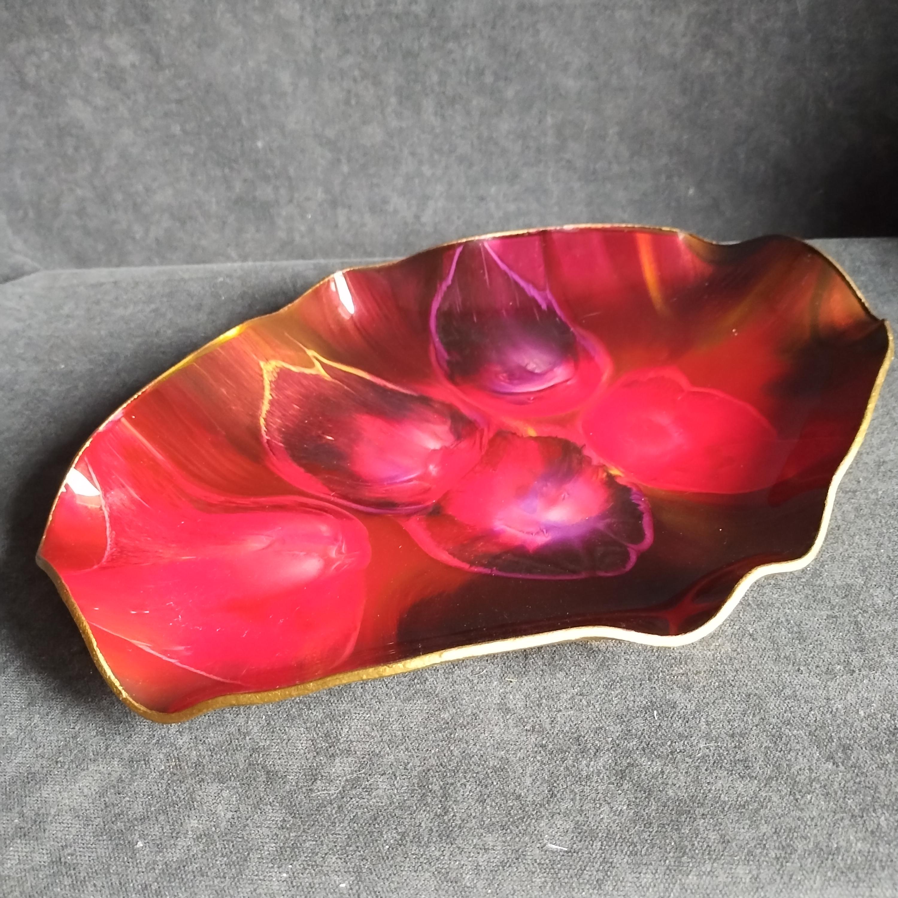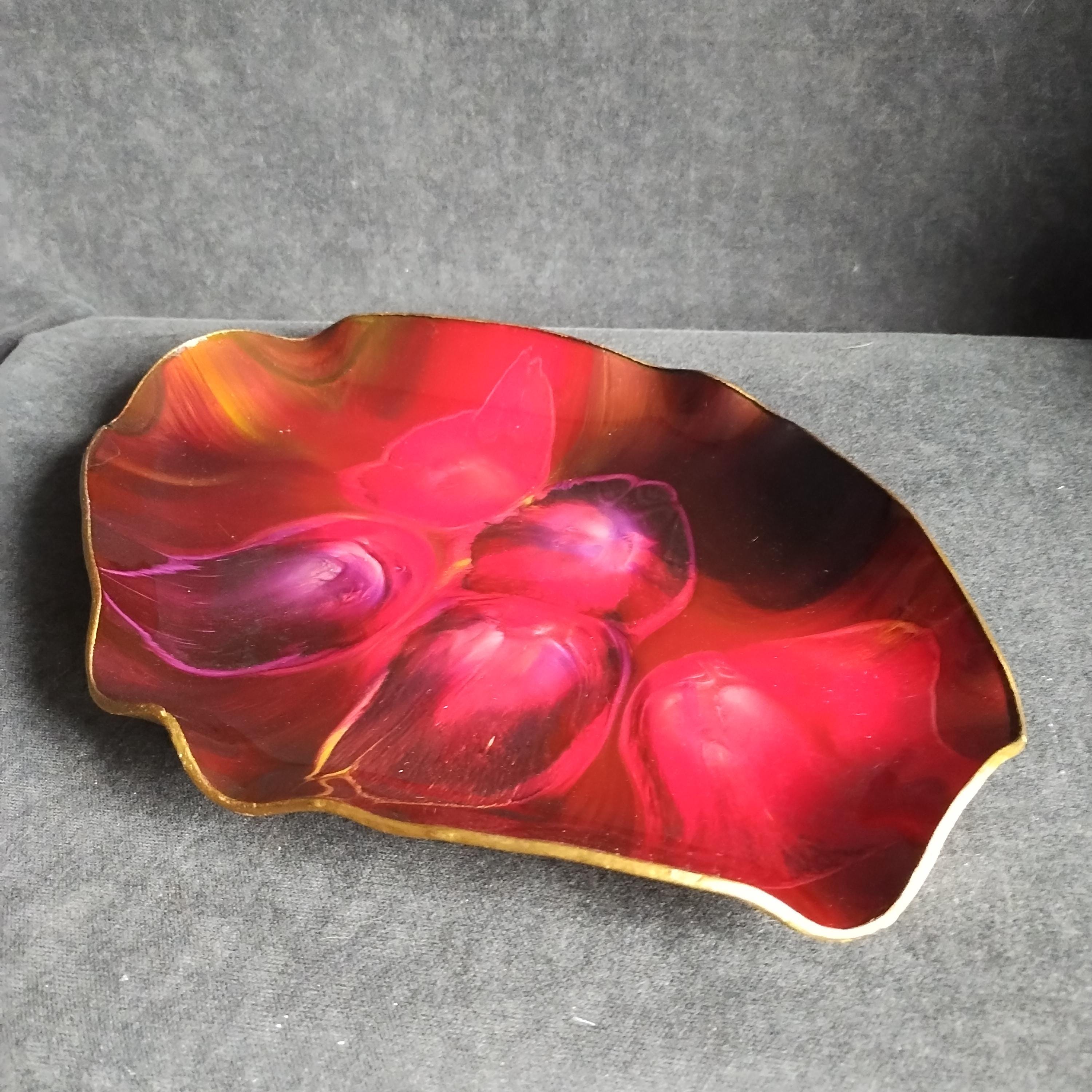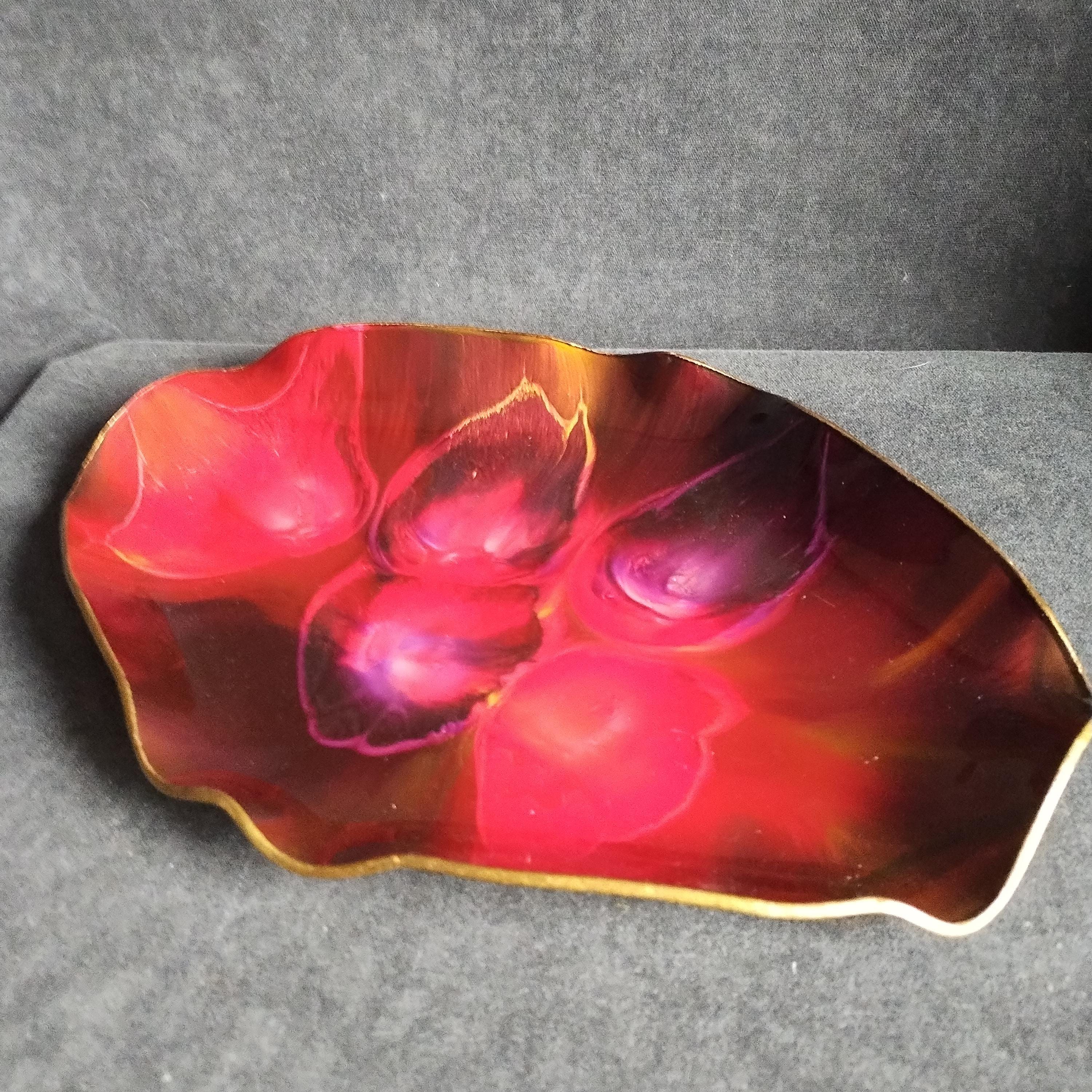 Beautiful vibrant colours make this SeeTuSee tray perfect for serving or simply as a decor statement for your home. Produced by Mayfair in Portage la Prairie, Manitoba, Canada - this unique tray is hand painted glass backed with genuine leather. Produced from 1960 to 1975, the process was perfected by George Hill and Foss Giffin who were inspired by Mexican glass painters. Safe for food use. To clean simply wipe the glass surface with a damp cloth. Leather back protects furniture from scratches.
