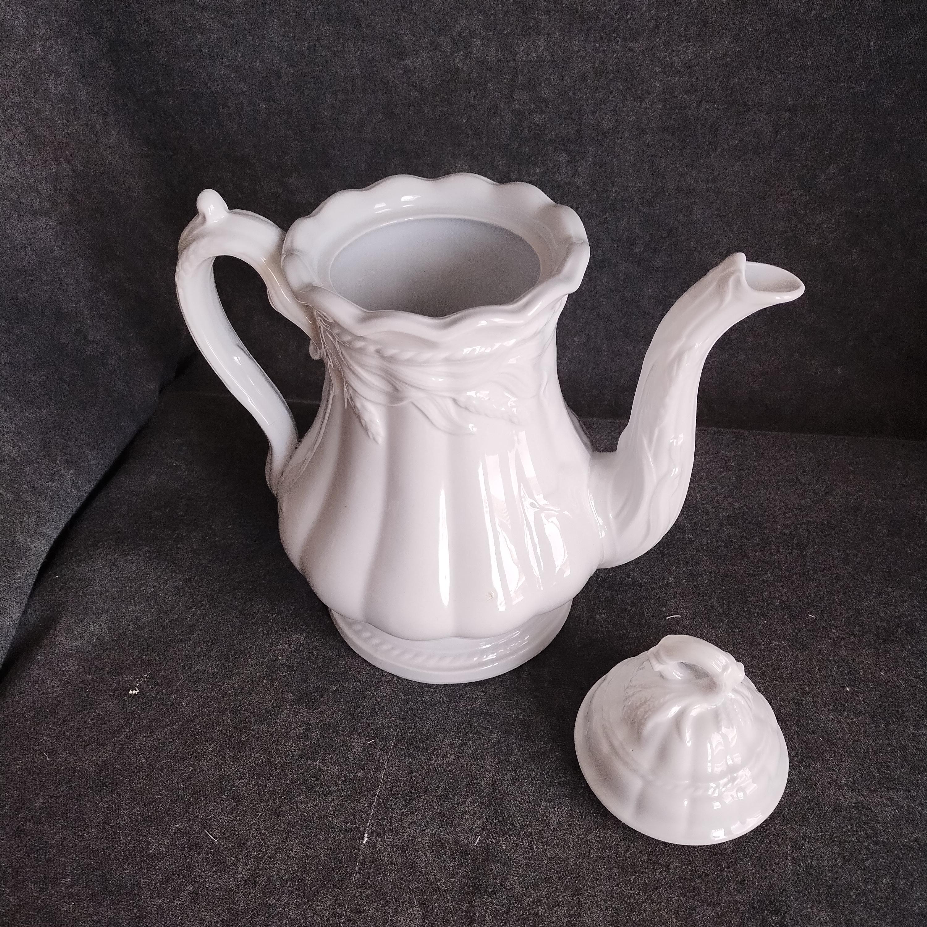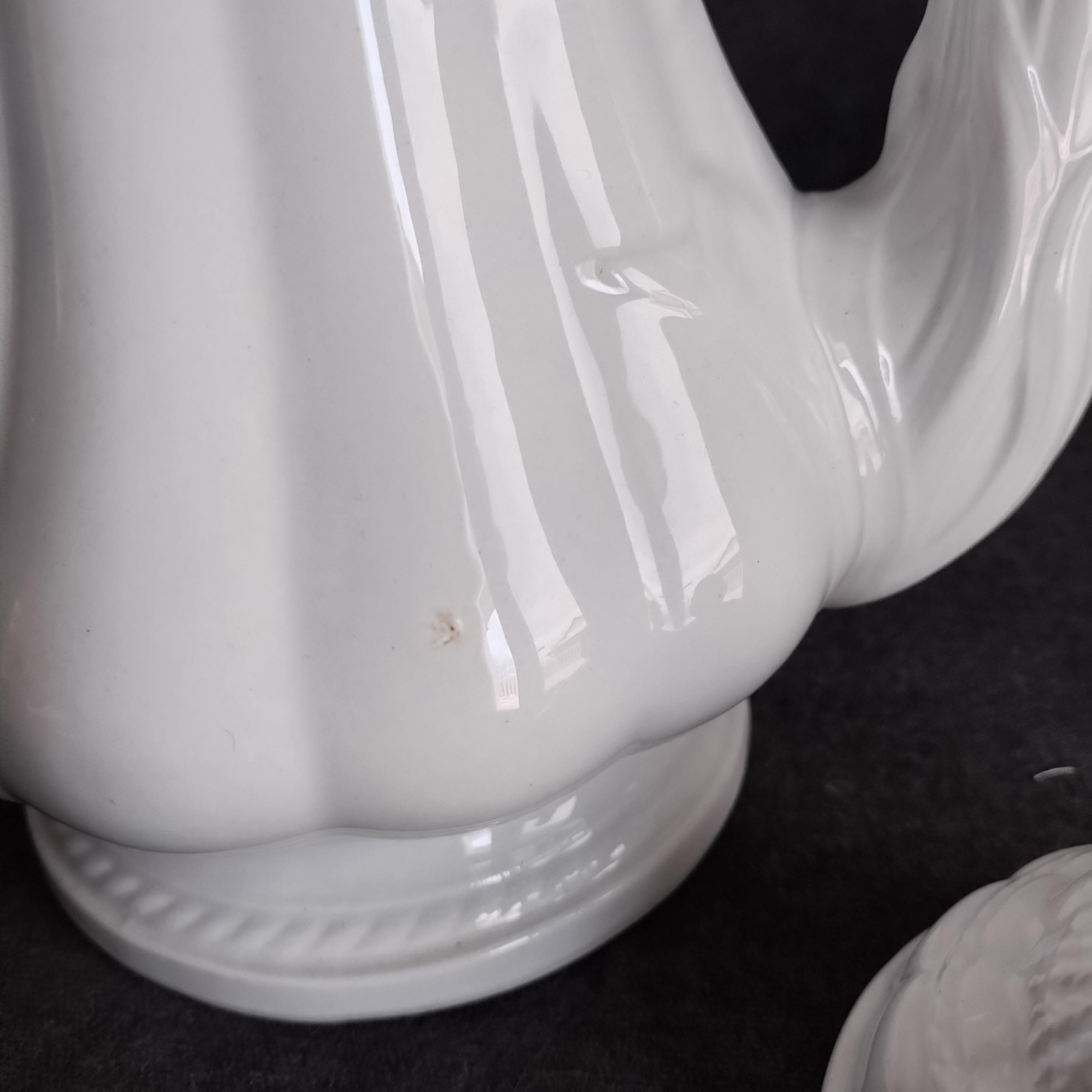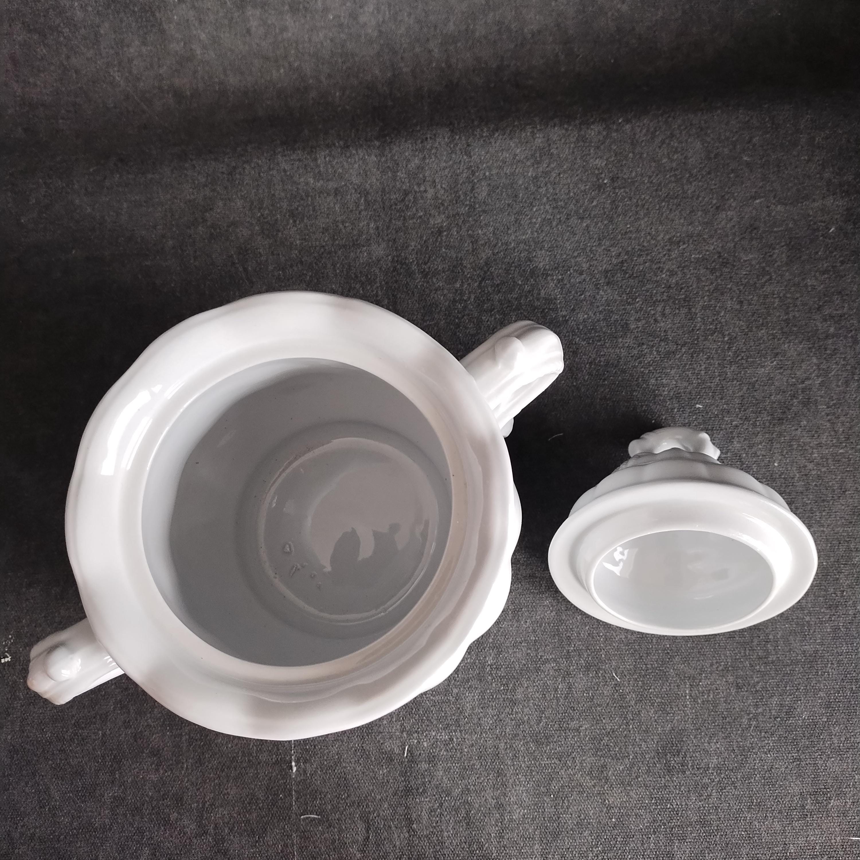 Both pieces are in fully usable condition. I suspect the "missing" creamer was used quite regularly and suffered damage while the teapot and sugar bowl appear nearly new (no tea staining in the spout or metal spoon scratches in the sugar bowl). These survivors will make an excellent addition to any collection and their simple white design blends with any style and decor.