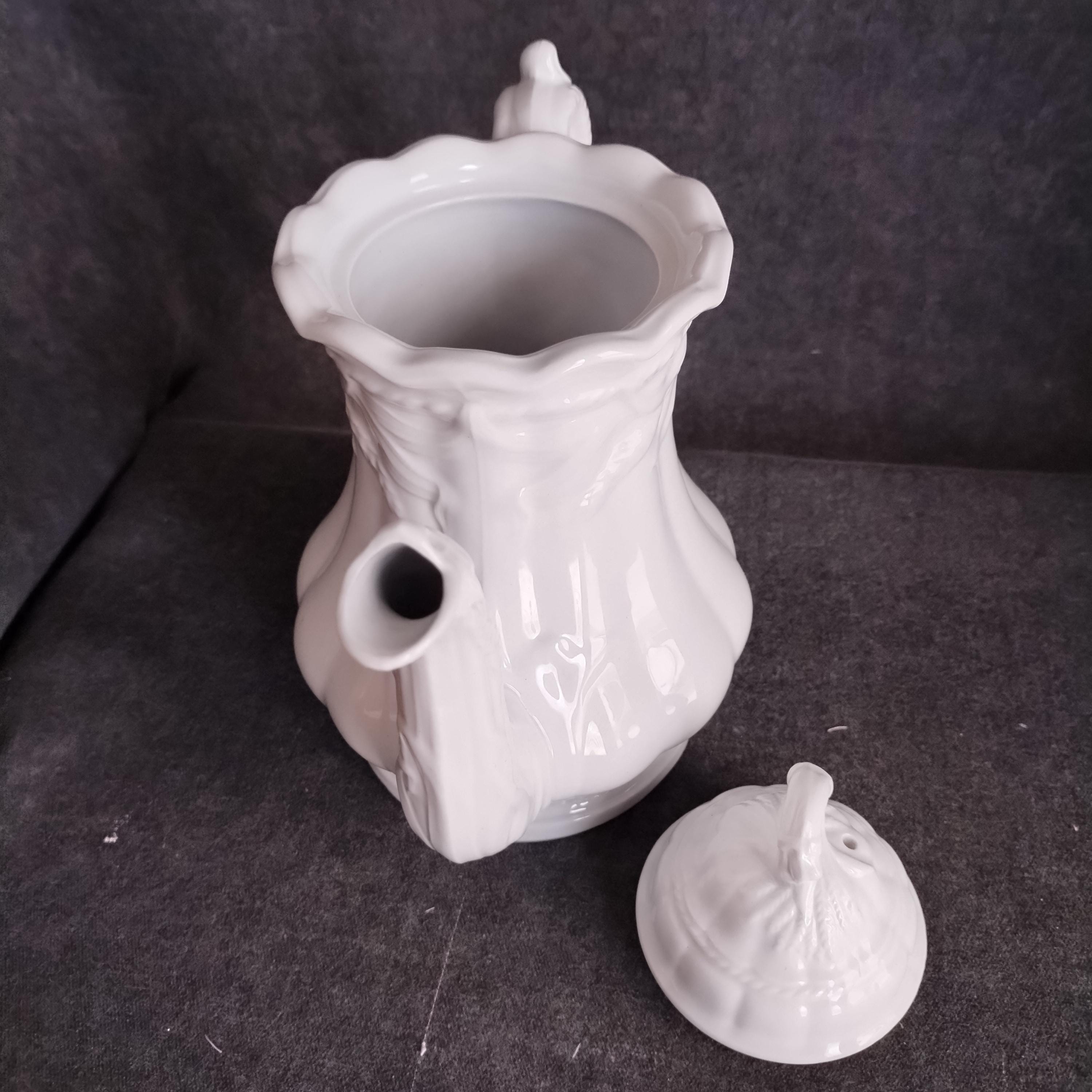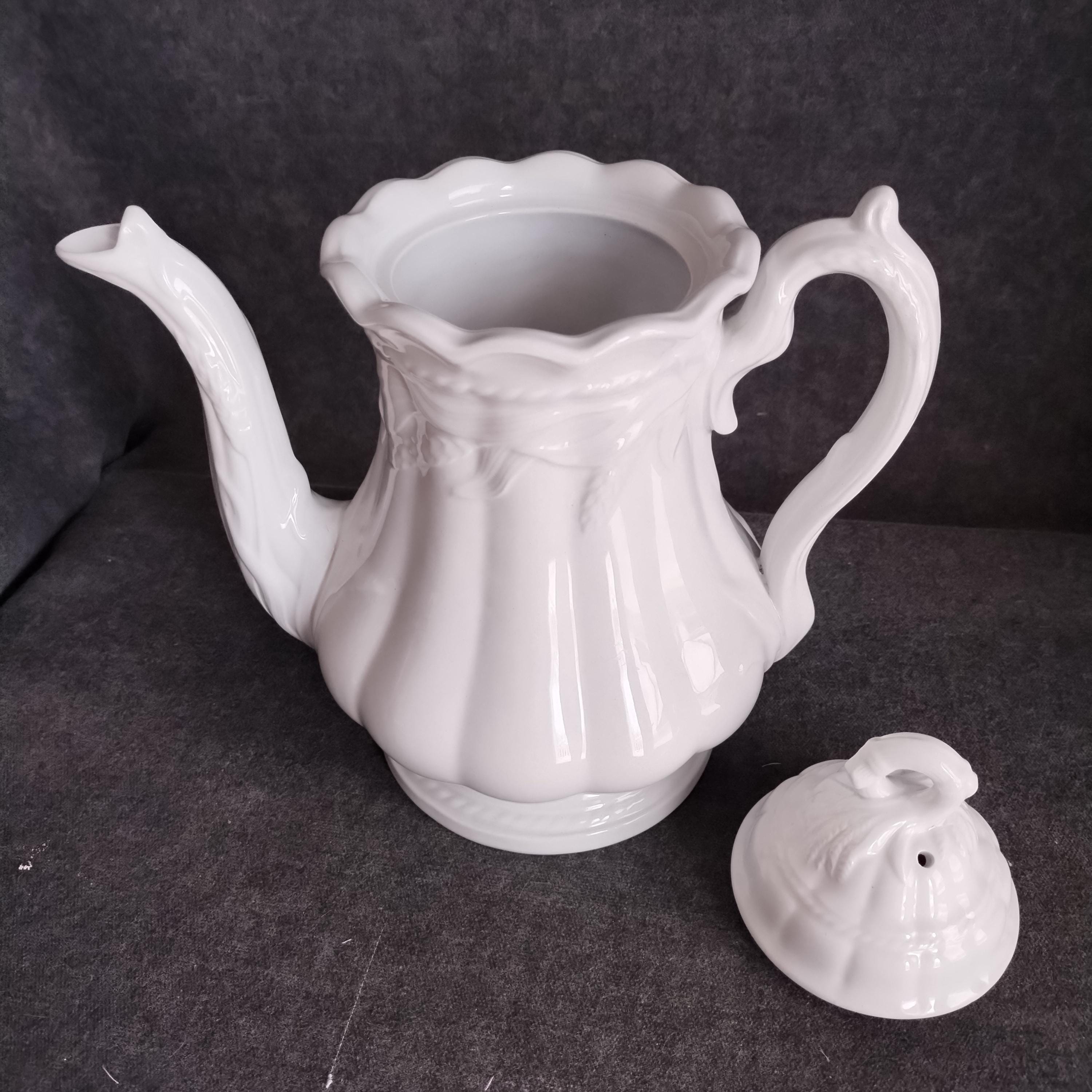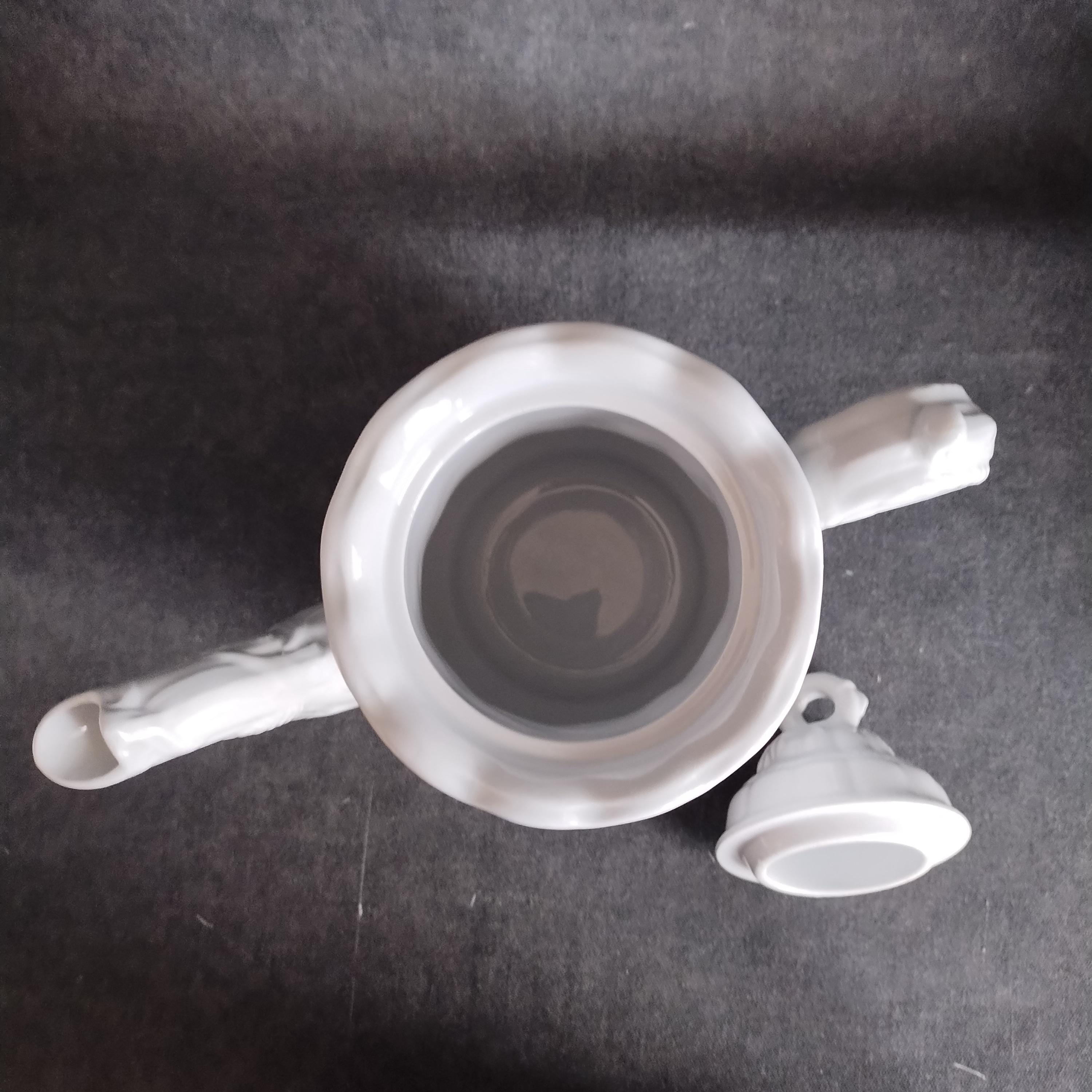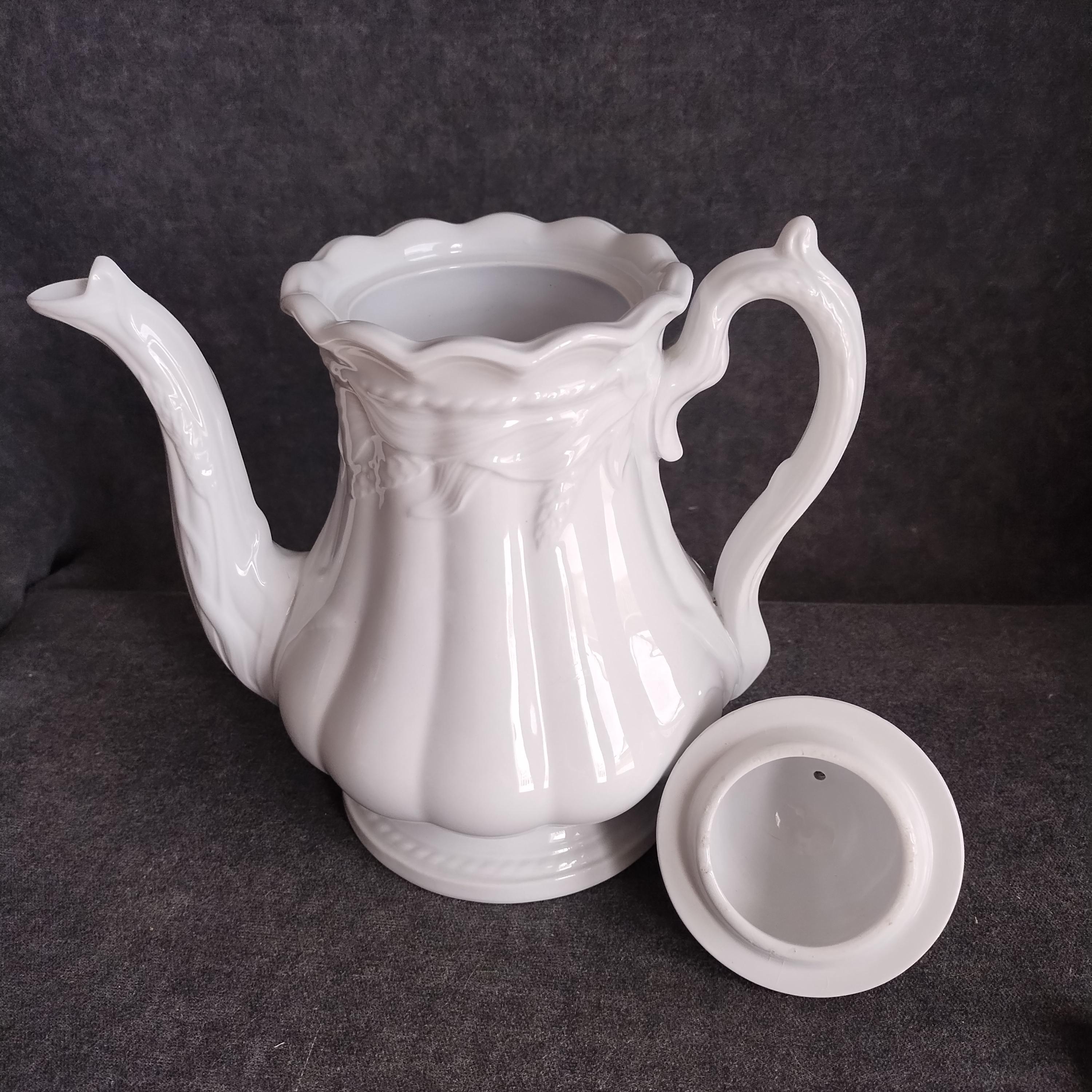 Both pieces are in fully usable condition. I suspect the "missing" creamer was used quite regularly and suffered damage while the teapot and sugar bowl appear nearly new (no tea staining in the spout or metal spoon scratches in the sugar bowl). These survivors will make an excellent addition to any collection and their simple white design blends with any style and decor.