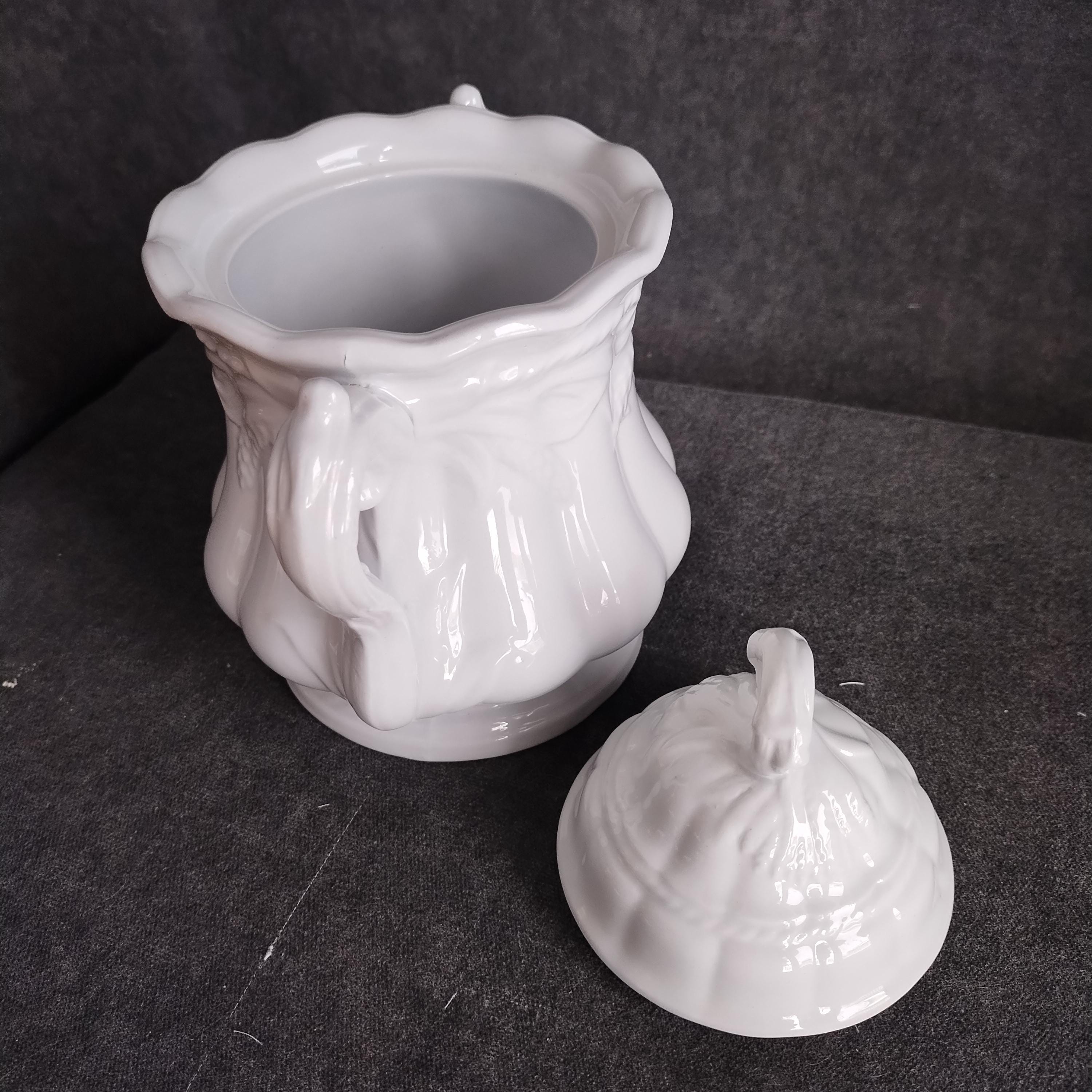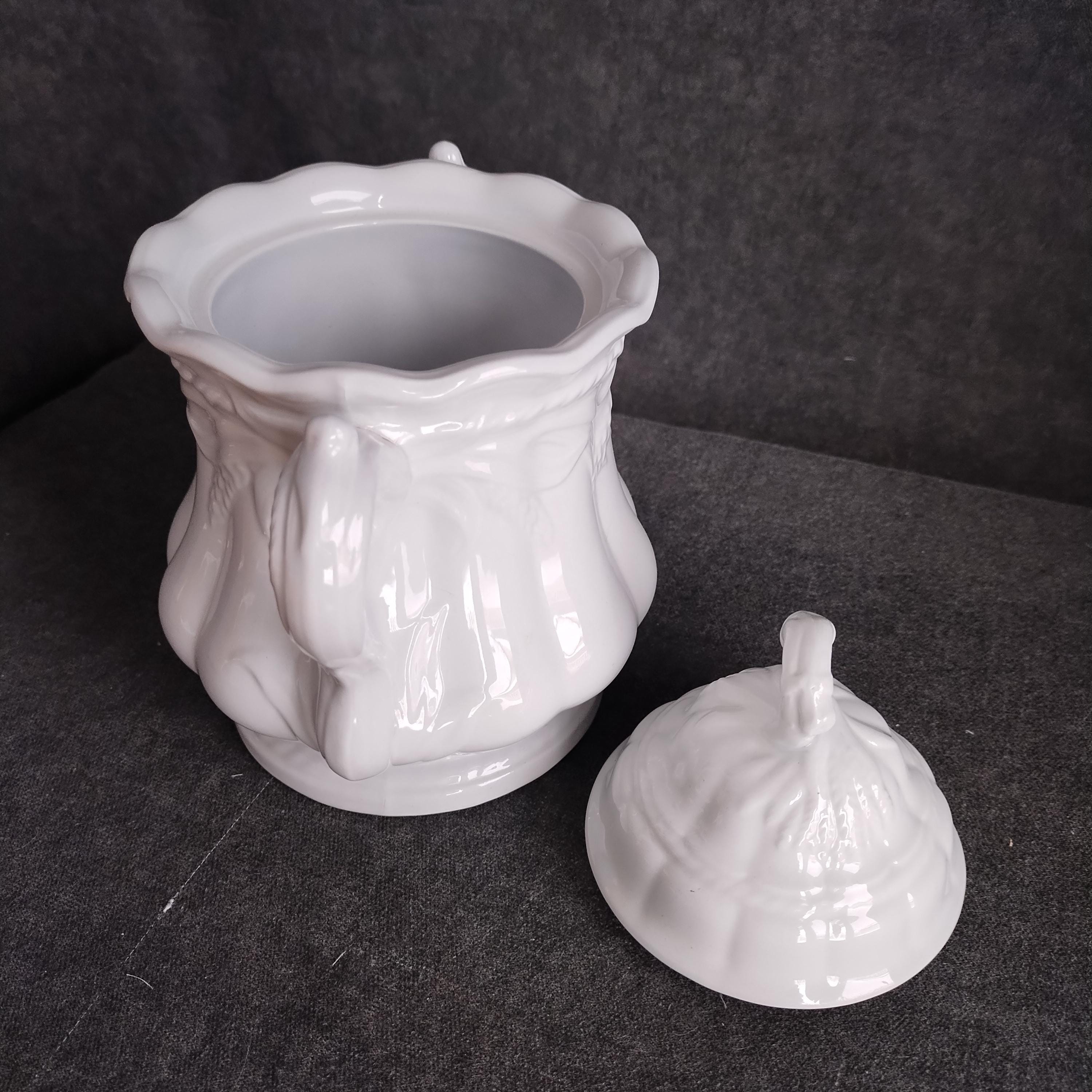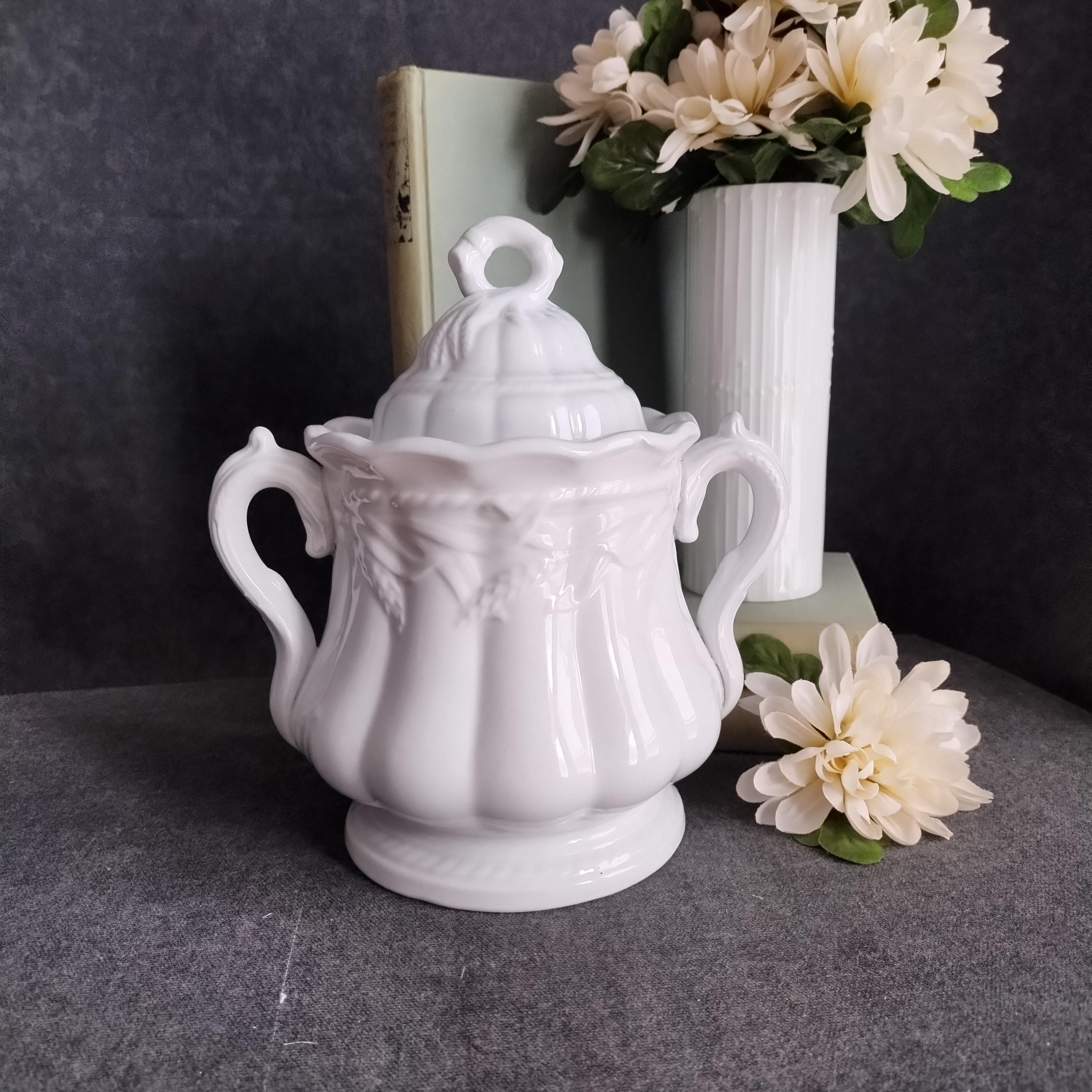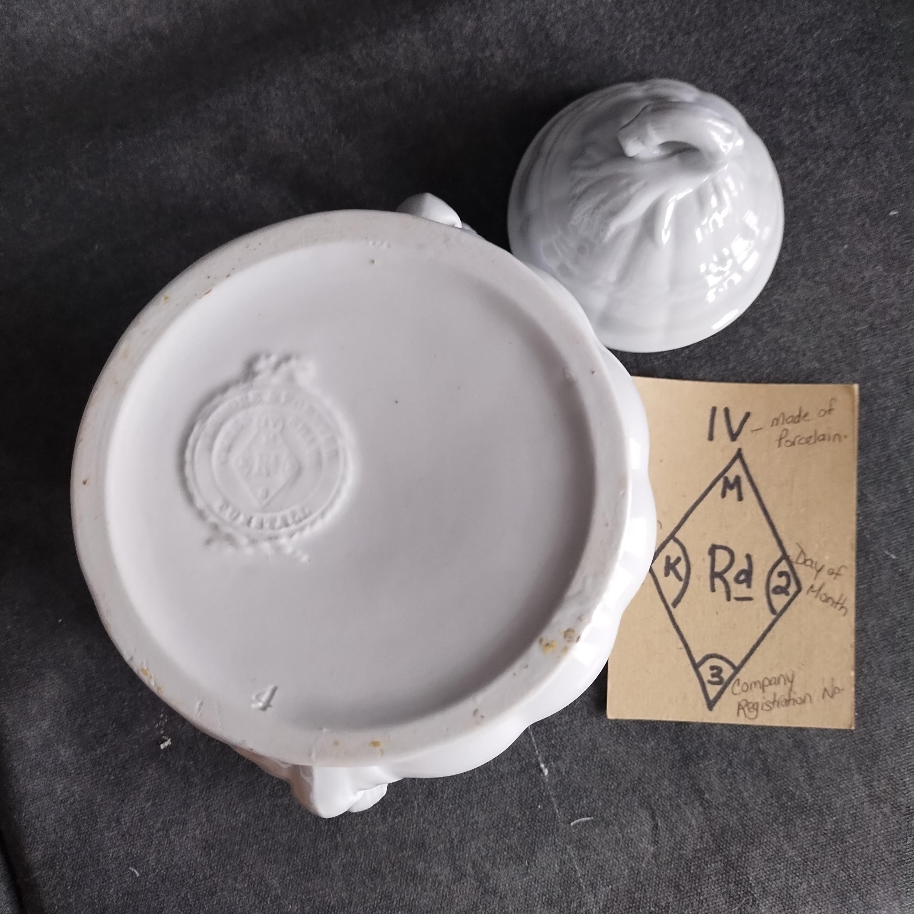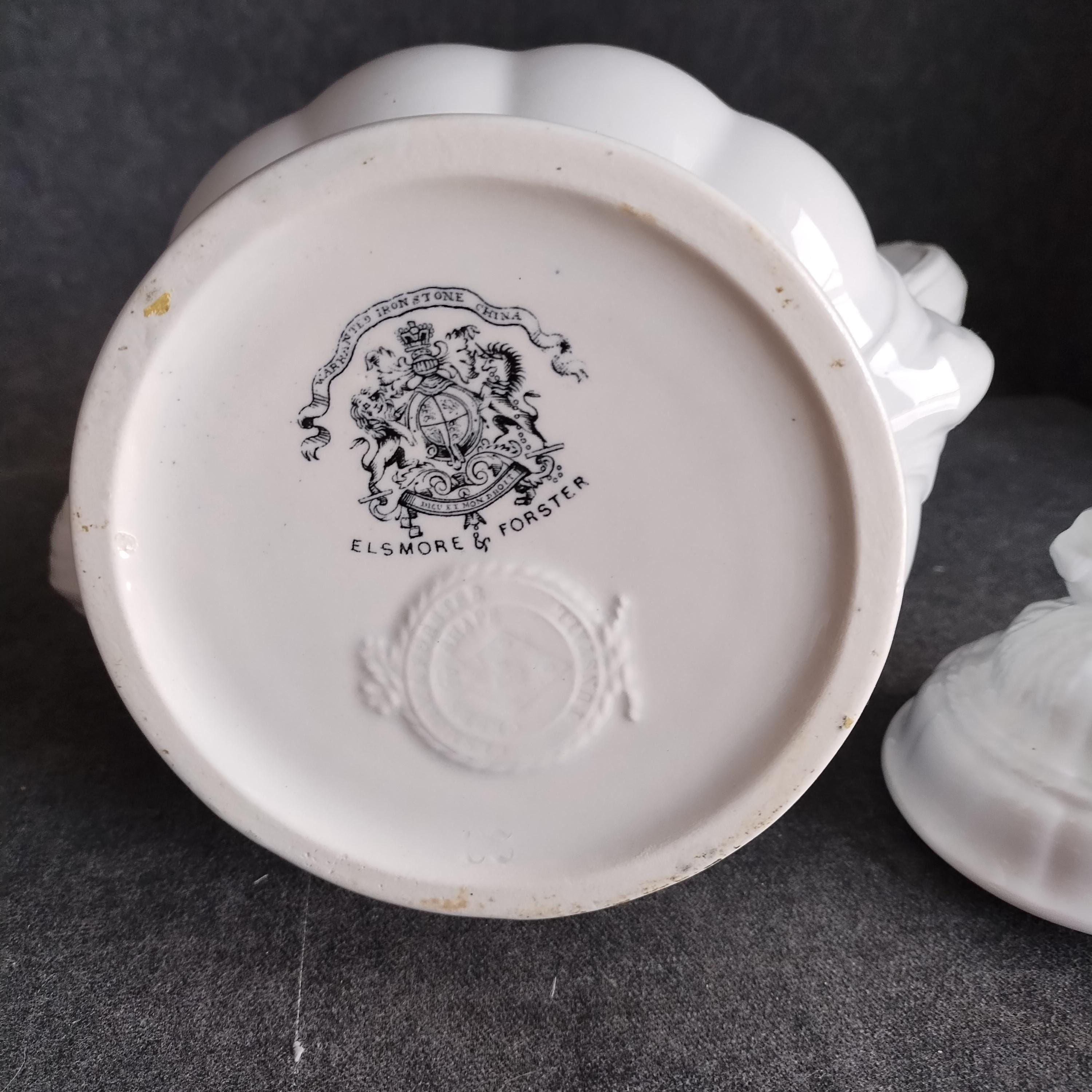 Fabulous antique ironstone porcelain manufactured by Elsmore & Foster. This wheat pattern was registered on November 2, 1859. The diamond mark was used in England from 1842 to 1883 and these pieces were produced between 1859 and 1867. Minor imperfections are common as this typy of pottery was intended for everyday utilitarian use. Clear glazed, grey white porcelain with wheat and leaf design, rope braid trim, open loop lids, and applied handles.