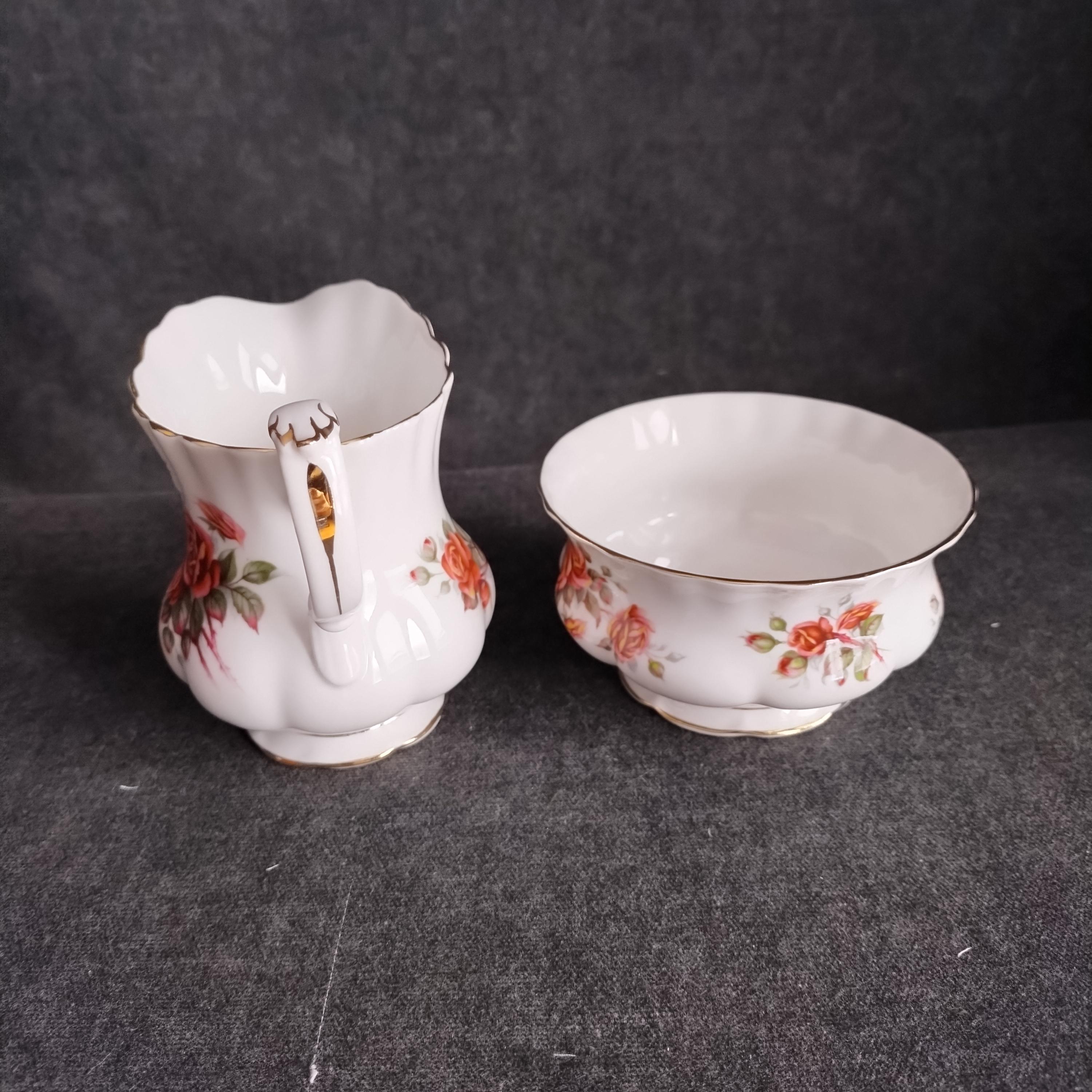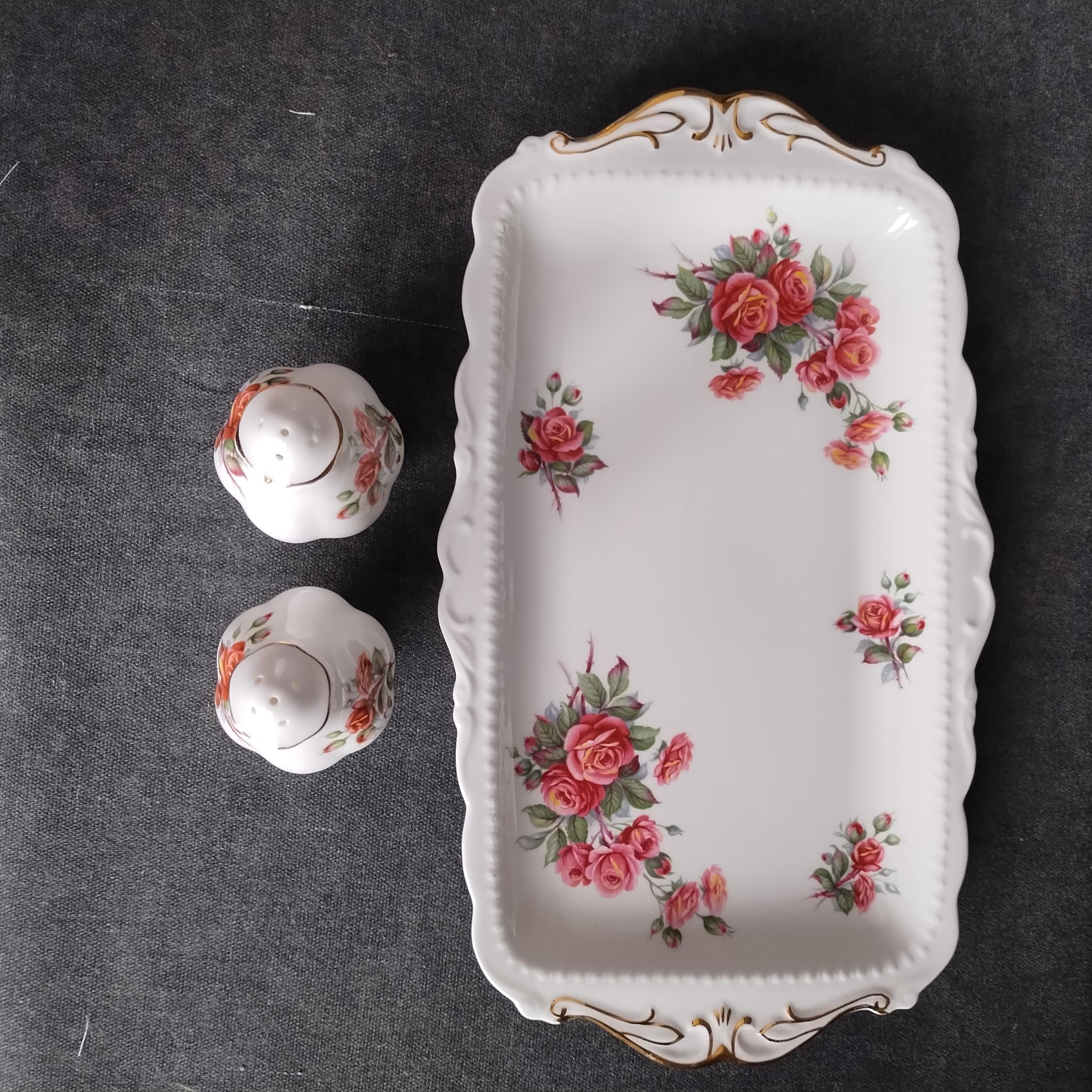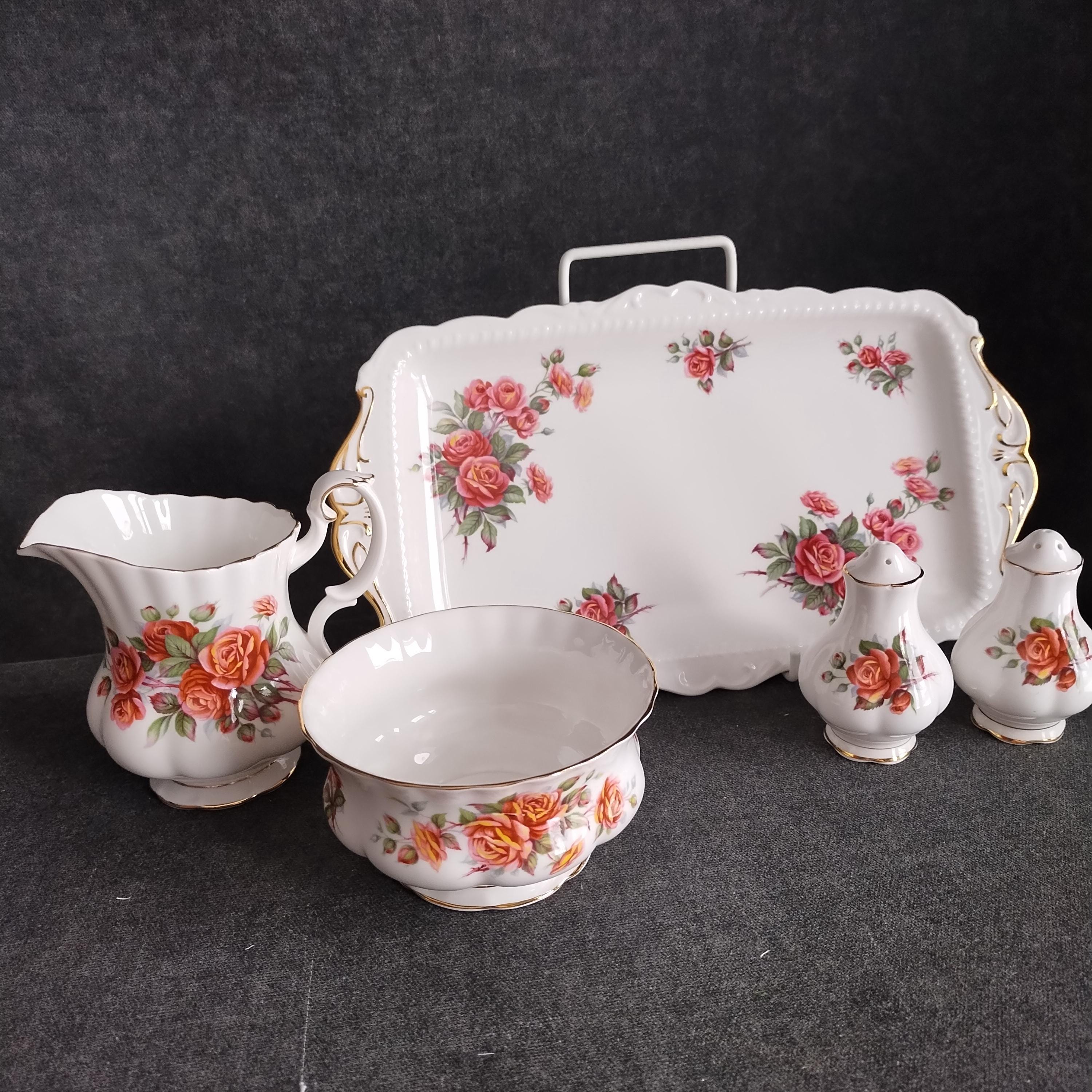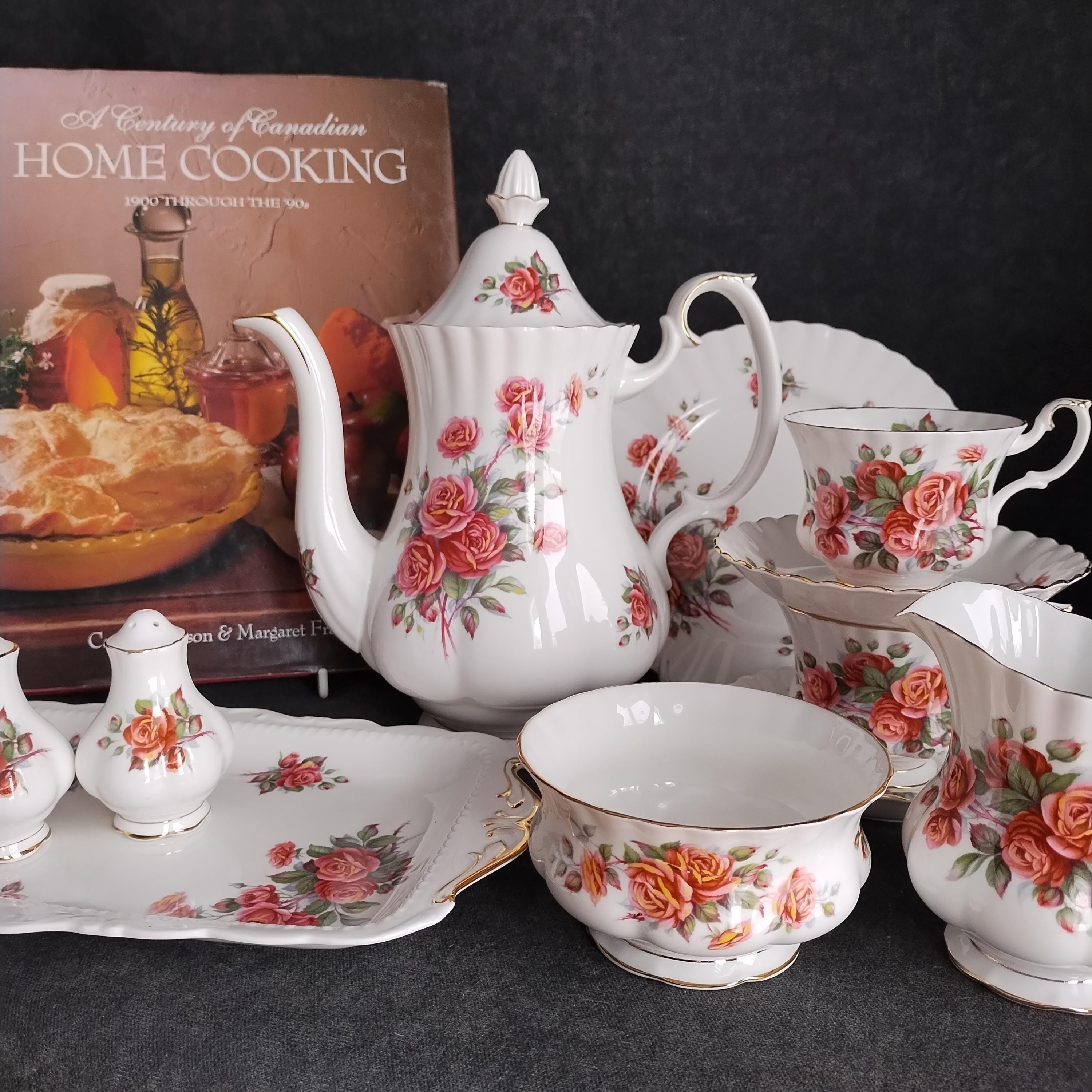 Royal Albert designed this beautiful pattern to commemorate Canada's 100 Birthday in 1967. "Centennial Rose" features bouquets of dusty pink and apricot flowers with sage green foliage on a white background trimmed with gold. Initially exclusive to the Canadian market, the pattern was produced until 1981.