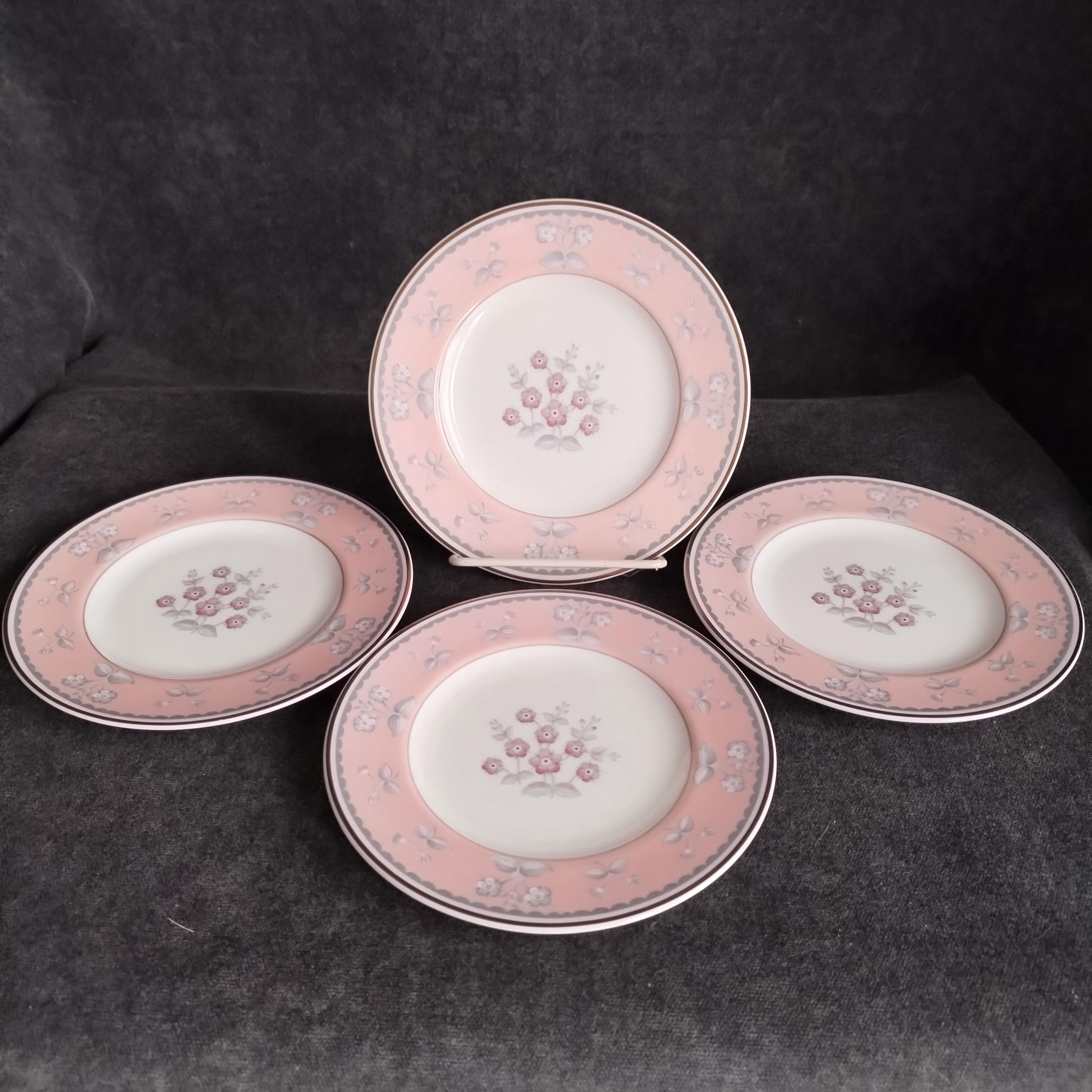 Wedgwood produced this gorgeous bone china dinnerware pattern for only 2 years - from 1962 to 1964. The pattern features pink "Pimpernel" flowers on a white background circled by a broad pink band adorned with light grey blossoms accented with gold rims. The design was also available in turquoise blue or pastel yellow allowing you to mix and match your dining decor. We have more options available in other listings so please contact us for multi purchase discounts.