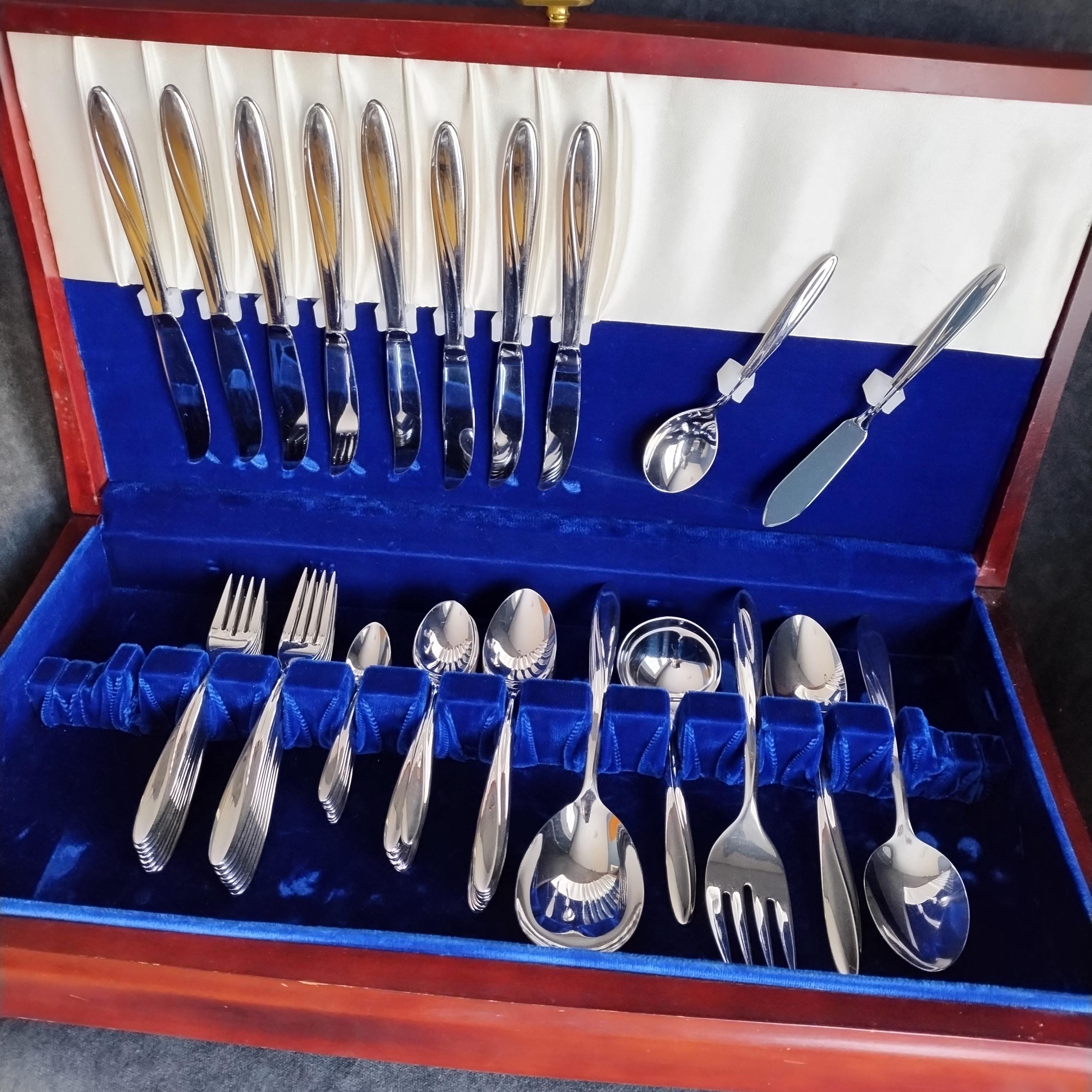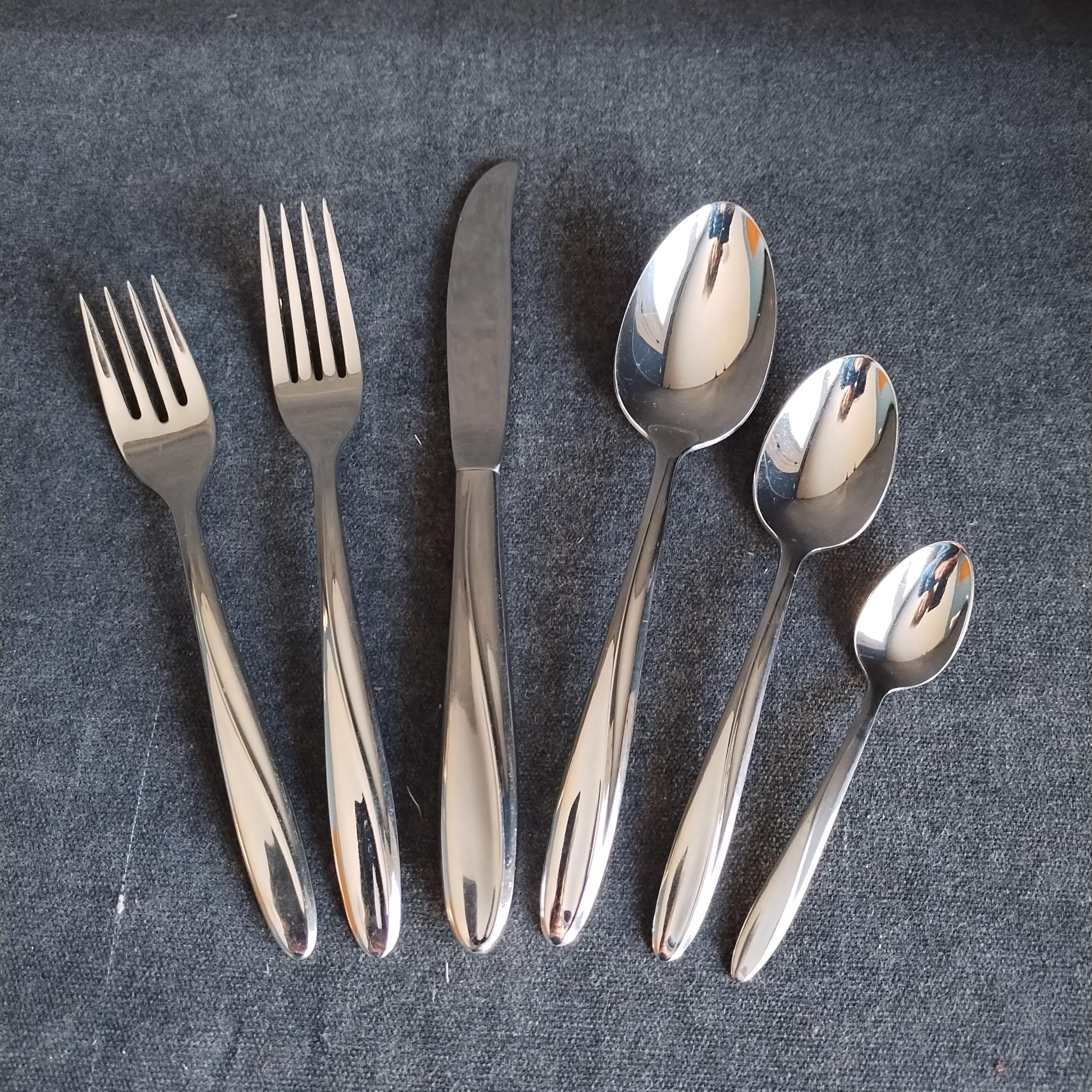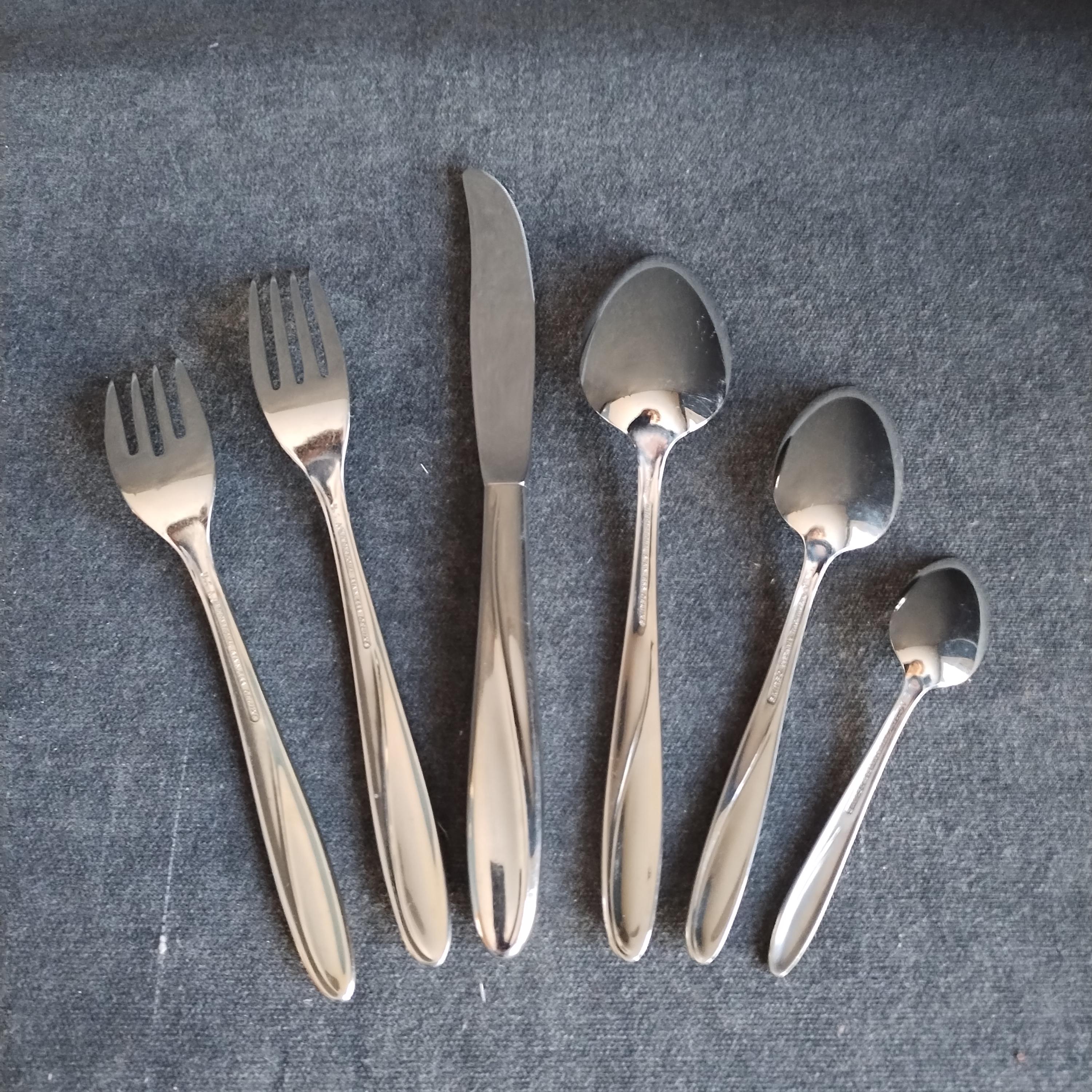 6 piece place setting for 4 of International Stainless Steel Flatware. "Christiania" pattern features as smooth gloss finish with a sleek swoop on the handle and rounded tapered end. Perfect for today's minimalist style in easy to care for durable dishwasher safe stainless. Crafted in the USA from 1955 to 1959 this high quality cutlery will grace your table for years to come. The understated pattern will match even the most casual dinnerware patterns.