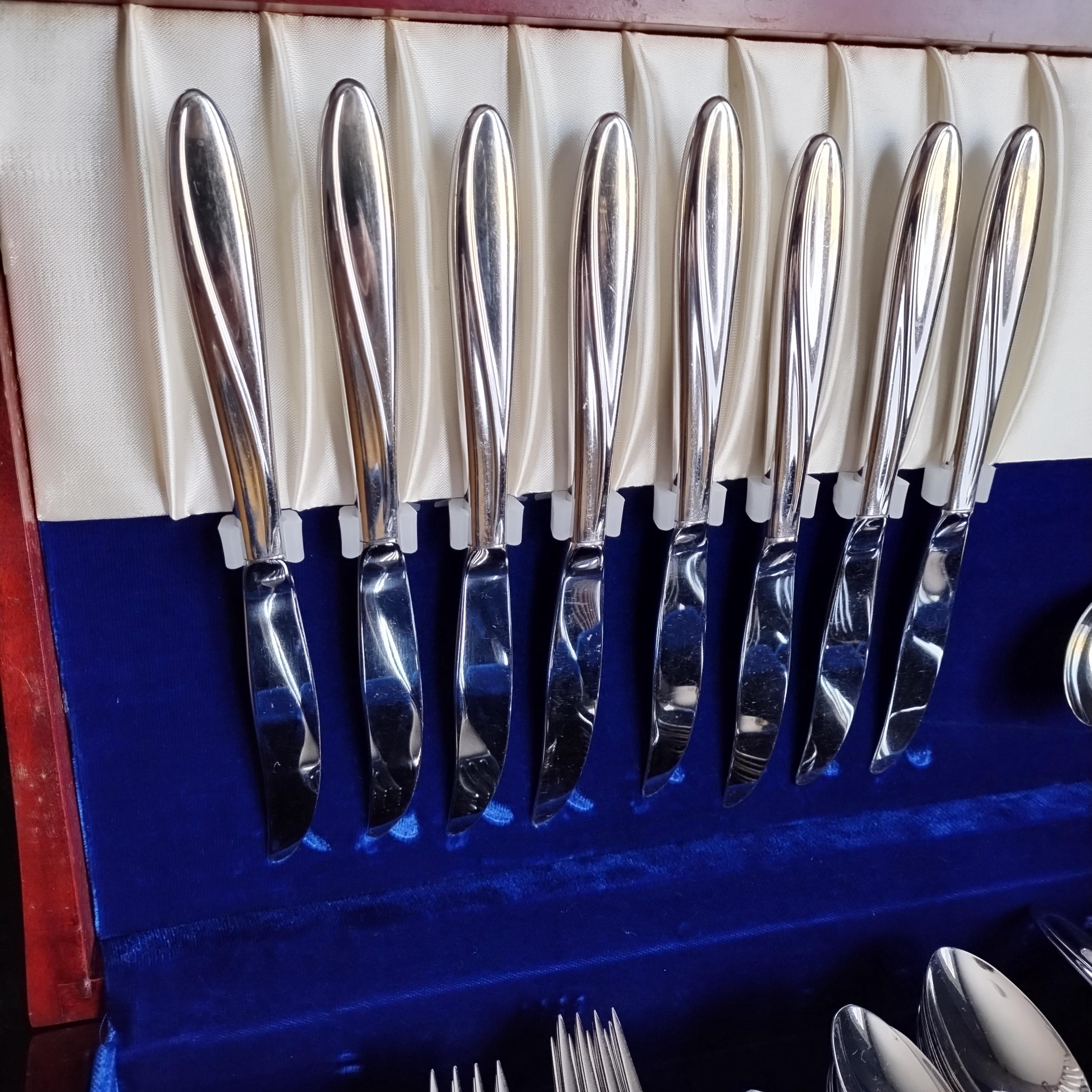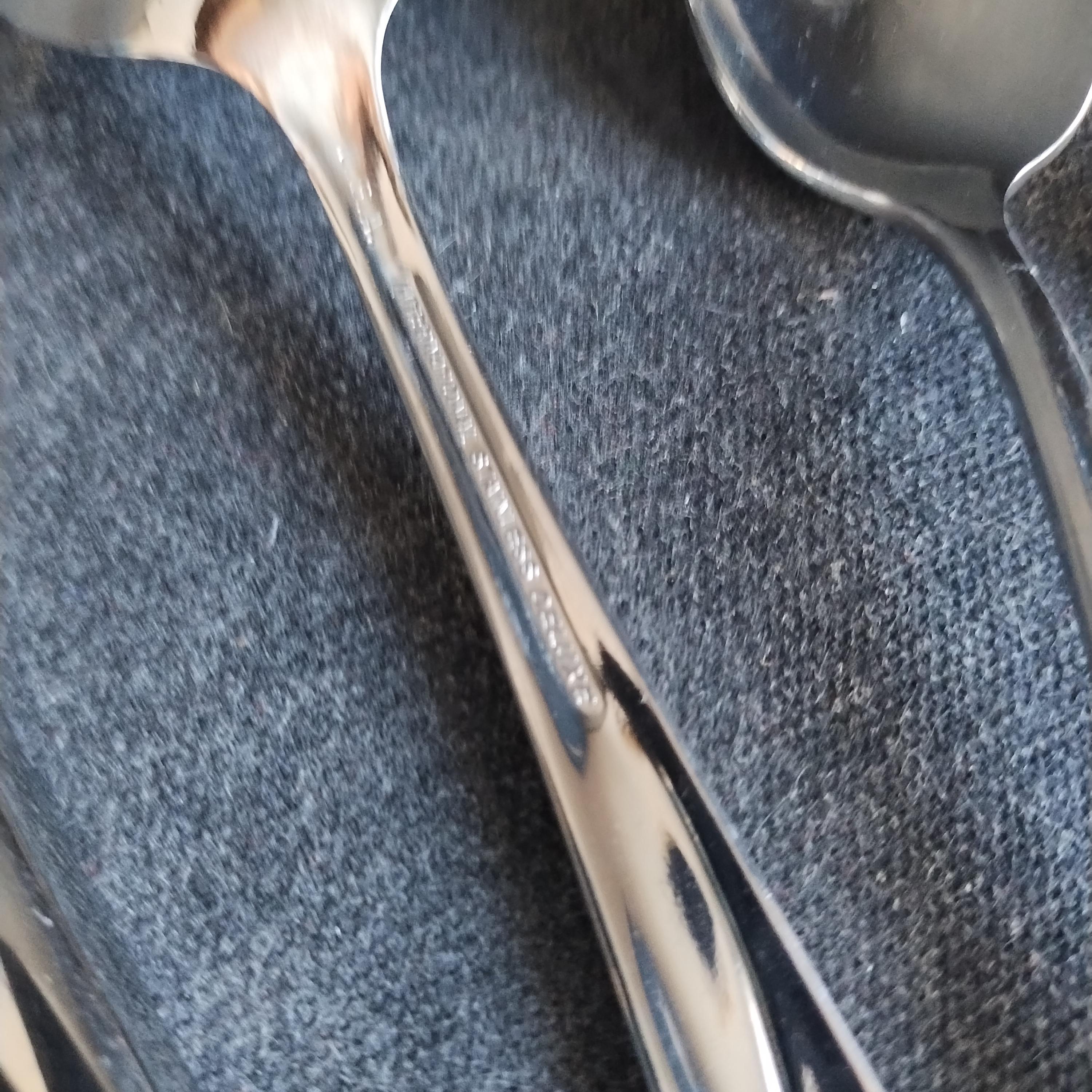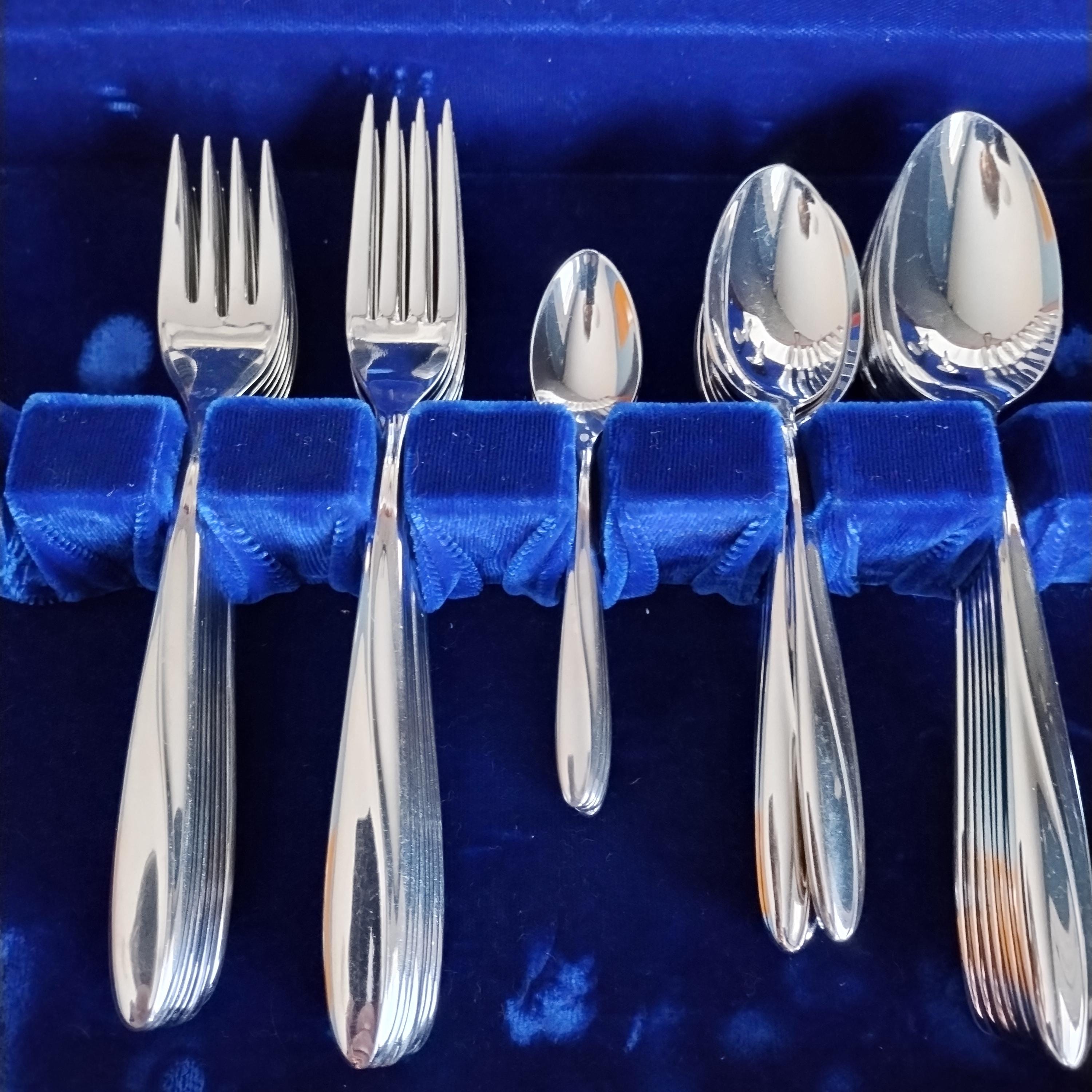 6 piece place setting for 4 of International Stainless Steel Flatware. "Christiania" pattern features as smooth gloss finish with a sleek swoop on the handle and rounded tapered end. Perfect for today's minimalist style in easy to care for durable dishwasher safe stainless. Crafted in the USA from 1955 to 1959 this high quality cutlery will grace your table for years to come. The understated pattern will match even the most casual dinnerware patterns.