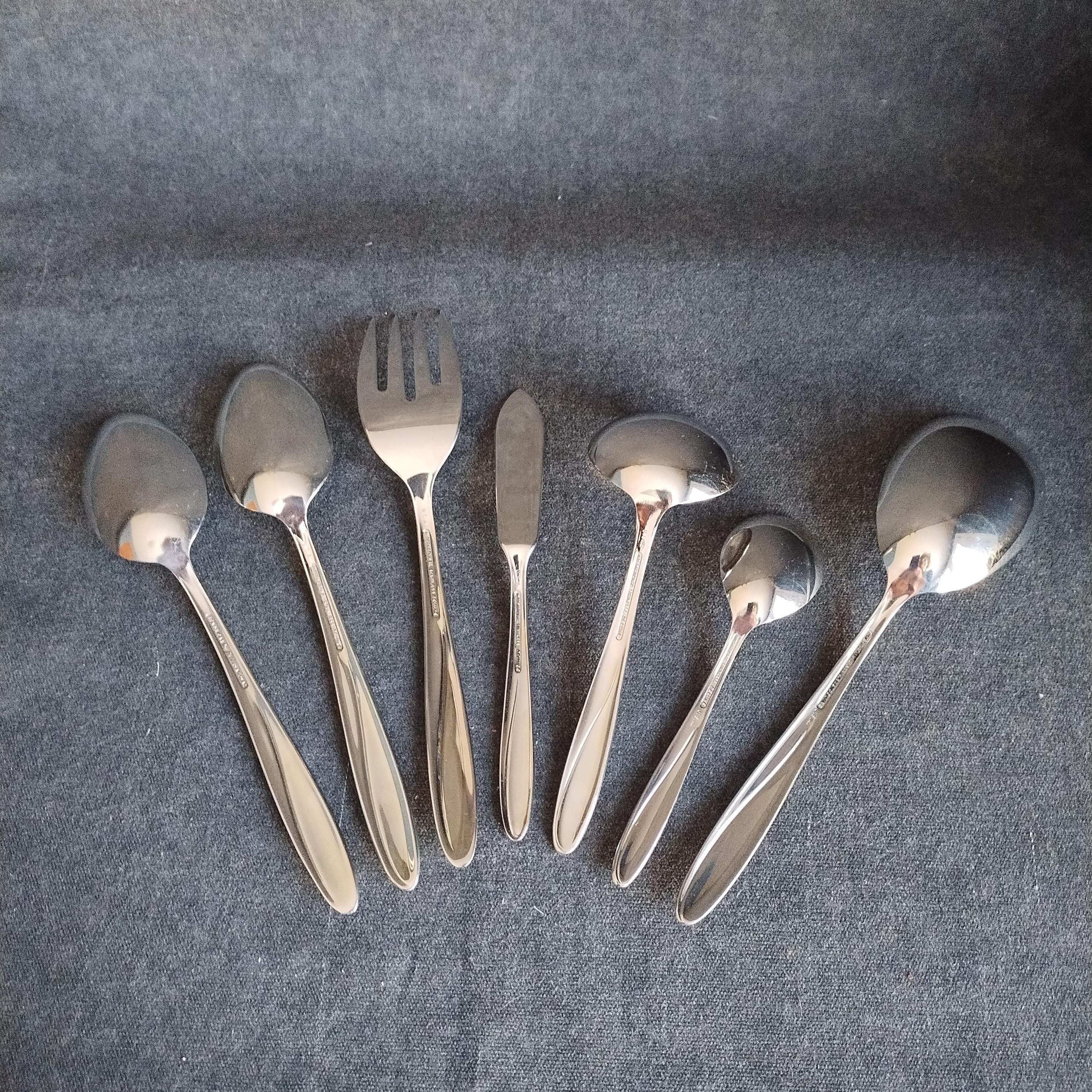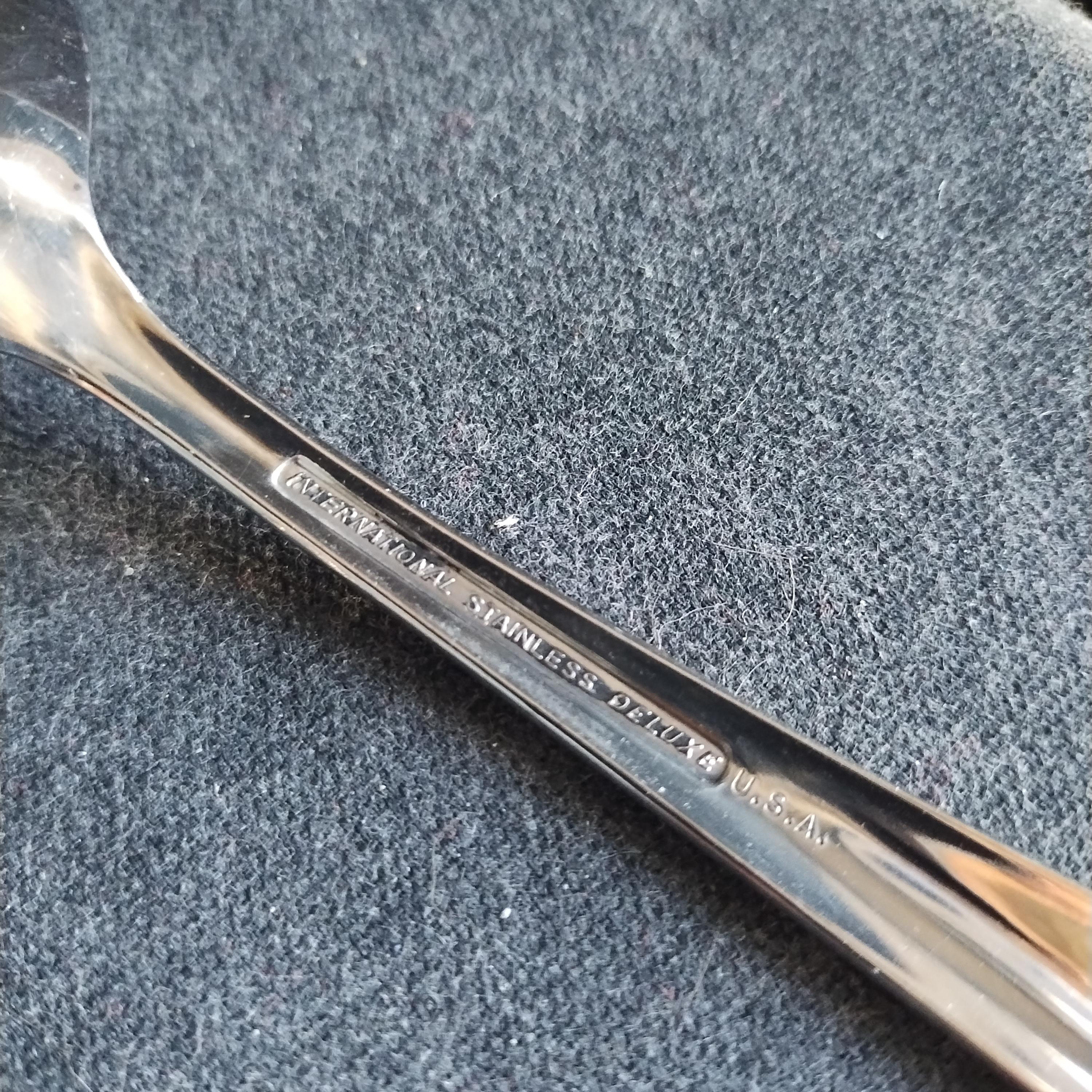 7 piece hostess serving utensil set of International Stainless Steel Flatware. "Christiania" pattern features as smooth gloss finish with a sleek swoop on the handle and rounded tapered end. Perfect for today's minimalist style in easy to care for durable dishwasher safe stainless. Crafted in the USA from 1955 to 1959 this high quality cutlery will grace your table for years to come. The understated pattern will match even the most casual dinnerware patterns.