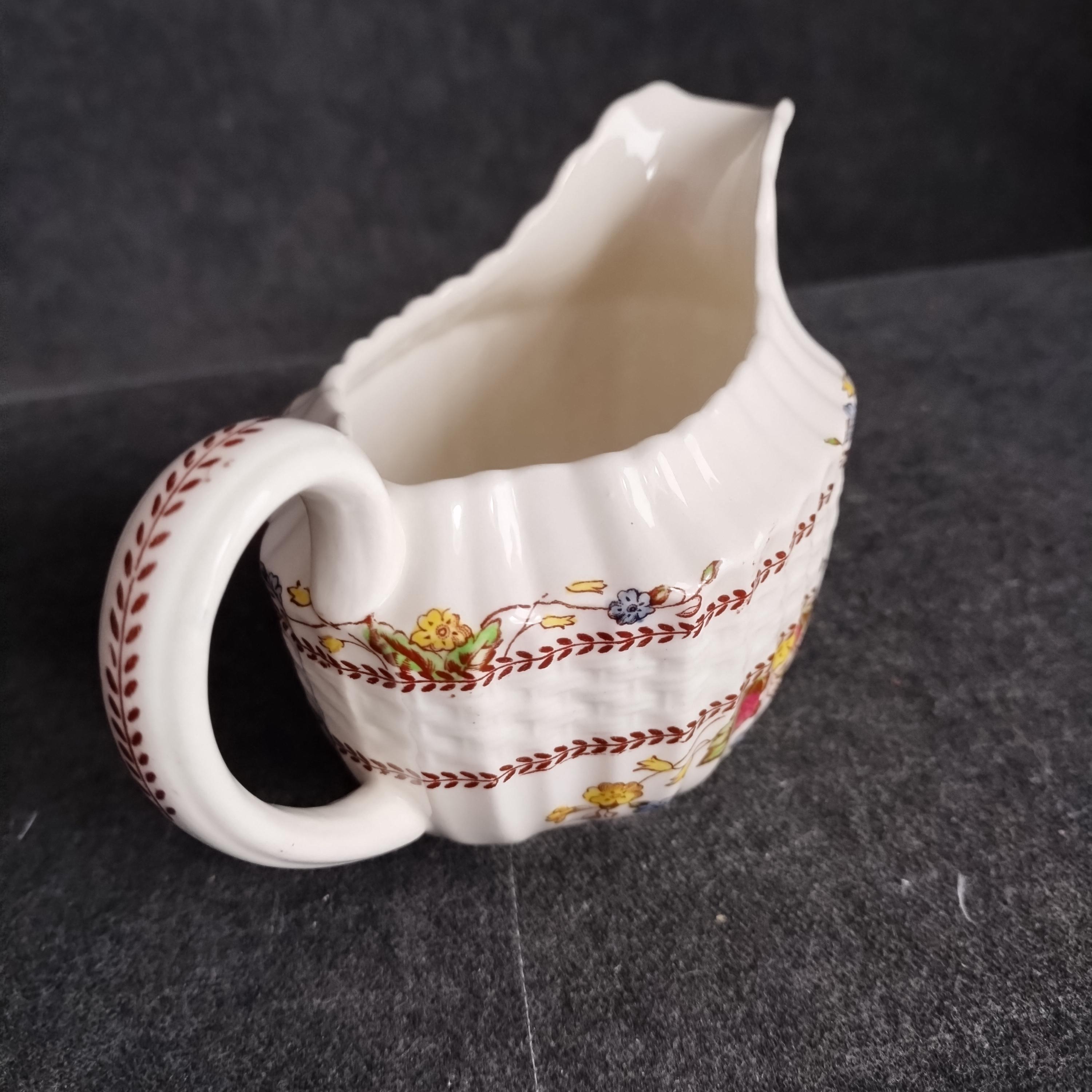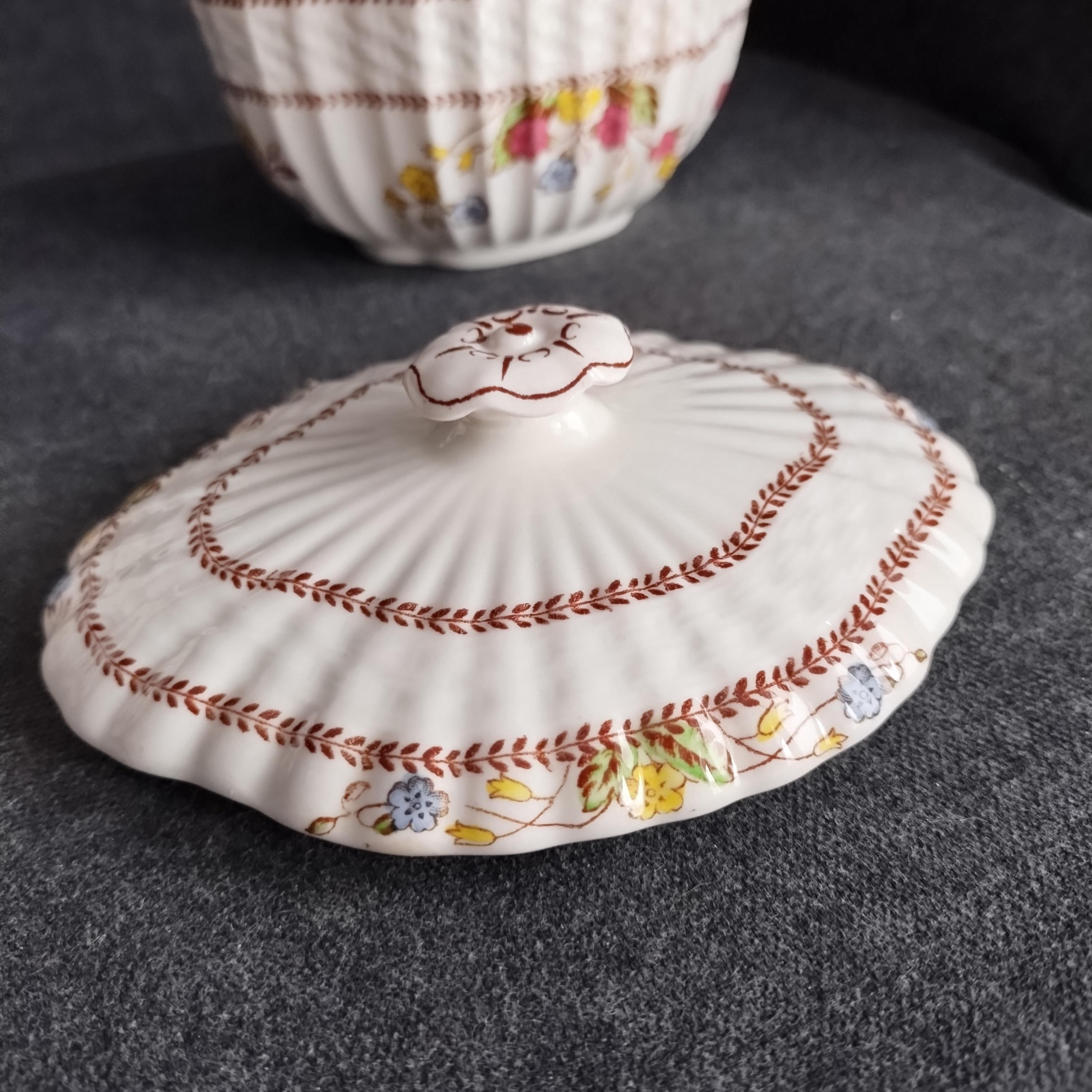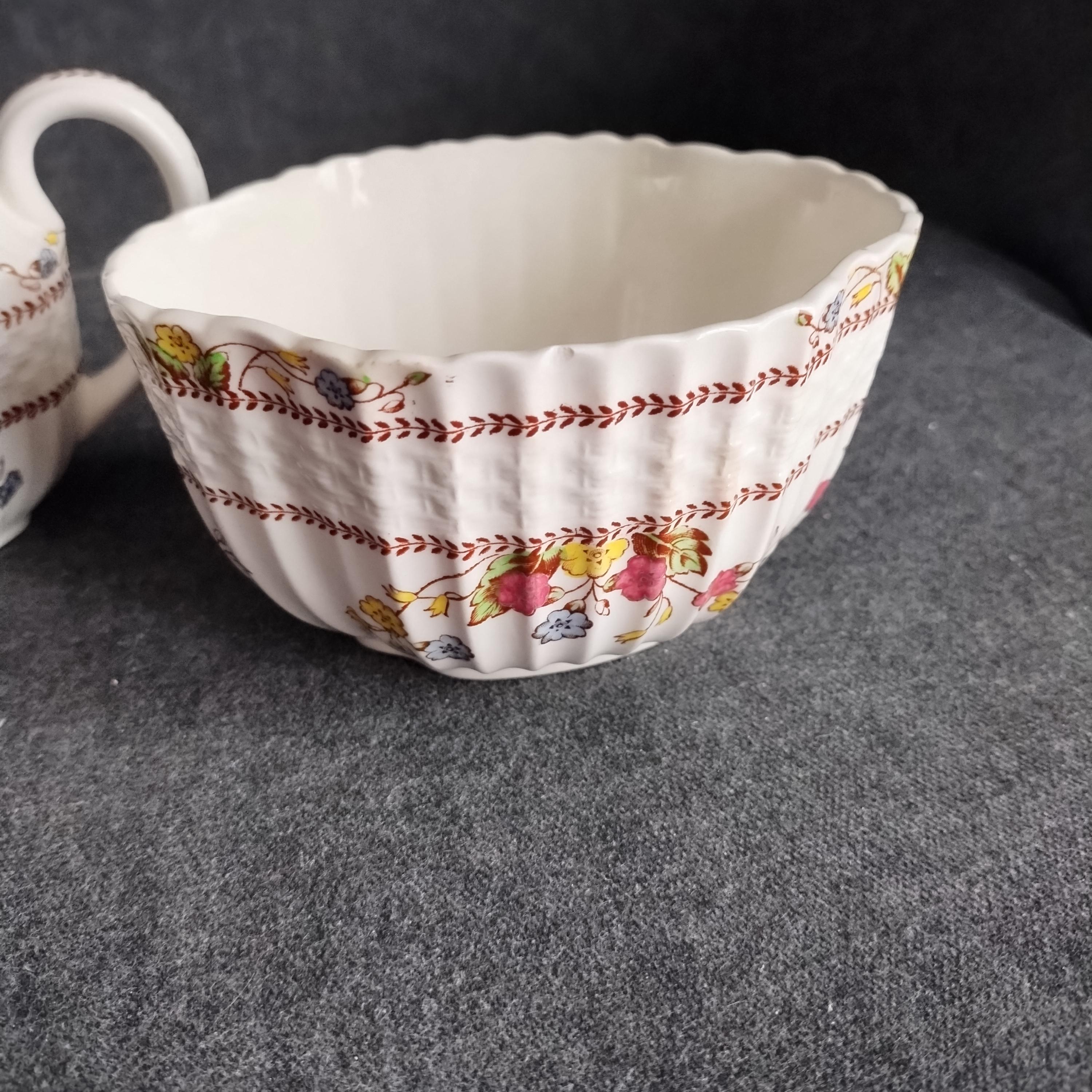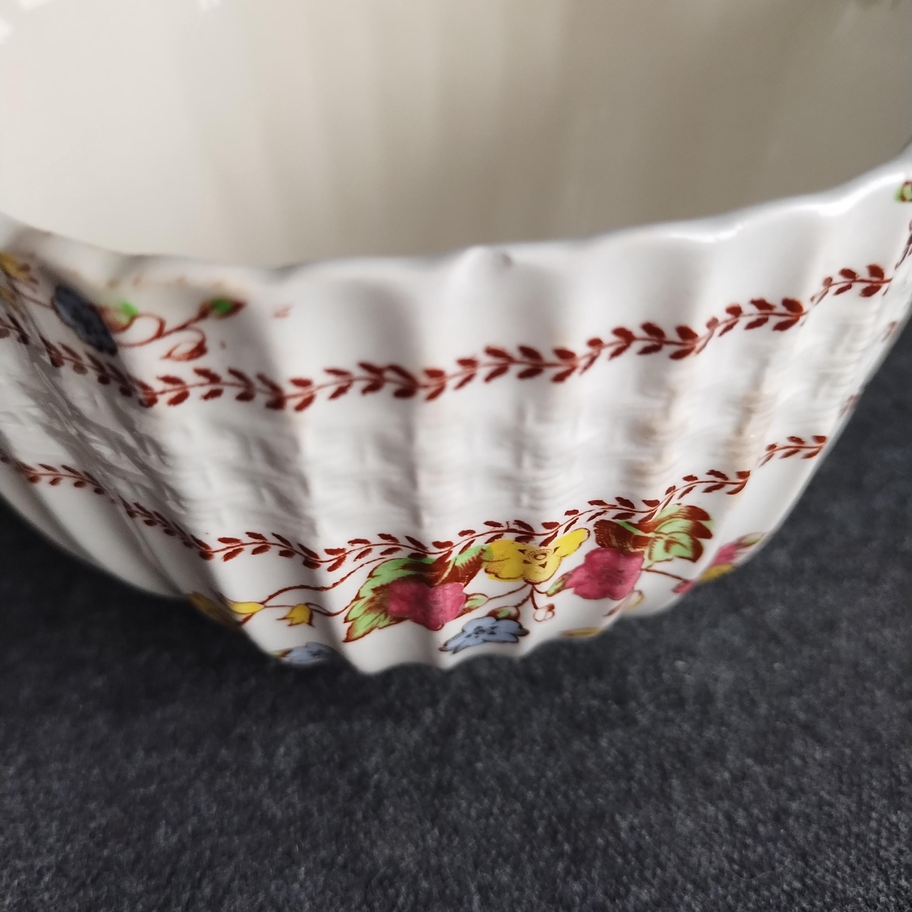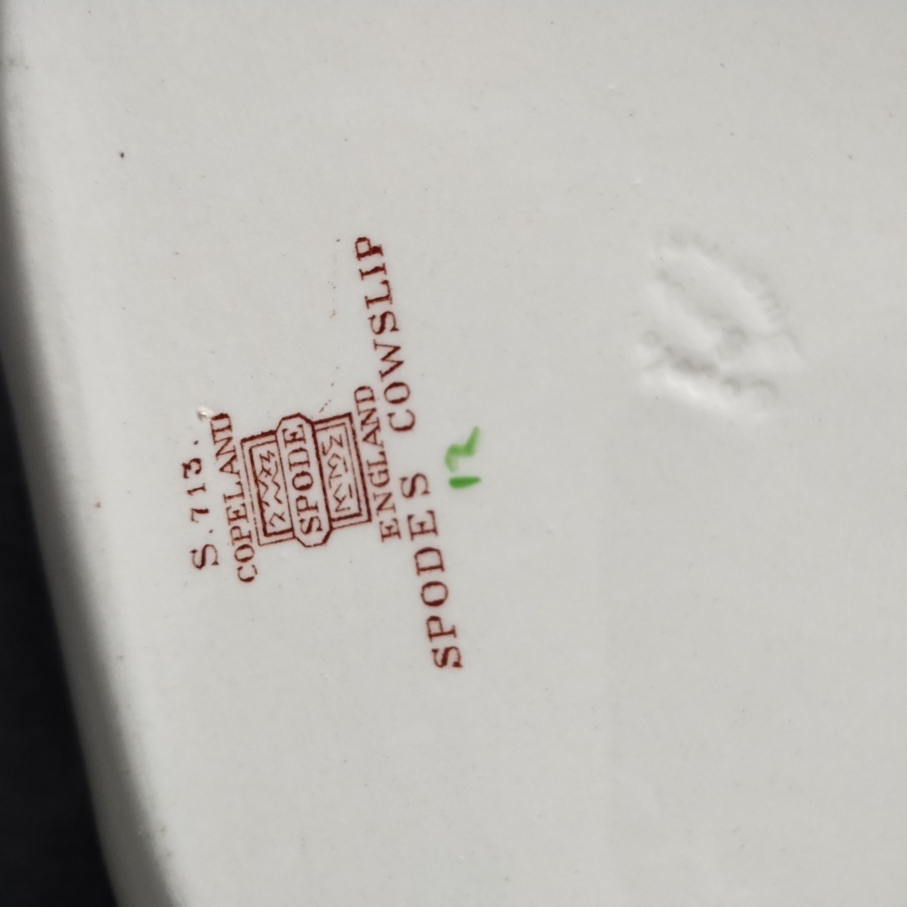 Copeland Spode produced this charming country pattern from 1942 to 1975. Hand painted multicolor "Cowslip" blossoms and brown transfer trims adorn a white background embossed with wicker details and scalloped edges. Marked on back with Copland Spode England backstamp. Plates available in other listings.