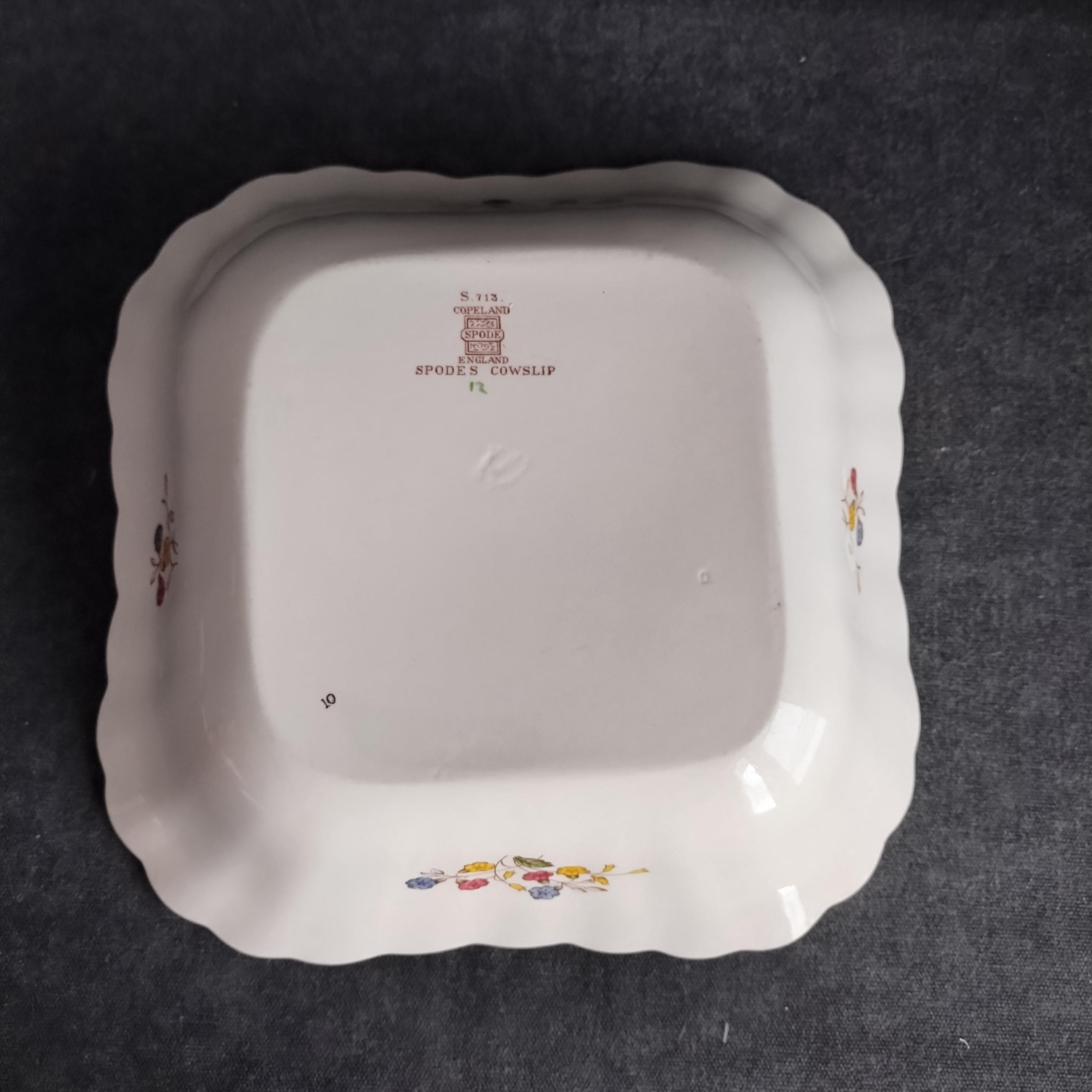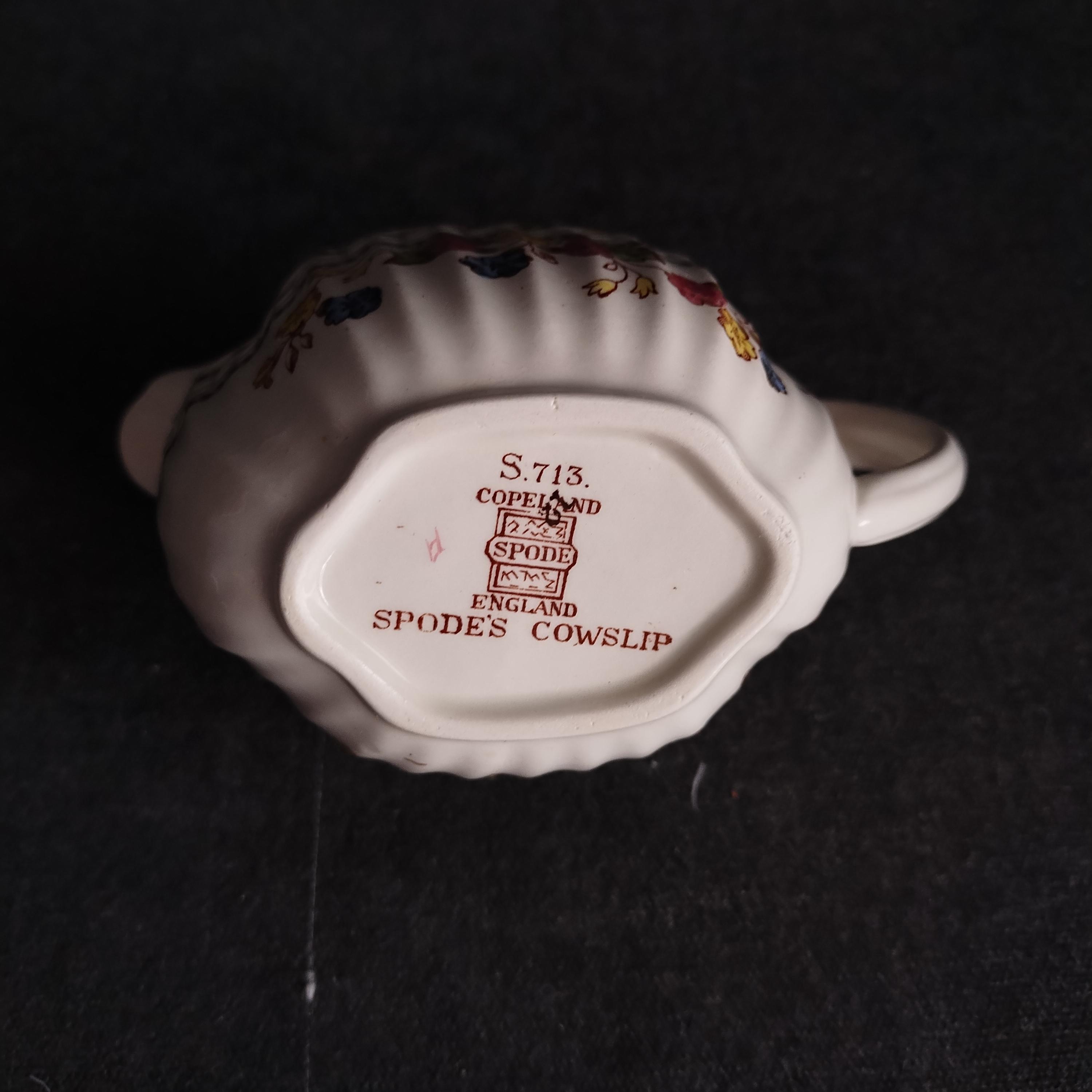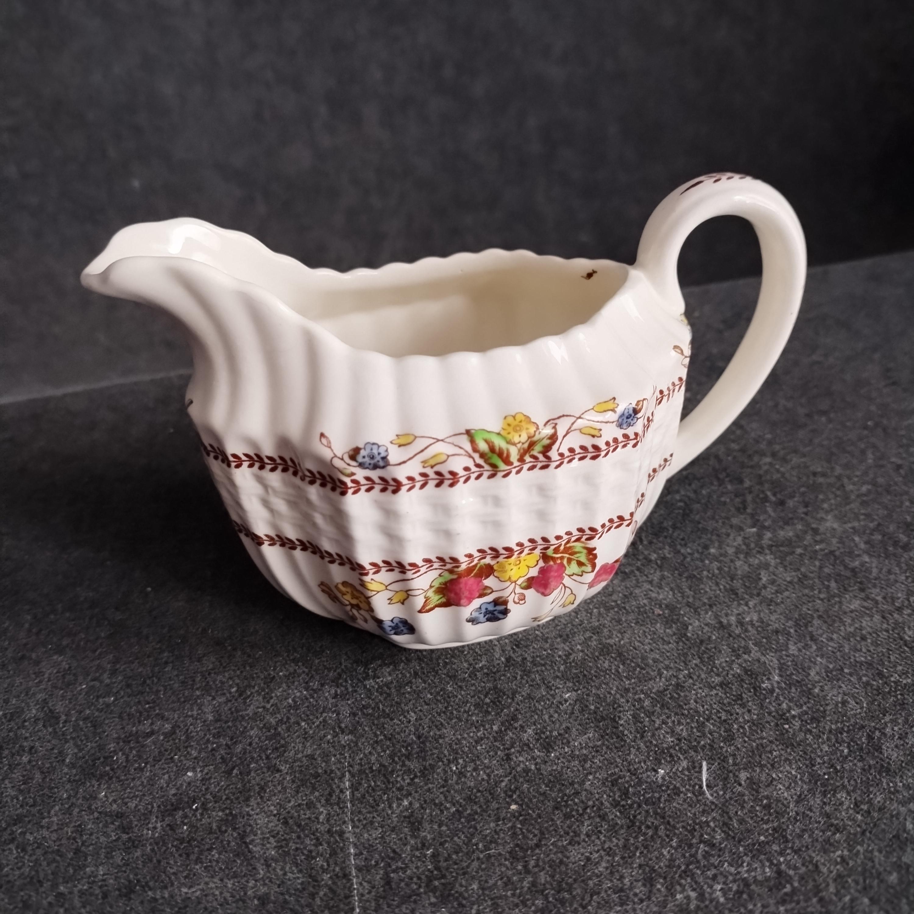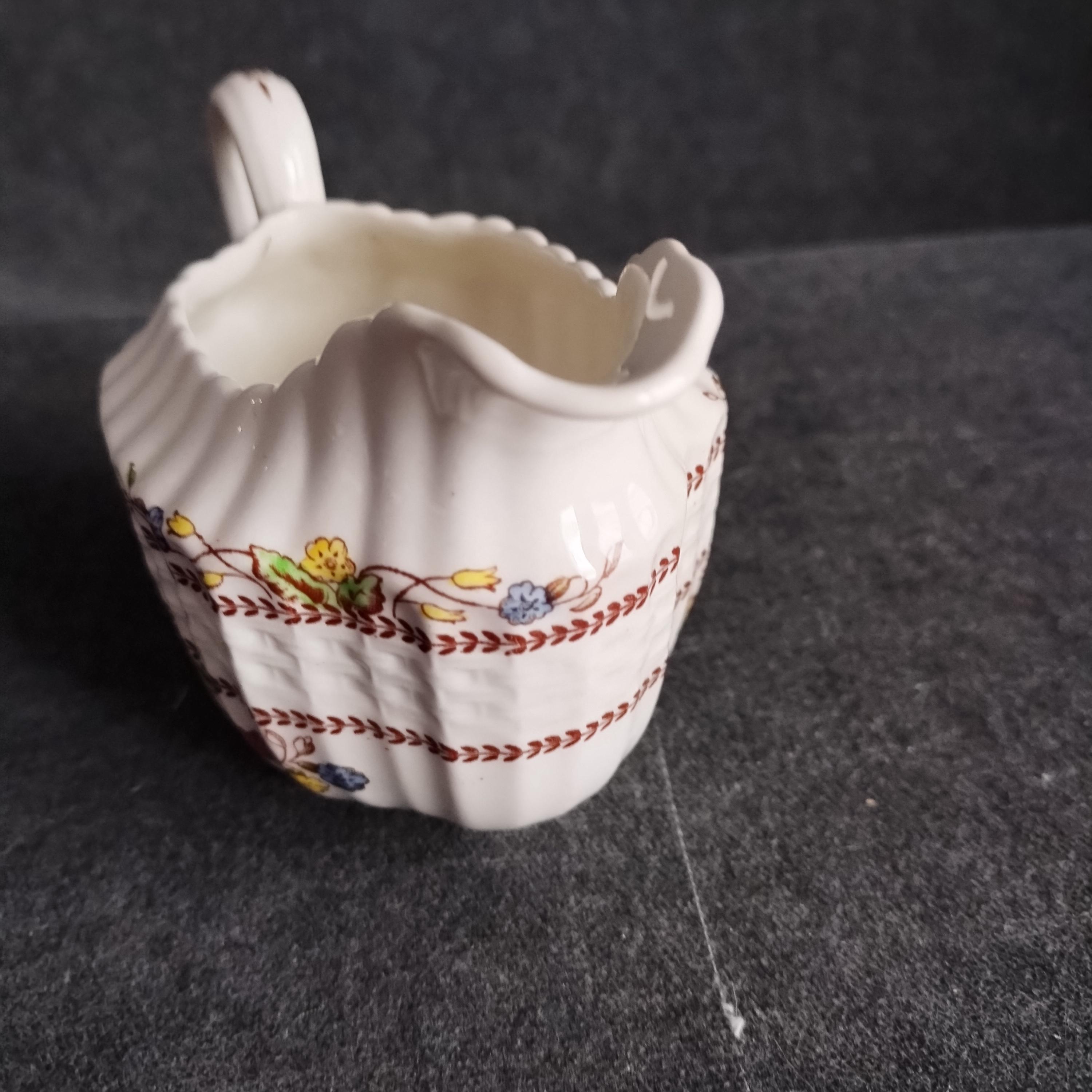 Copeland Spode produced this charming country pattern from 1942 to 1975. Hand painted multicolor "Cowslip" blossoms and brown transfer trims adorn a white background embossed with wicker details and scalloped edges. Marked on back with Copland Spode England backstamp. Plates available in other listings.