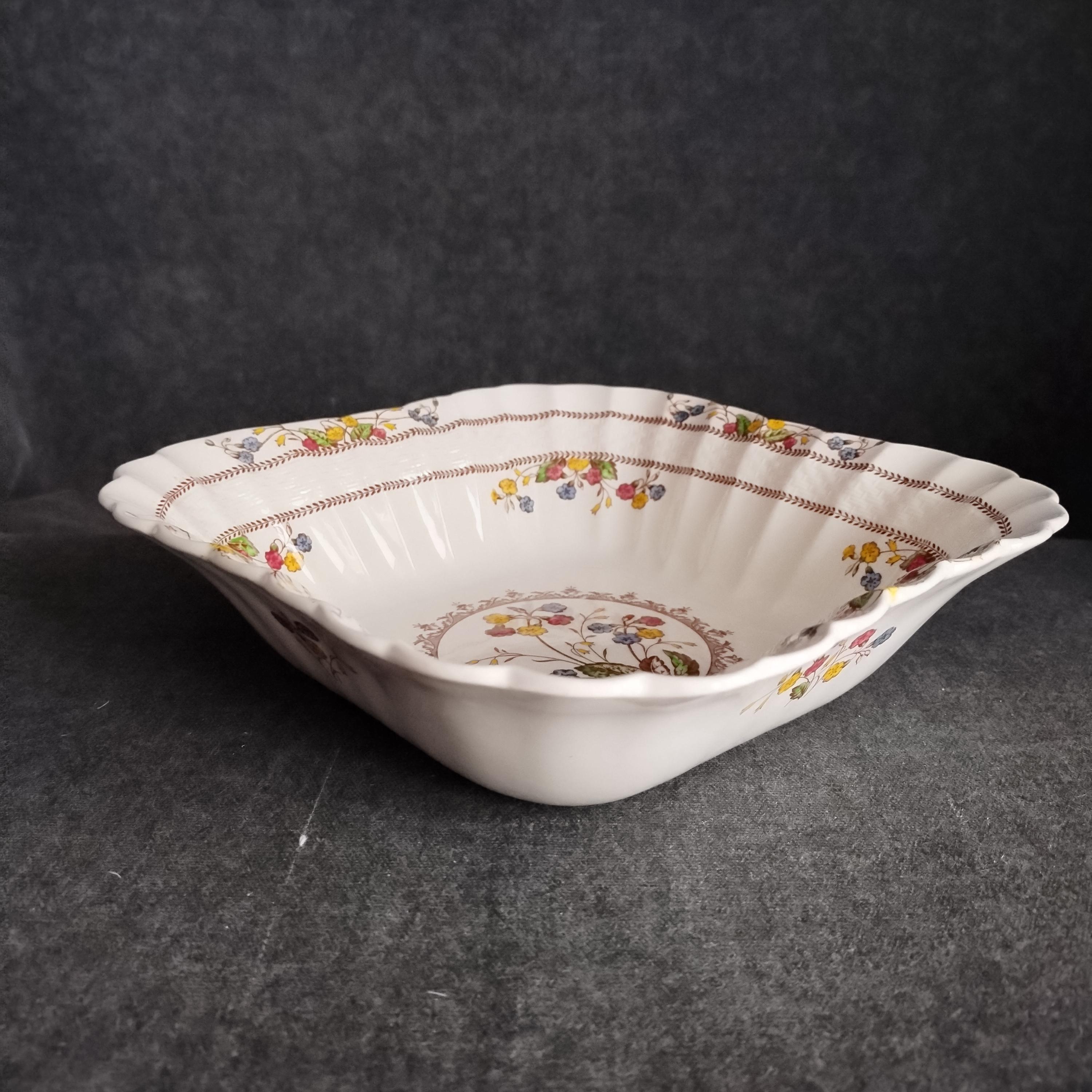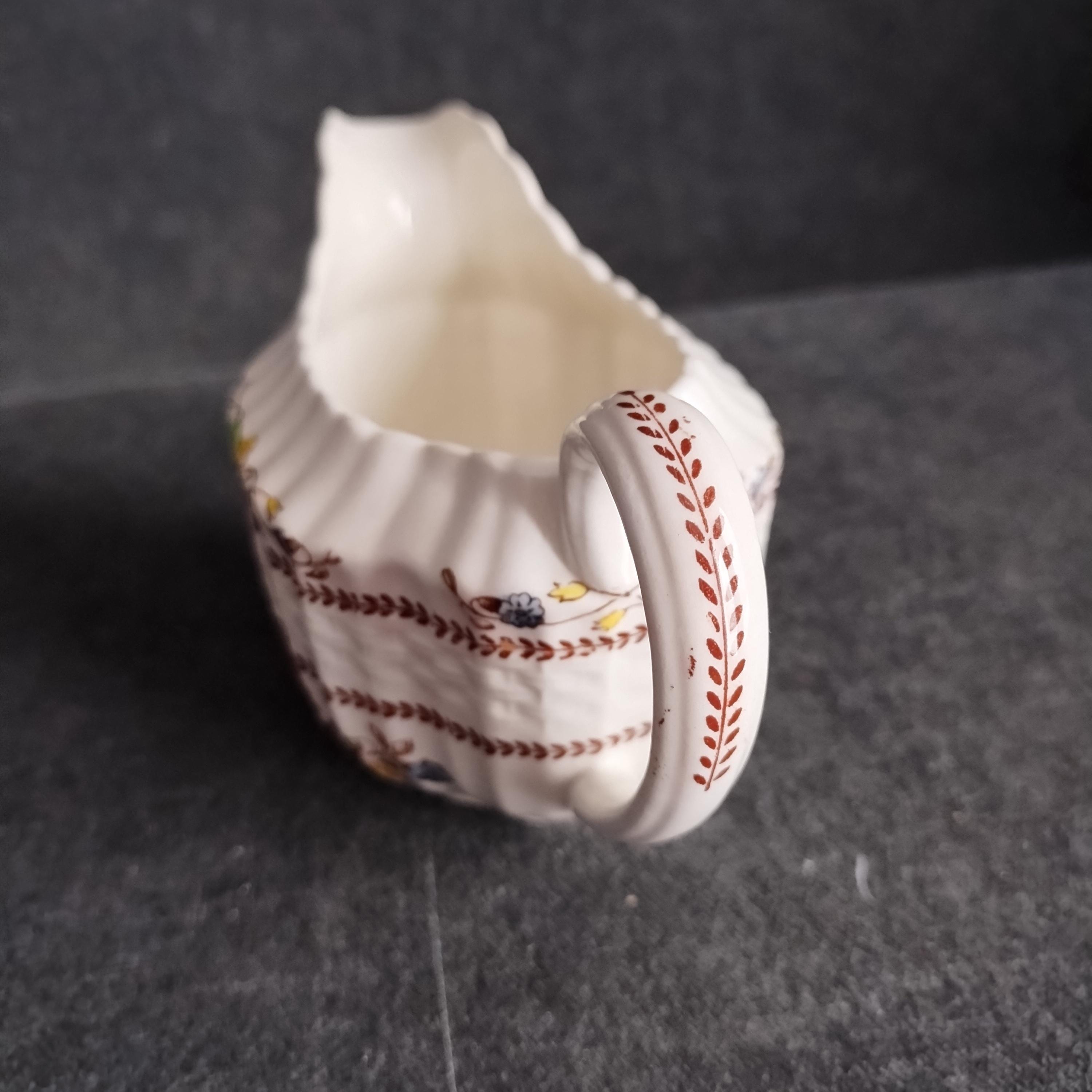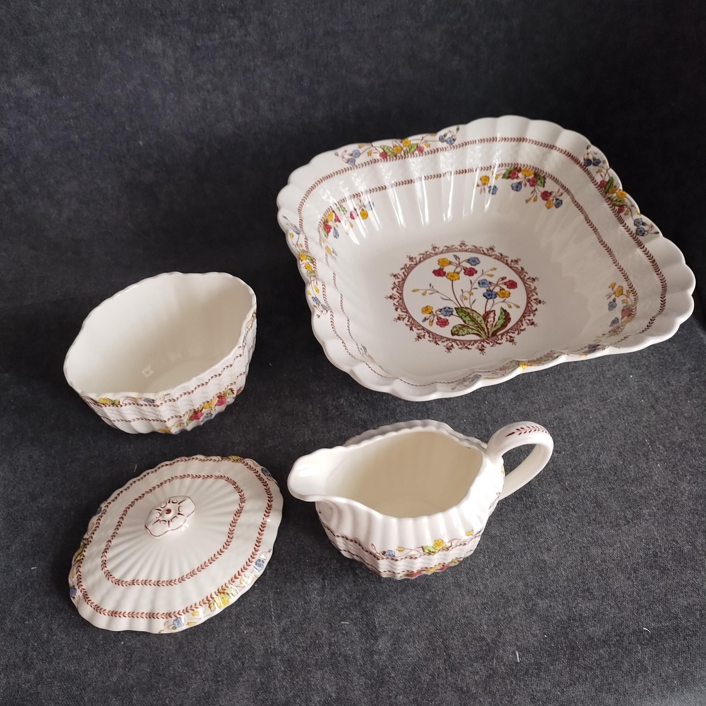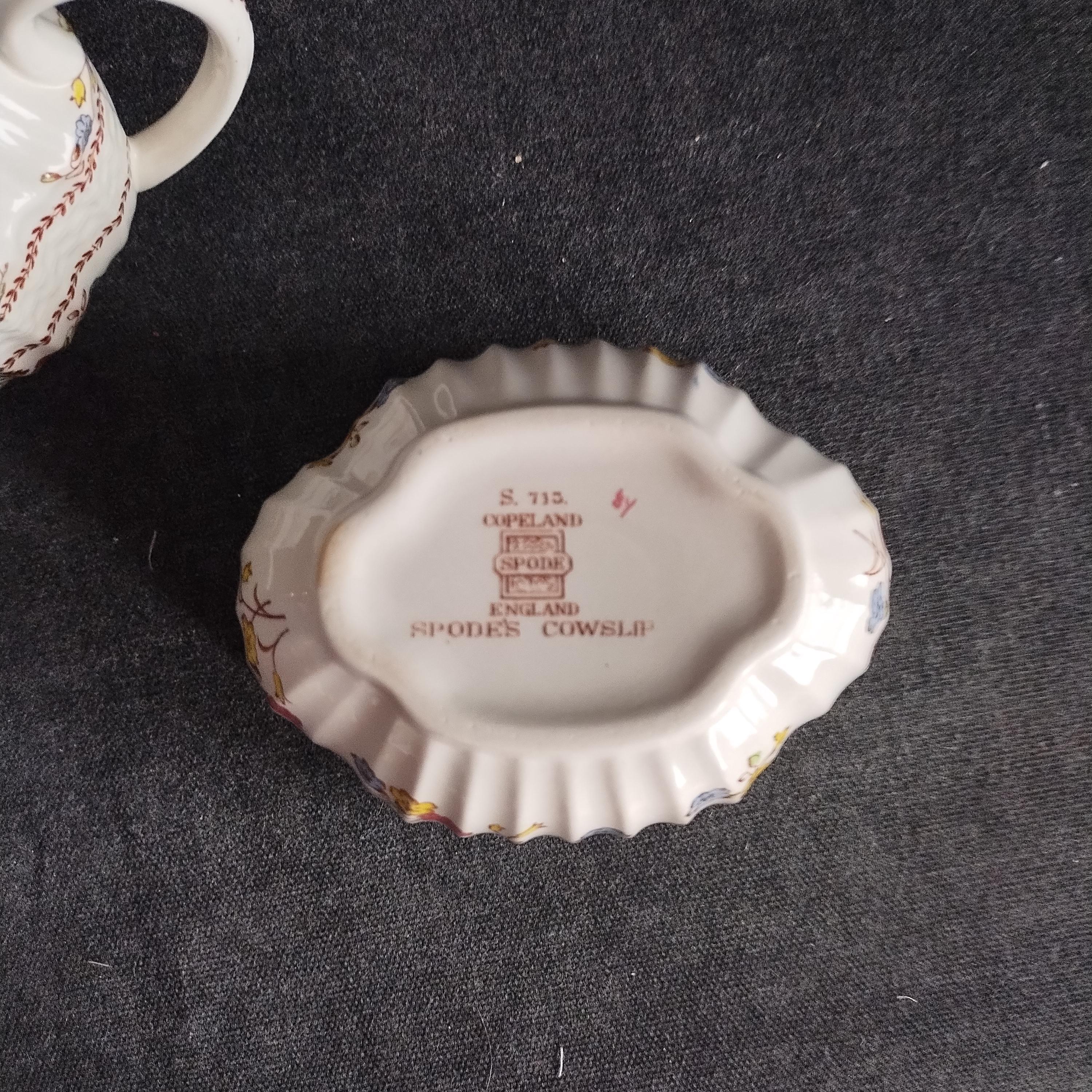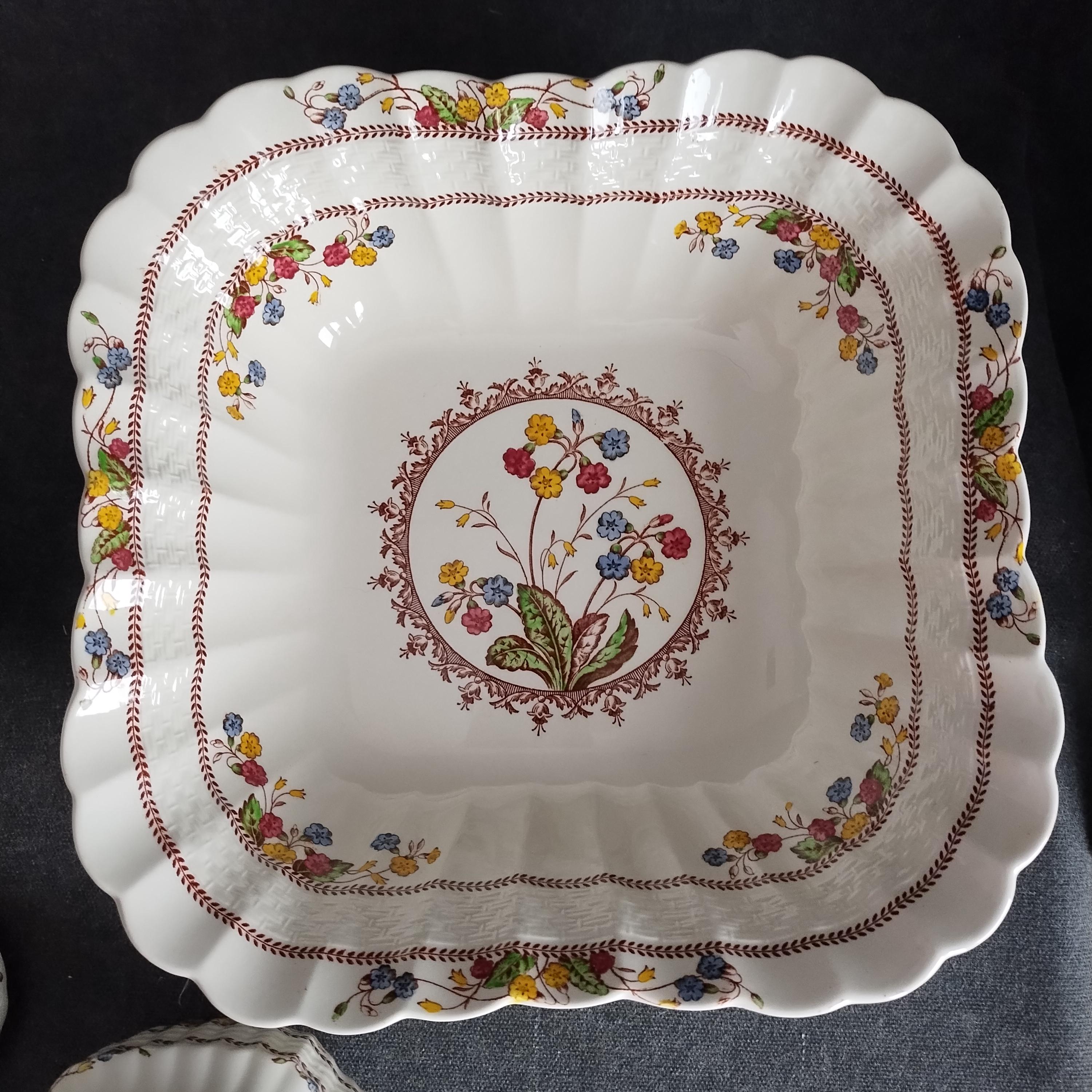 Copeland Spode produced this charming country pattern from 1942 to 1975. Hand painted multicolor "Cowslip" blossoms and brown transfer trims adorn a white background embossed with wicker details and scalloped edges. Marked on back with Copland Spode England backstamp. Plates available in other listings.