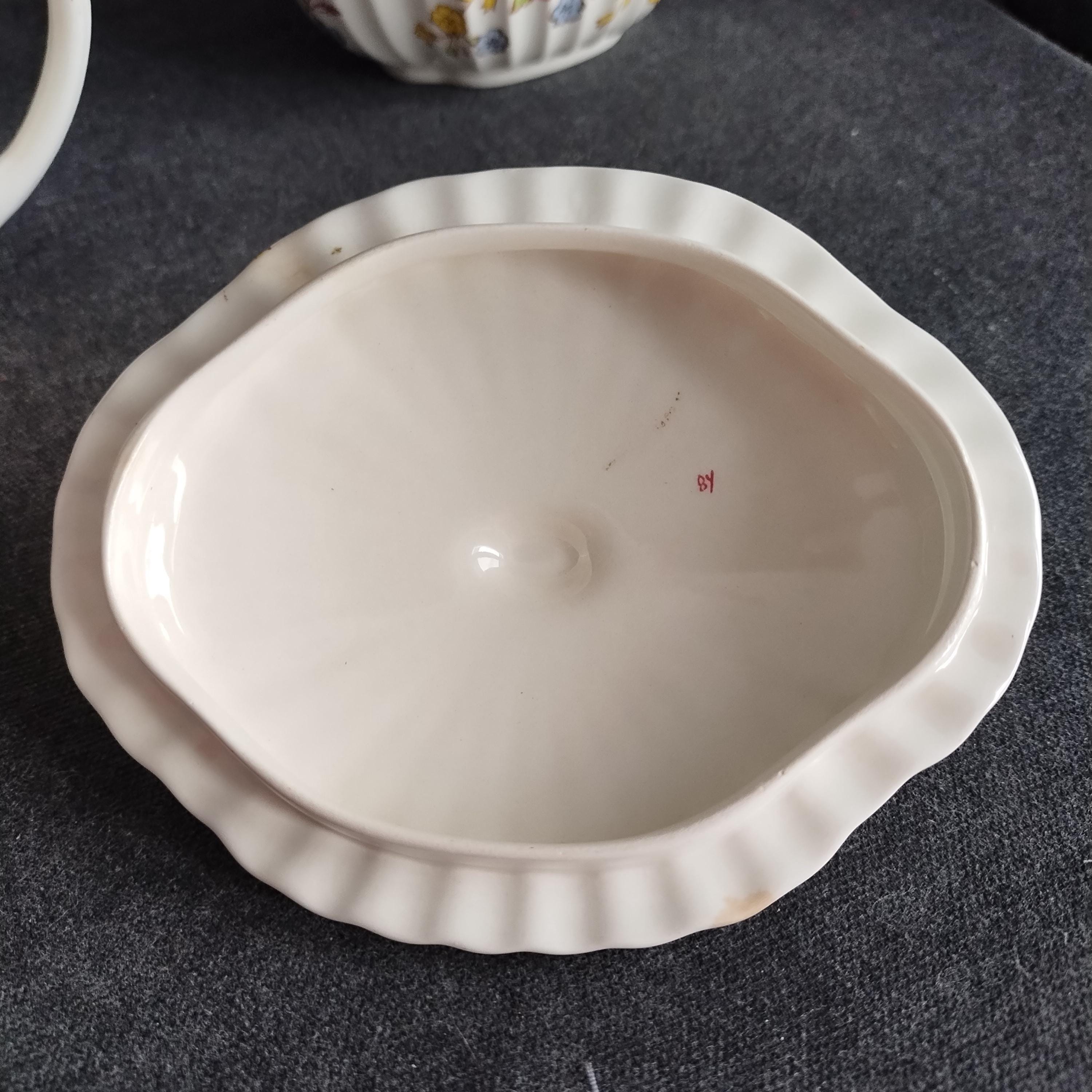 Condition is fair - there is a tiny chip on the rim and a bruise on the underside of the lid. Otherwise no cracks, repairs, or crazing.