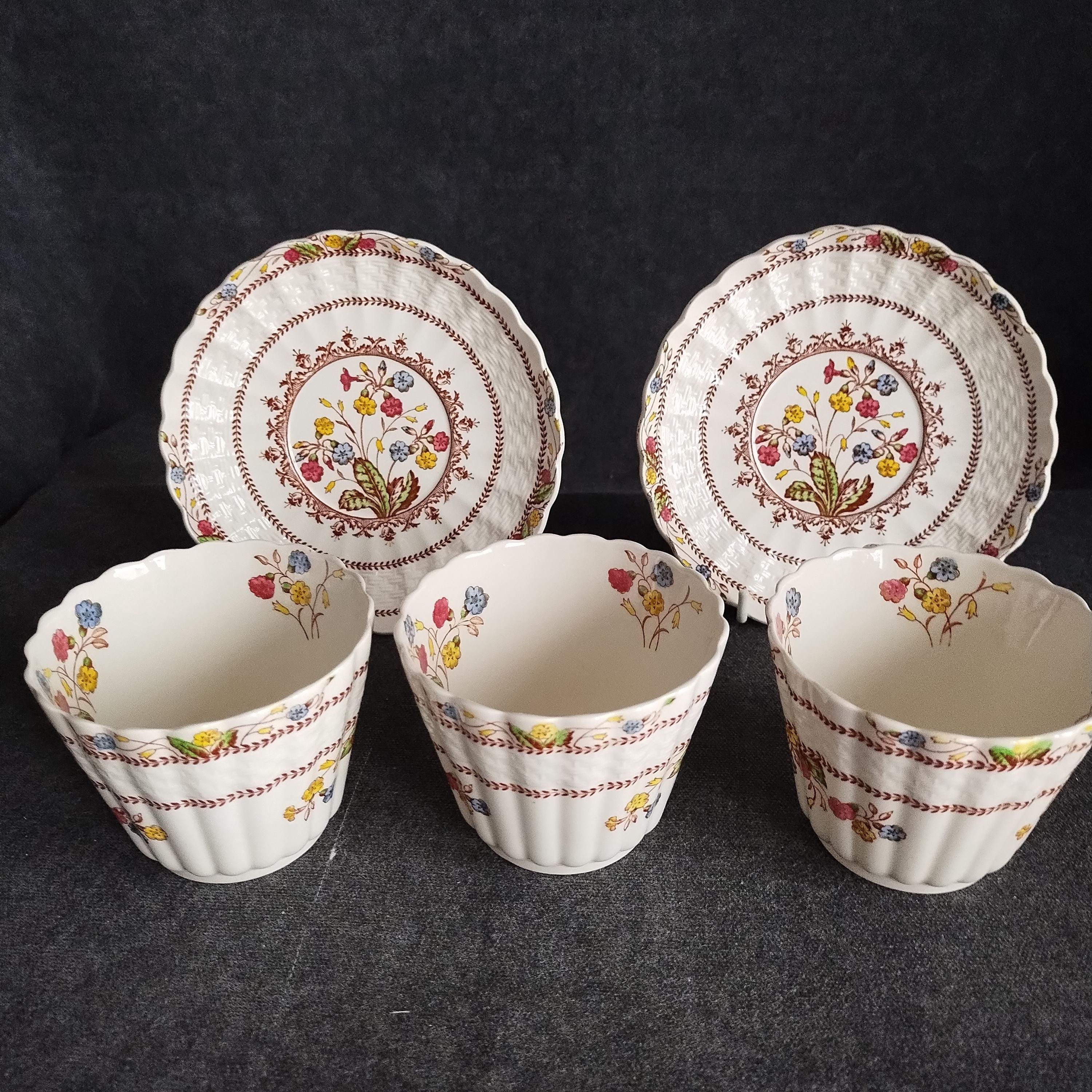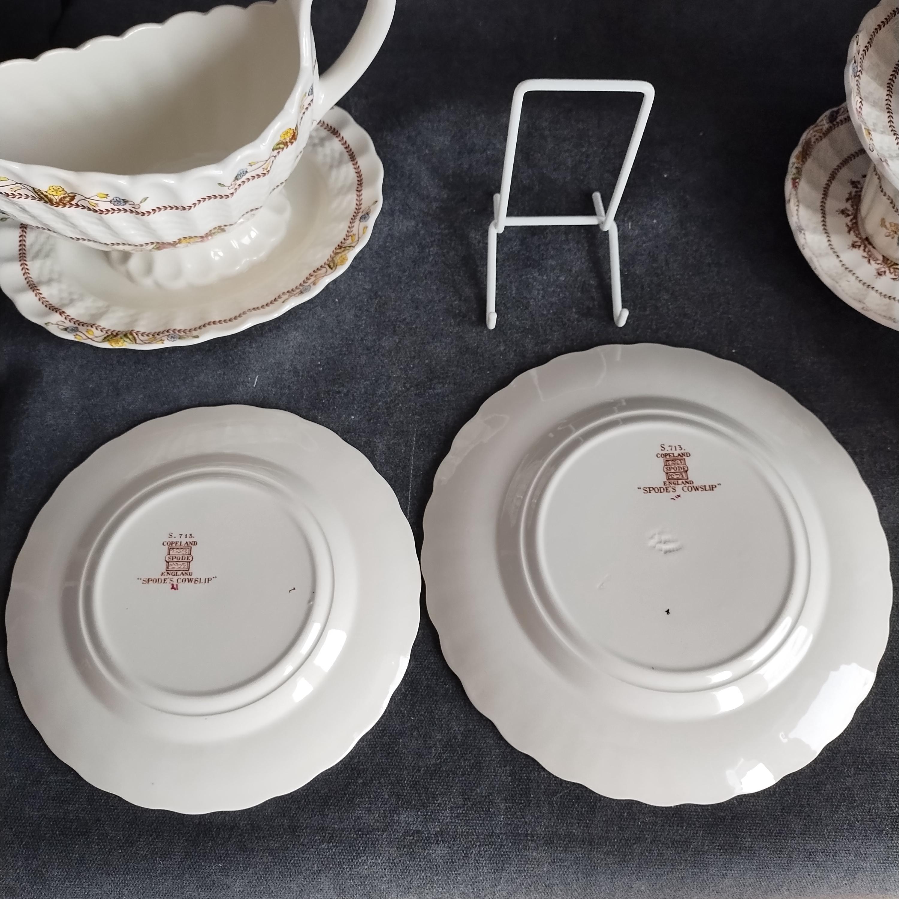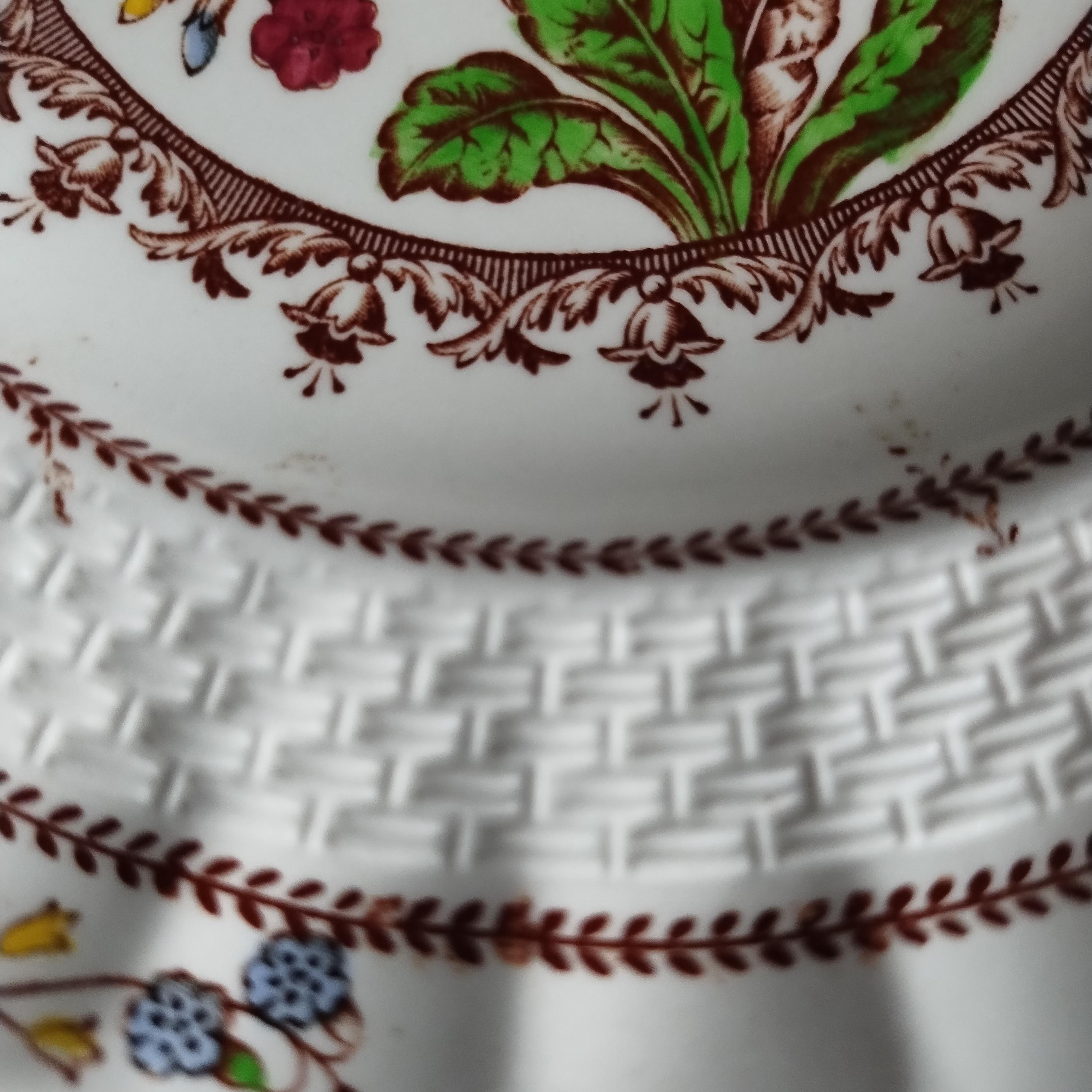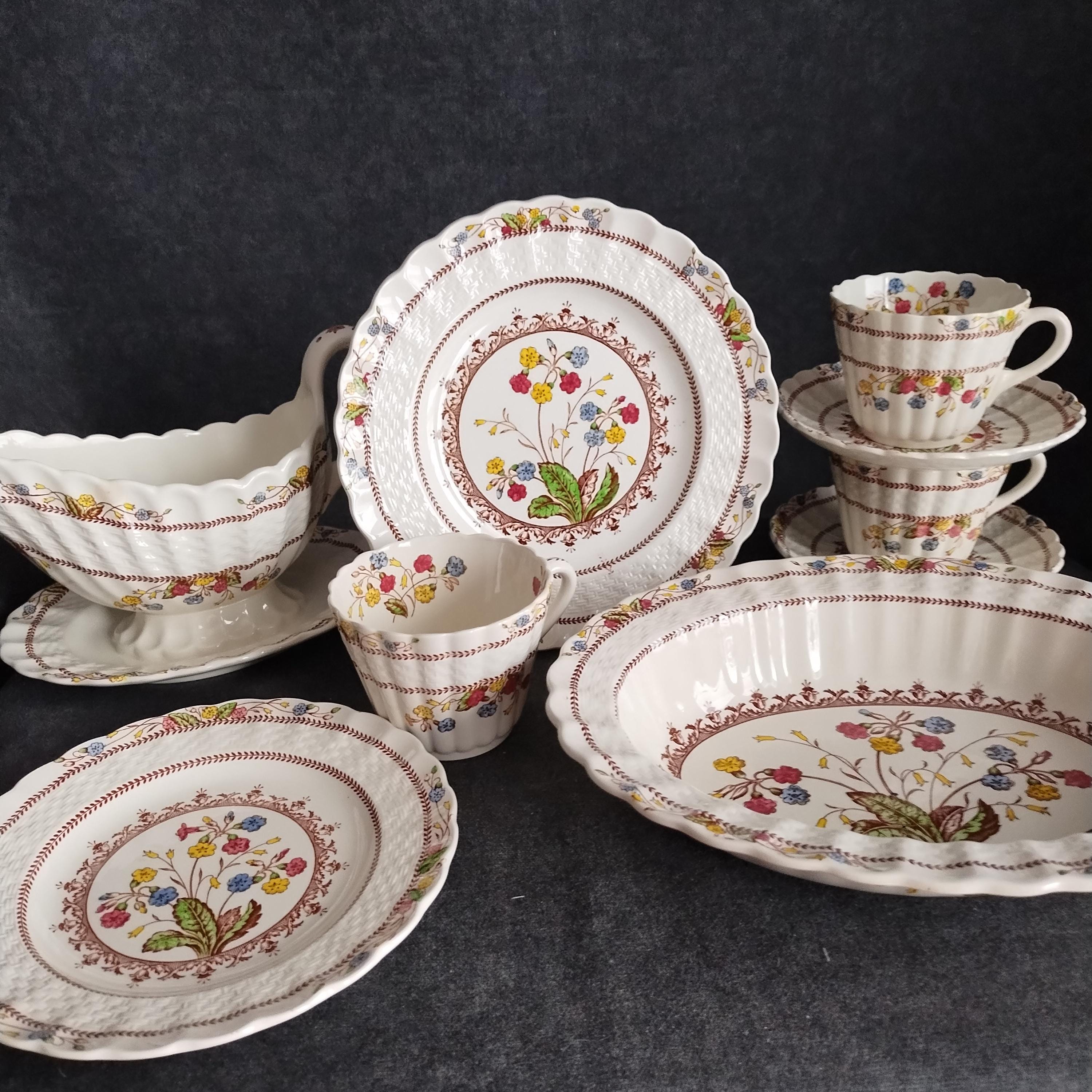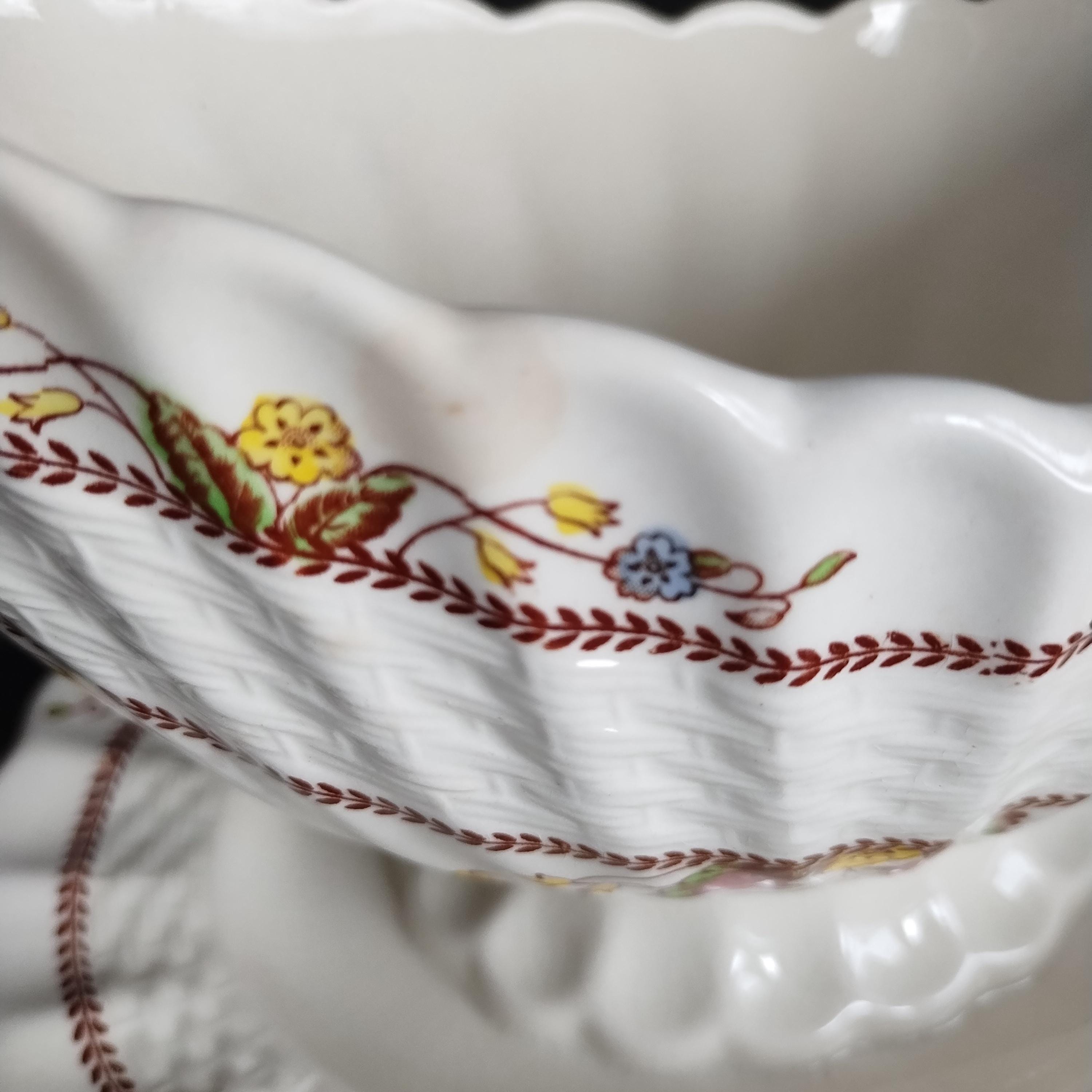 Copeland Spode produced this charming country pattern from 1942 to 1975. Hand painted multicolor "Cowslip" blossoms and brown transfer trims adorn a white background embossed with wicker details and scalloped edges. Marked on back with Copland Spode England backstamp. Included in this assorted lot ...