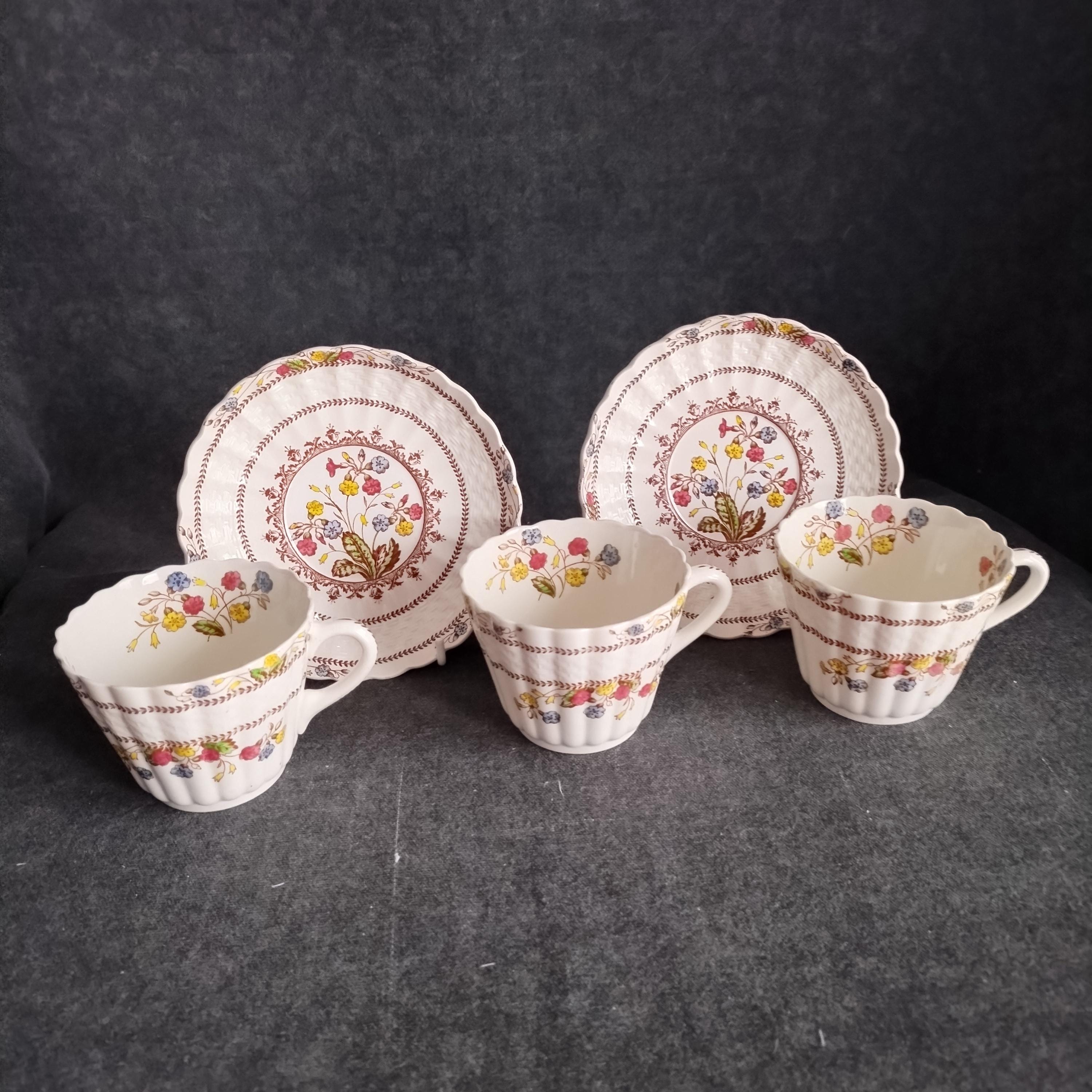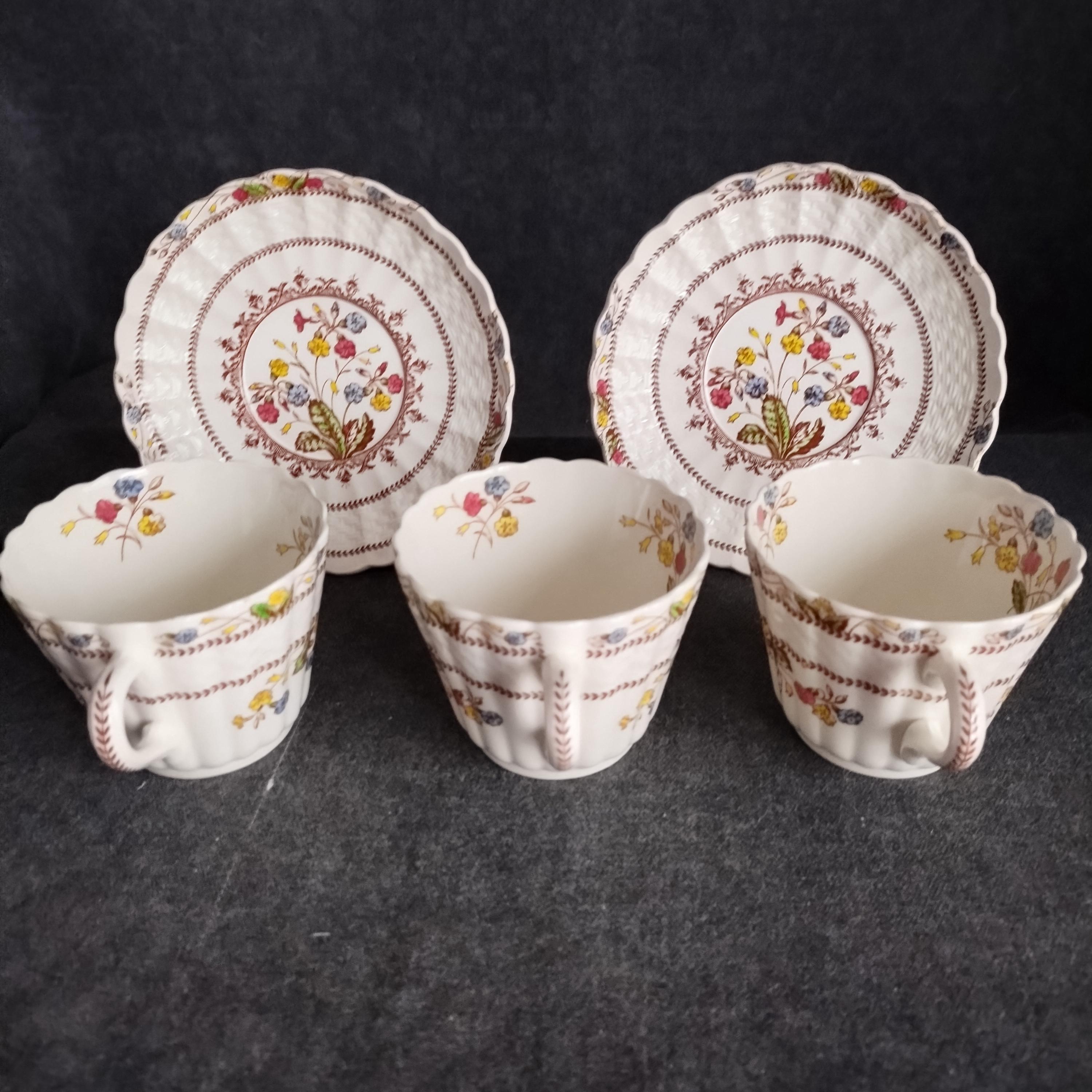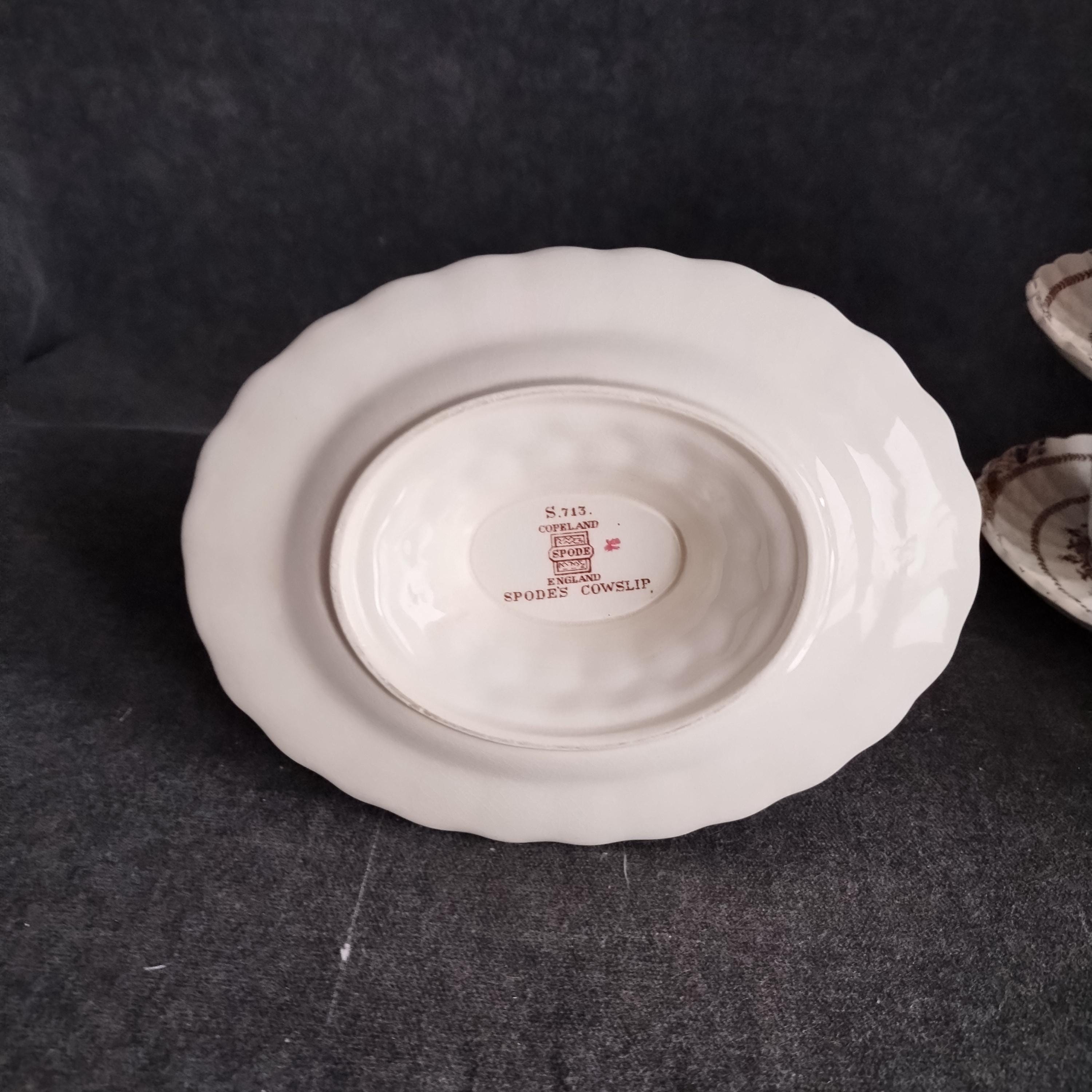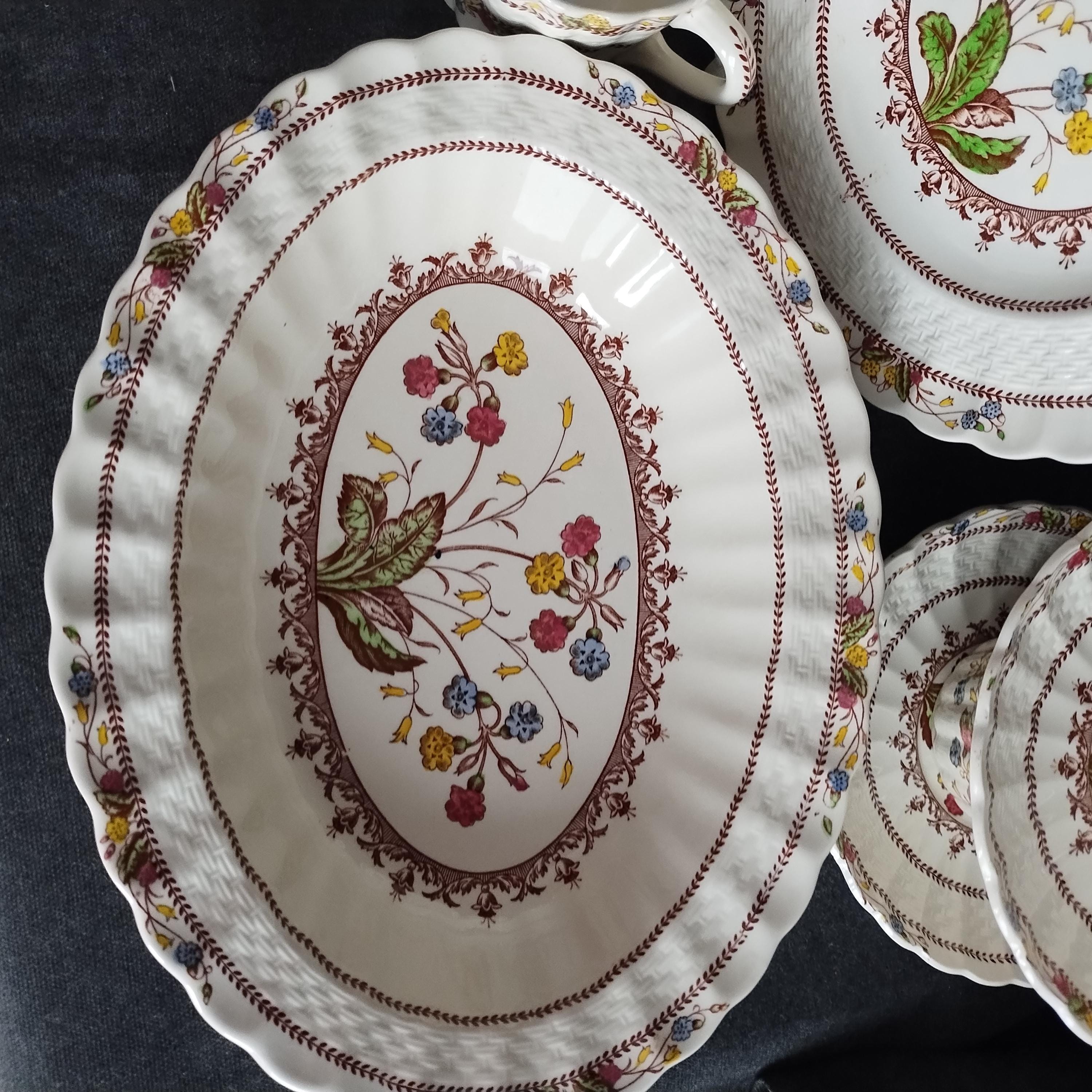 Copeland Spode produced this charming country pattern from 1942 to 1975. Hand painted multicolor "Cowslip" blossoms and brown transfer trims adorn a white background embossed with wicker details and scalloped edges. Marked on back with Copland Spode England backstamp. Included in this assorted lot ...