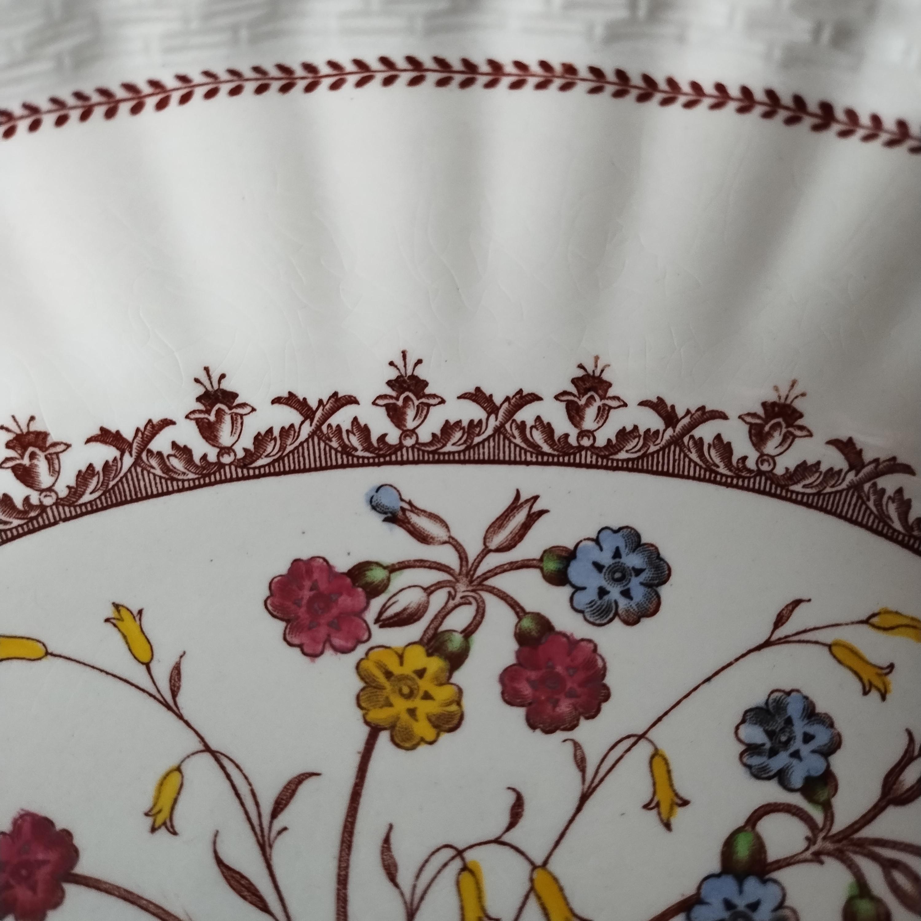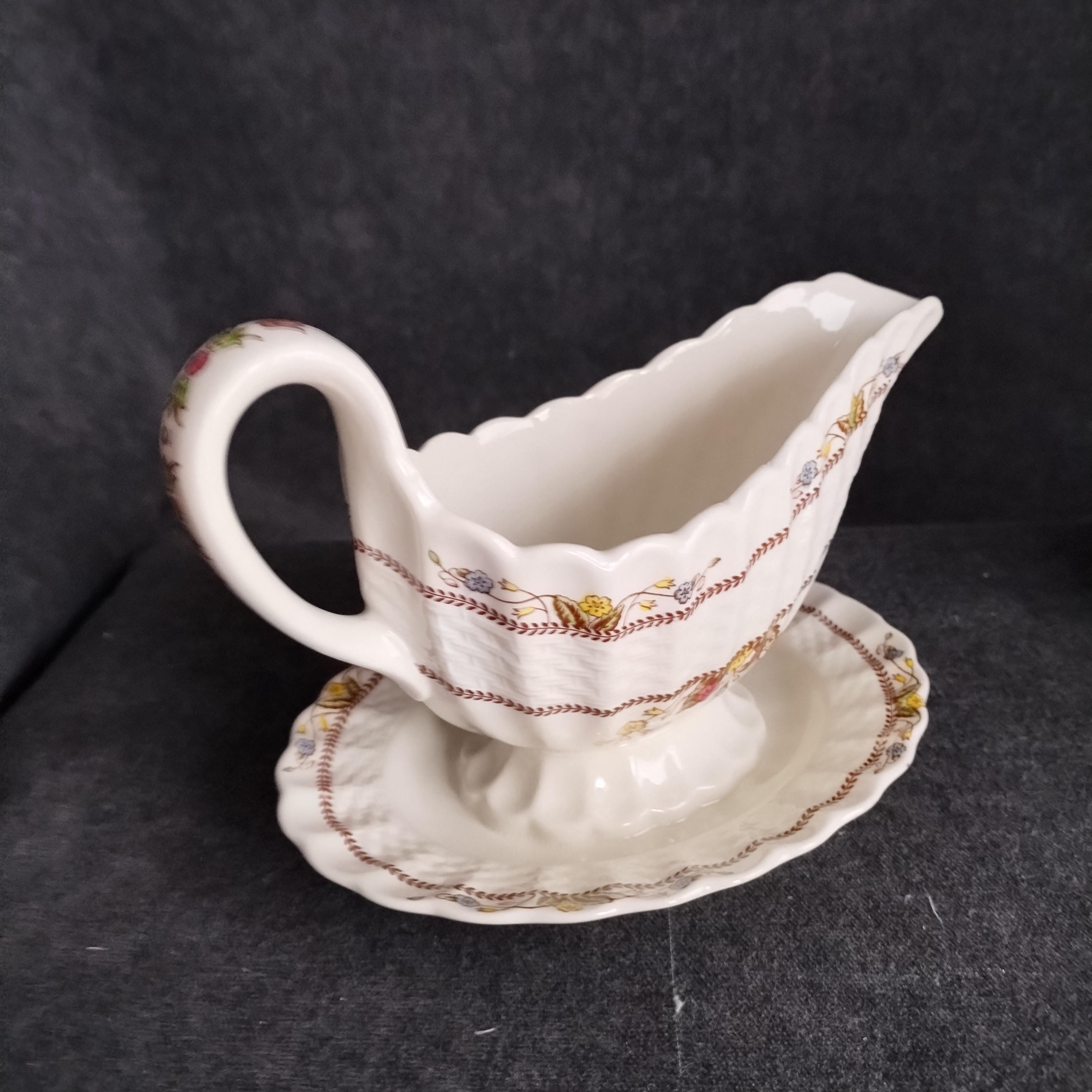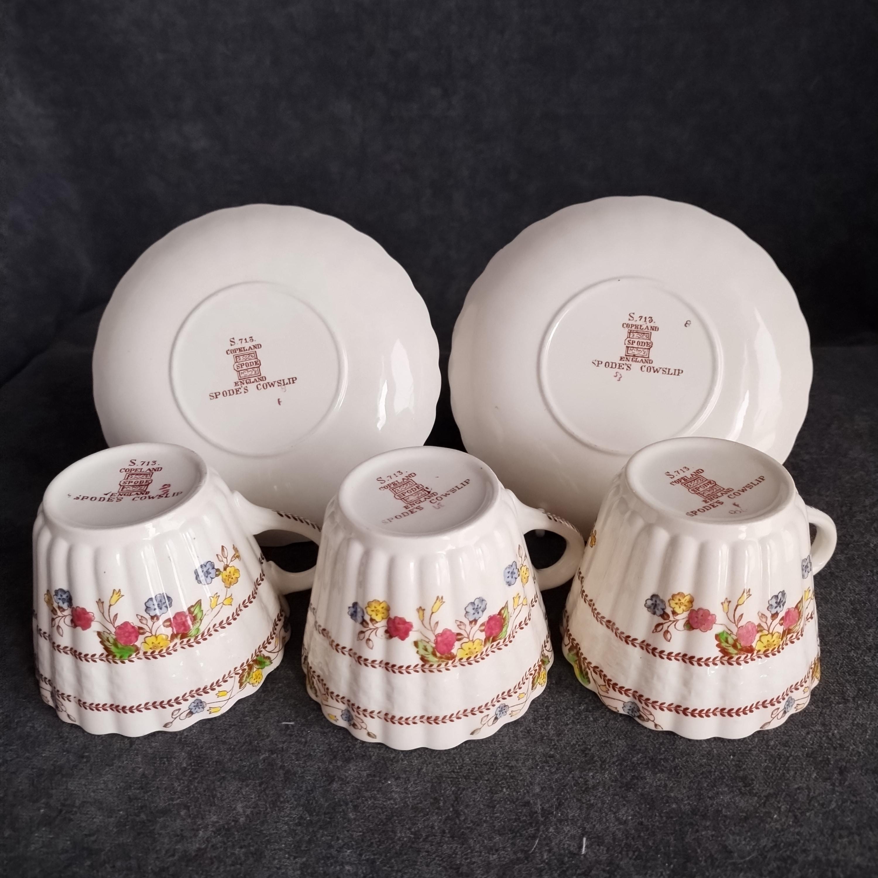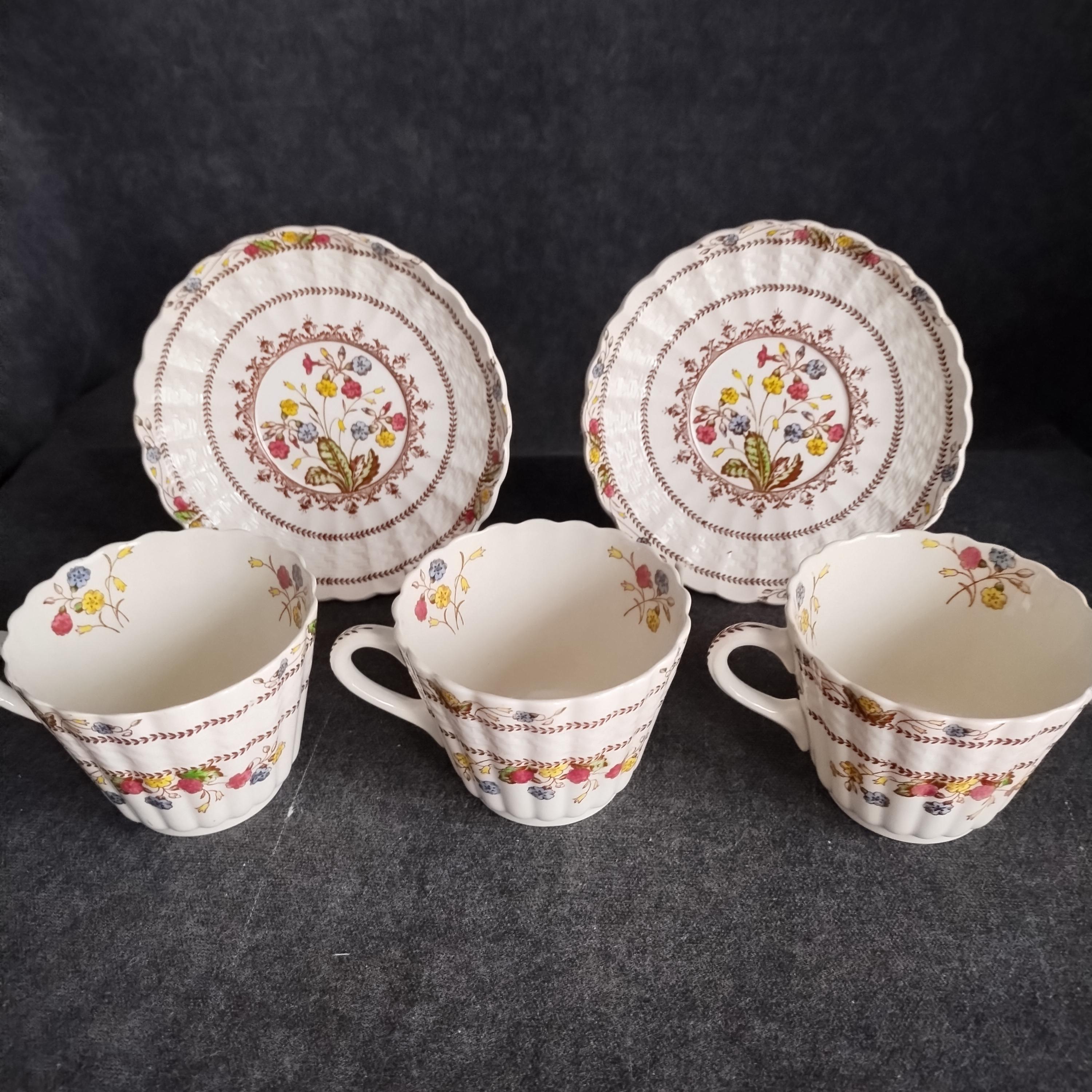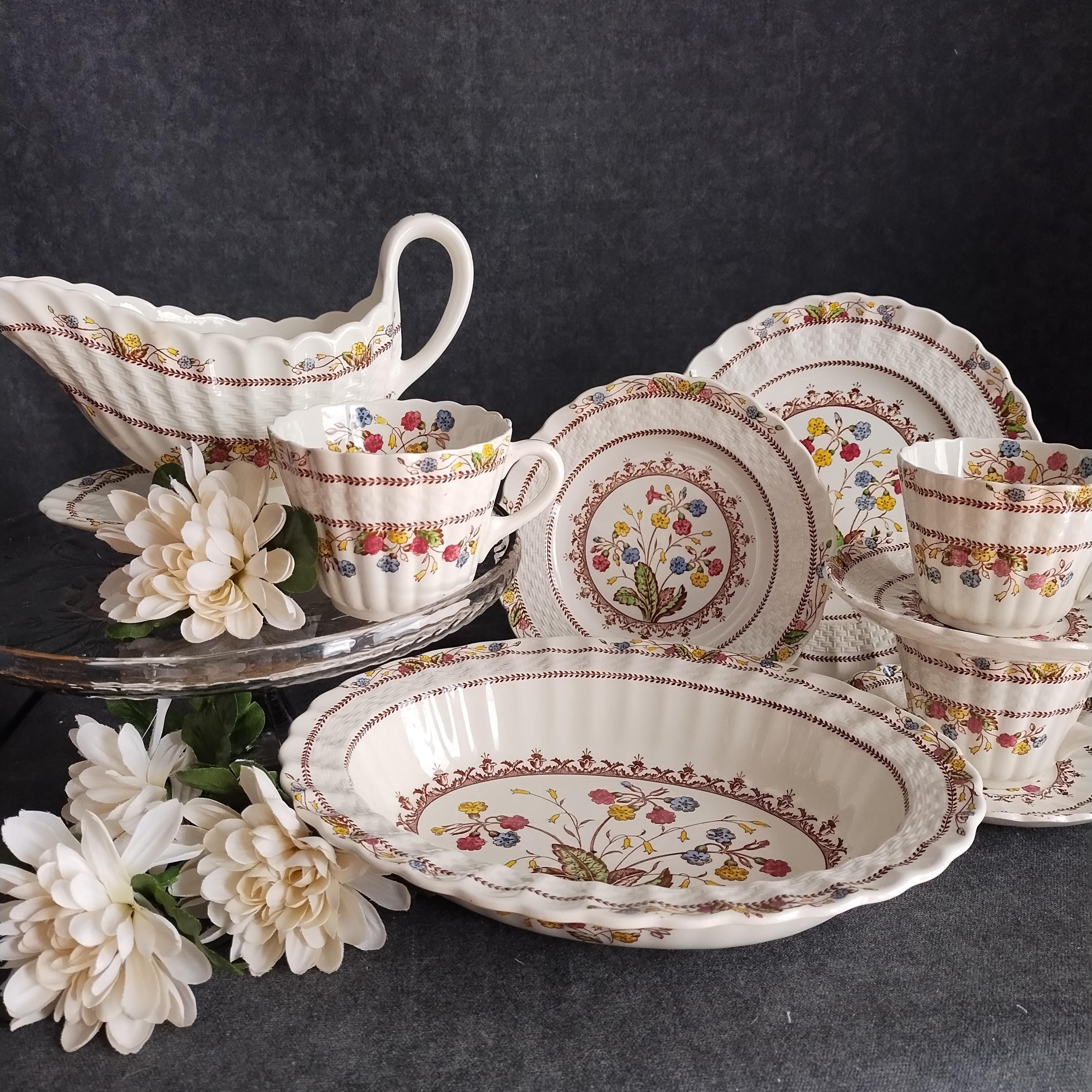 Copeland Spode produced this charming country pattern from 1942 to 1975. Hand painted multicolor "Cowslip" blossoms and brown transfer trims adorn a white background embossed with wicker details and scalloped edges. Marked on back with Copland Spode England backstamp. Included in this assorted lot ...