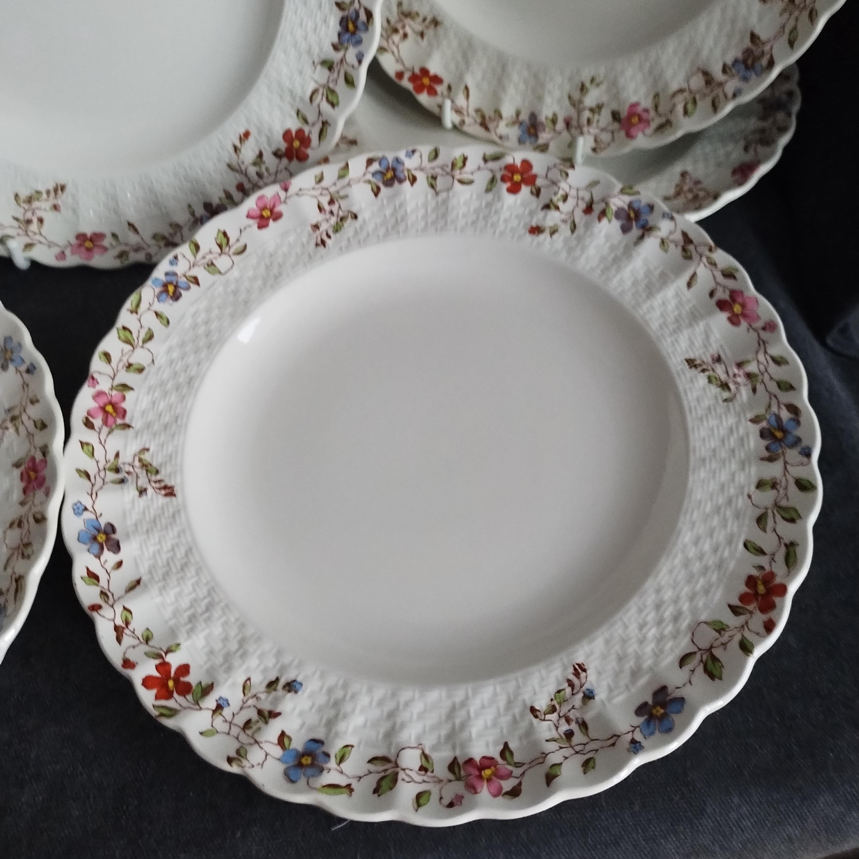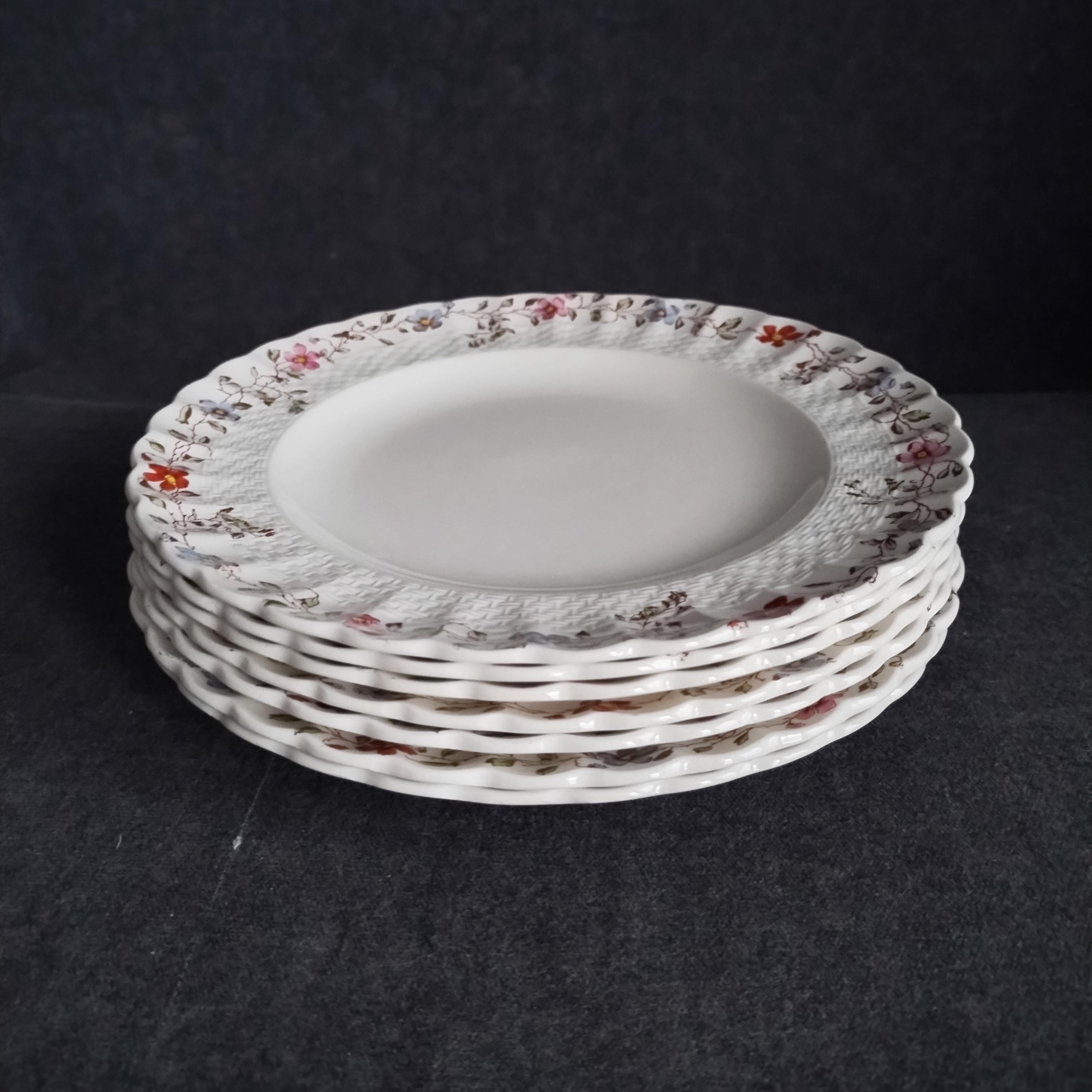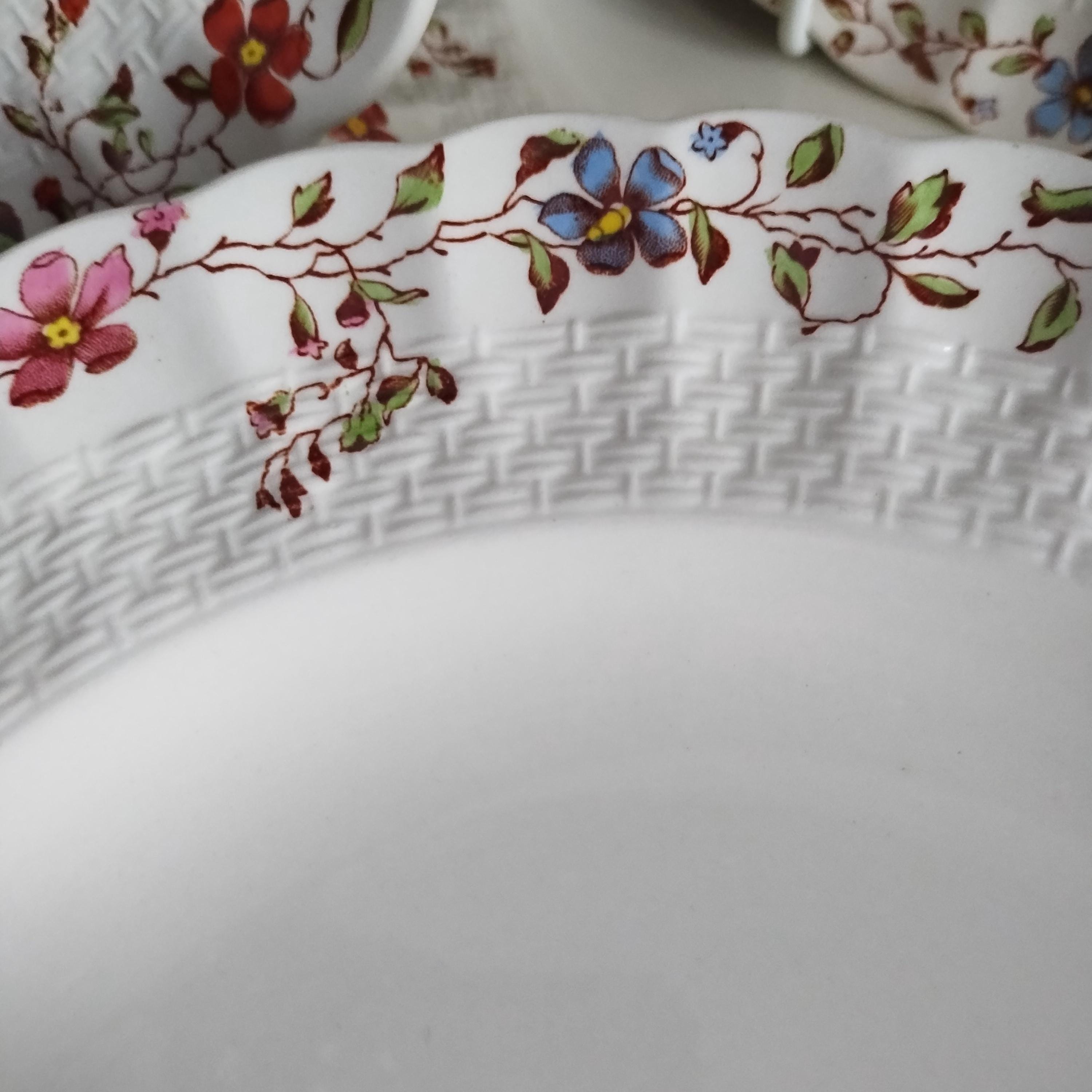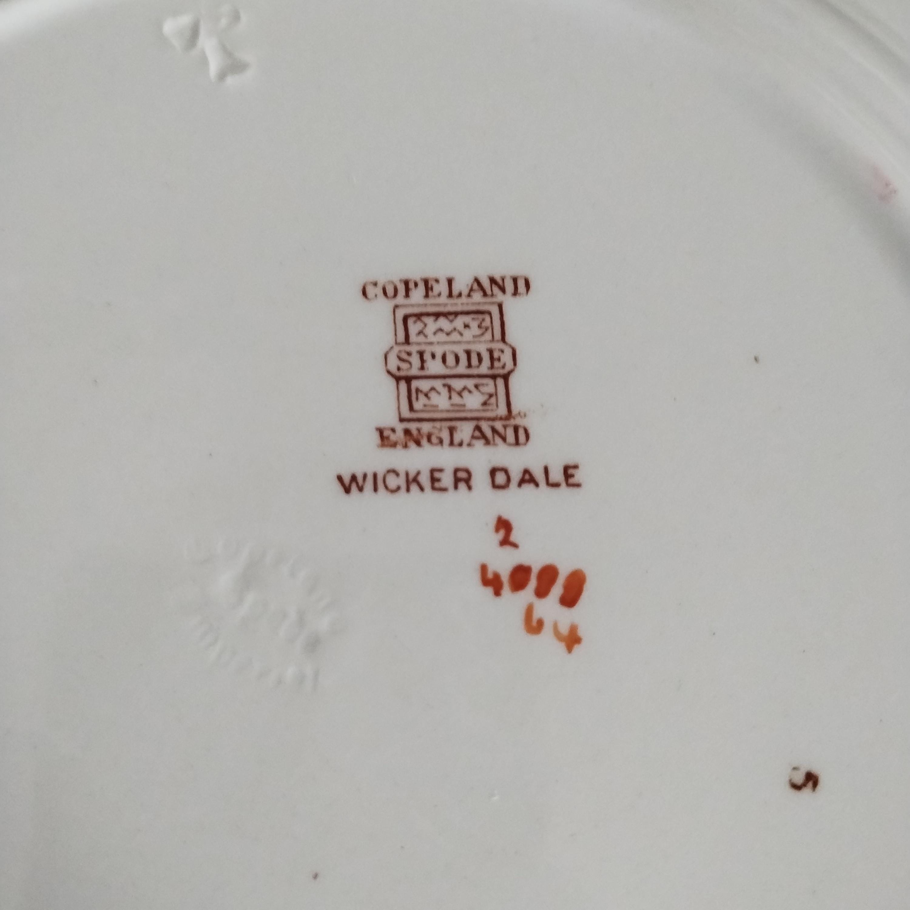 Copeland Spode produced this charming country pattern from 1954 to 1975. Wicker Dale features a brown transfer pattern finished with hand painted multicolor flowers and green leaves around the rim of a white plate embossed with a wicker design. Marked on back with Copland Spode England backstamp.