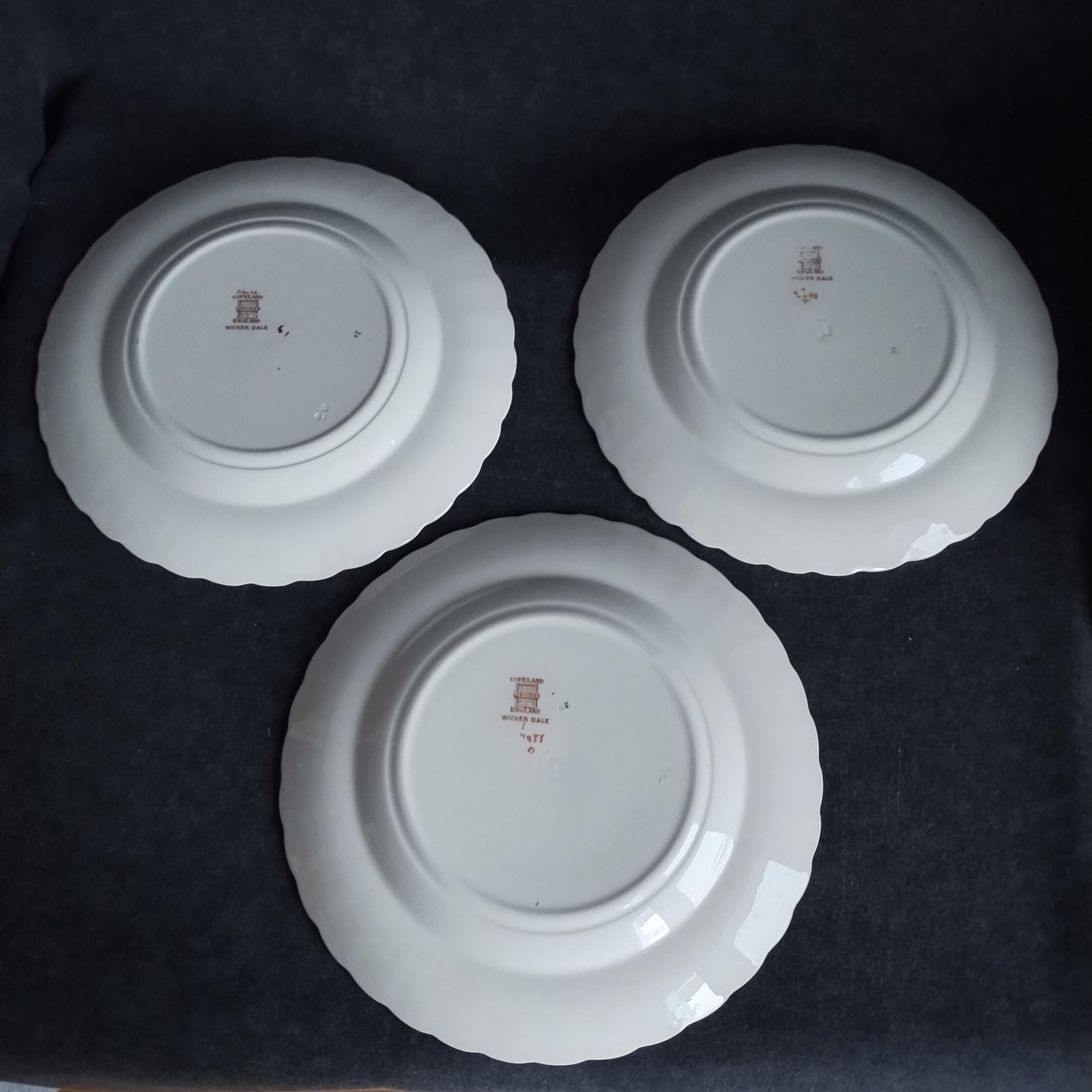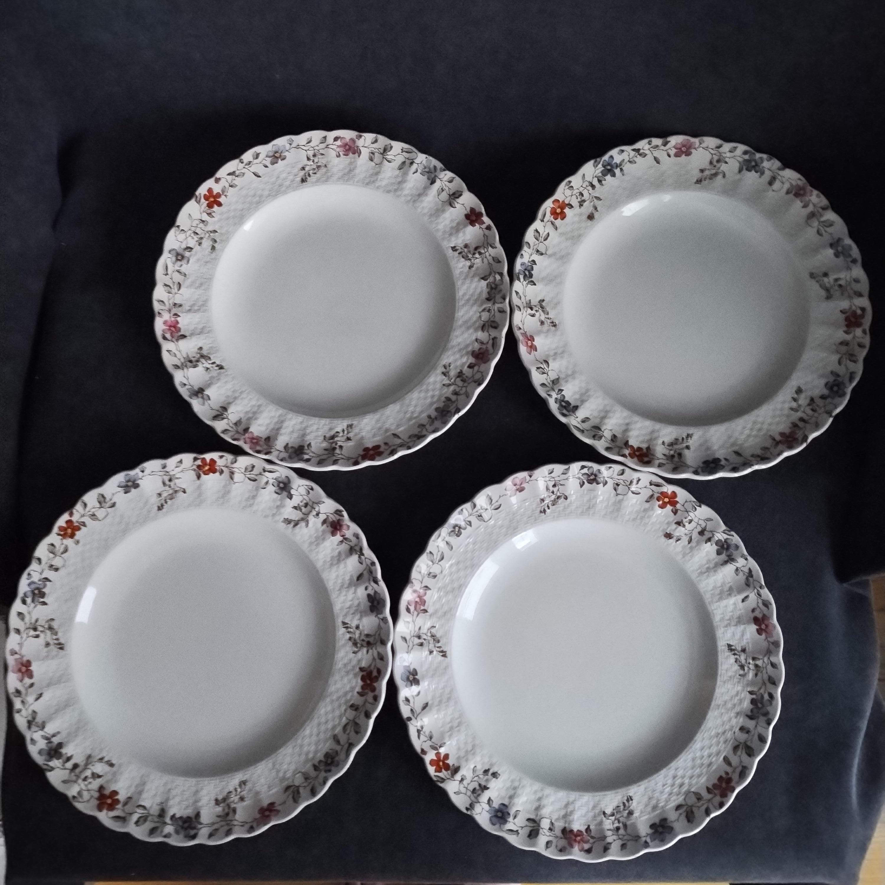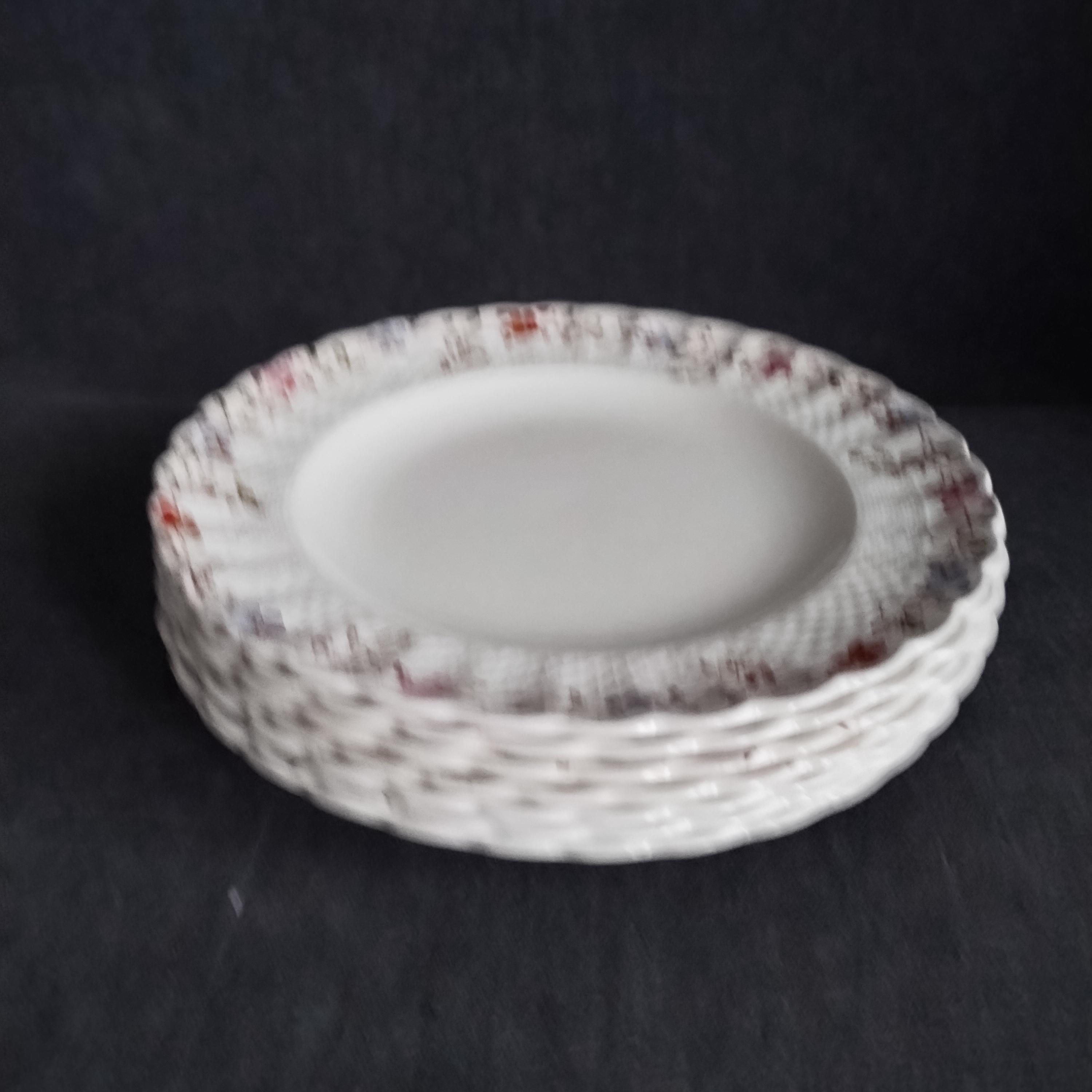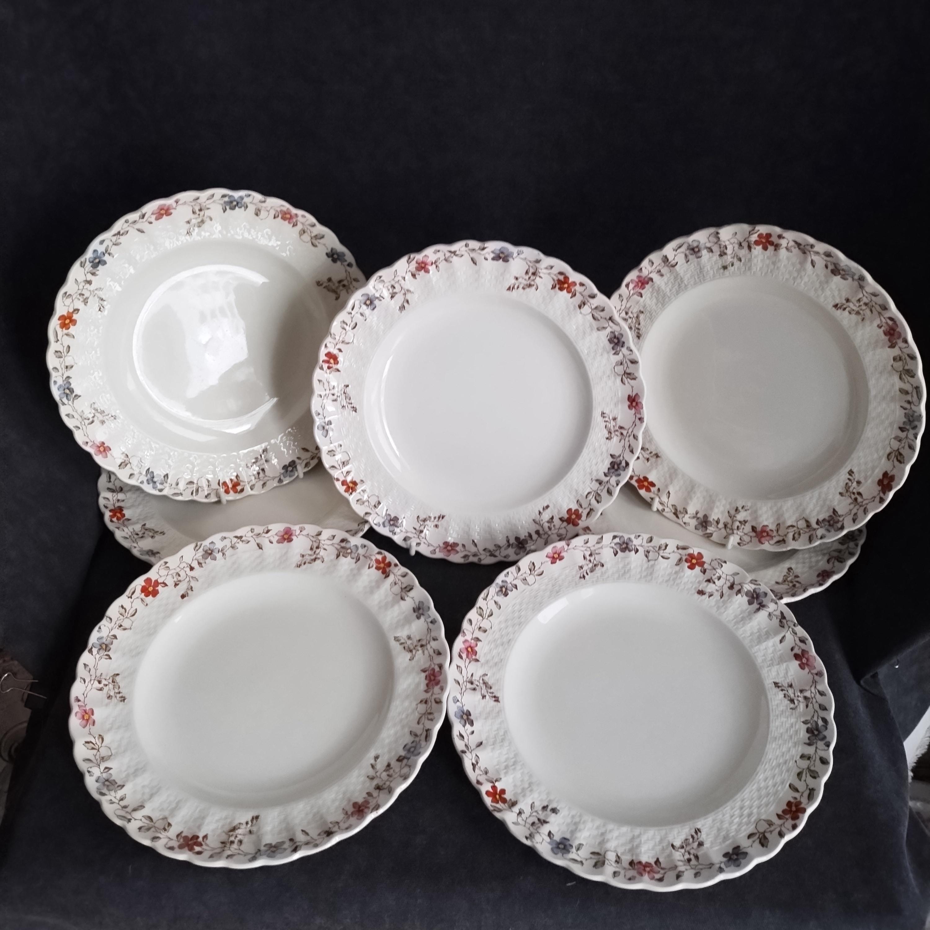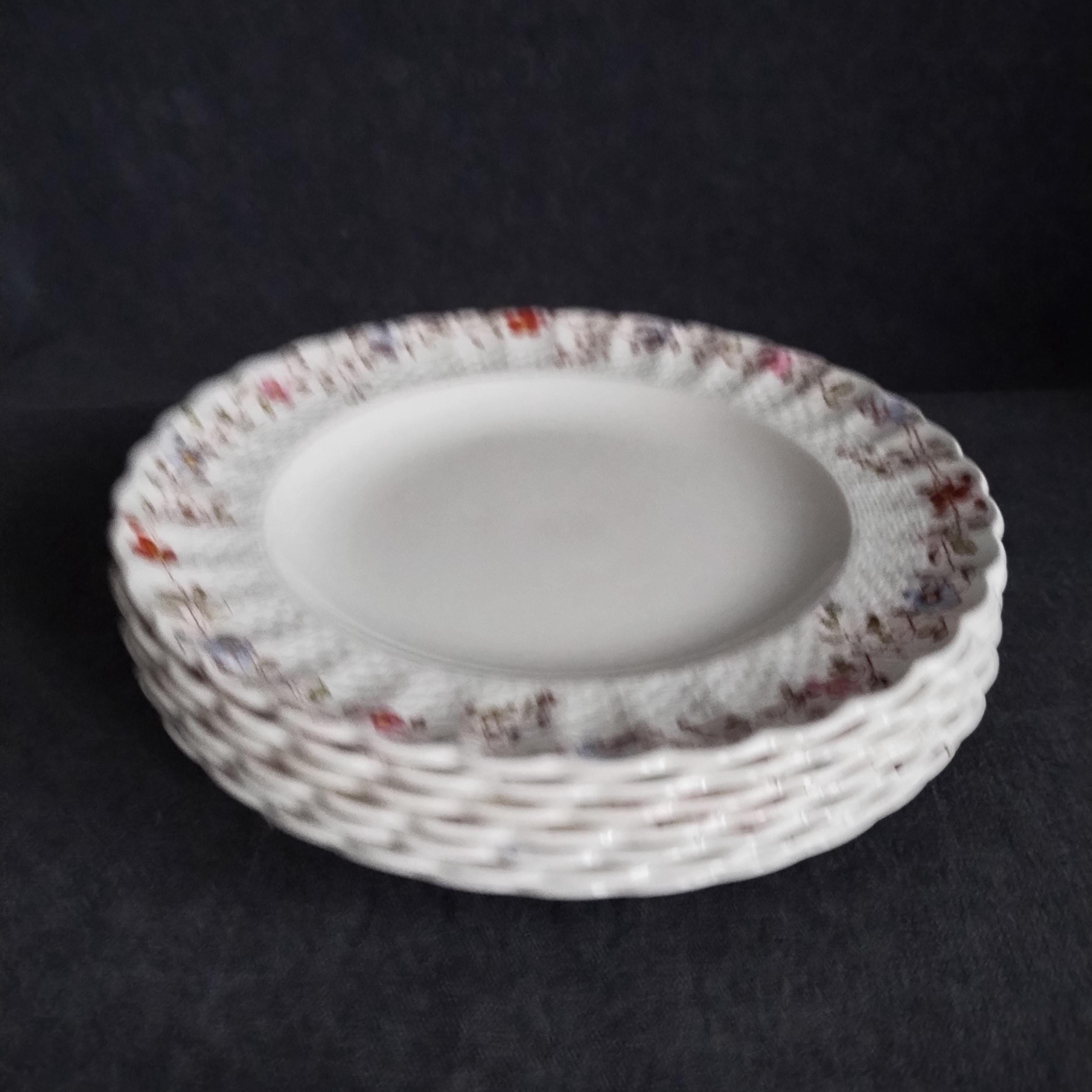 Copeland Spode produced this charming country pattern from 1954 to 1975. Wicker Dale features a brown transfer pattern finished with hand painted multicolor flowers and green leaves around the rim of a white plate embossed with a wicker design. Marked on back with Copland Spode England backstamp.