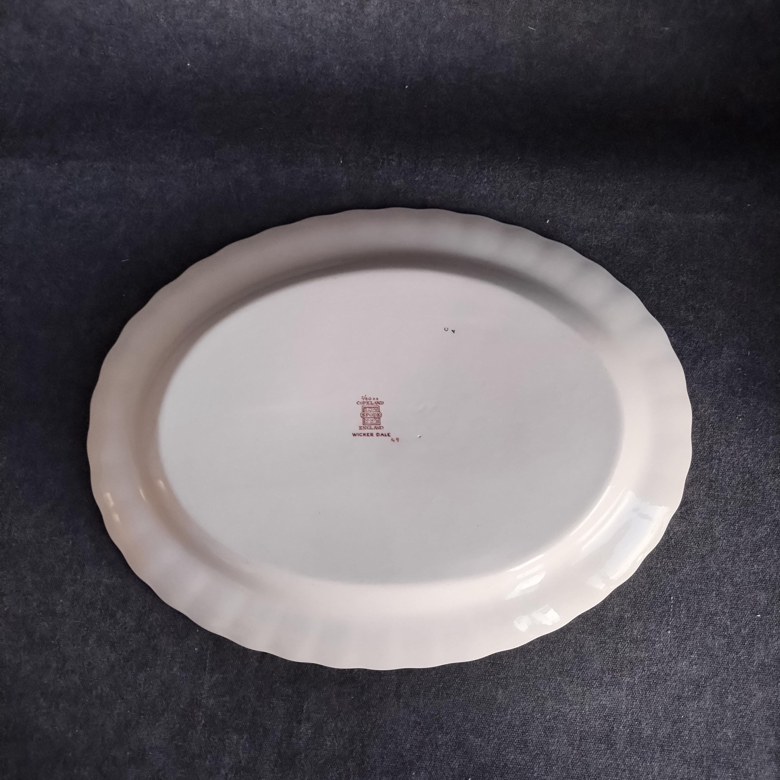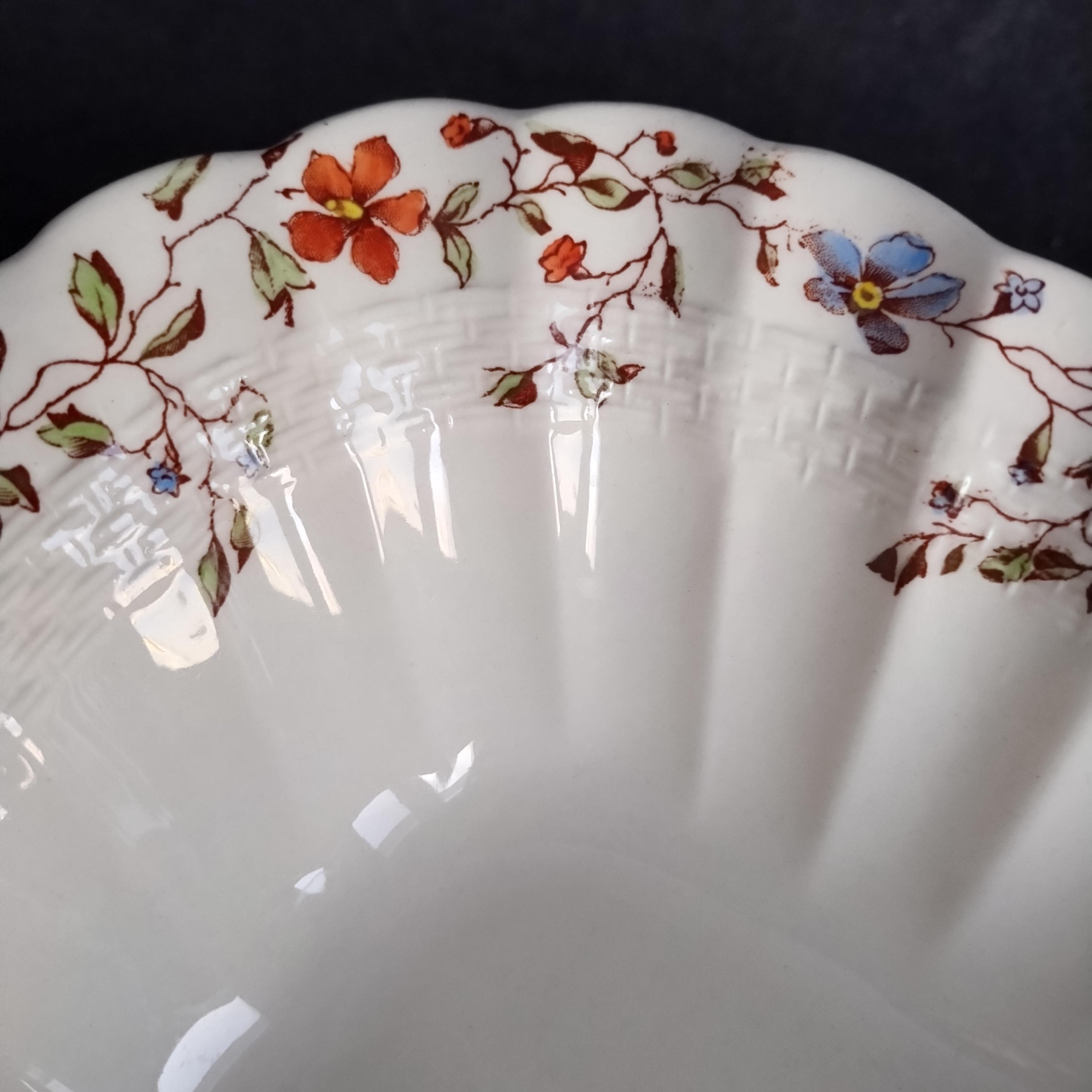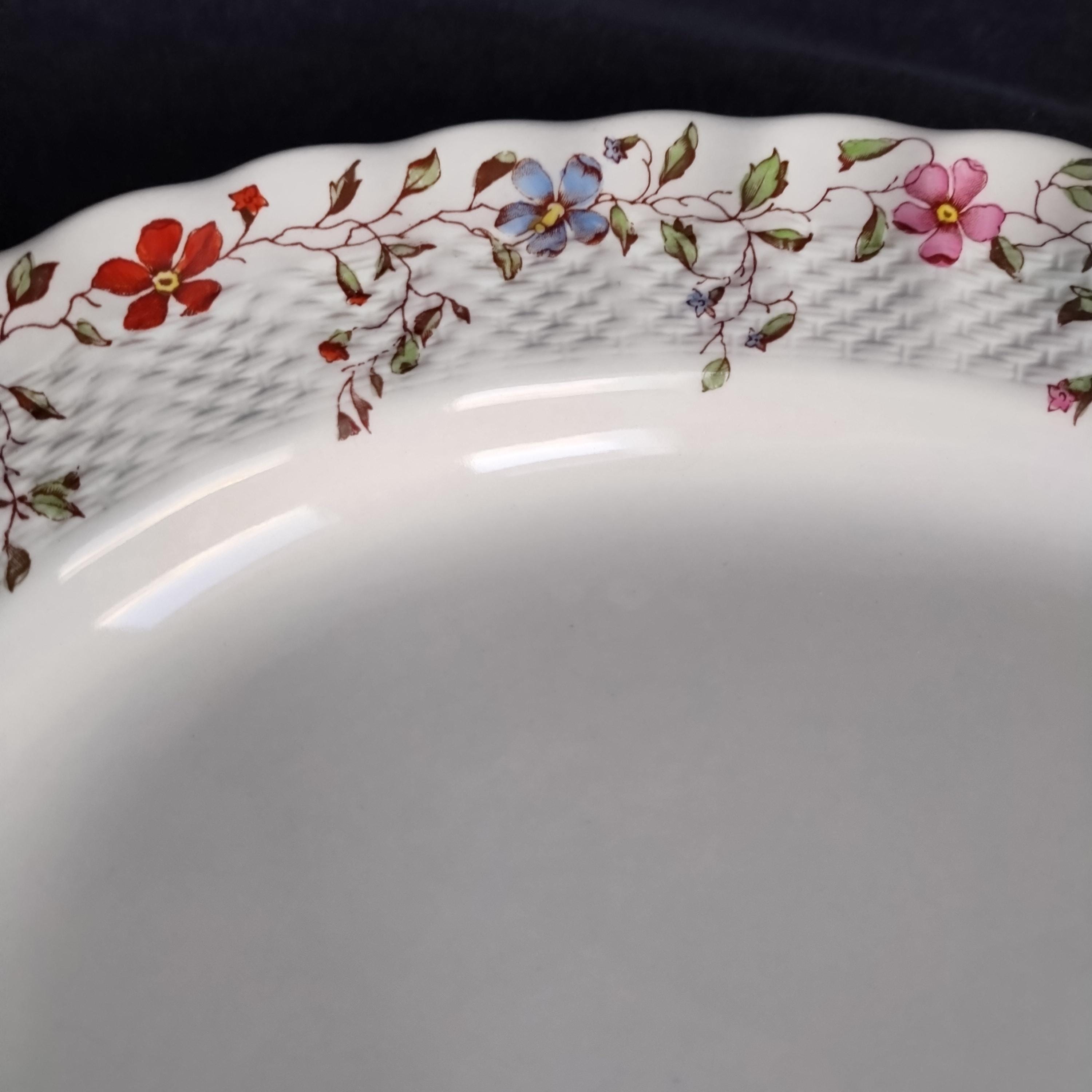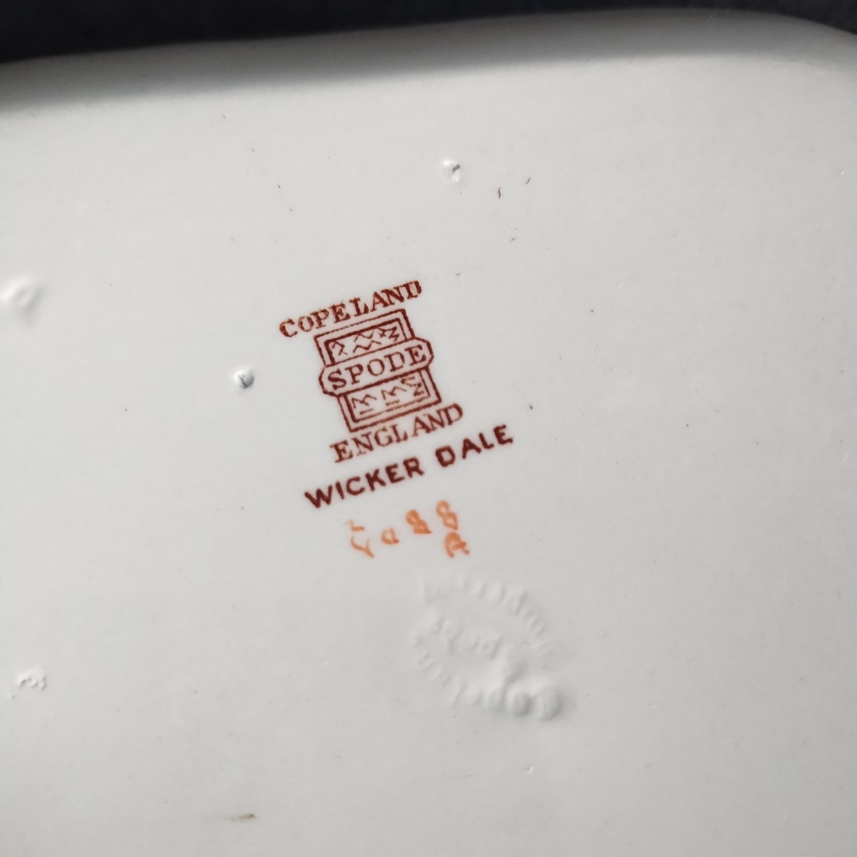 Copeland Spode produced this charming country pattern from 1954 to 1975. Wicker Dale features a brown transfer pattern finished with hand painted multicolor flowers and green leaves around the rim on a white background embossed with a wicker design. Marked on back with Copland Spode England backstamp.