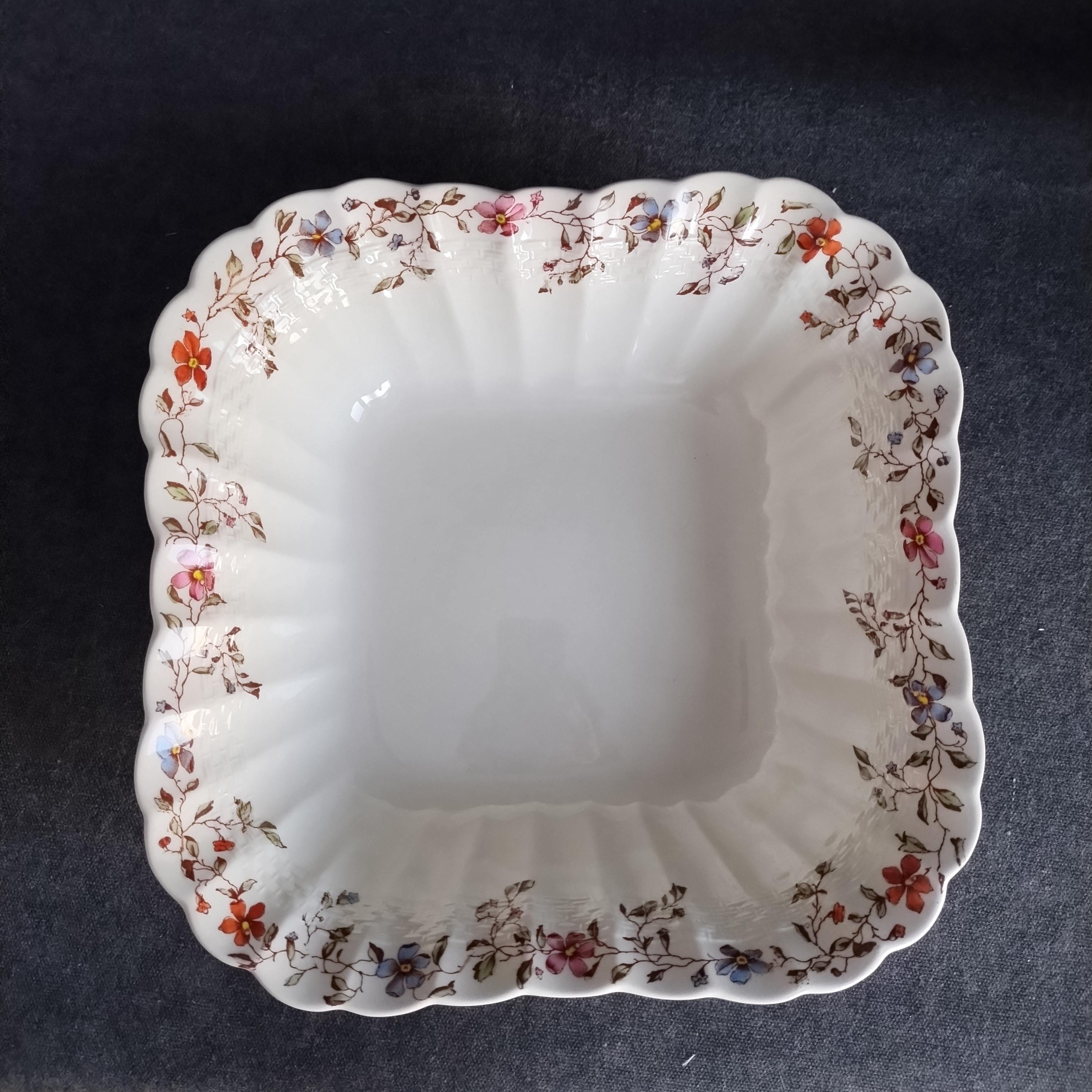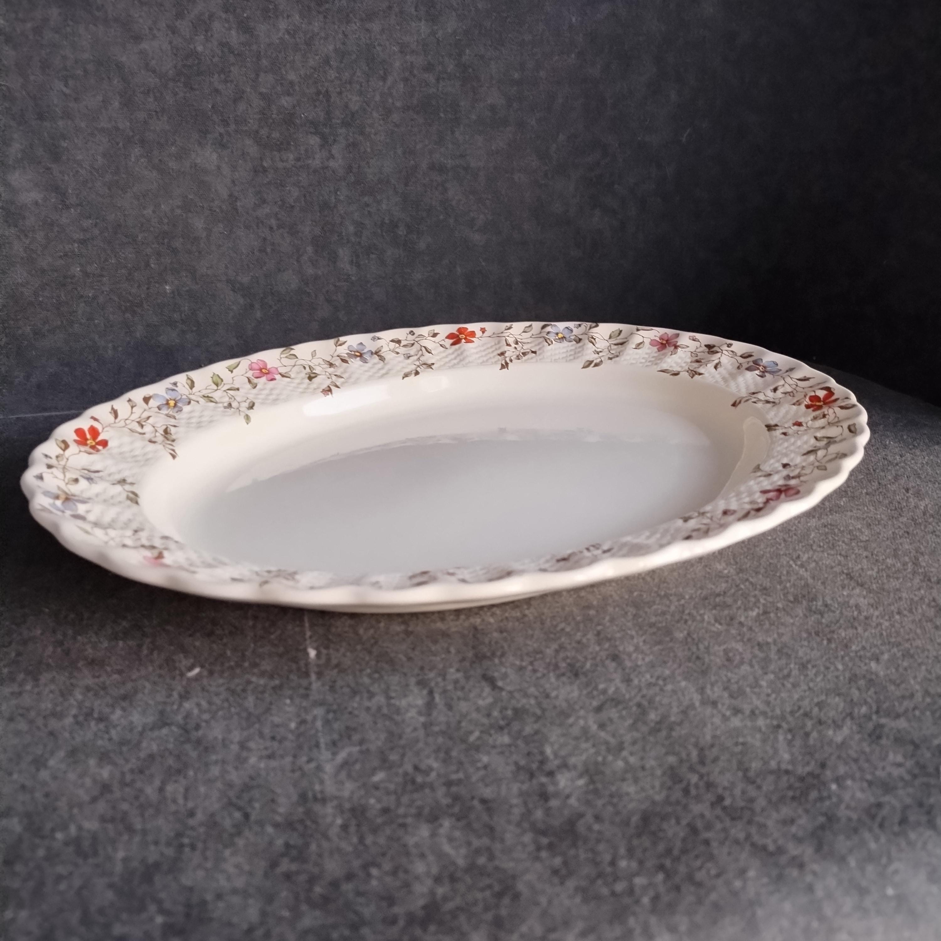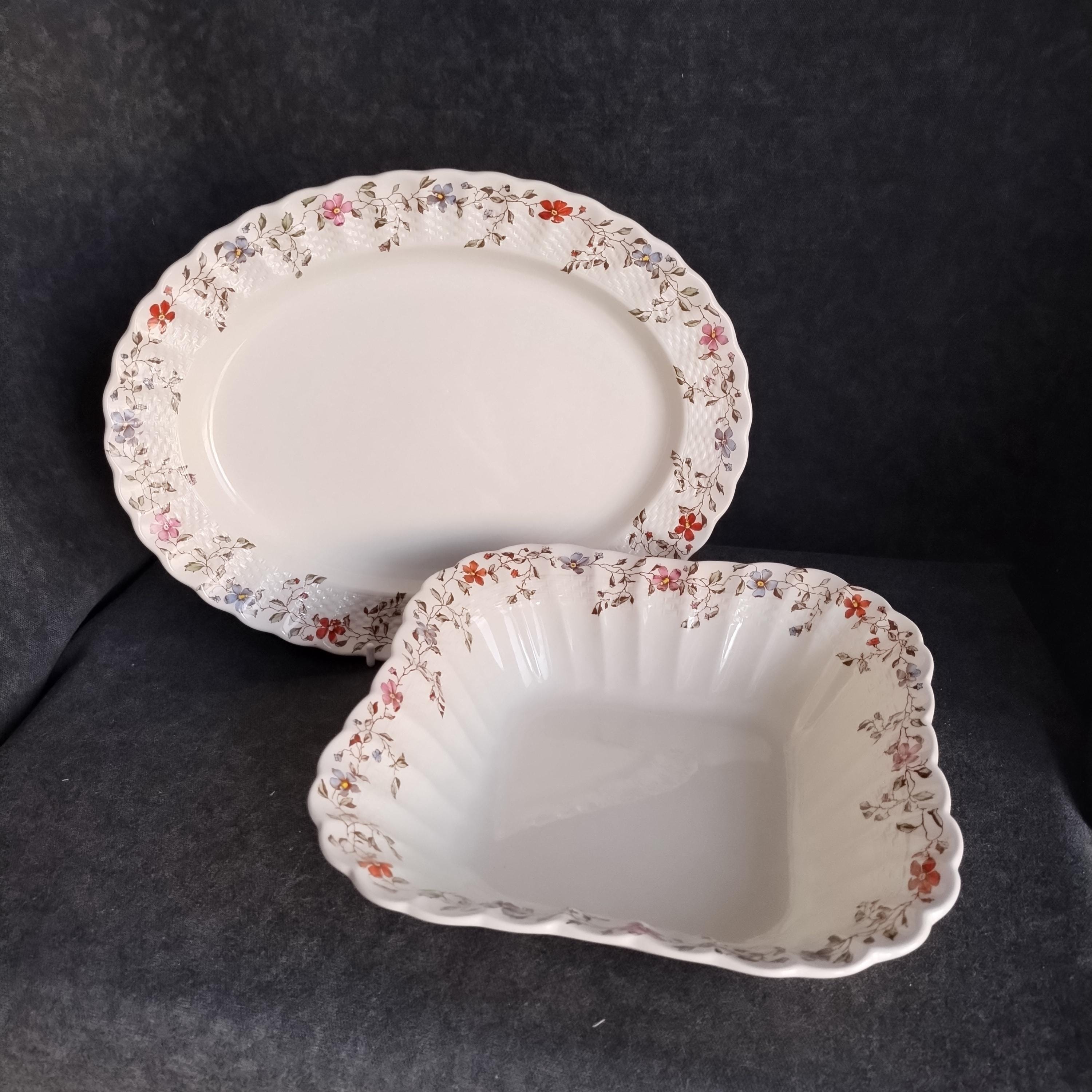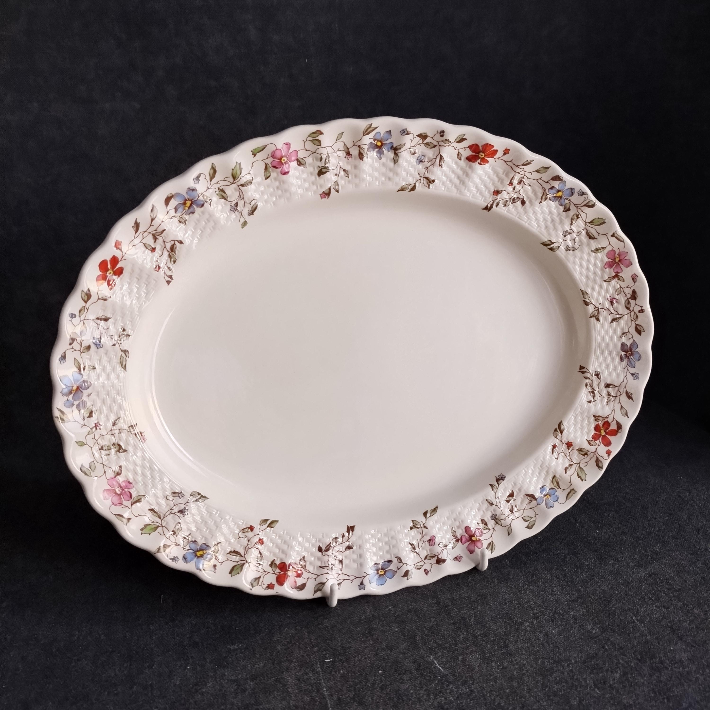 Copeland Spode produced this charming country pattern from 1954 to 1975. Wicker Dale features a brown transfer pattern finished with hand painted multicolor flowers and green leaves around the rim on a white background embossed with a wicker design. Marked on back with Copland Spode England backstamp.