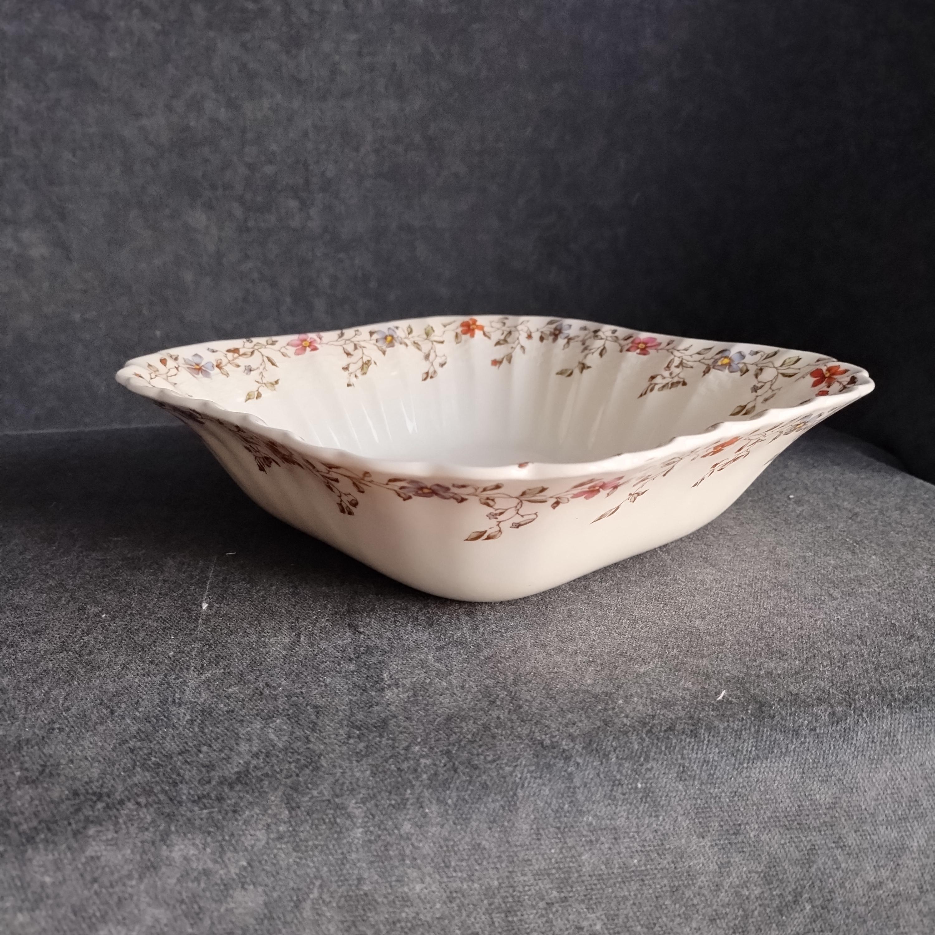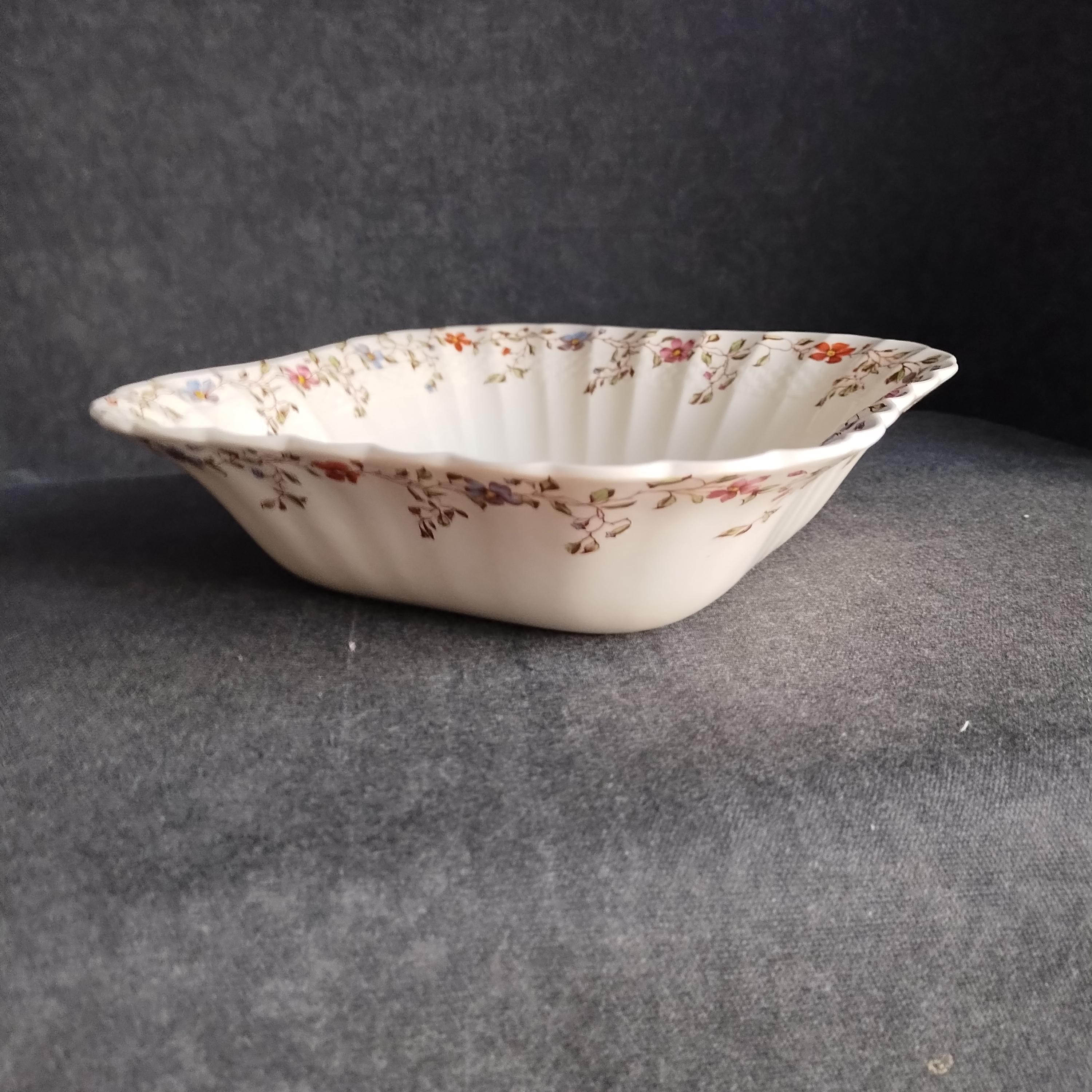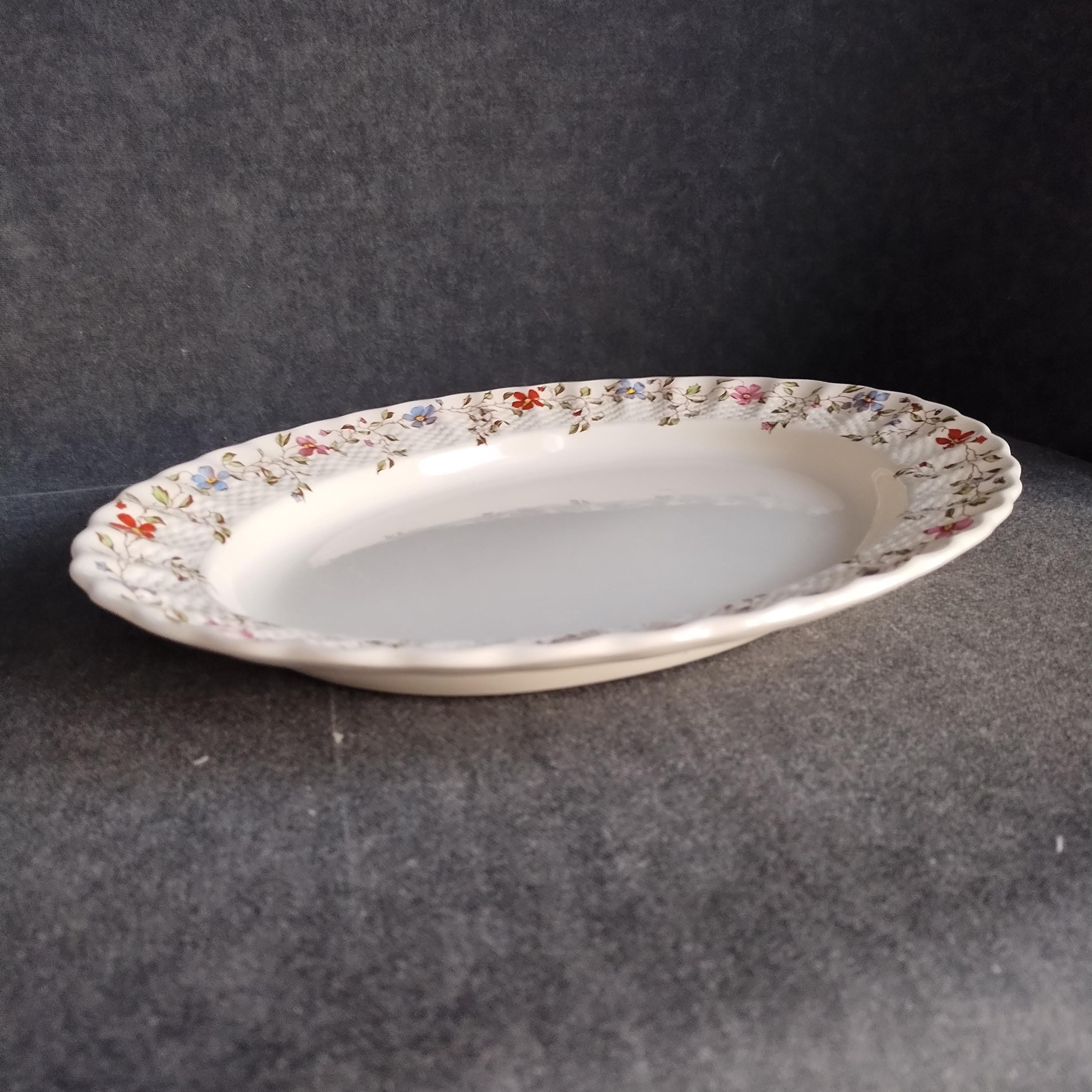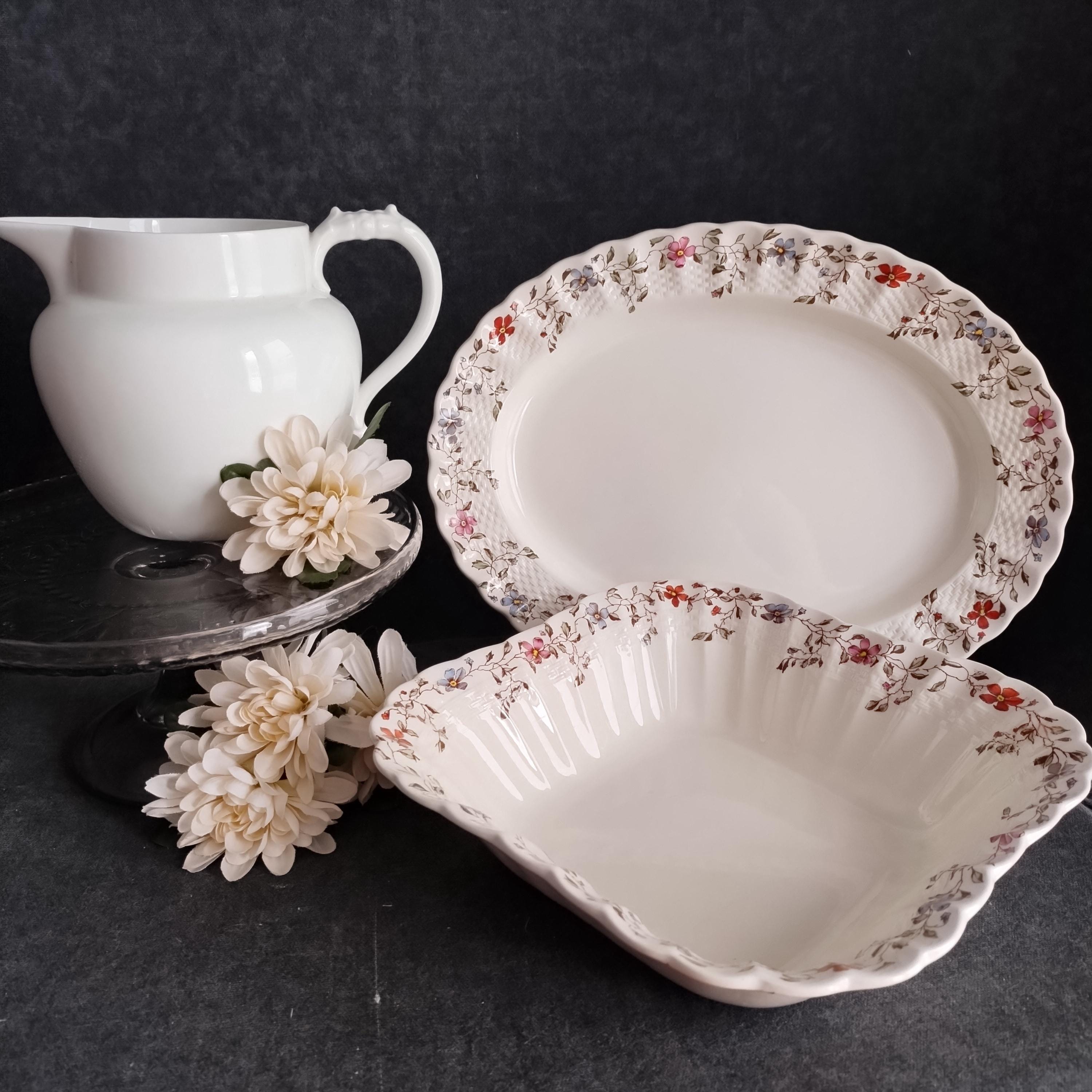 Copeland Spode produced this charming country pattern from 1954 to 1975. Wicker Dale features a brown transfer pattern finished with hand painted multicolor flowers and green leaves around the rim on a white background embossed with a wicker design. Marked on back with Copland Spode England backstamp.