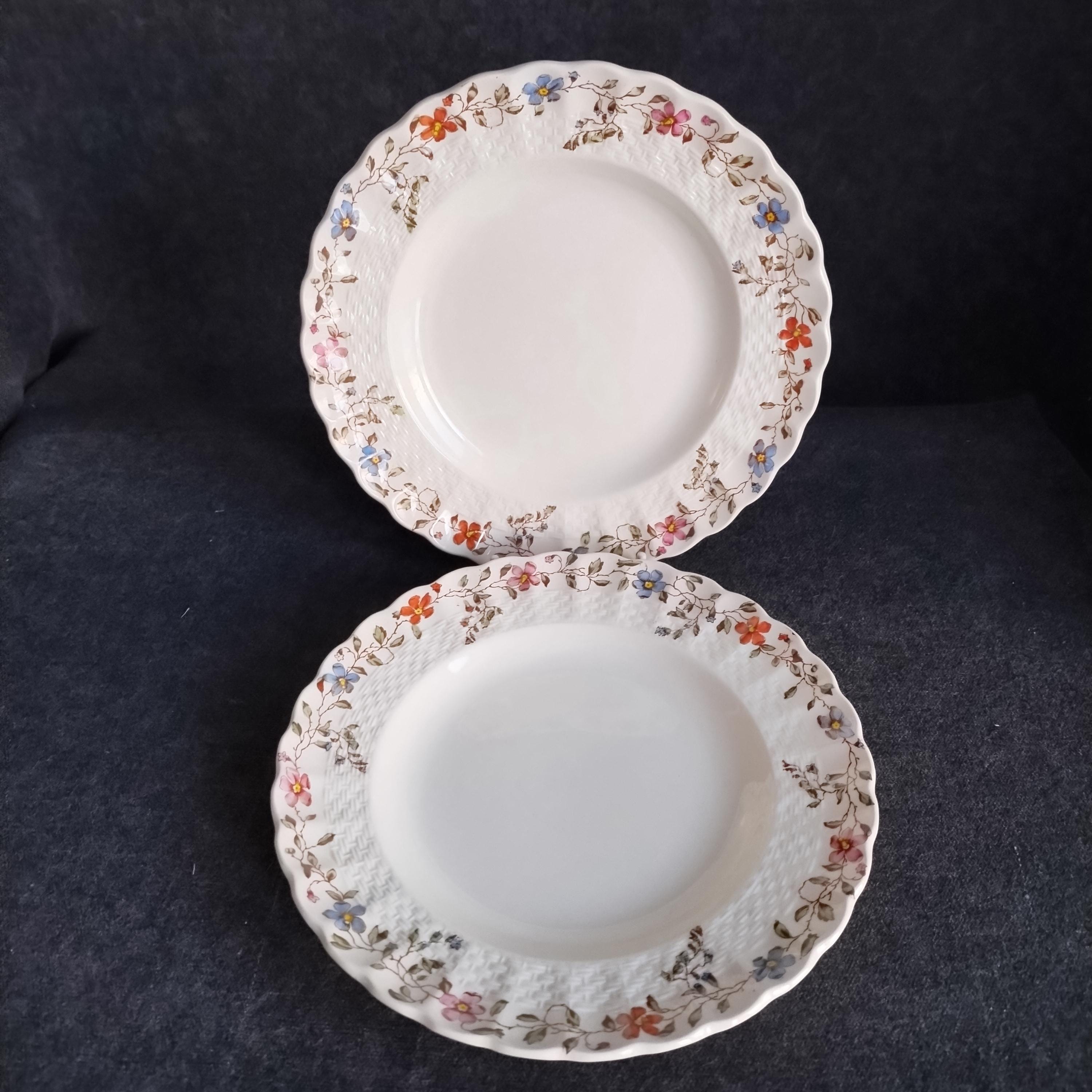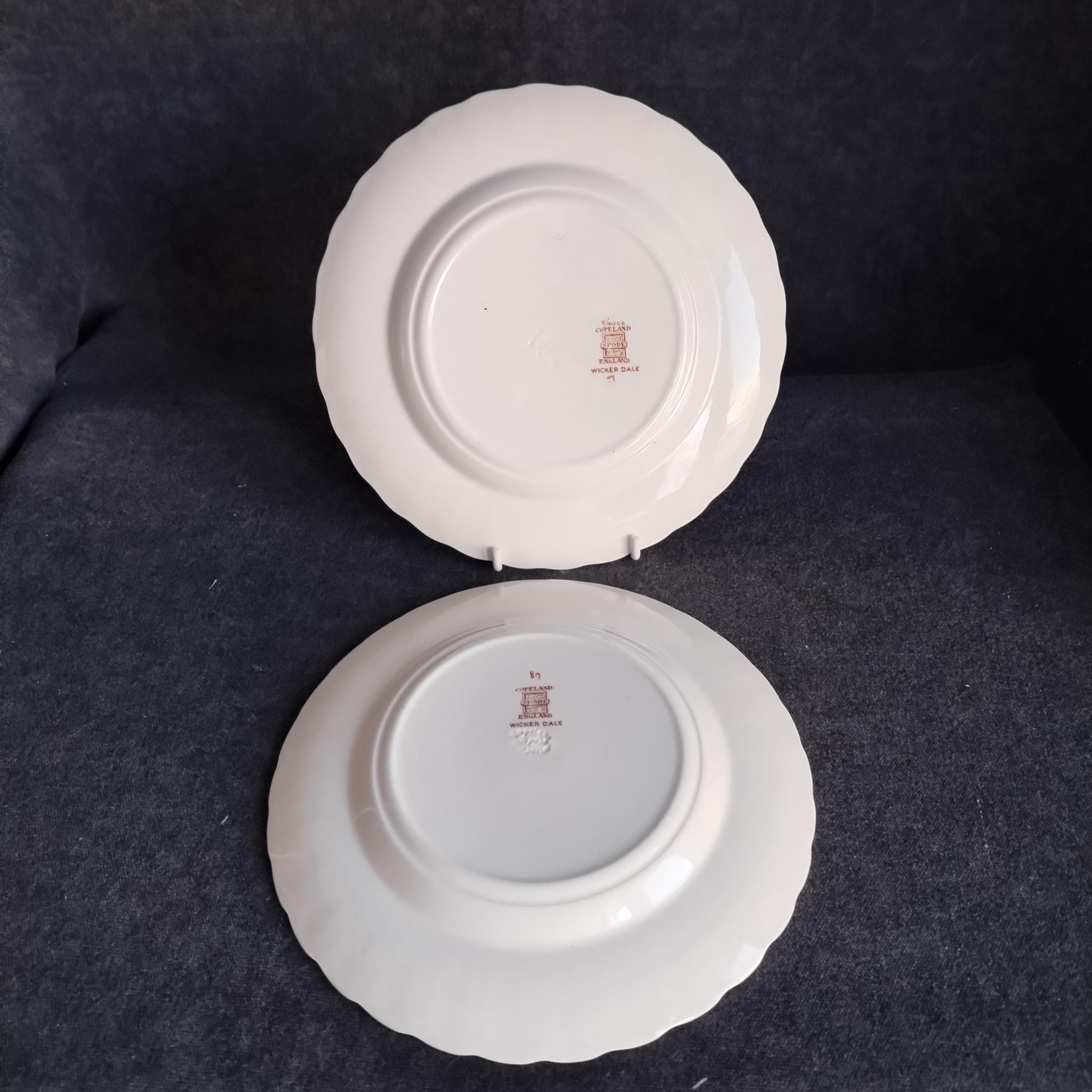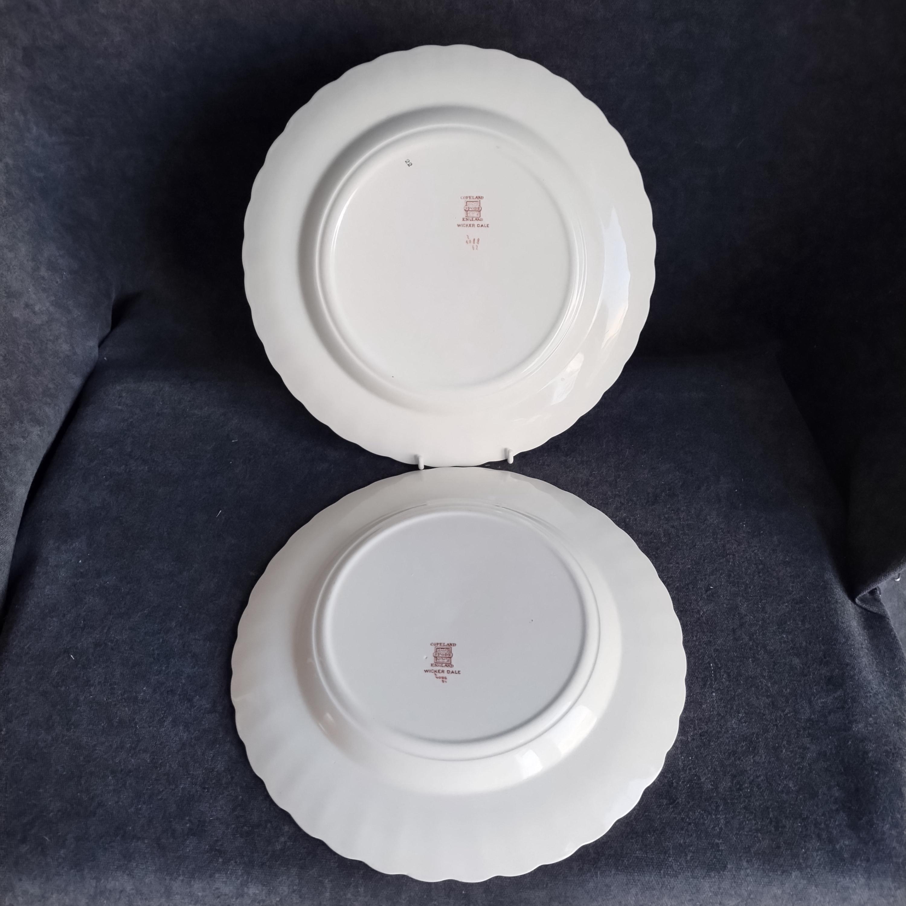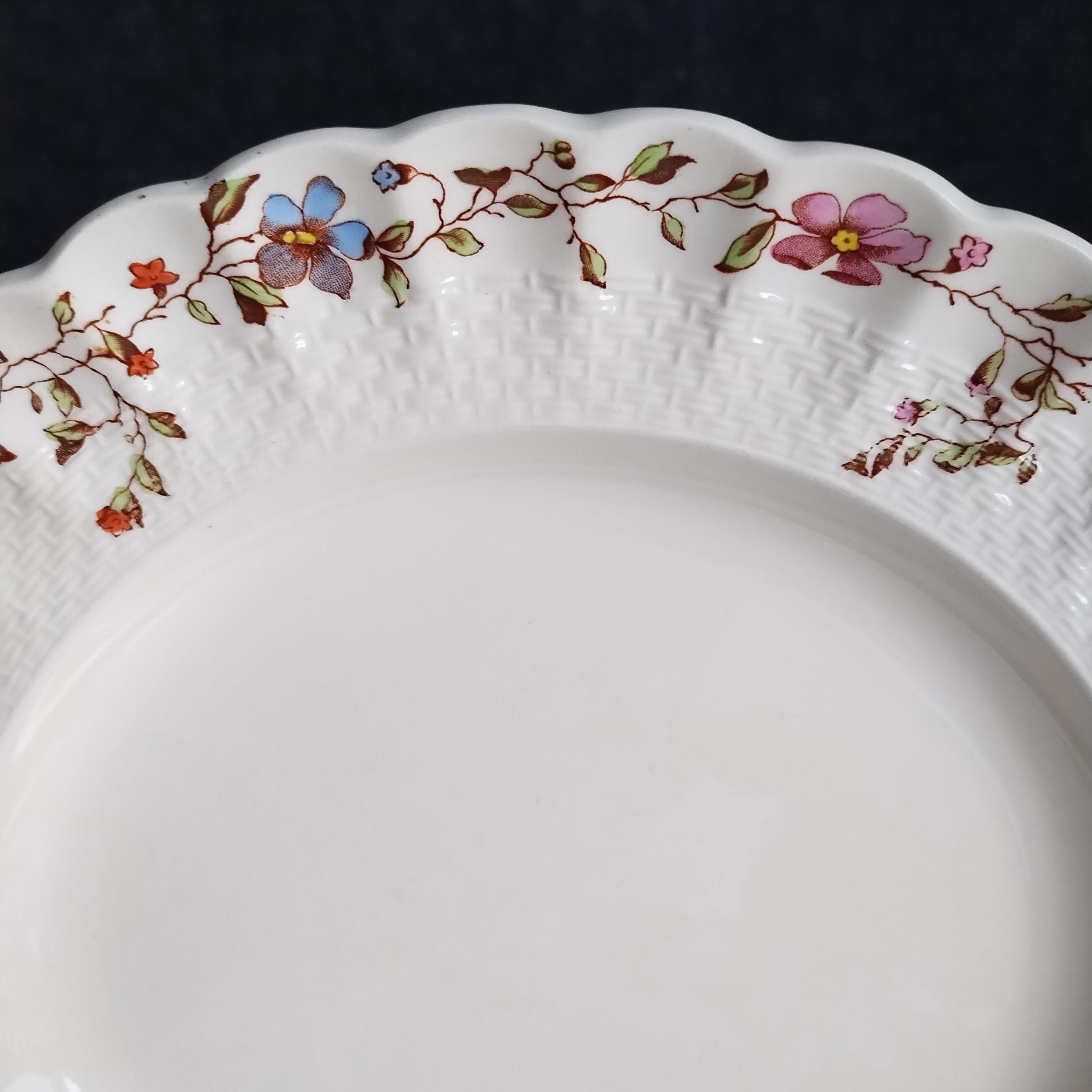 Copeland Spode produced this charming country pattern from 1954 to 1975. Wicker Dale features a brown transfer pattern finished with hand painted multicolor flowers and green leaves around the rim on a white background embossed with a wicker design. Marked on back with Copland Spode England backstamp.