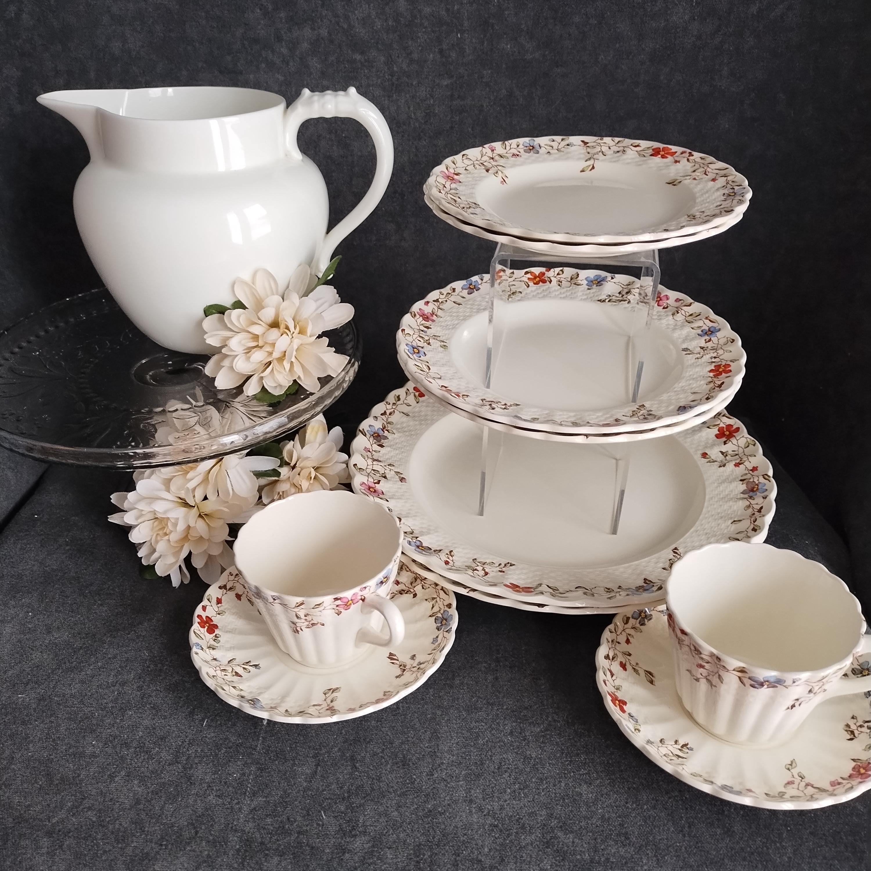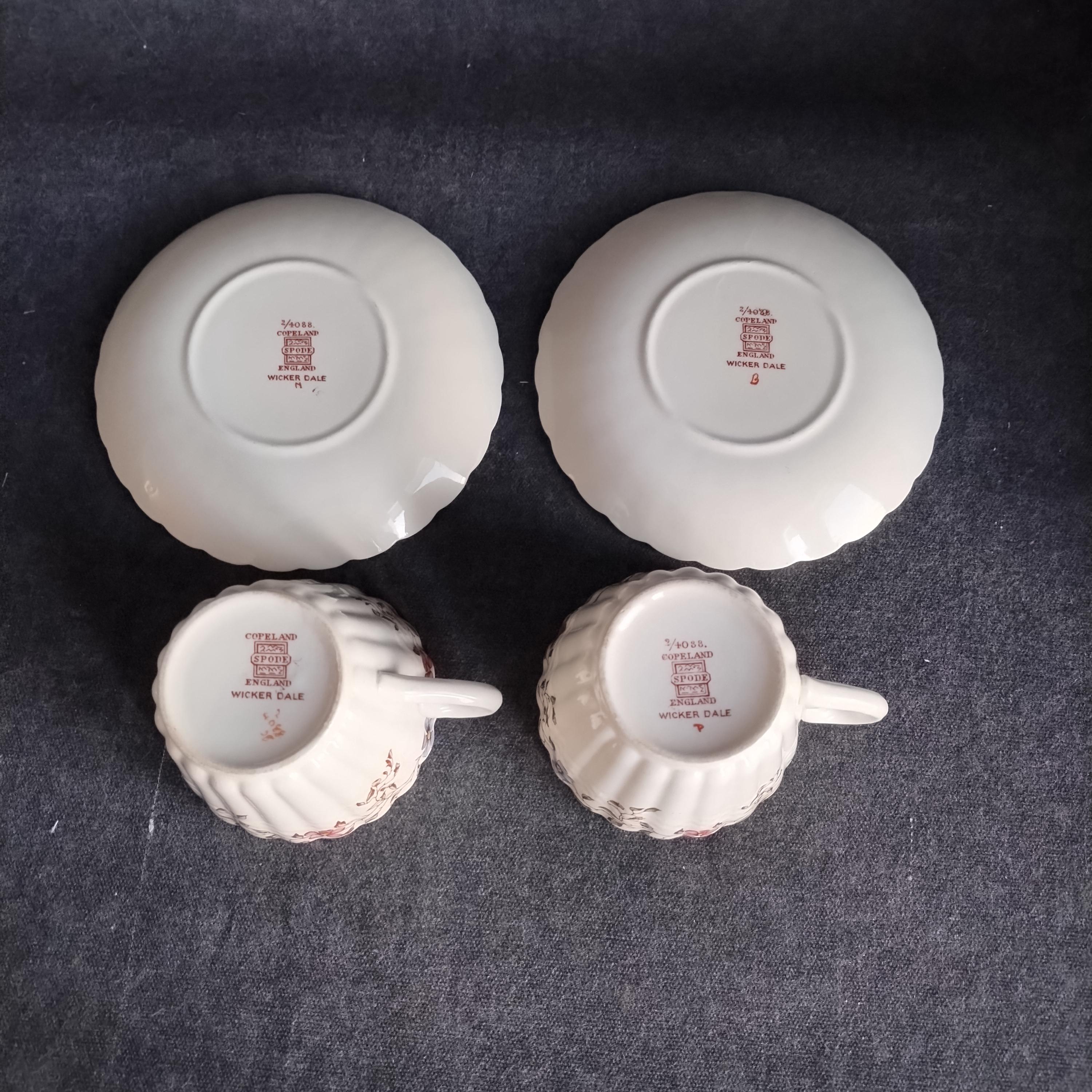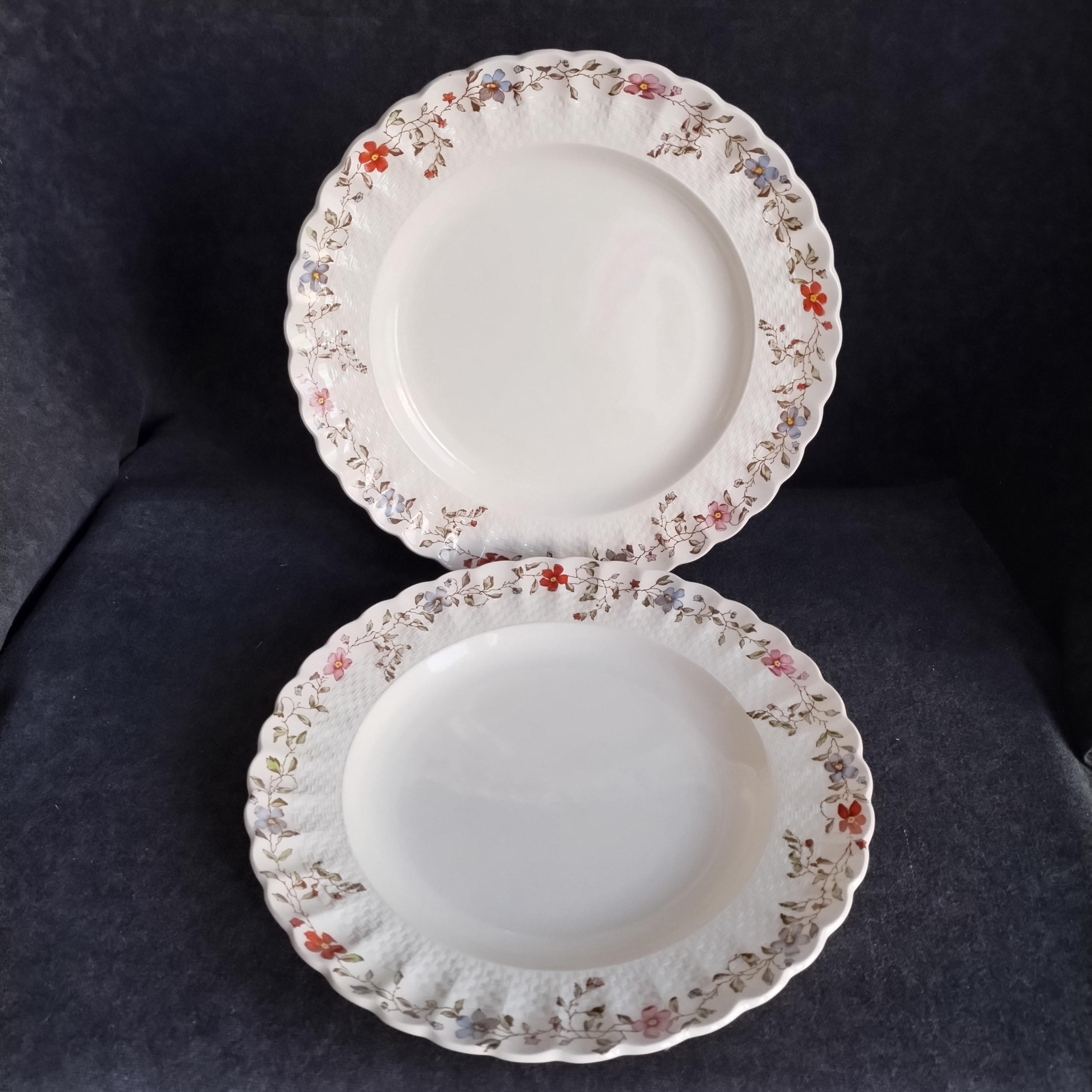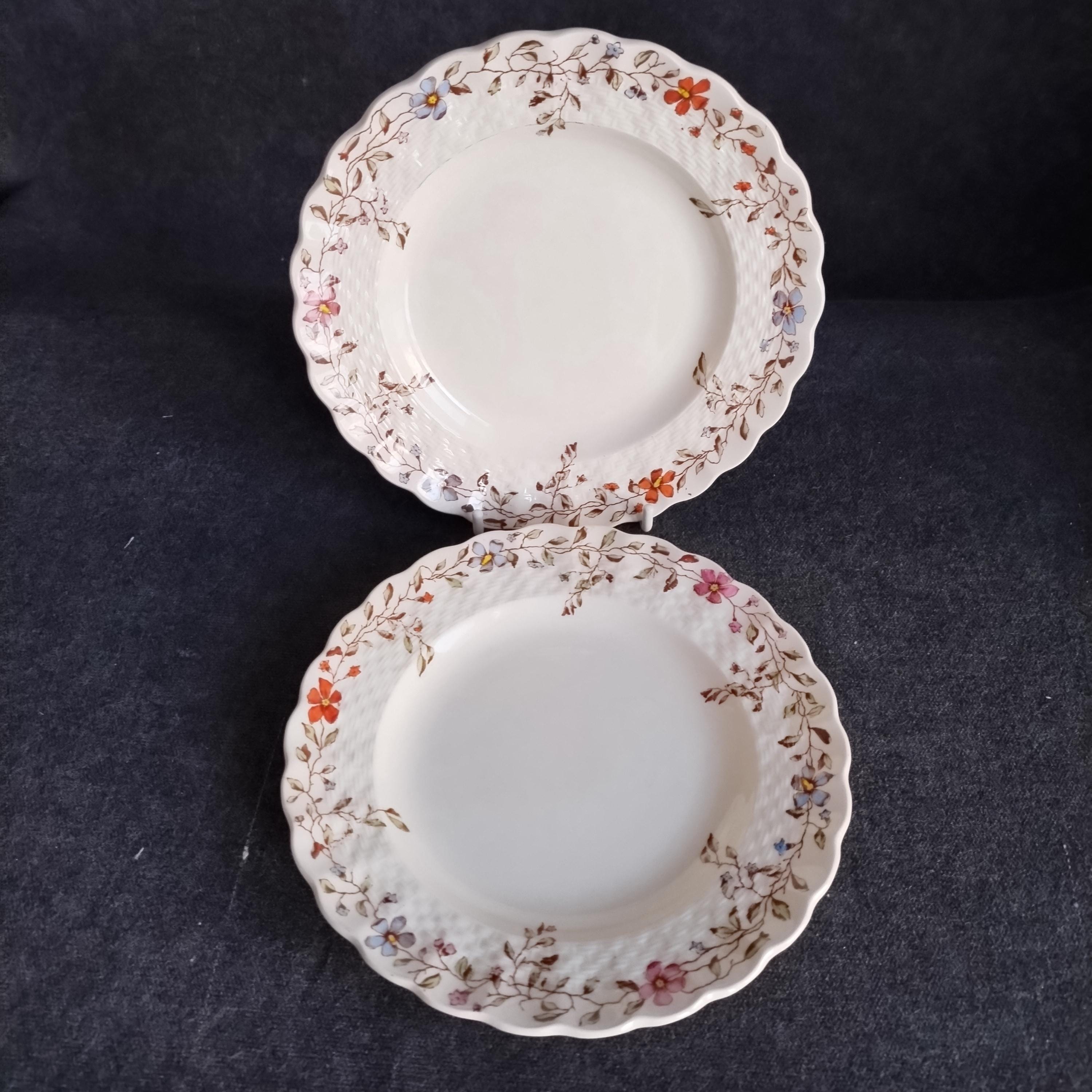 Copeland Spode produced this charming country pattern from 1954 to 1975. Wicker Dale features a brown transfer pattern finished with hand painted multicolor flowers and green leaves around the rim on a white background embossed with a wicker design. Marked on back with Copland Spode England backstamp.