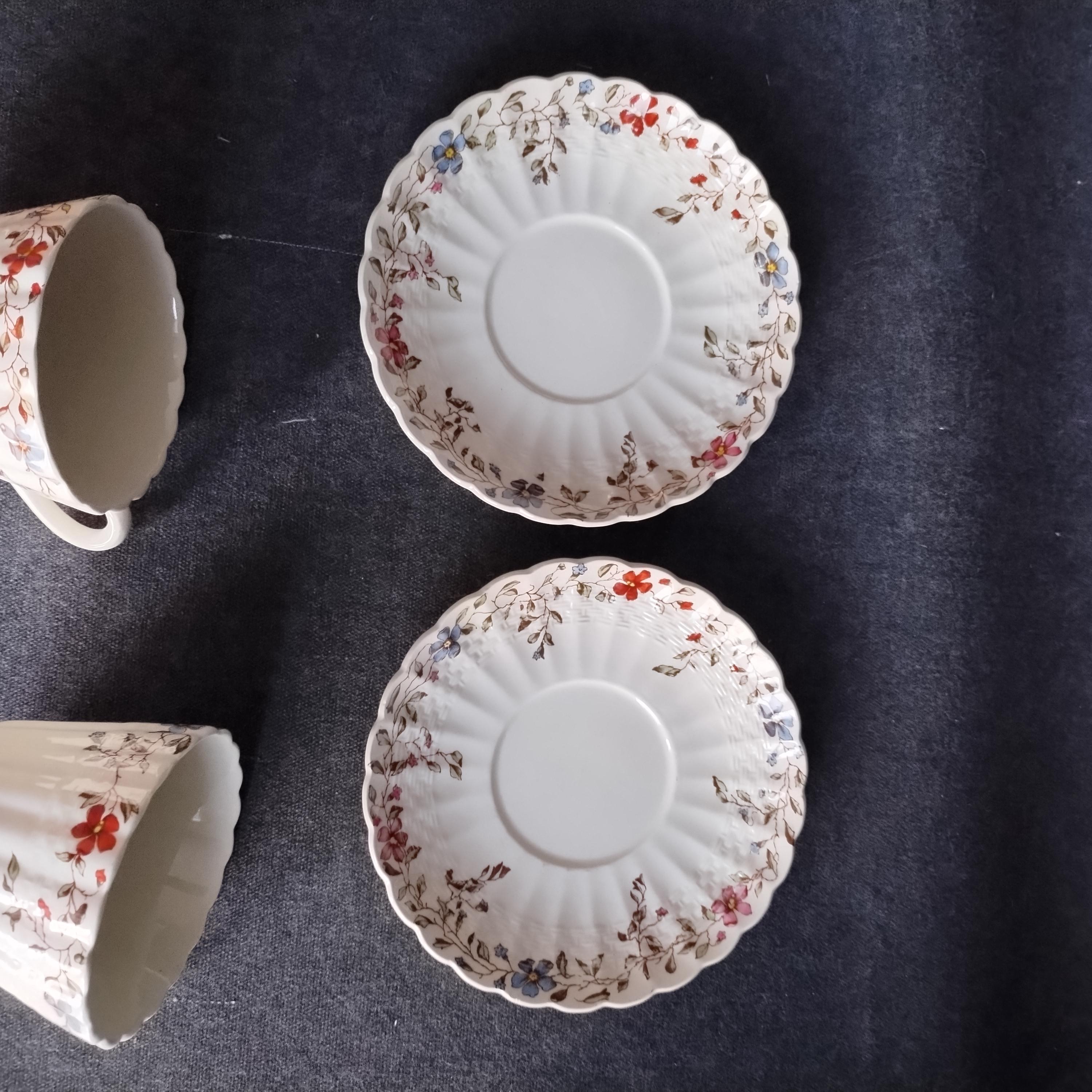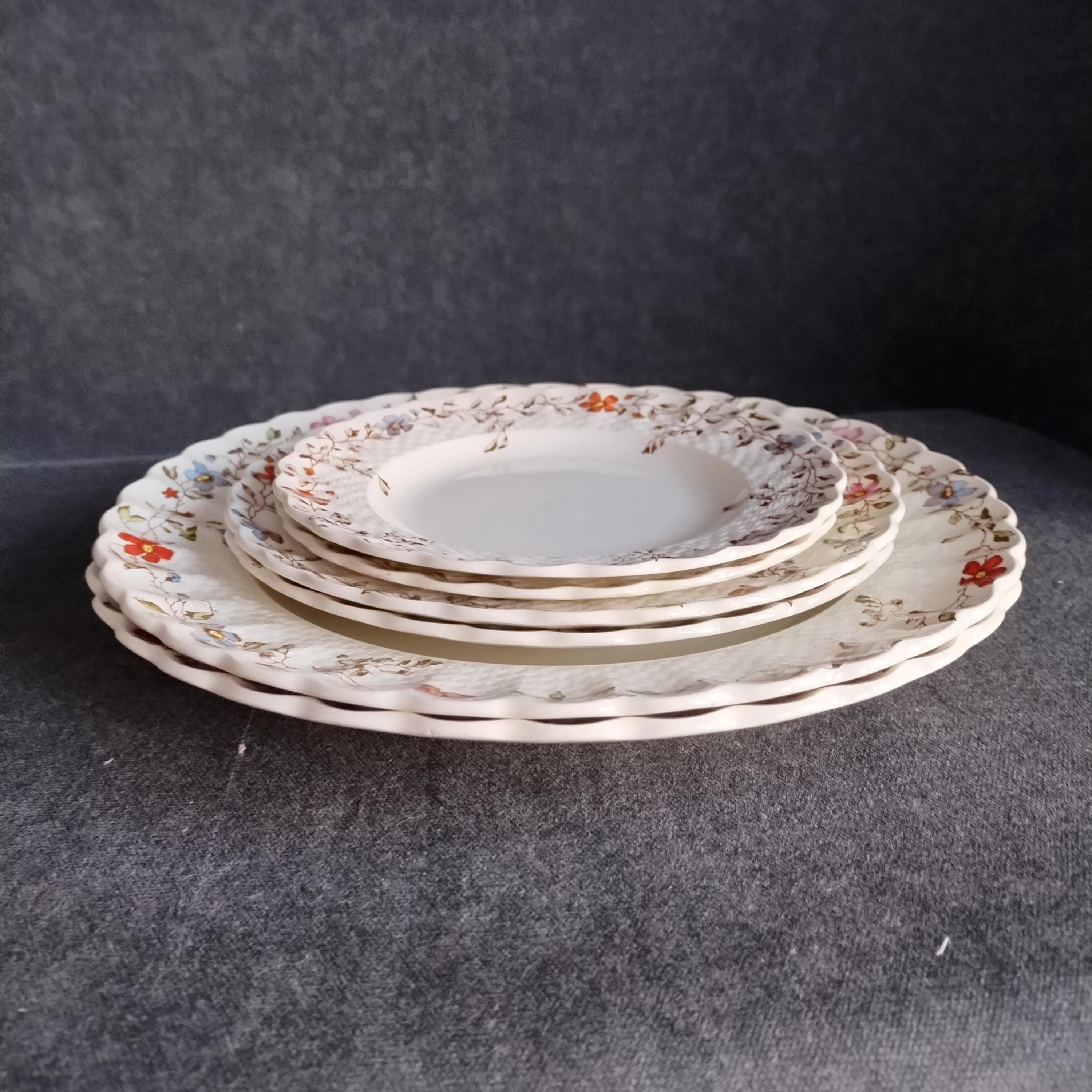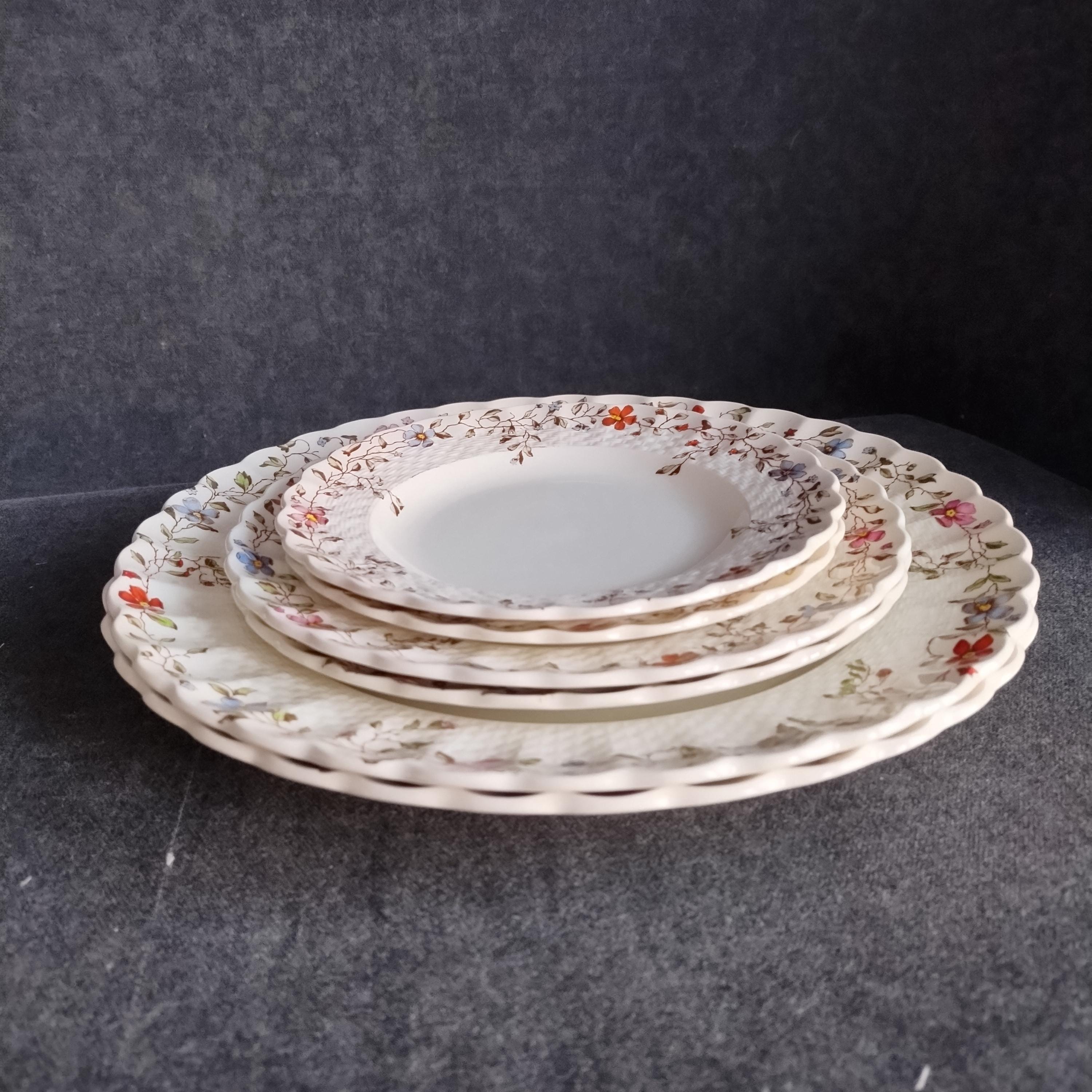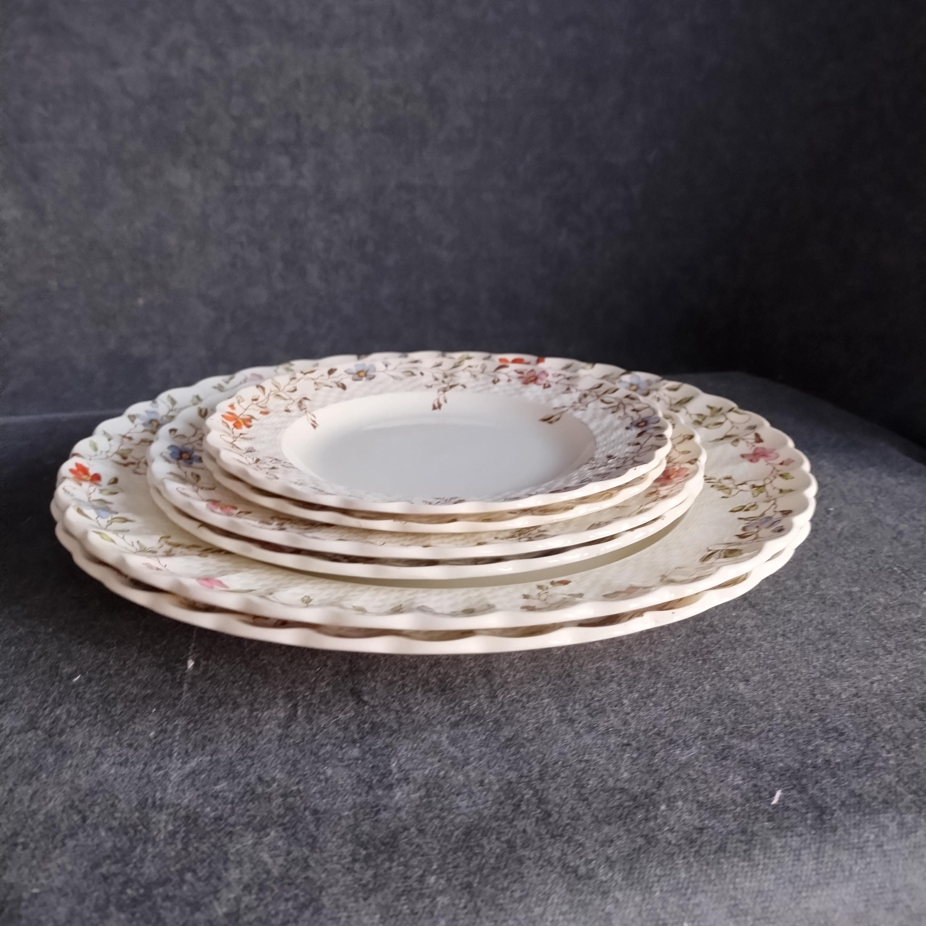 Copeland Spode produced this charming country pattern from 1954 to 1975. Wicker Dale features a brown transfer pattern finished with hand painted multicolor flowers and green leaves around the rim on a white background embossed with a wicker design. Marked on back with Copland Spode England backstamp.