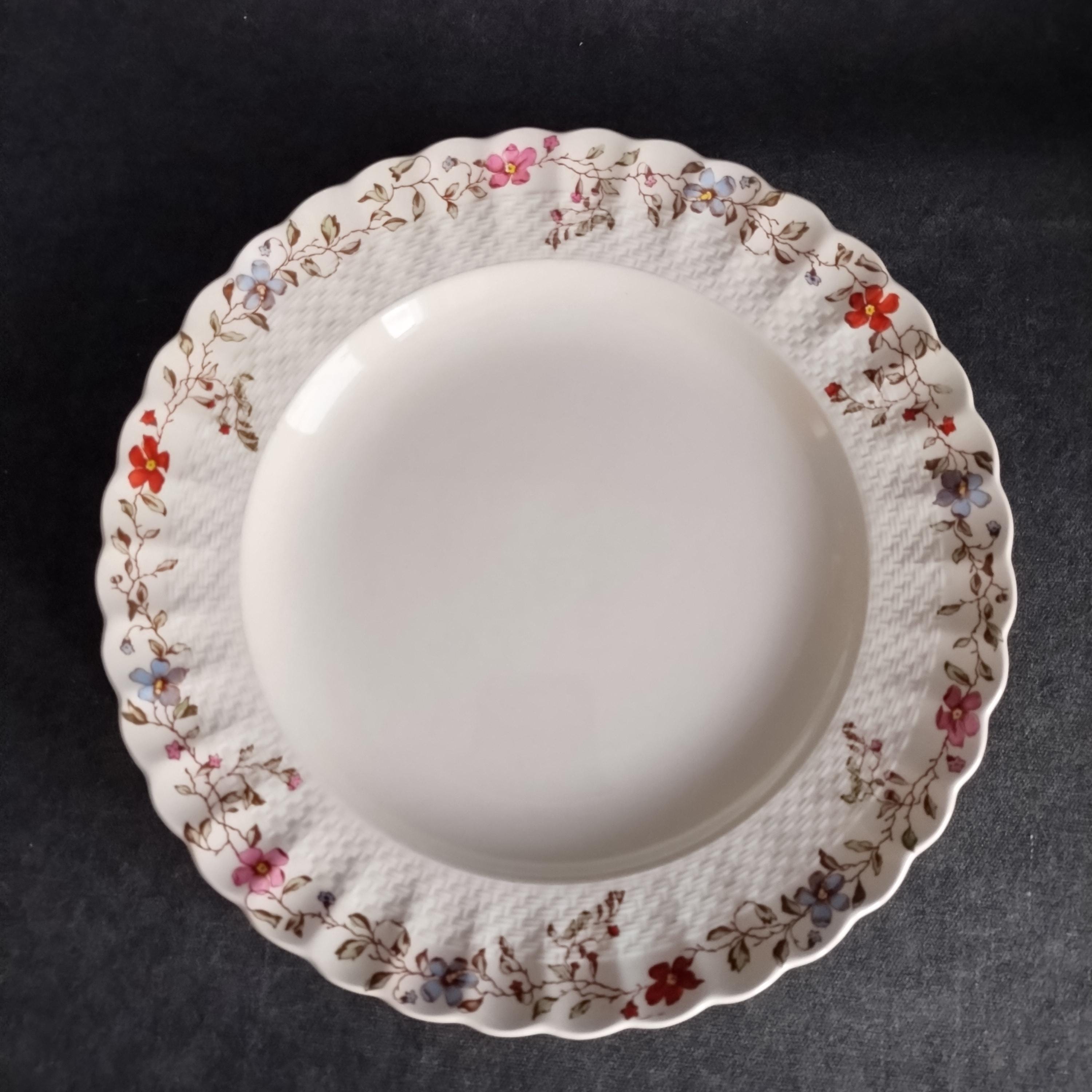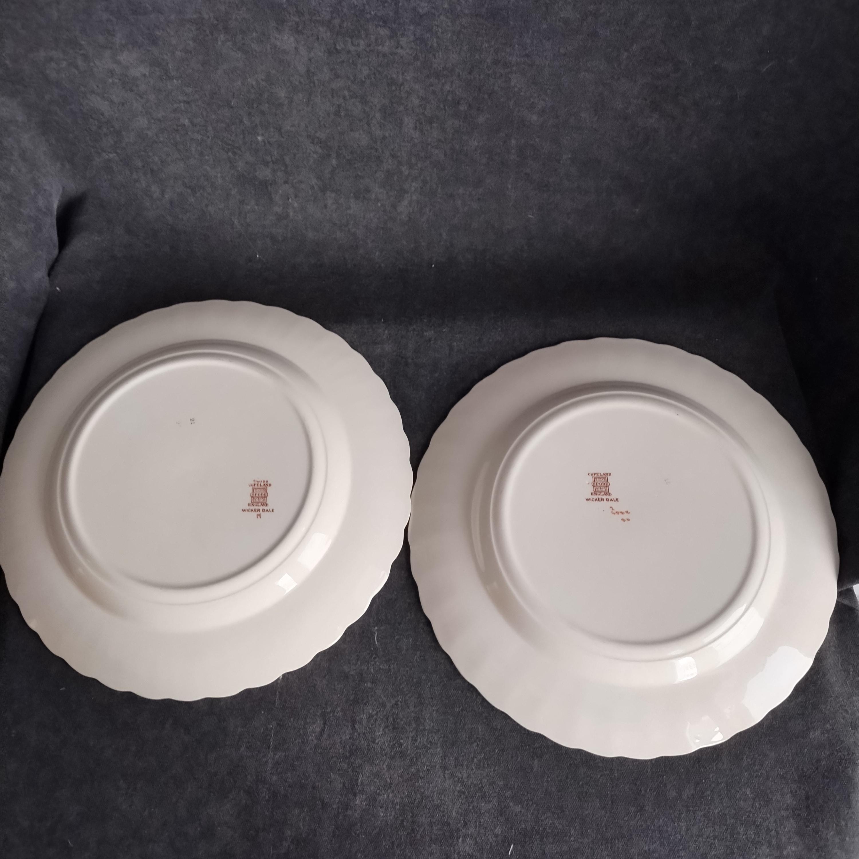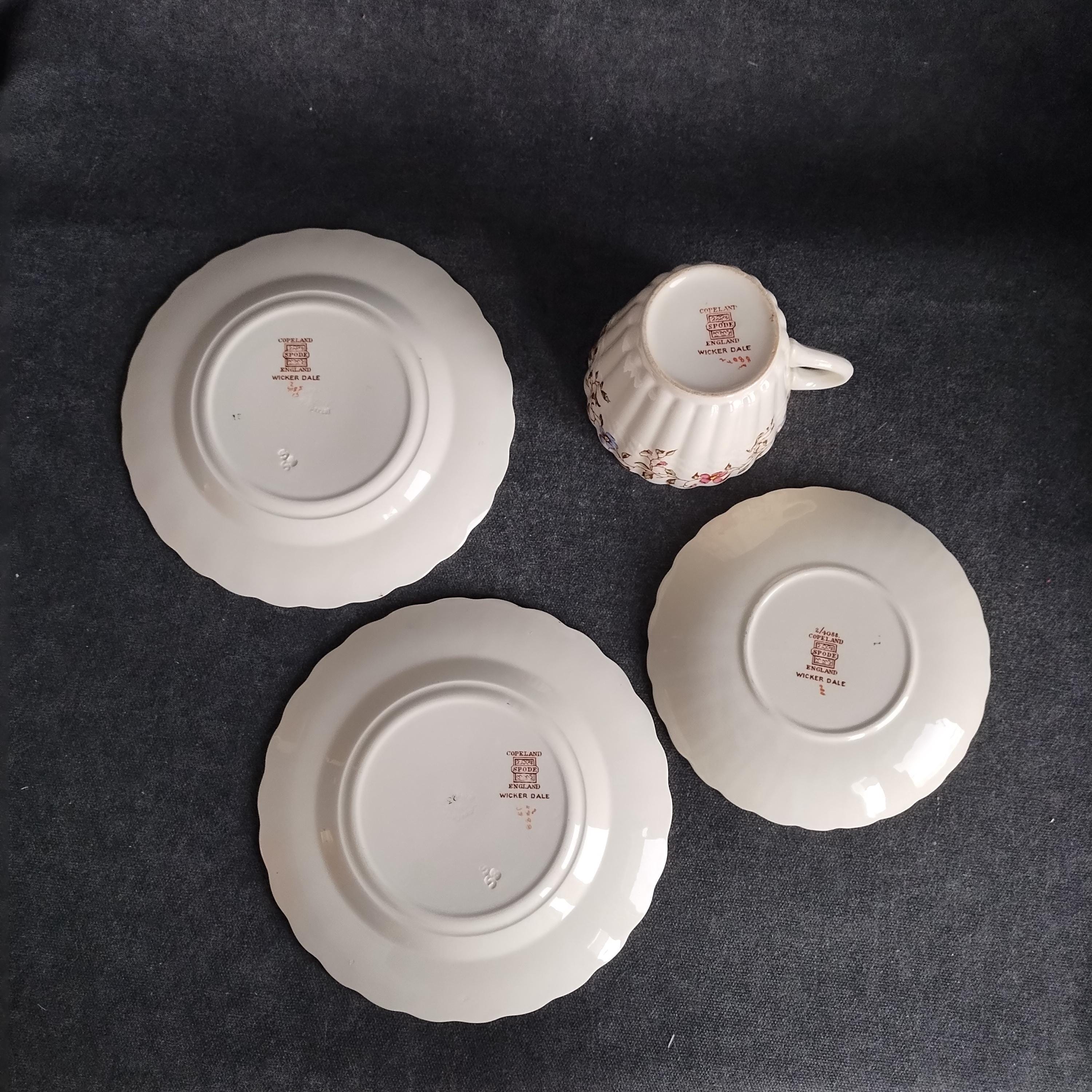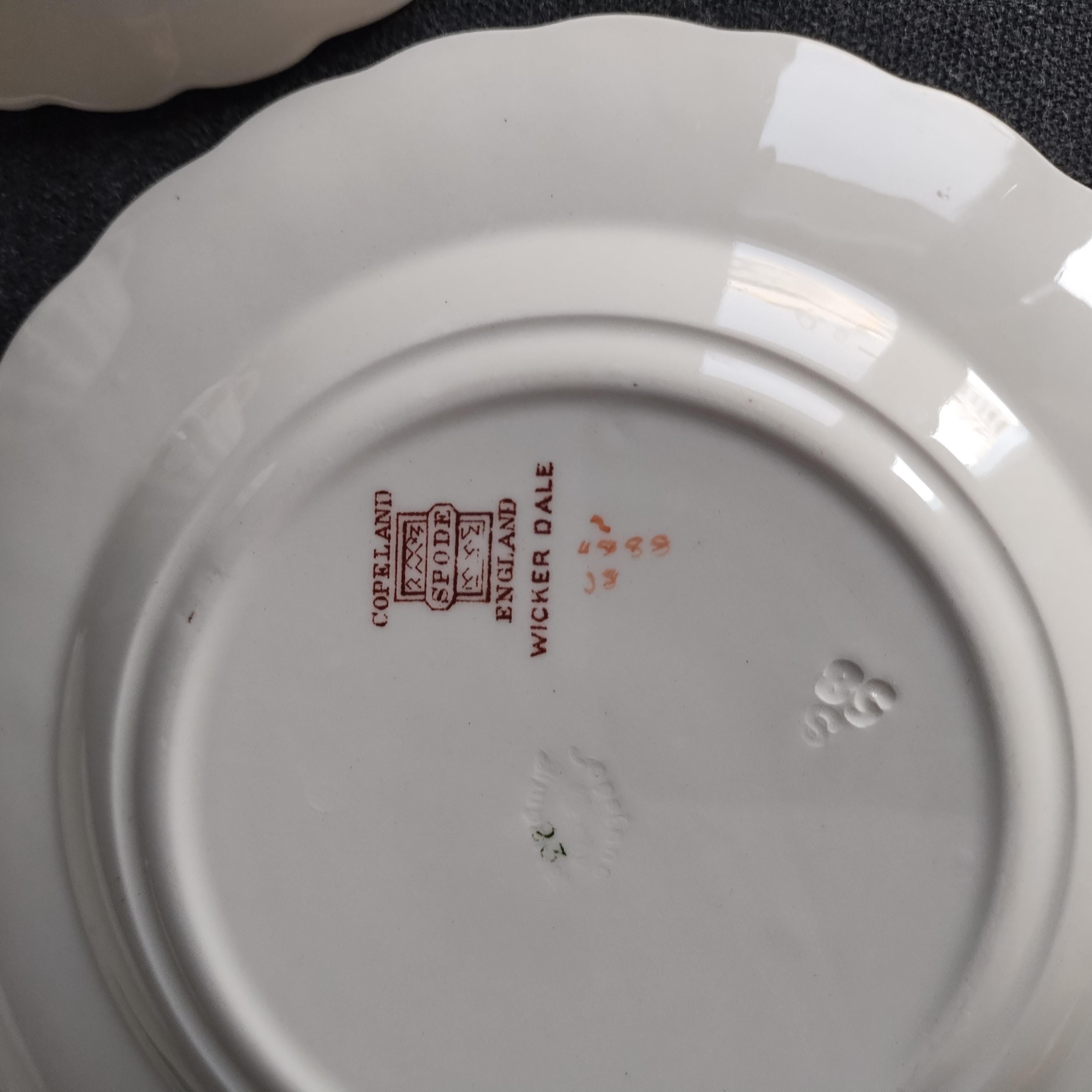 Copeland Spode produced this charming country pattern from 1954 to 1975. Wicker Dale features a brown transfer pattern finished with hand painted multicolor flowers and green leaves around the rim on a white background embossed with a wicker design. Marked on back with Copland Spode England backstamp.