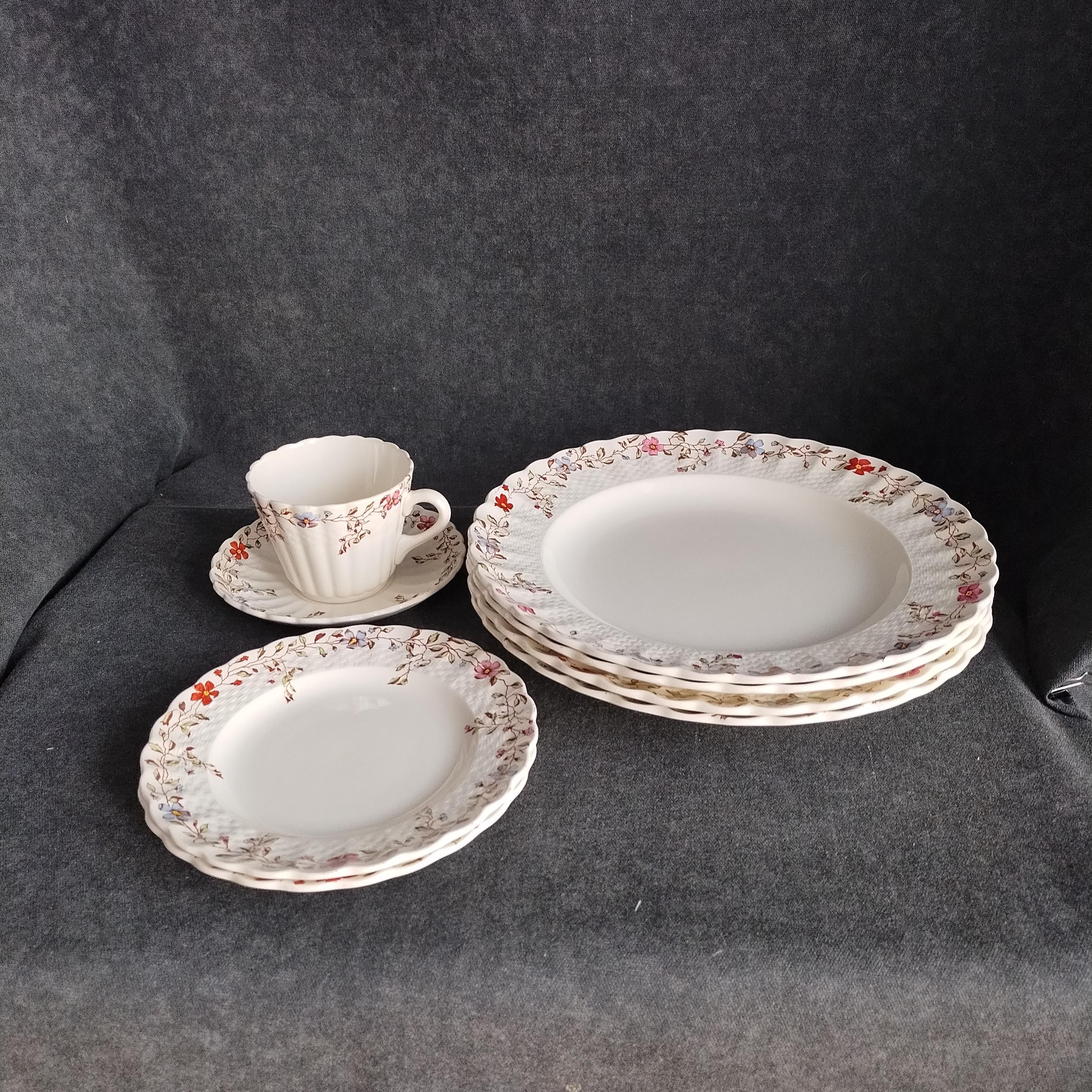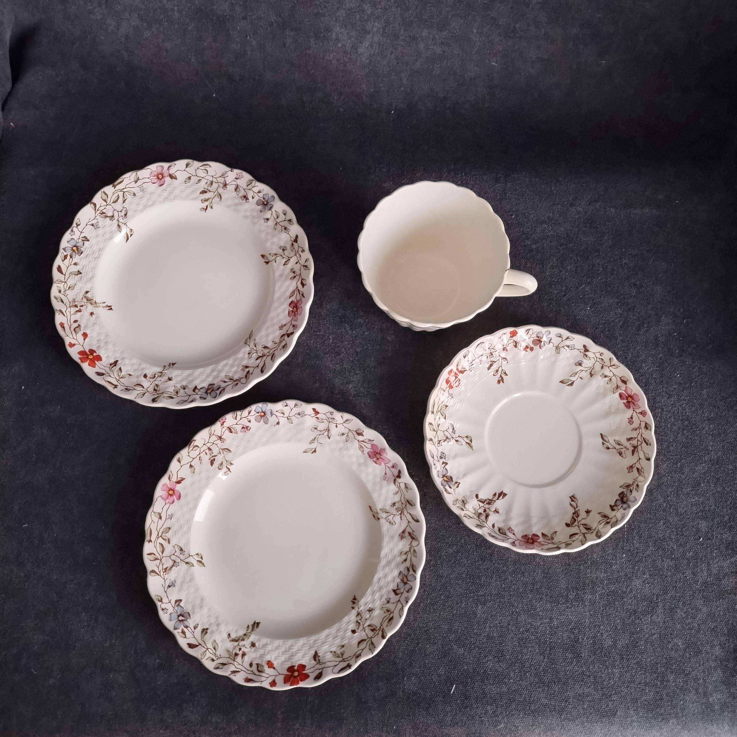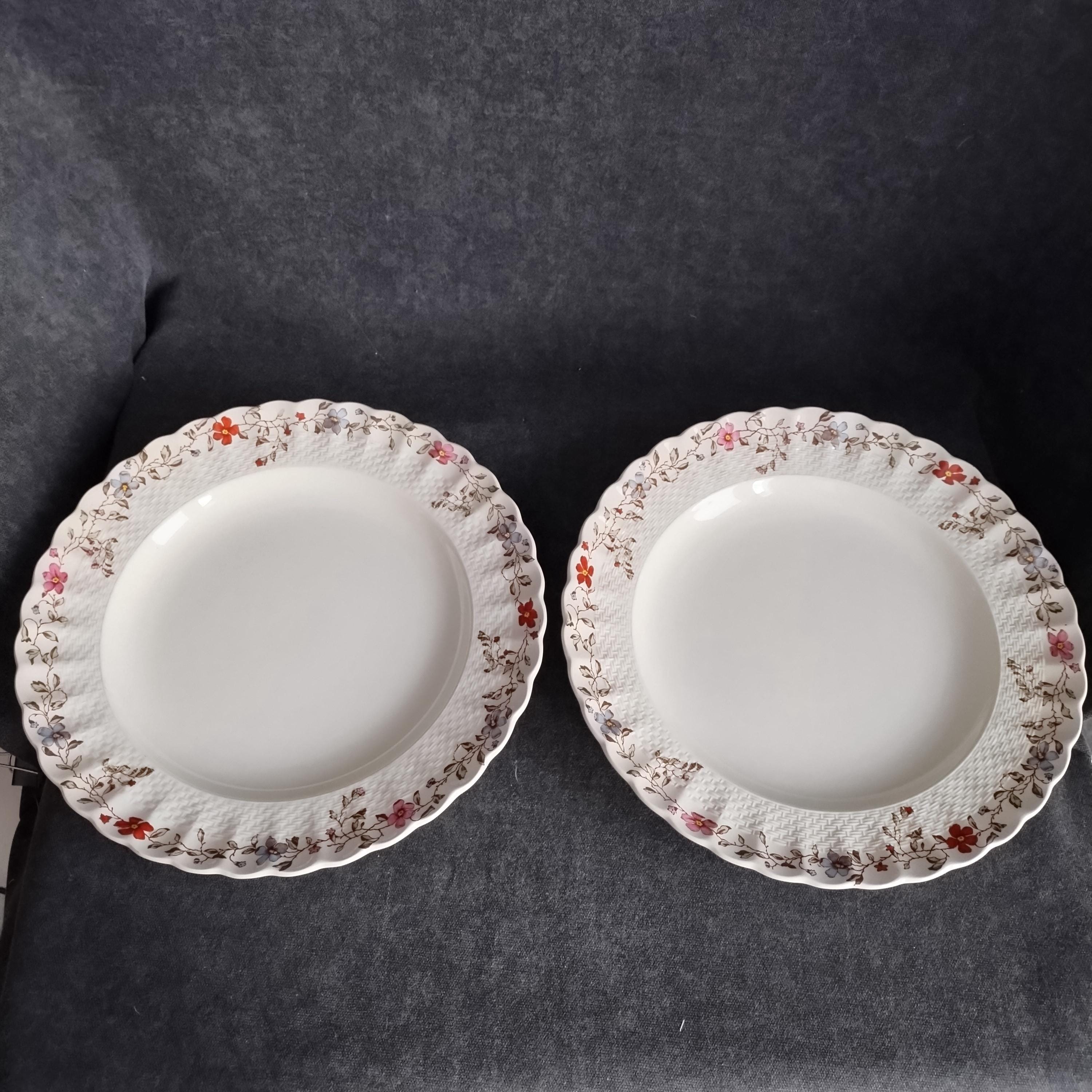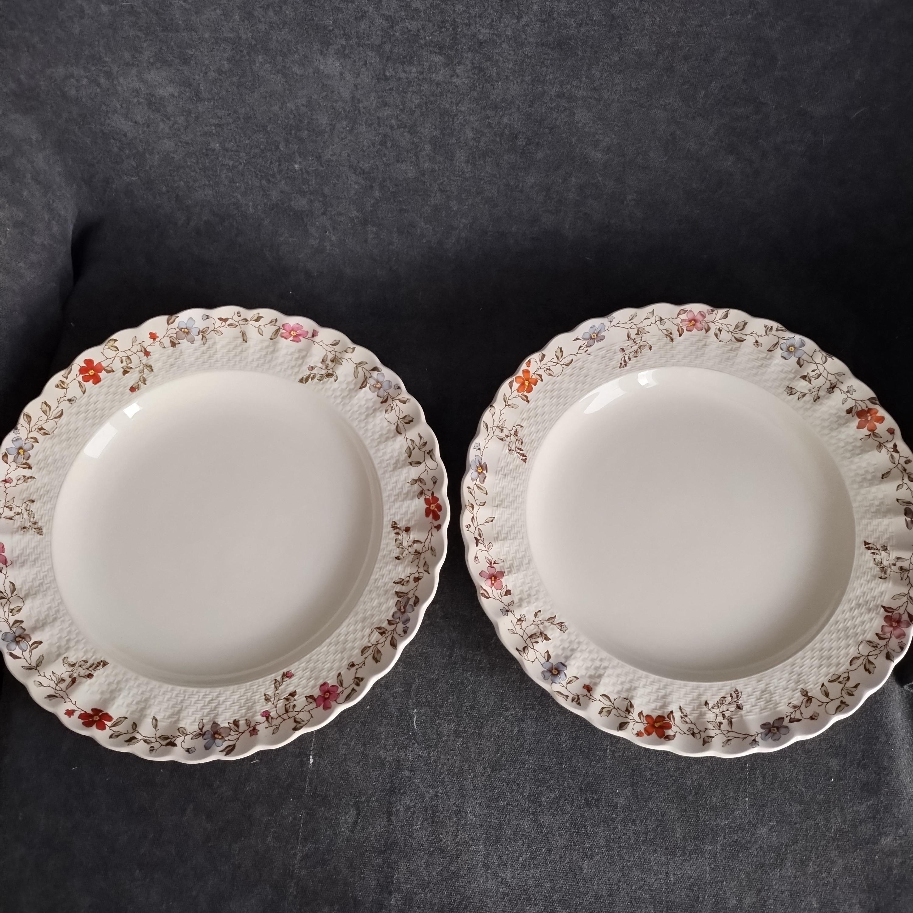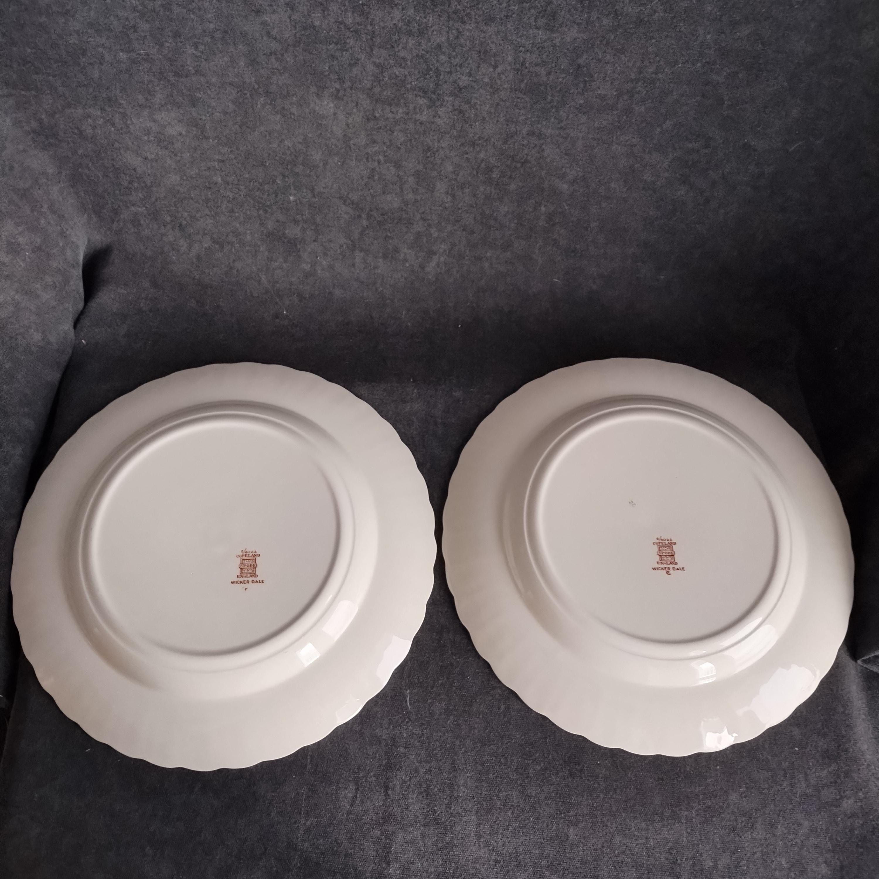 Copeland Spode produced this charming country pattern from 1954 to 1975. Wicker Dale features a brown transfer pattern finished with hand painted multicolor flowers and green leaves around the rim on a white background embossed with a wicker design. Marked on back with Copland Spode England backstamp.