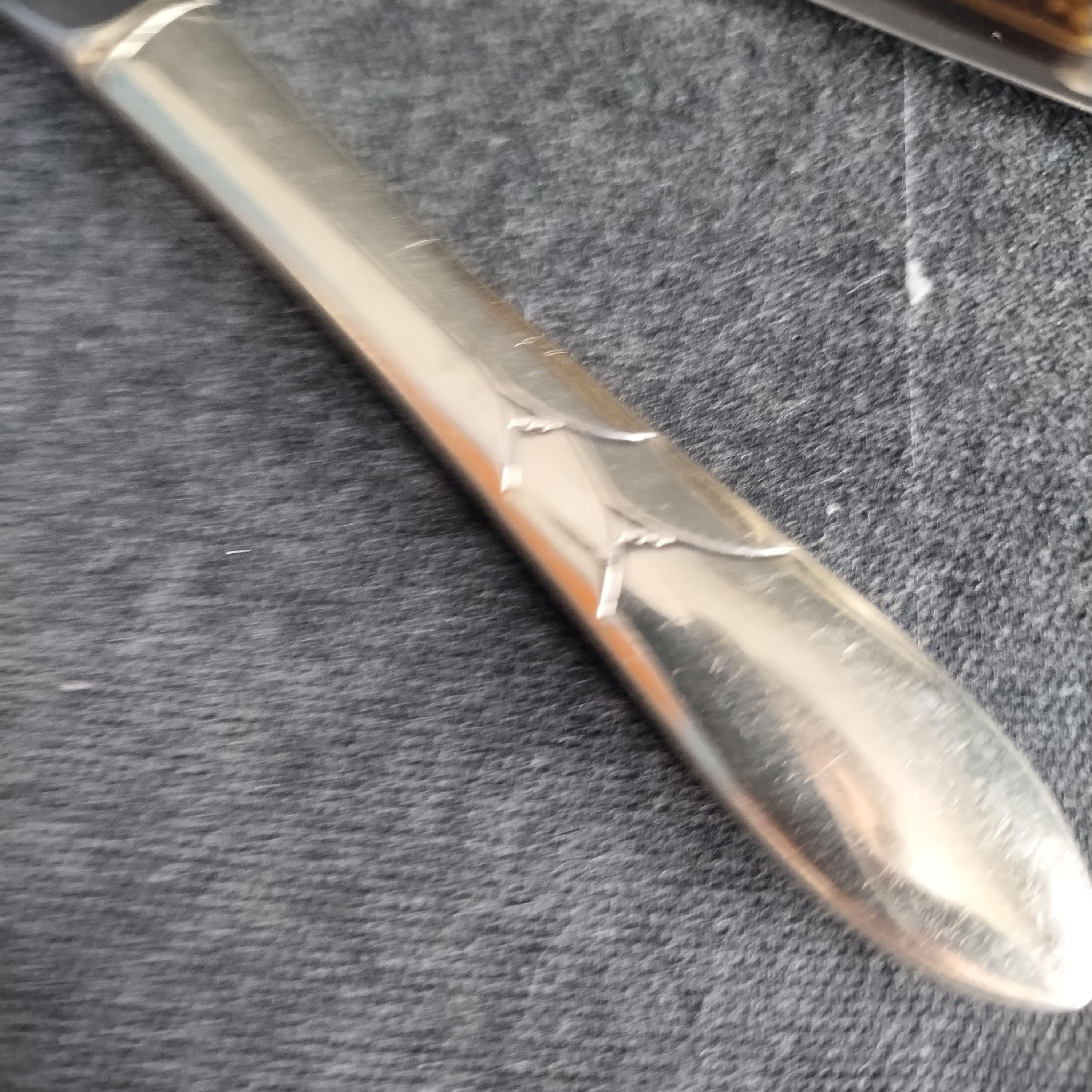 Set of 6 dinner knives in this popular silverplate pattern. "Lady Hamilton" features an art deco design reminiscent of Lily of the Valley blossoms on an smooth tapered handle. Produced from 1932 to 1955, the design reflects timeless elegance to match a wide range of china patterns. Knives have silverplated hollow handles and stainless steel blades. Hand washing is recommended to maintain the beauty of silverplate. All pieces are freshly polished and ziploc sealed to minimize tarnishing.