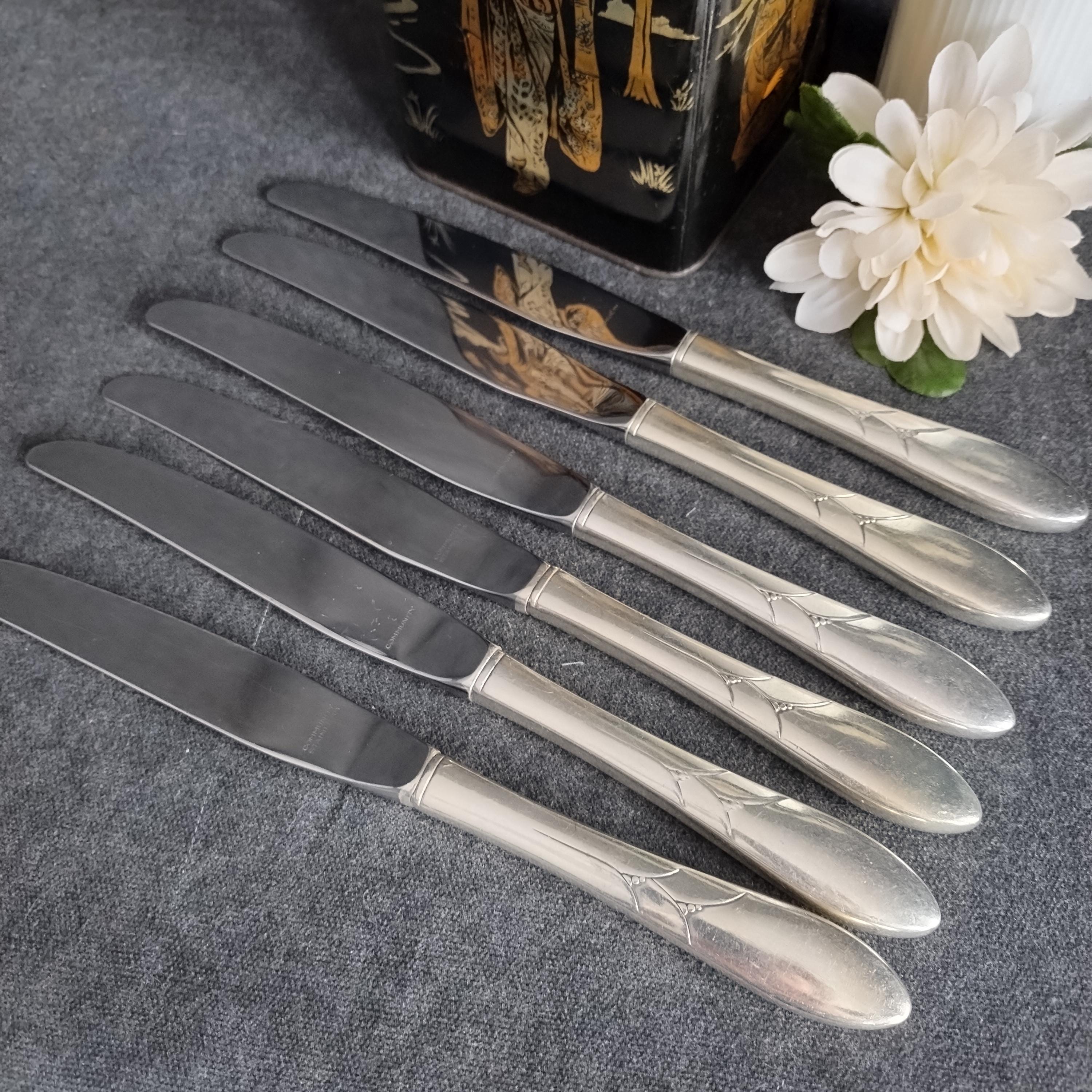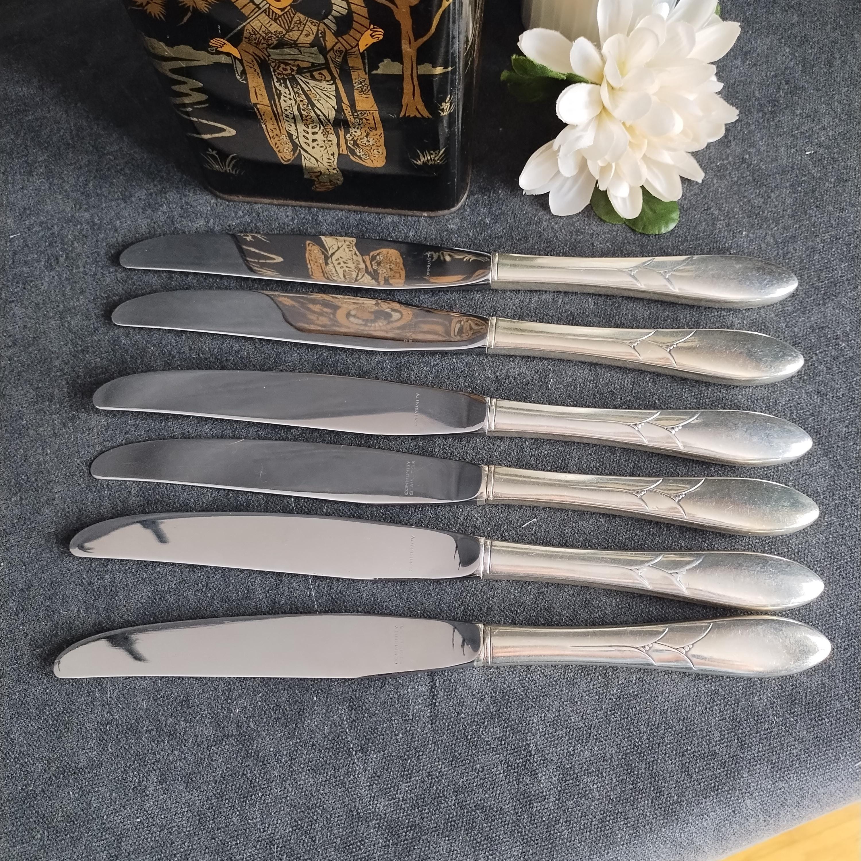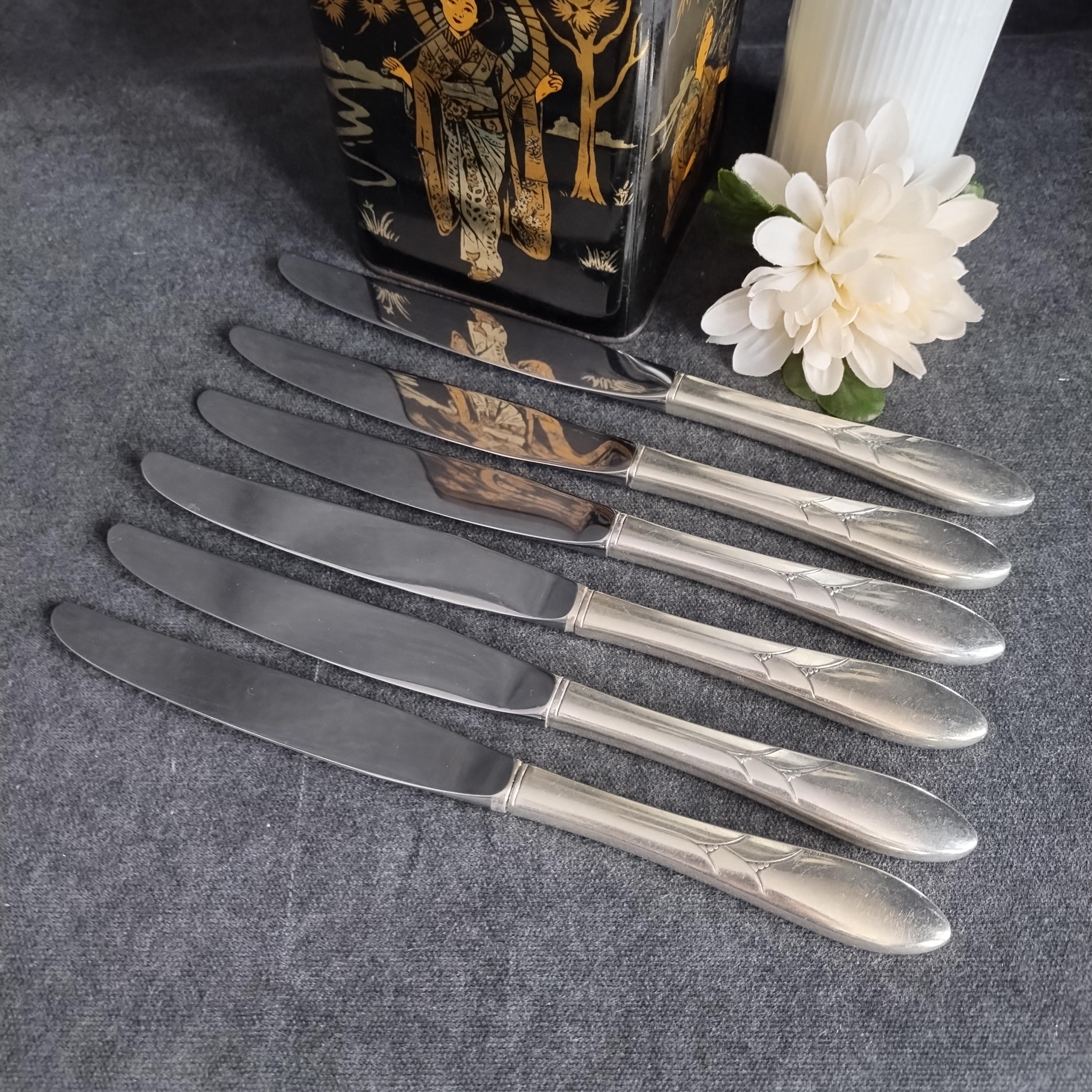 This listing is for 6 dinner knives (9.25" long). Condition is good with surface scratches consistant with age and use. Full place settings and serving utensils available in other listings.