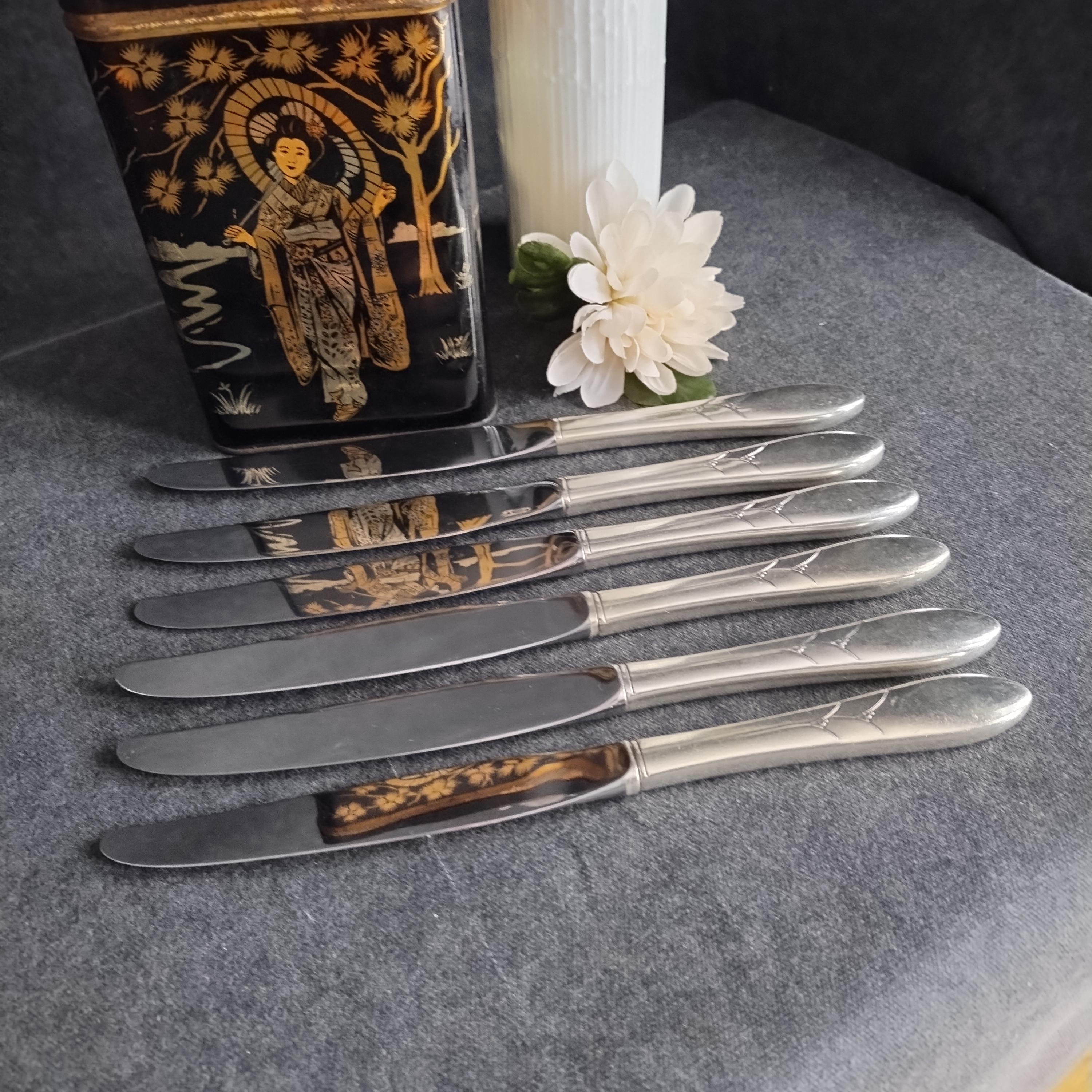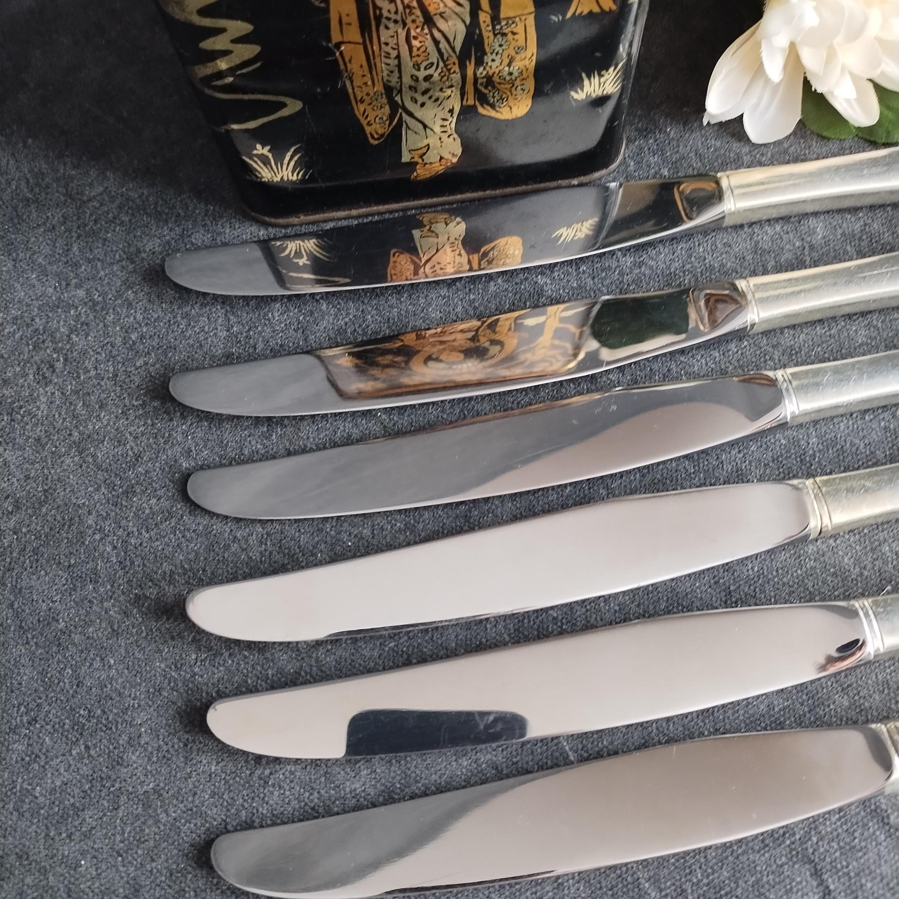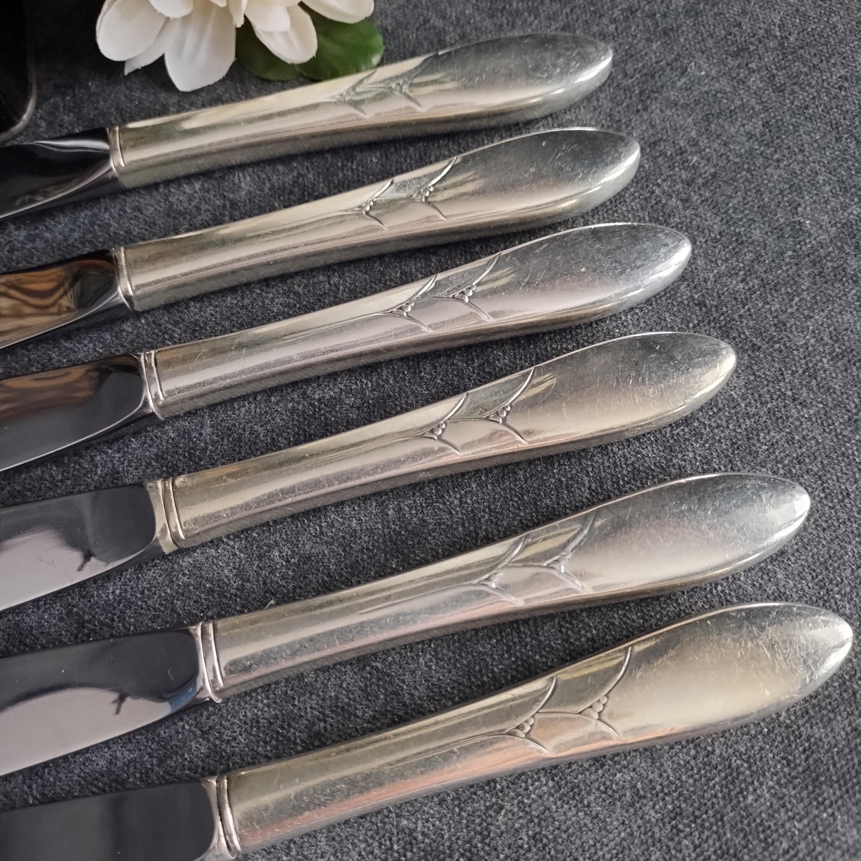 This listing is for 6 dinner knives (9.25" long). Condition is good with surface scratches consistant with age and use. Full place settings and serving utensils available in other listings.