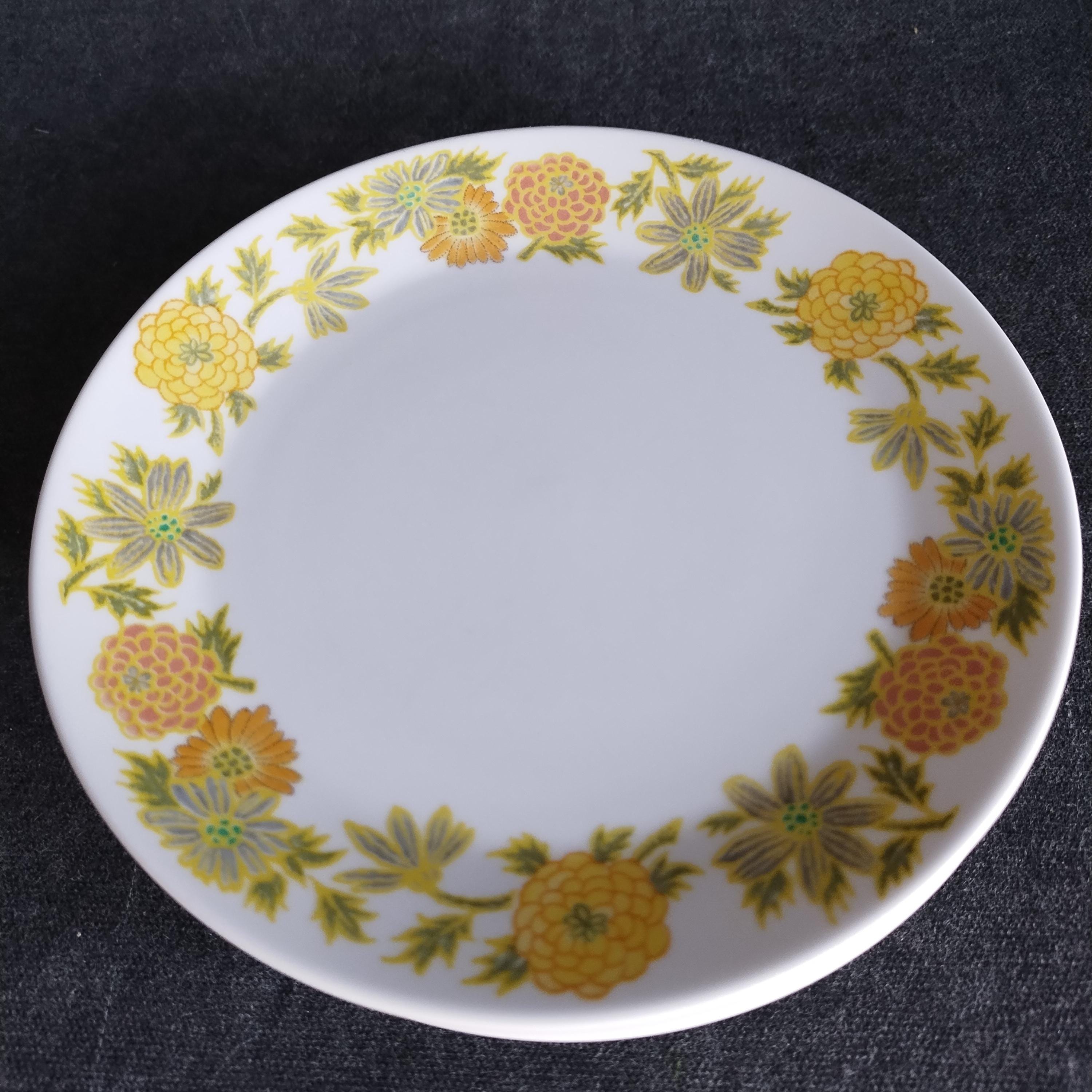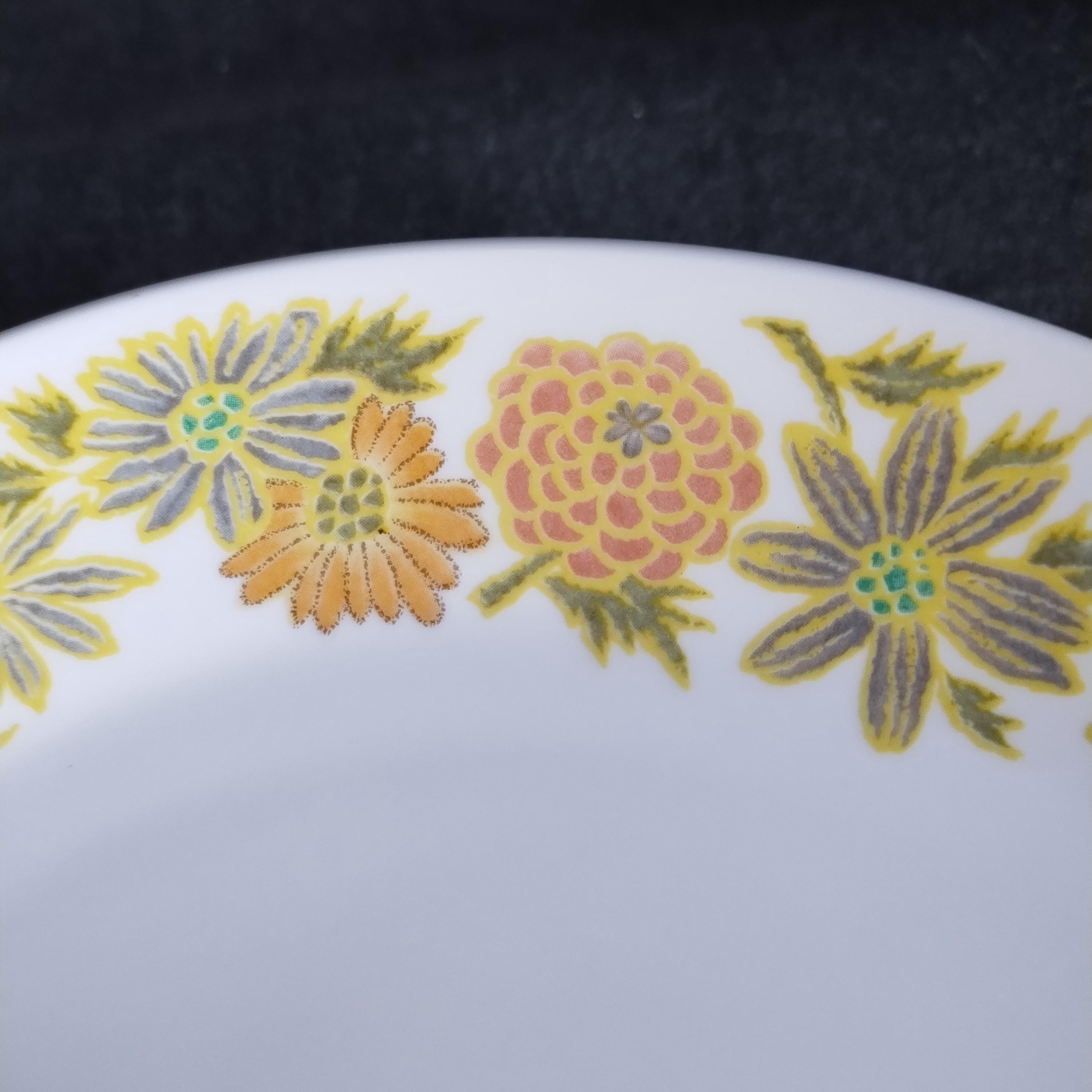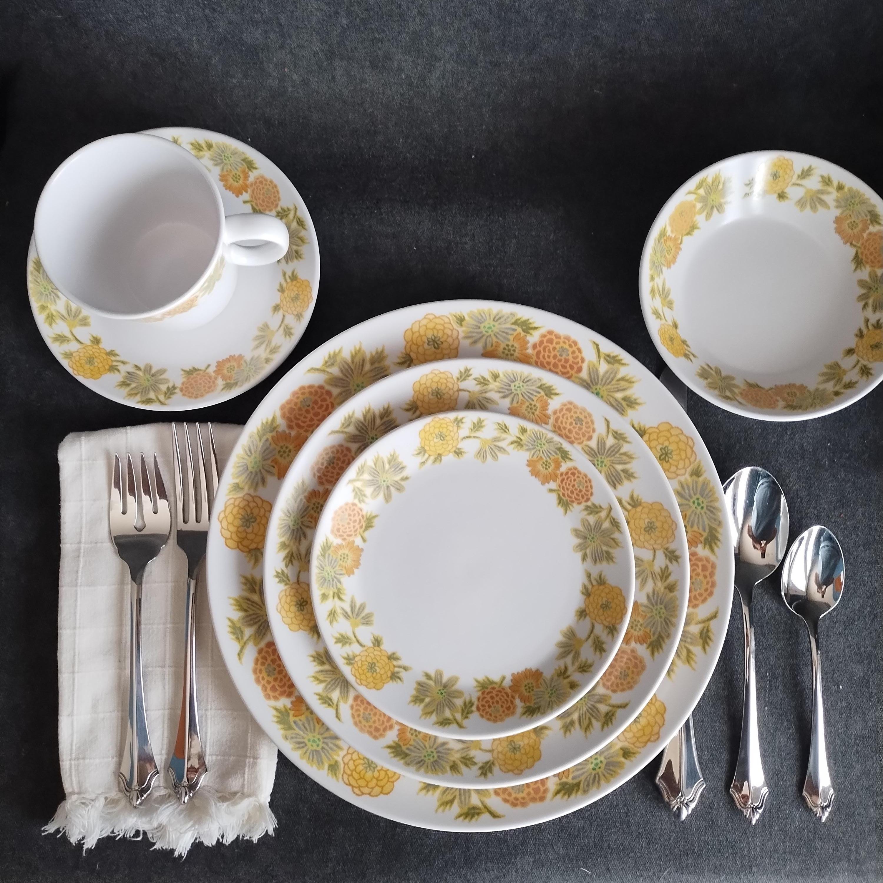Cheerful retro dinnerware by Noritake Japan will add a touch of spring to your dining table. Sunny Side is from their Progressions dinnerware line created to be microwave and dishwasher safe. I love the smooth satin finish. This pattern features a wide boarder of yellow and orange flowers on a bright white background. Excellent durability - my own dishes are Noritake Progressions that still look great after nearly 10 years of everyday use.