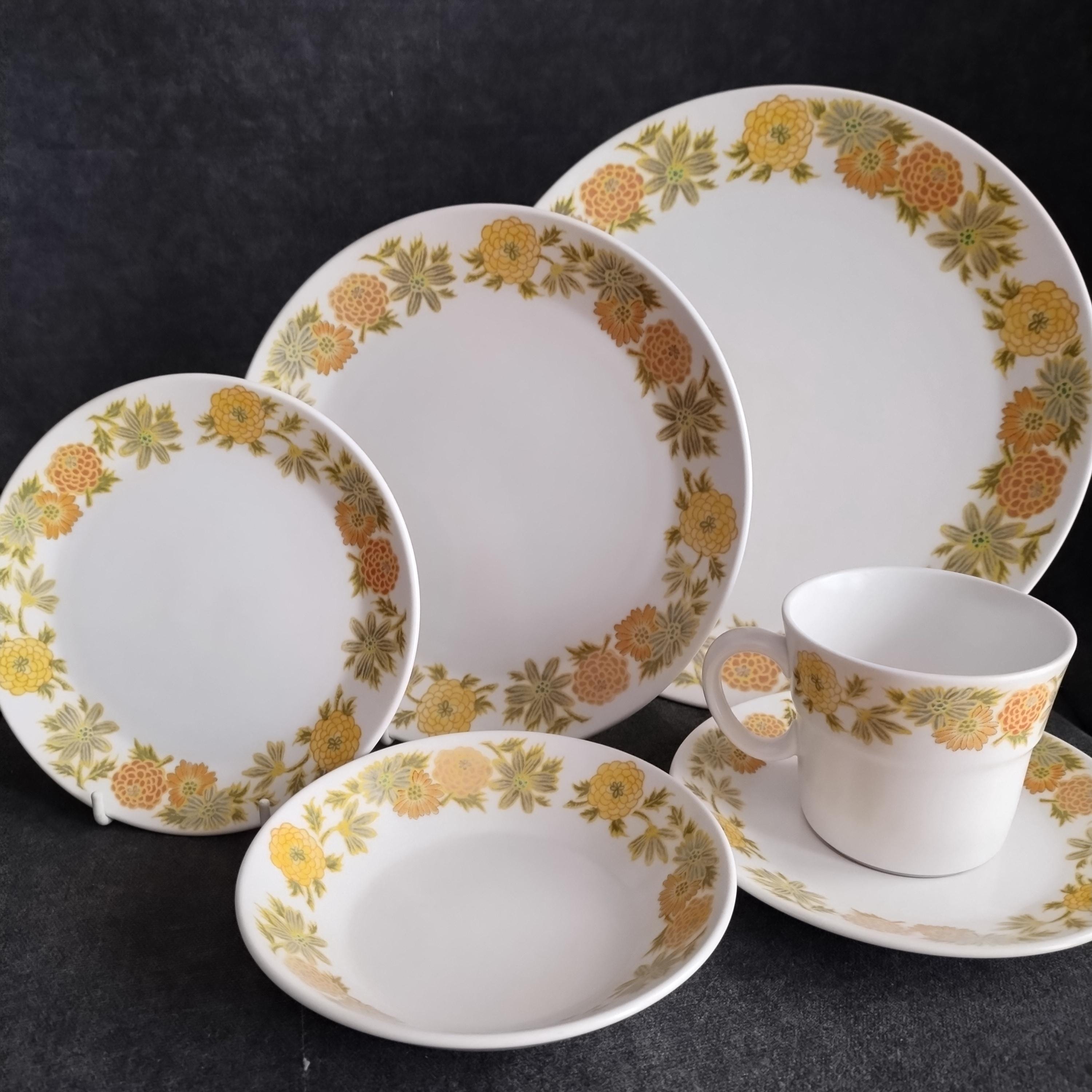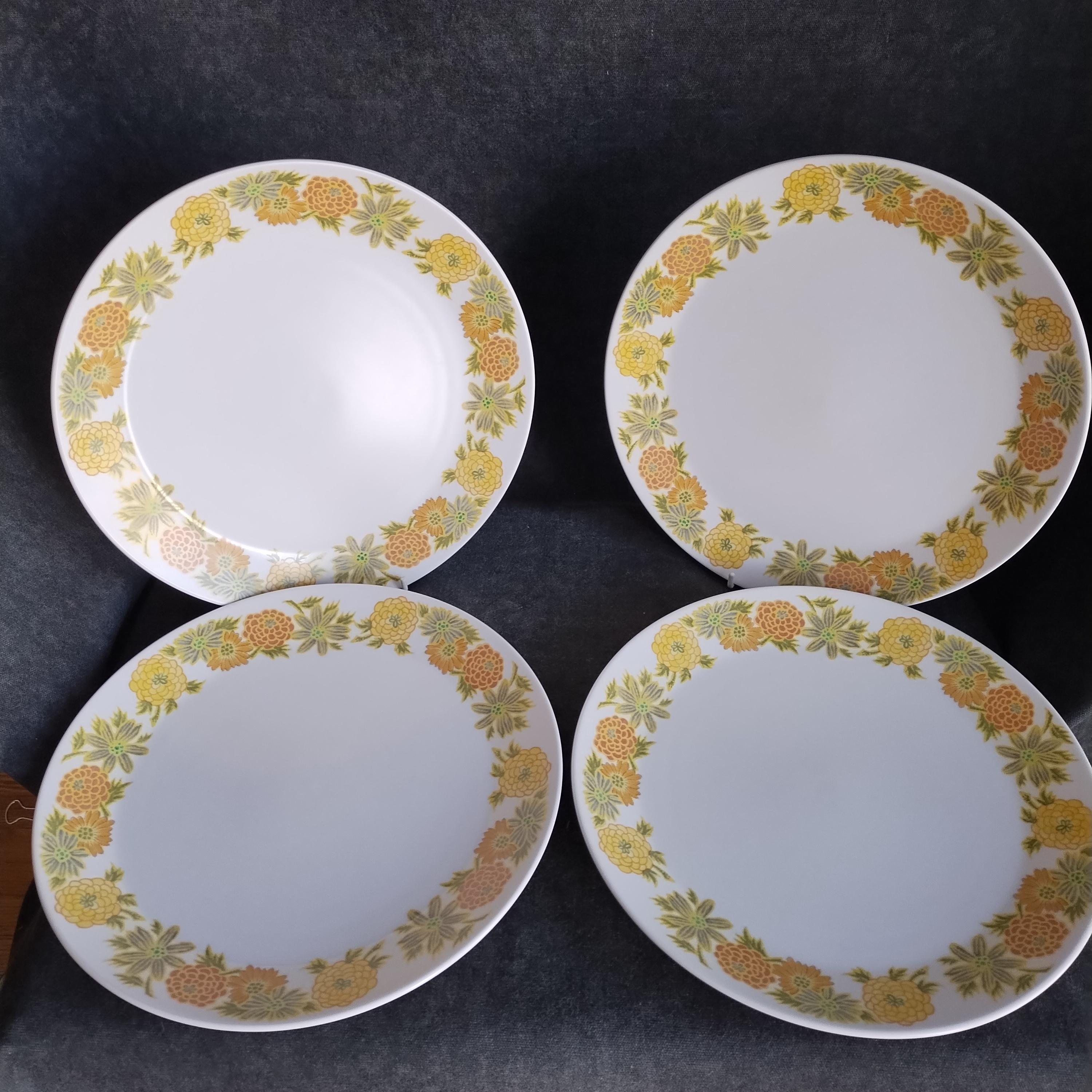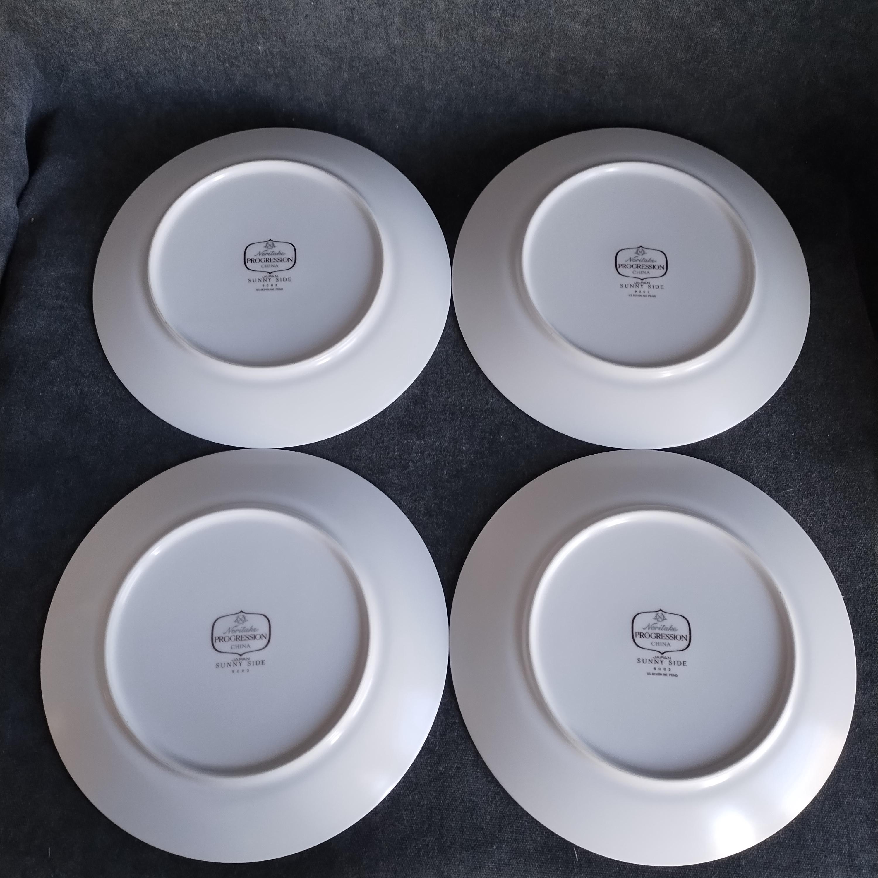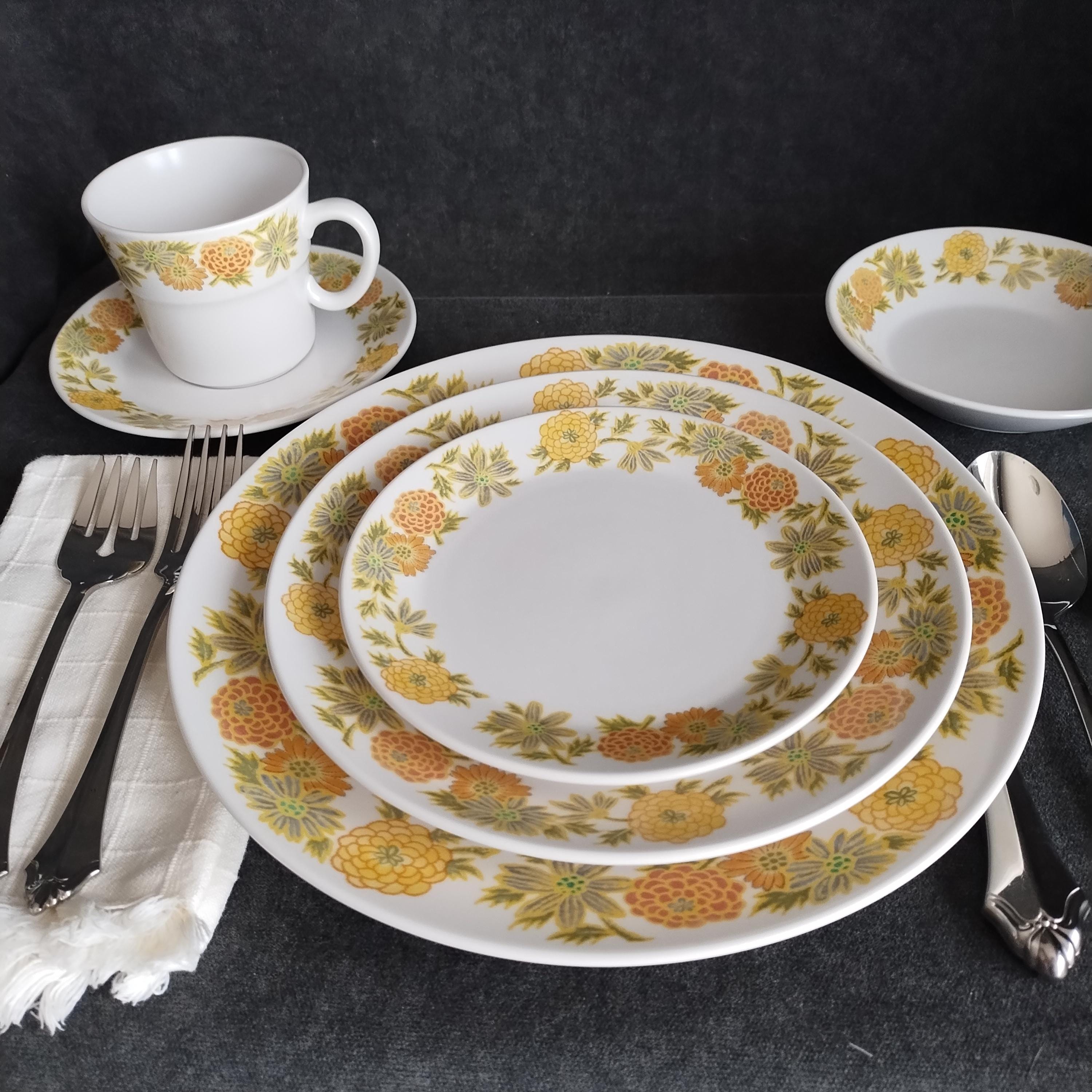 Cheerful retro dinnerware by Noritake Japan will add a touch of spring to your dining table. Sunny Side is from their Progressions dinnerware line created to be microwave and dishwasher safe. I love the smooth satin finish. This pattern features a wide boarder of yellow and orange flowers on a bright white background. Excellent durability - my own dishes are Noritake Progressions that still look great after nearly 10 years of everyday use.
