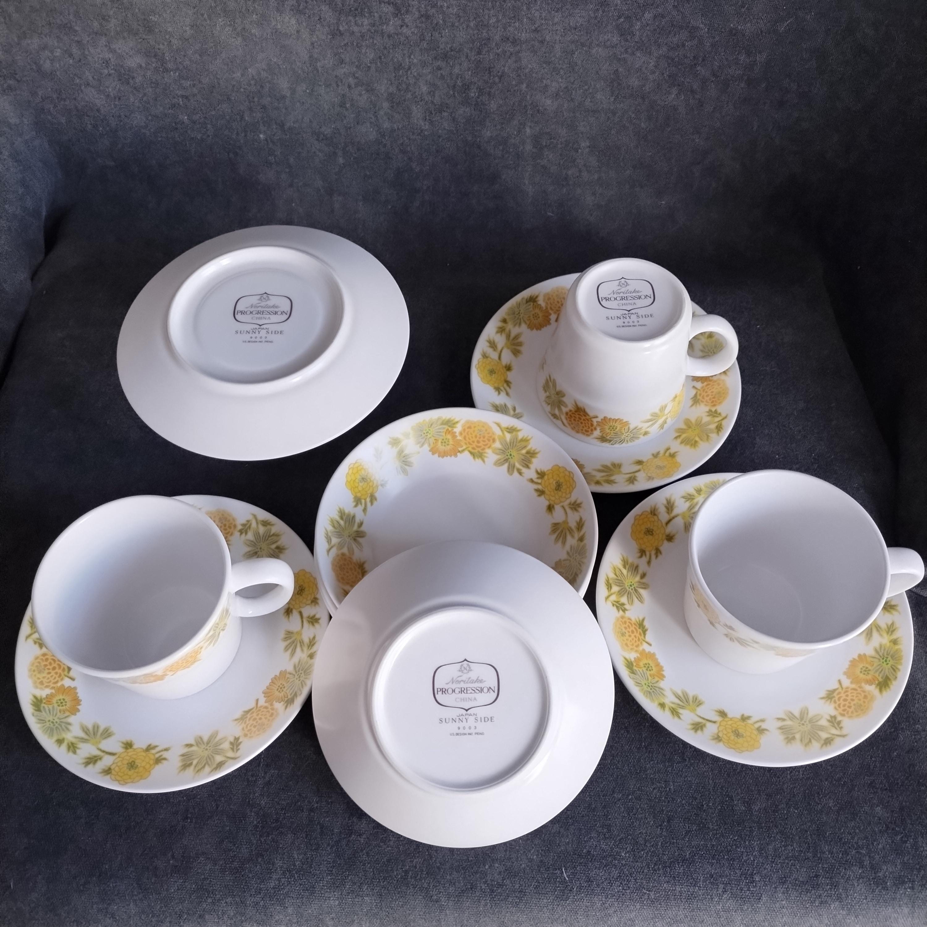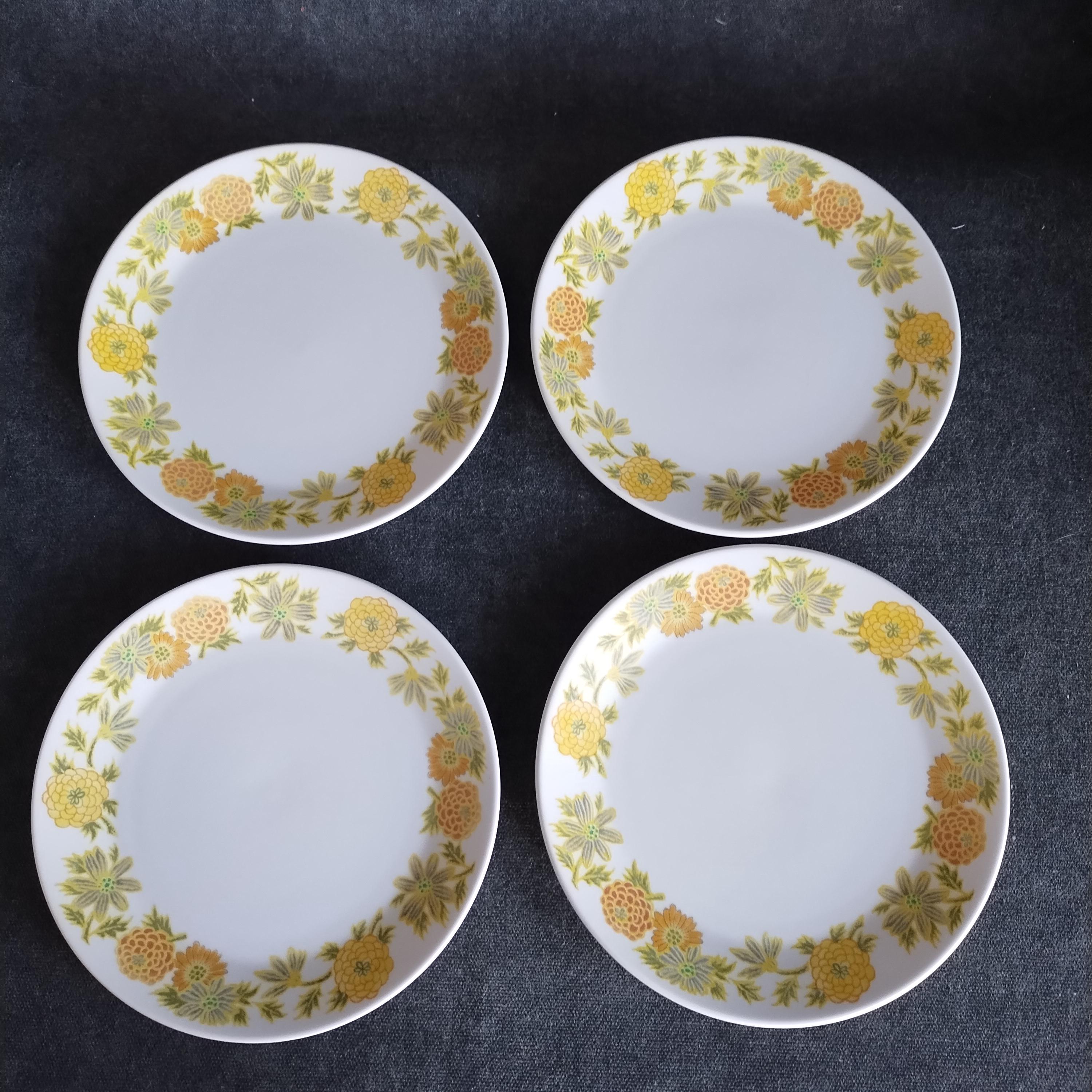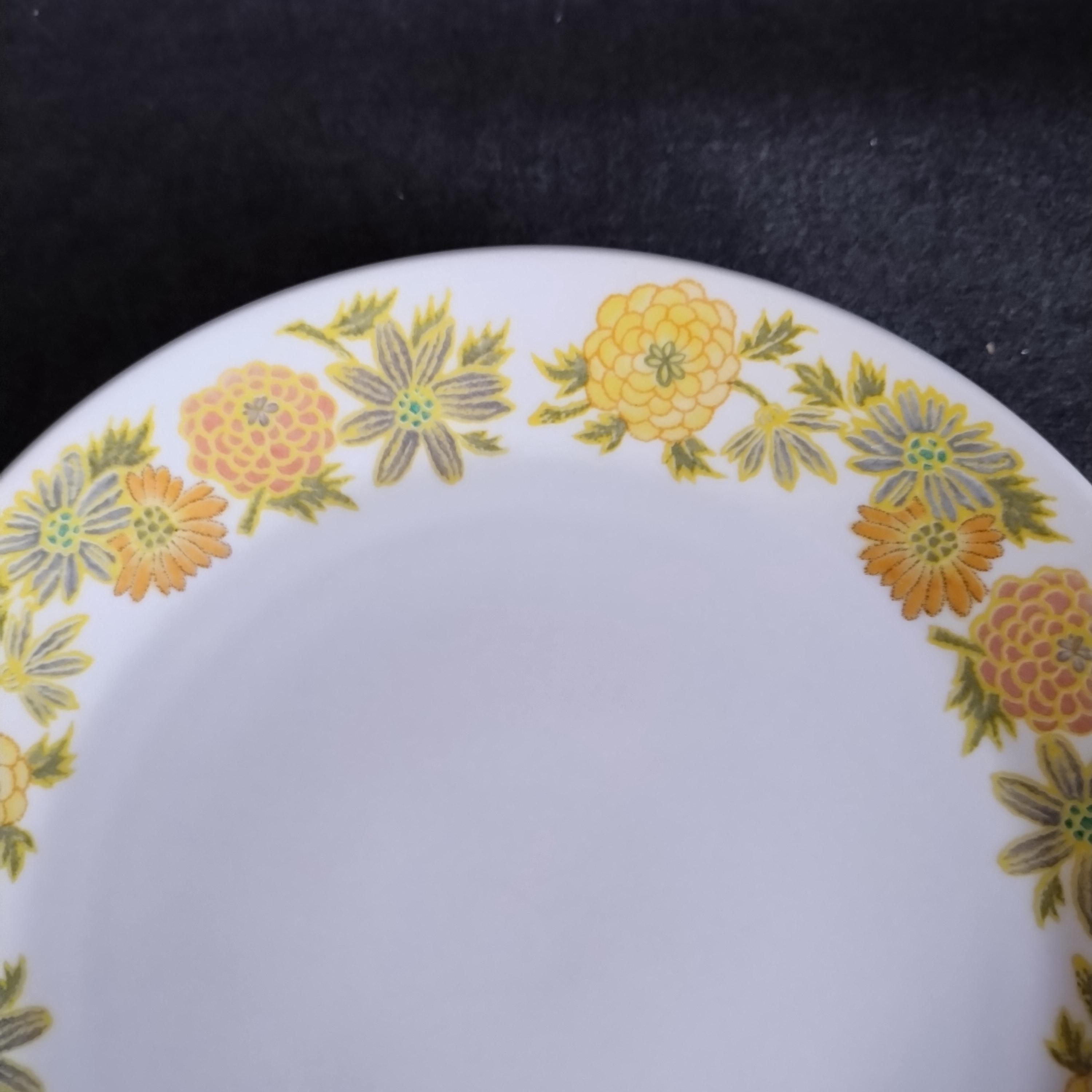 Cheerful retro dinnerware by Noritake Japan will add a touch of spring to your dining table. Sunny Side is from their Progressions dinnerware line created to be microwave and dishwasher safe. I love the smooth satin finish. This pattern features a wide boarder of yellow and orange flowers on a bright white background. Excellent durability - my own dishes are Noritake Progressions that still look great after nearly 10 years of everyday use.