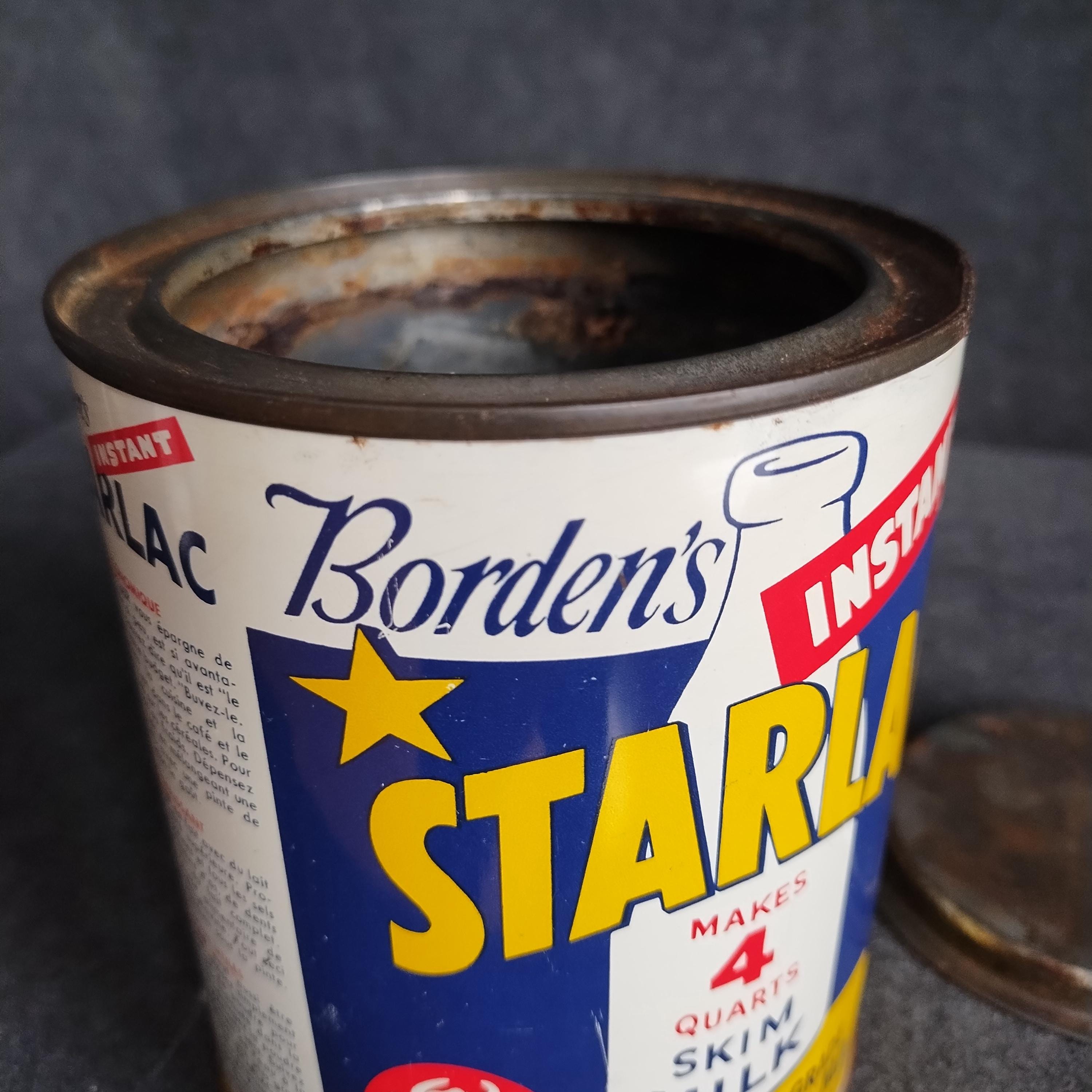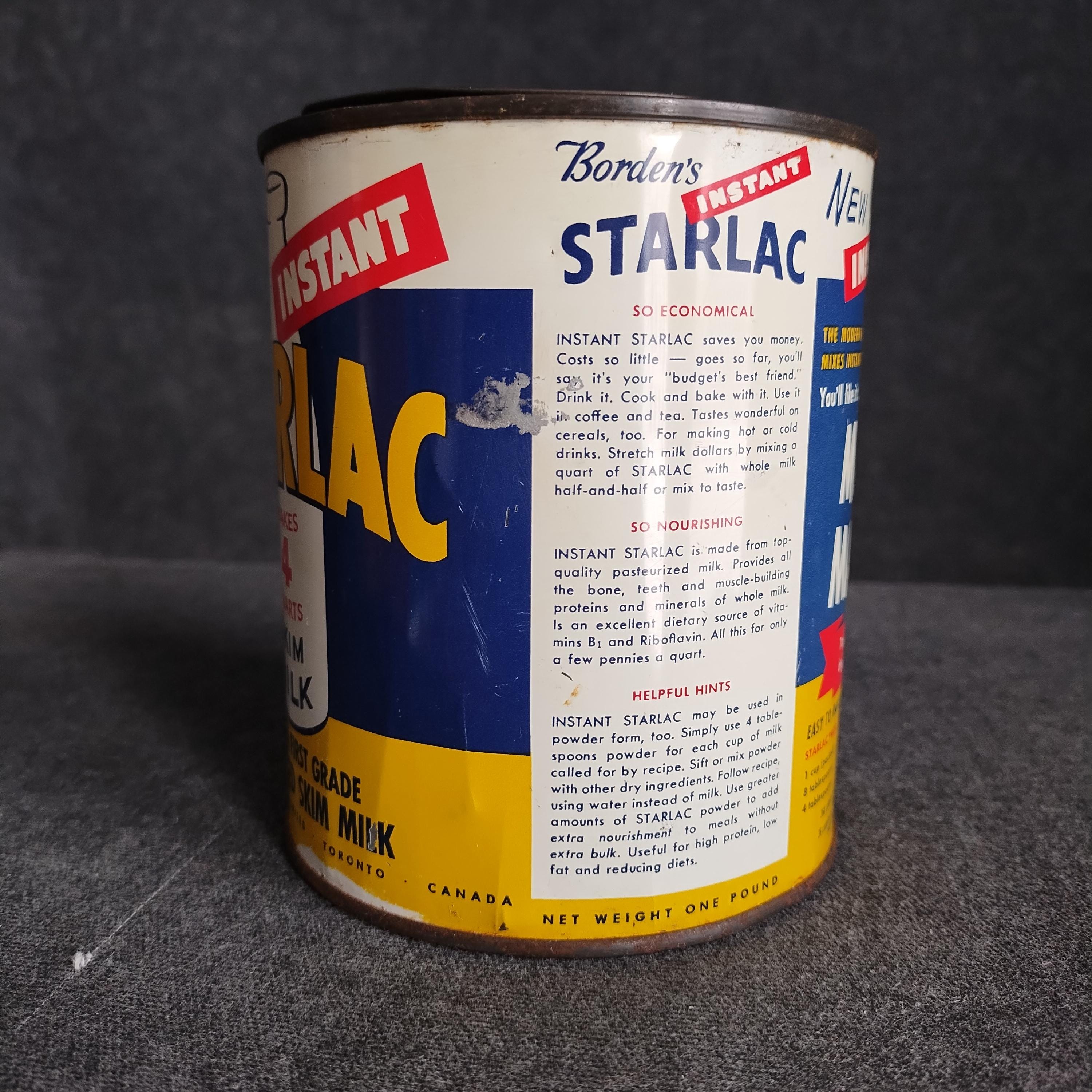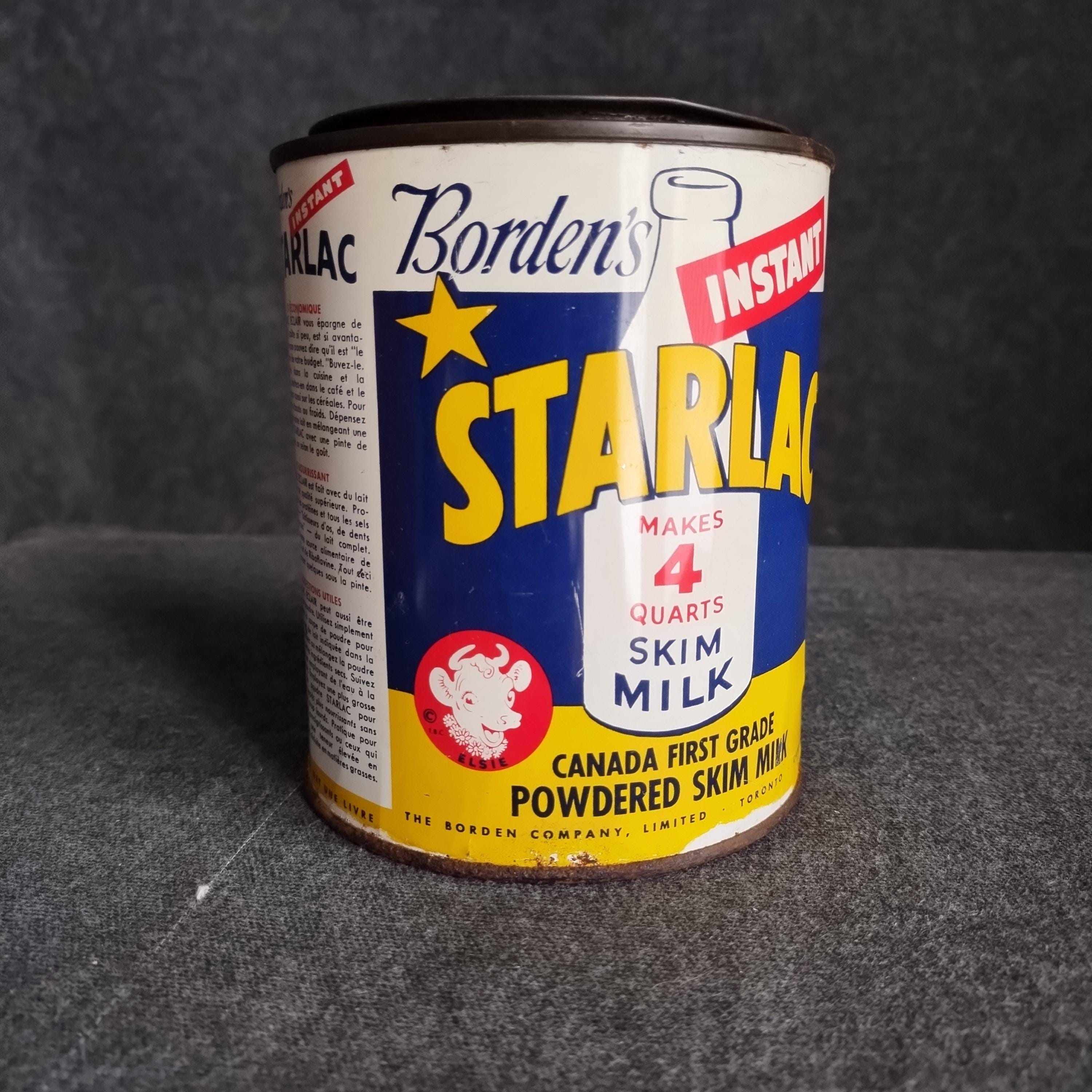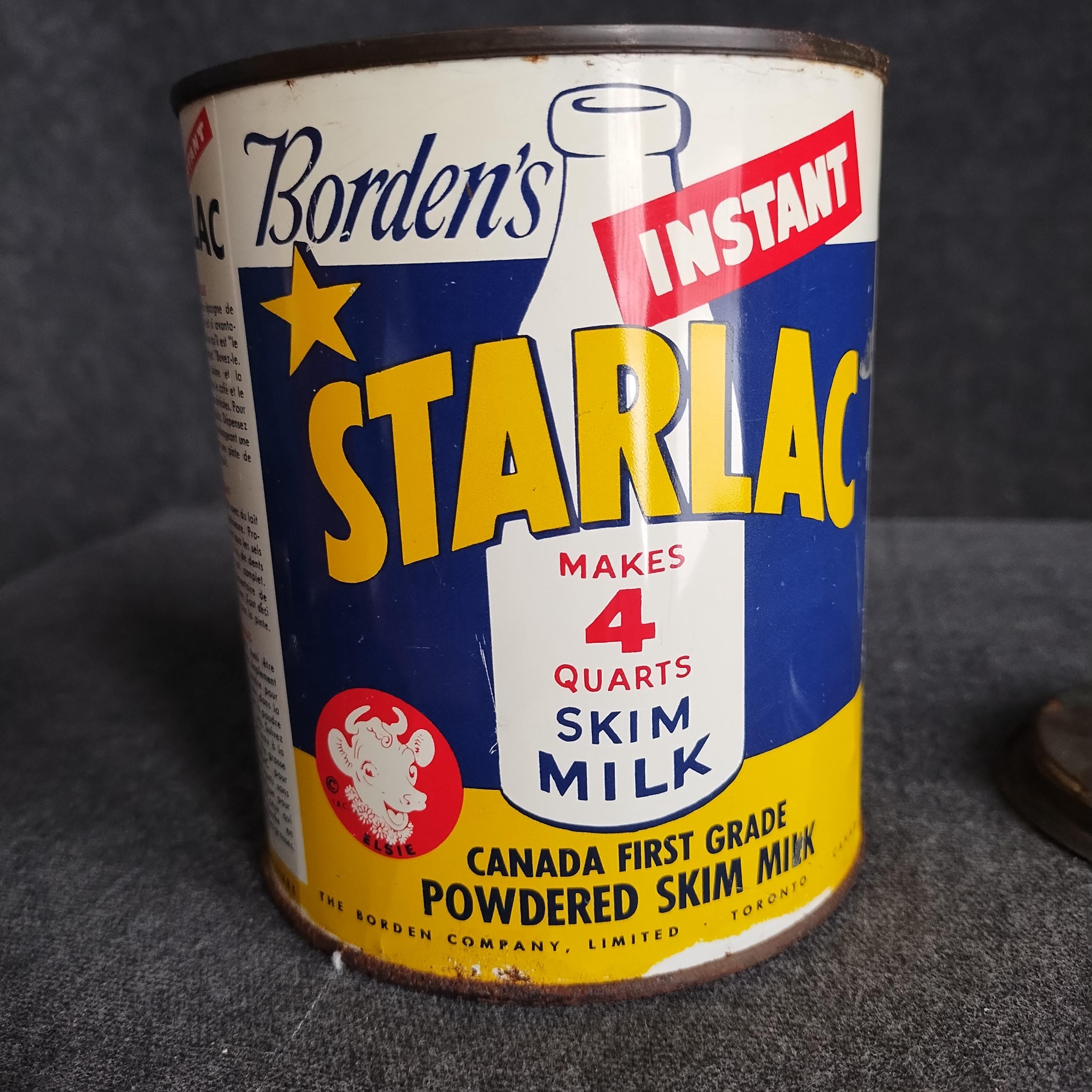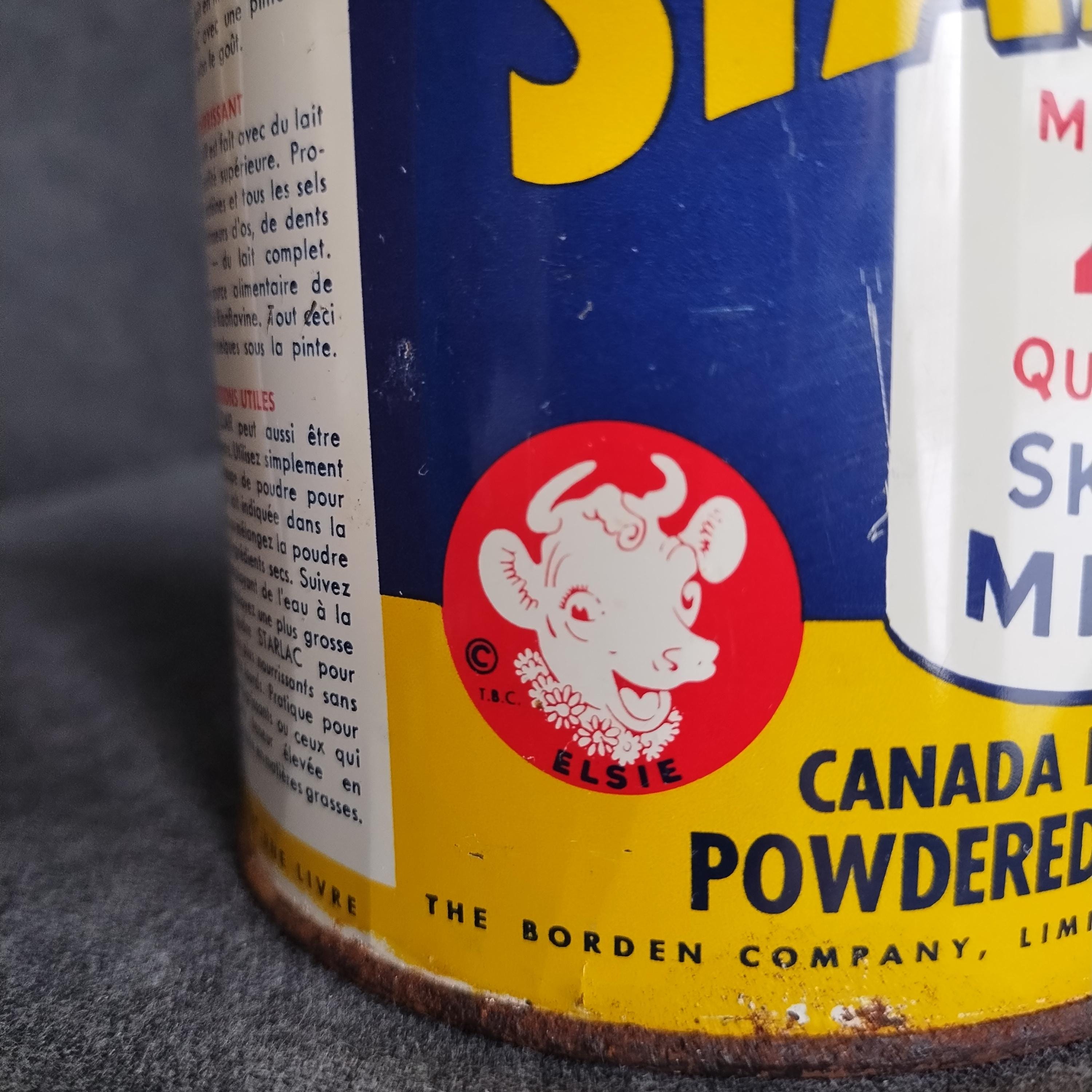 Vintage collectible metal can with pry top plug style lid. Borden's "Starlac" instant skim milk powder 4 quart size features an early version of mascot "Elsie" the cow.