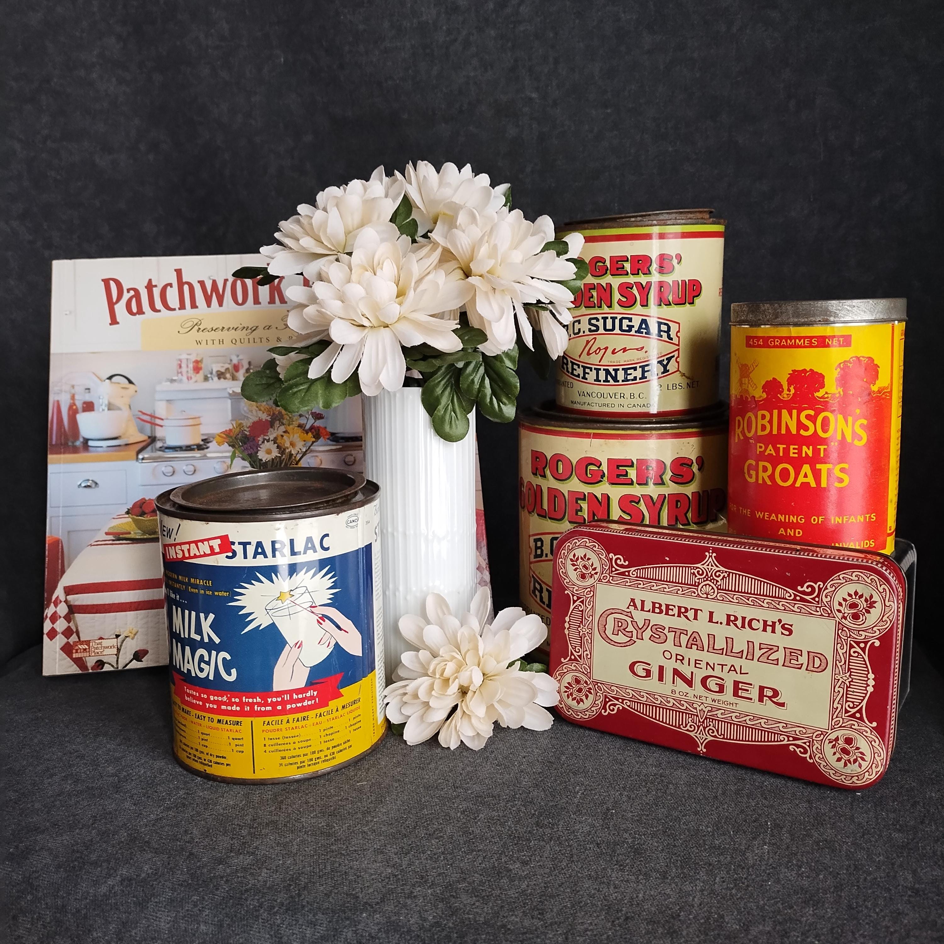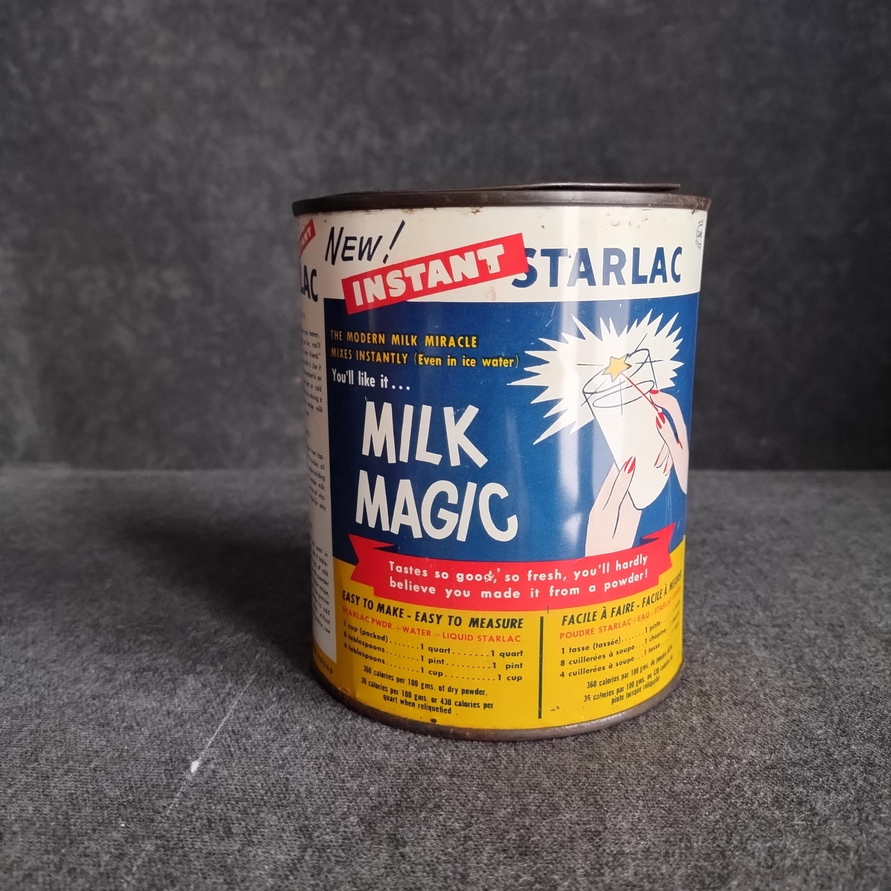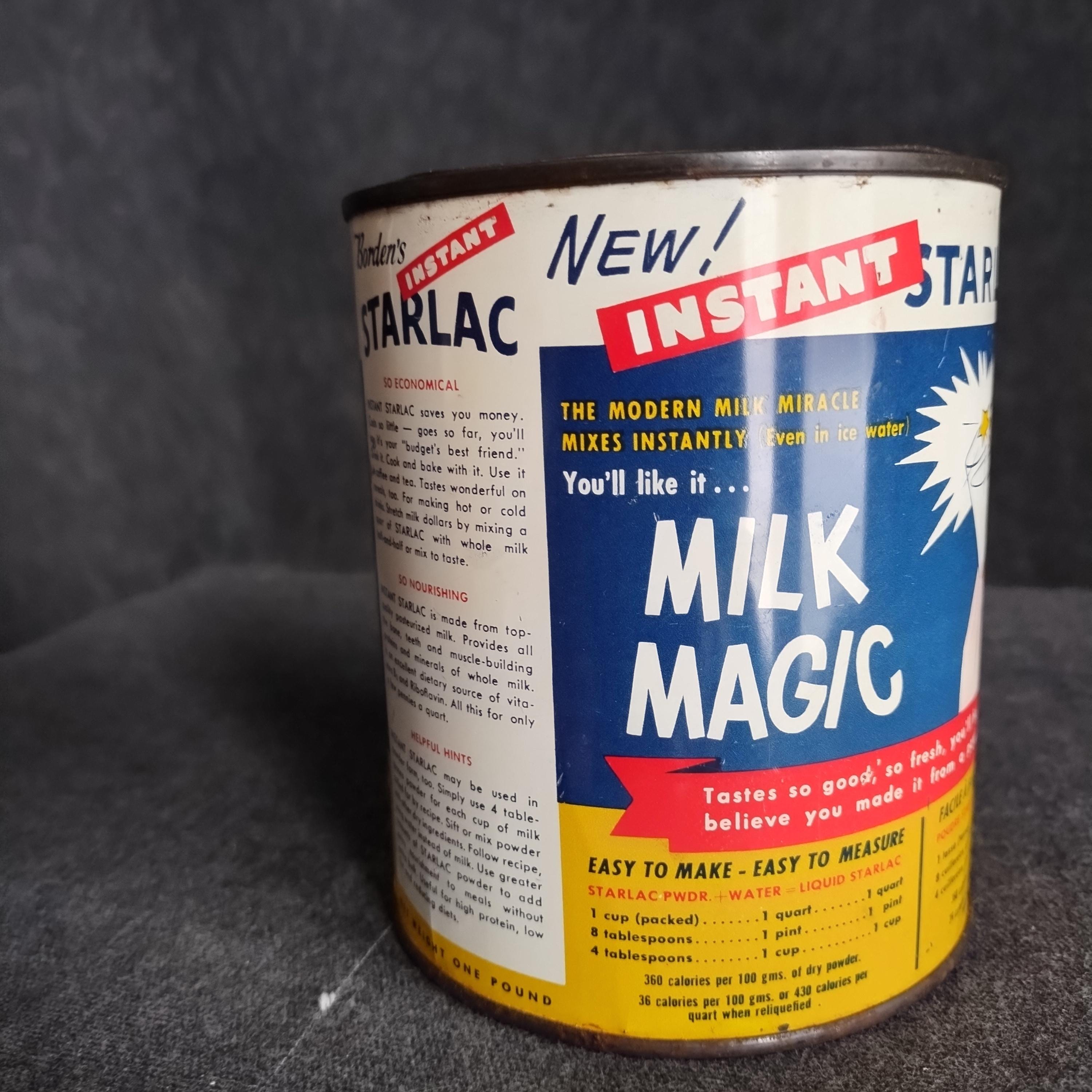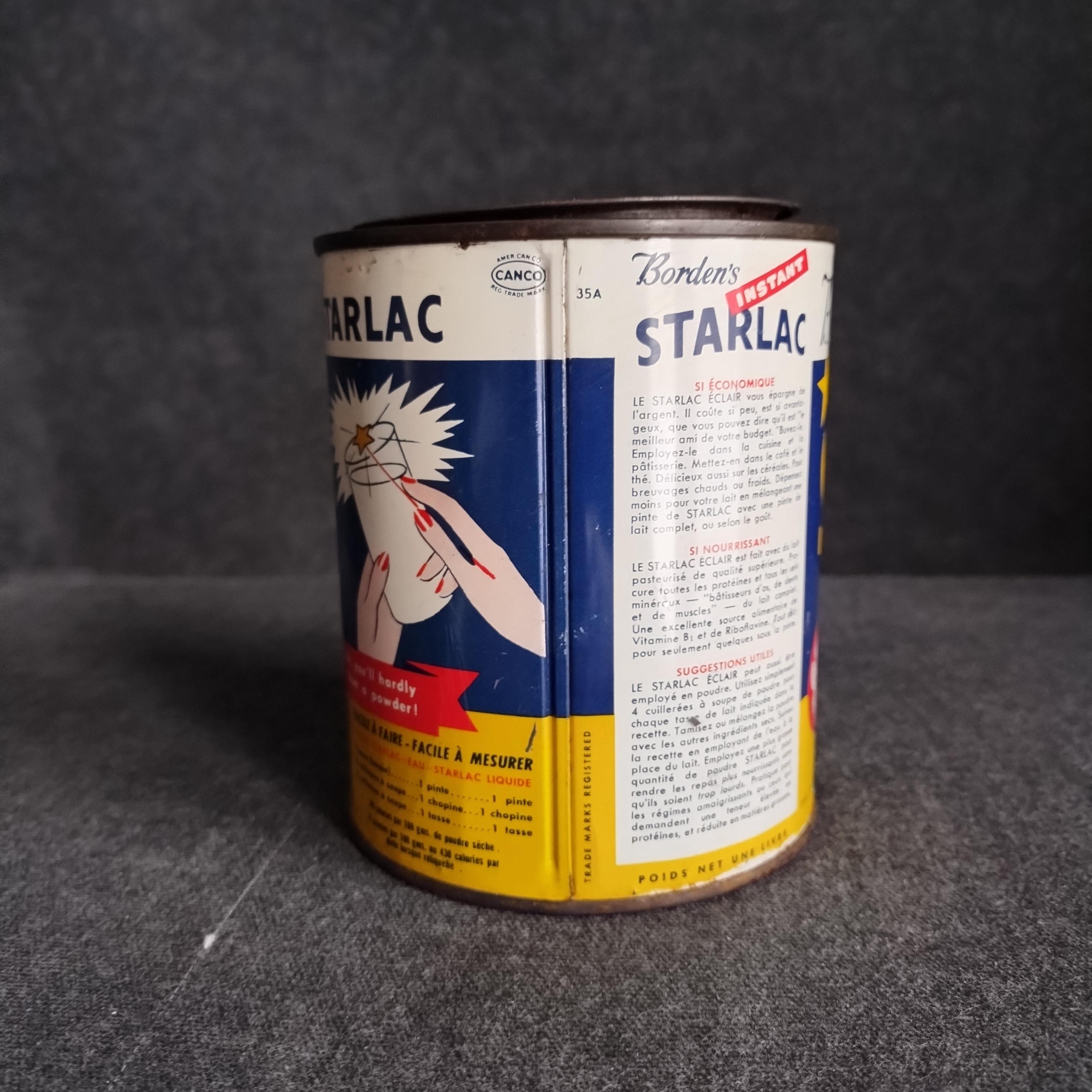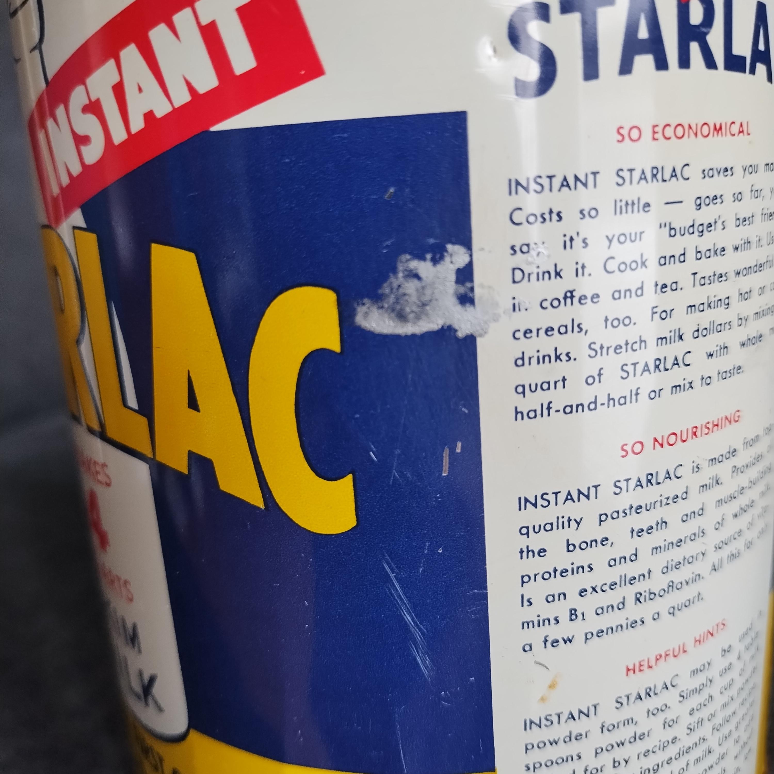 Vintage collectible metal can with pry top plug style lid. Borden's "Starlac" instant skim milk powder 4 quart size features an early version of mascot "Elsie" the cow.