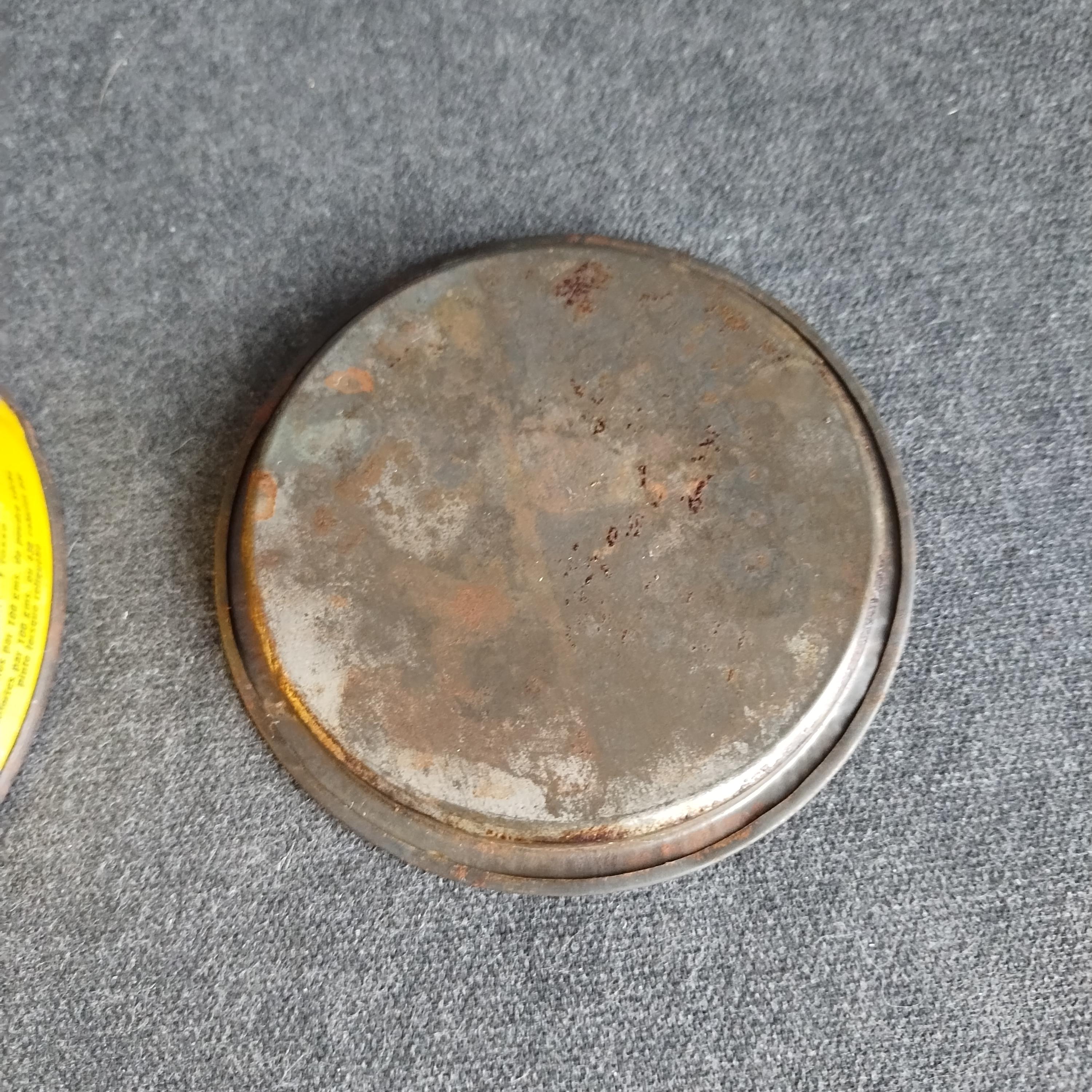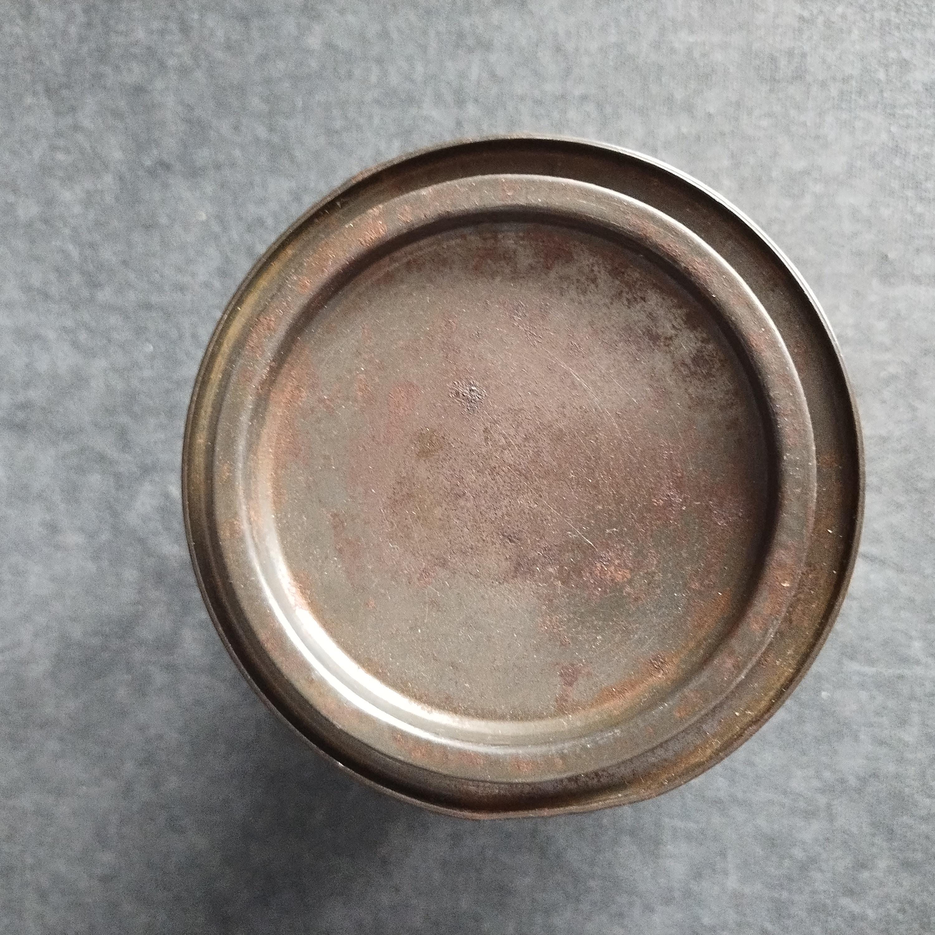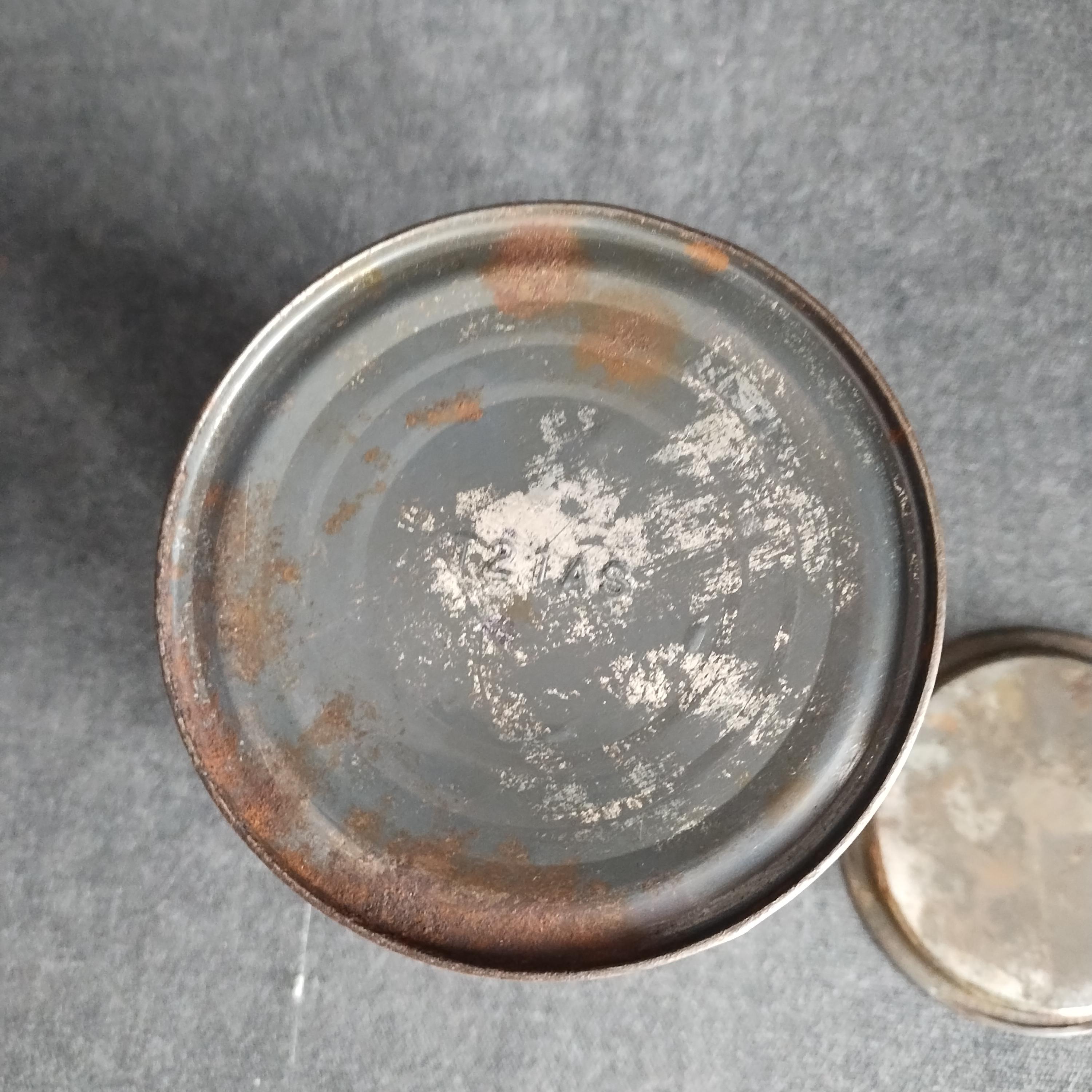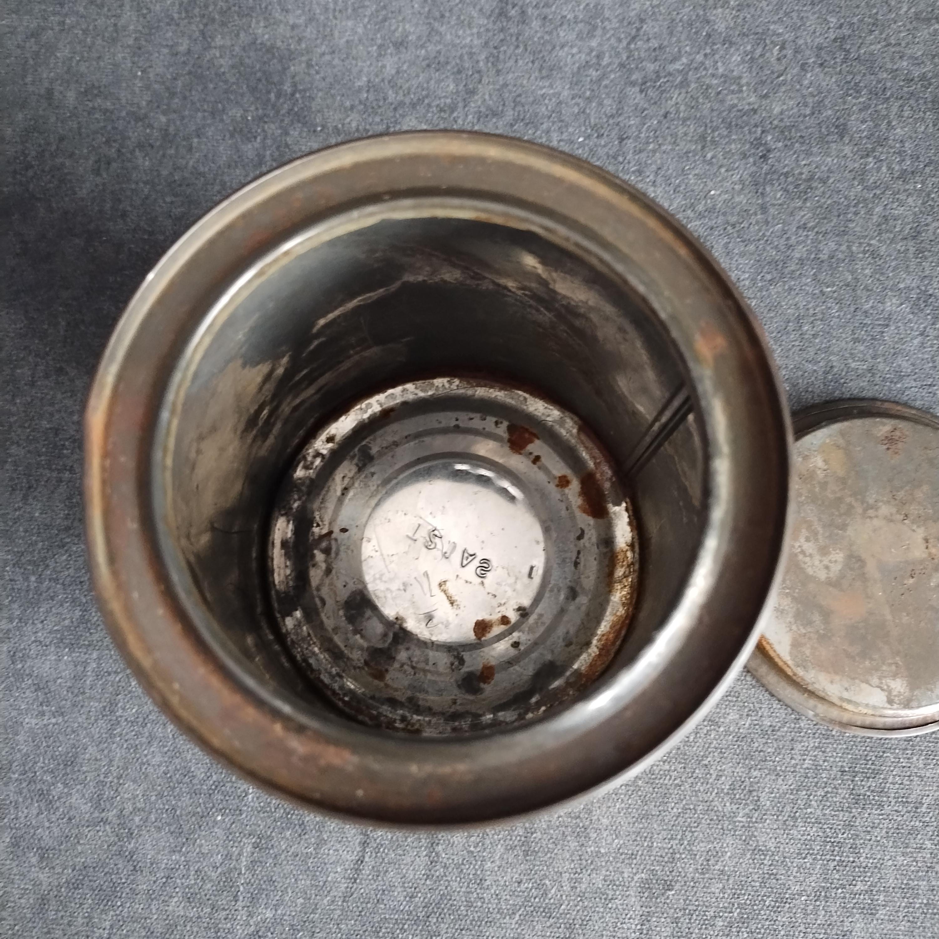 Condition is good with minor surface rust at the base and inside. Overall very nice bright graphics with snug fitting lid. Minor denting and one area of blue surface colour missing.