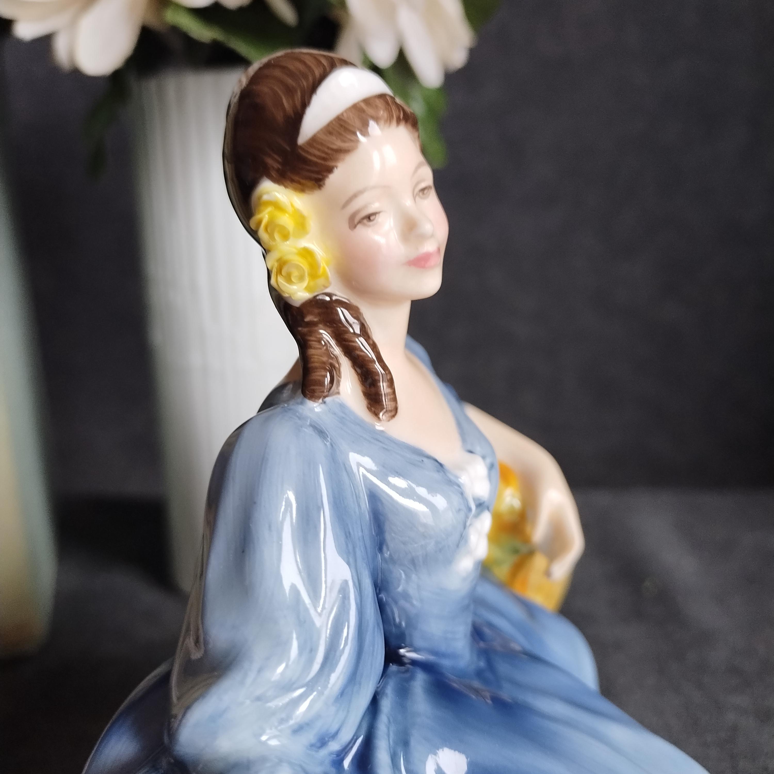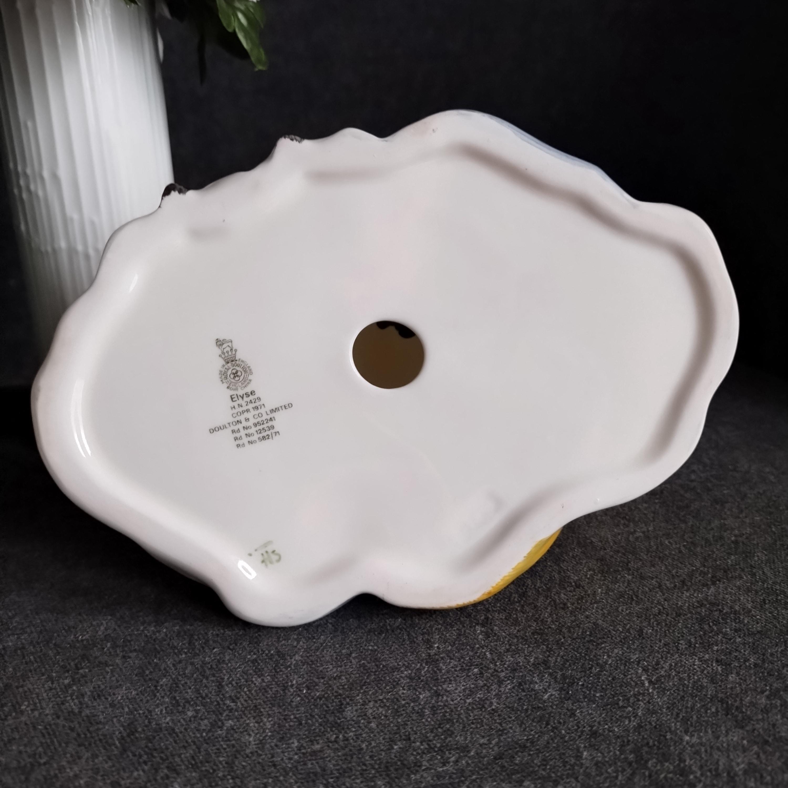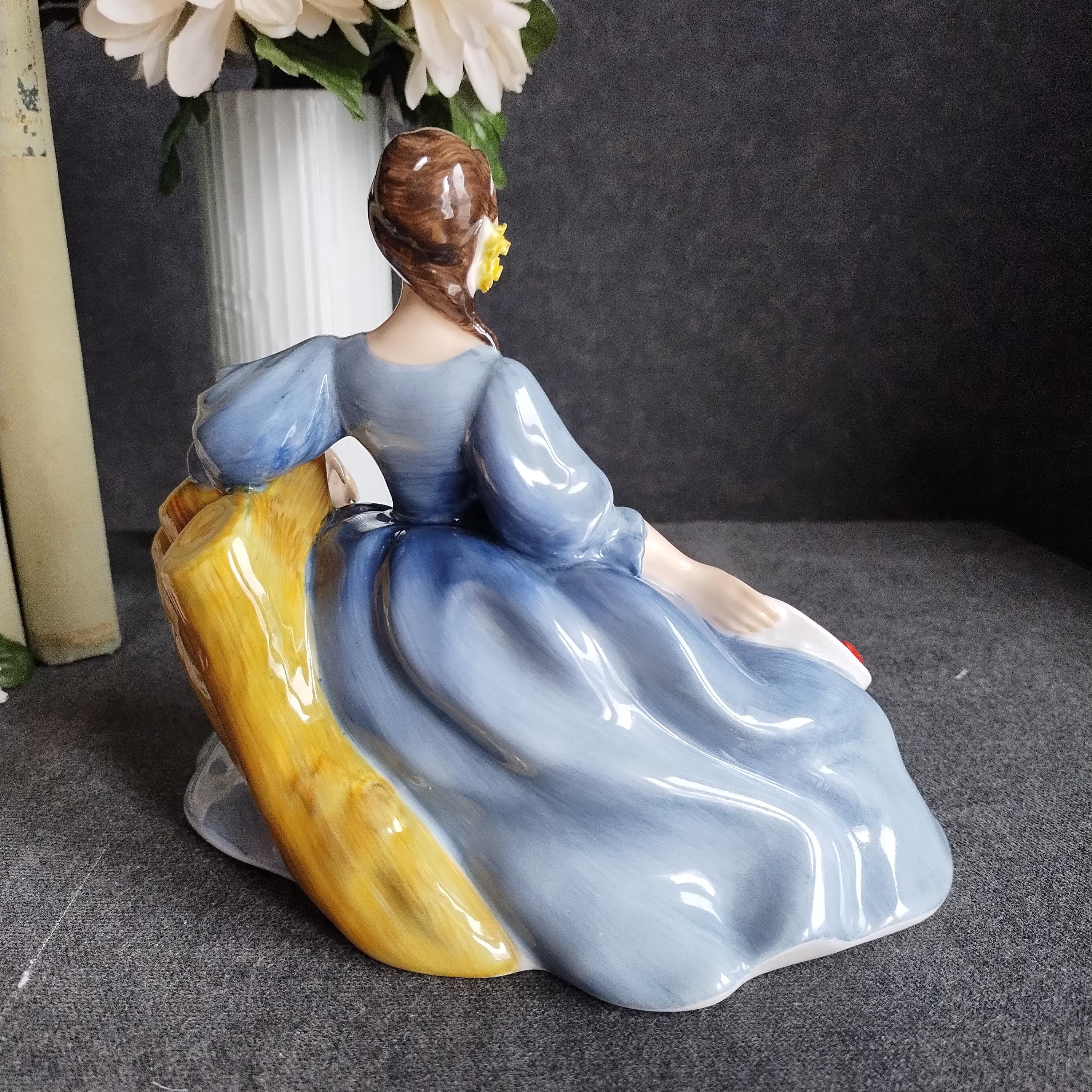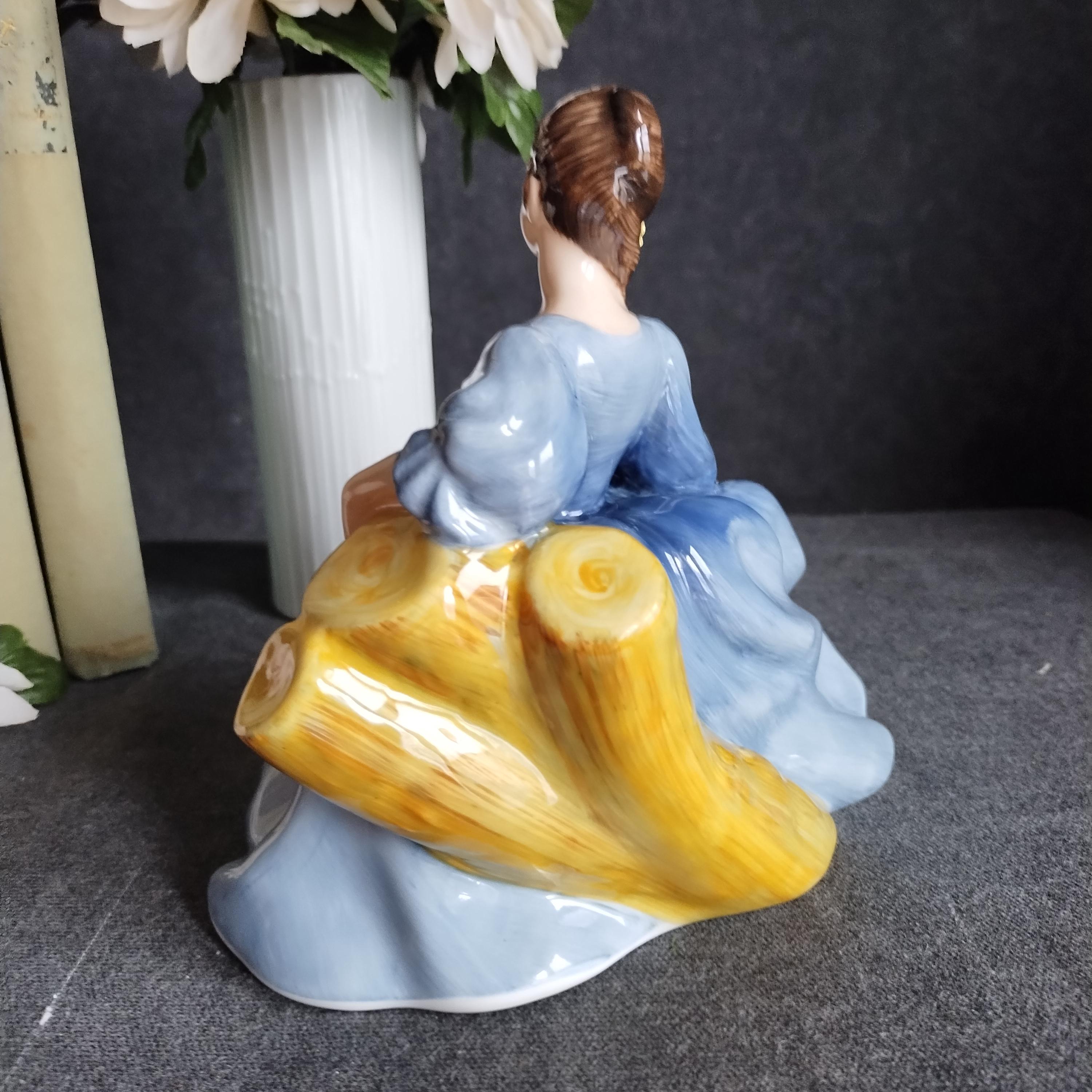 Elyse is wearing a flowing blue gown. She is featured seated on a tree and holding a white hat with red ribbon. Elegant yellow roses adorn her dark hair. Condition is excellent - no chips, cracks, repairs, or age related crazing to the glaze.