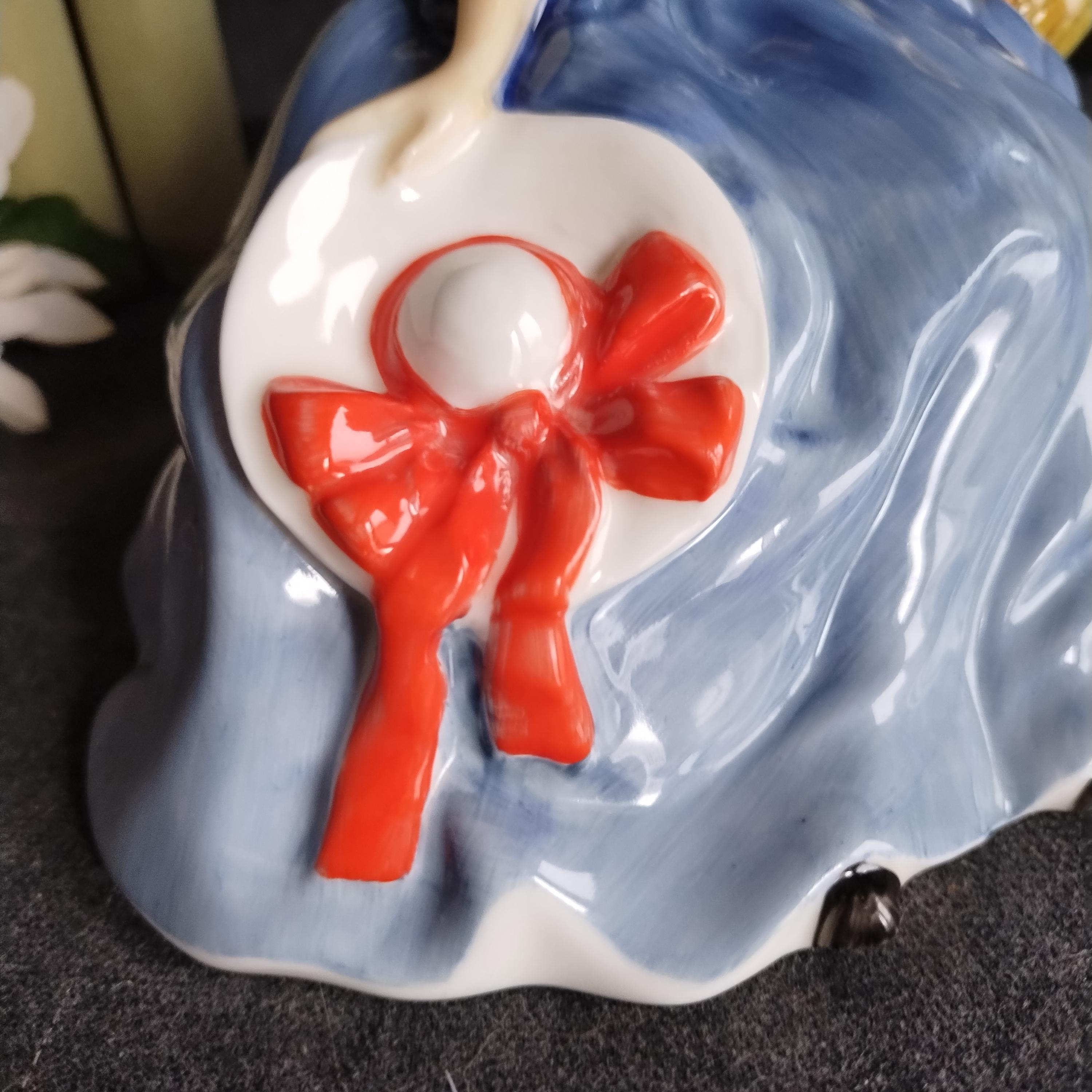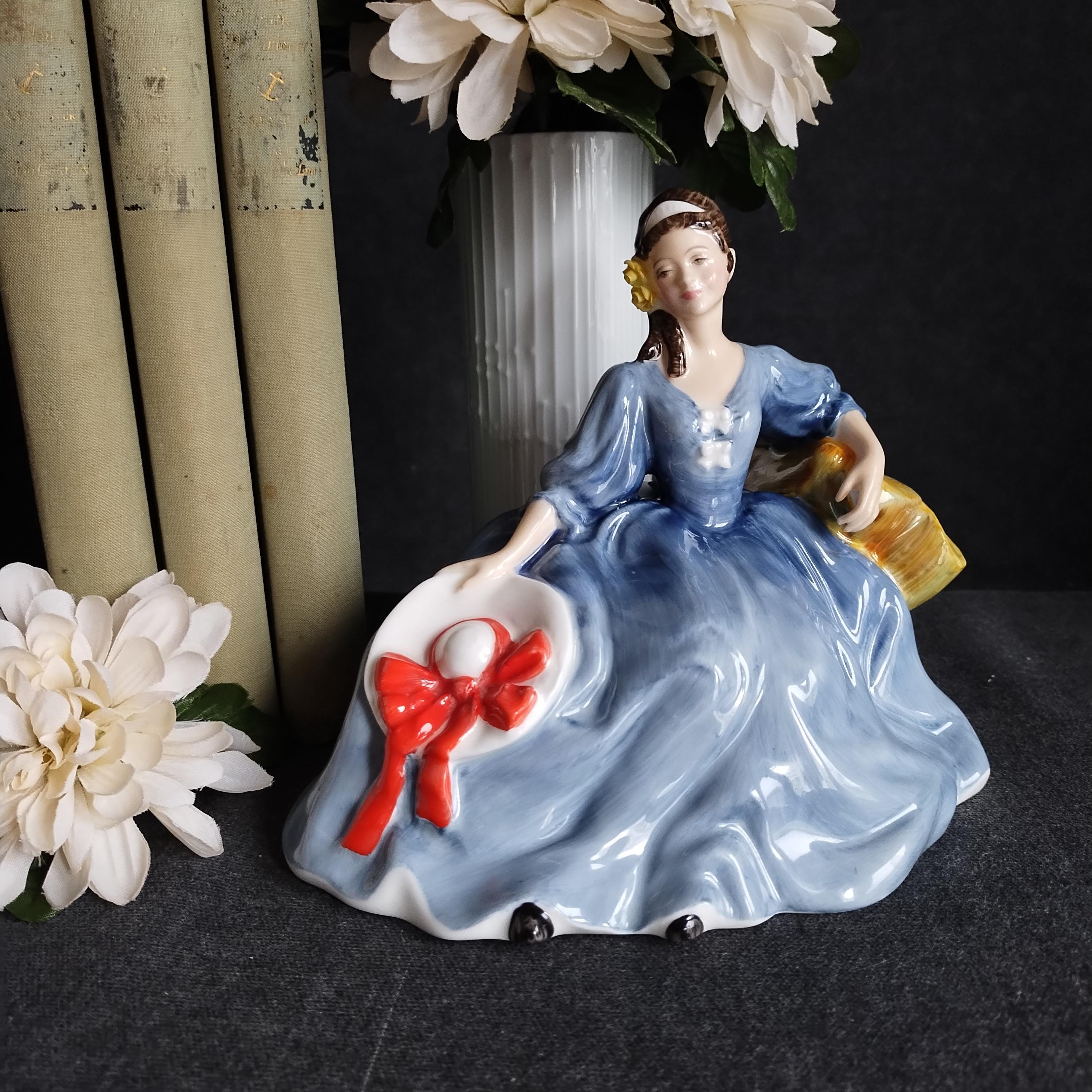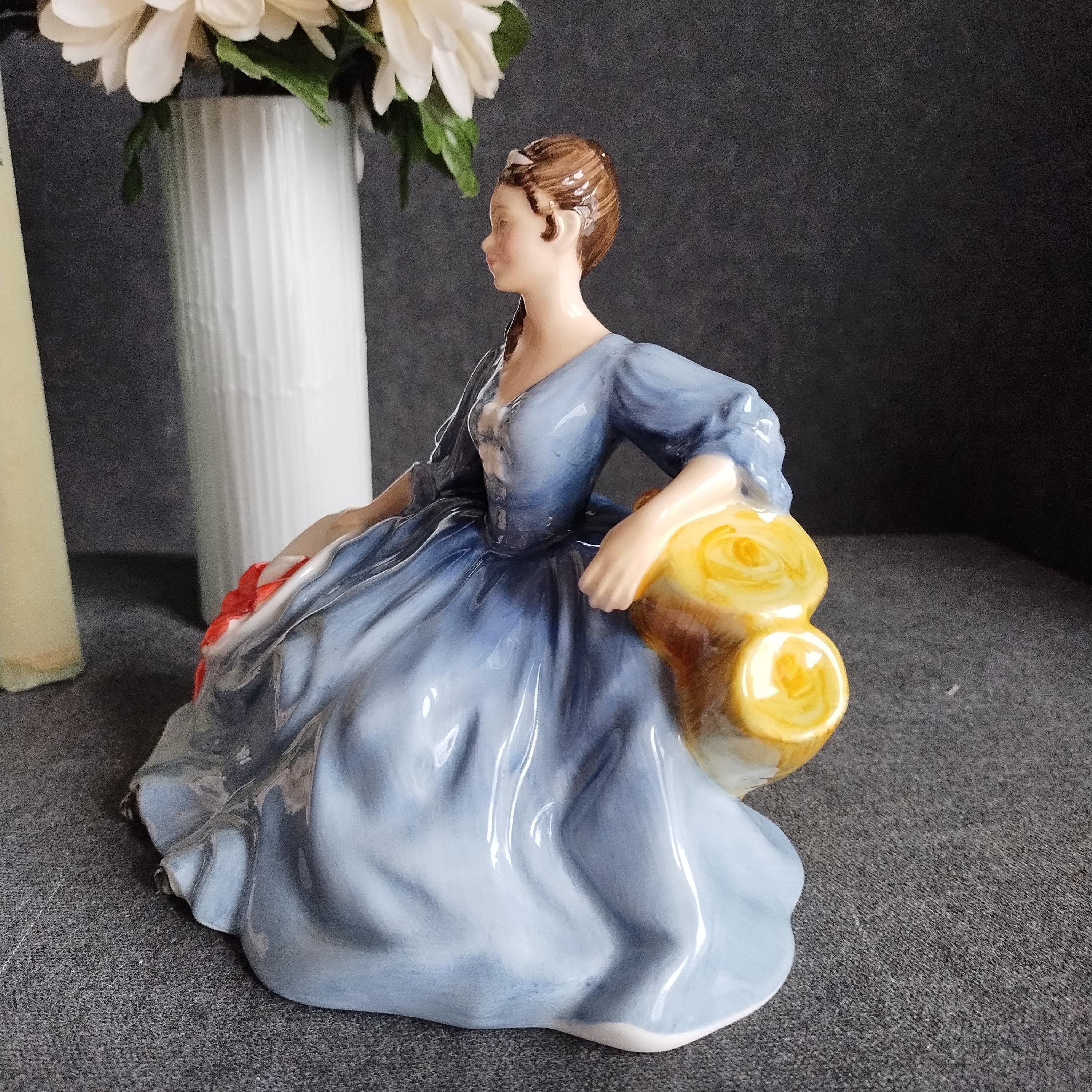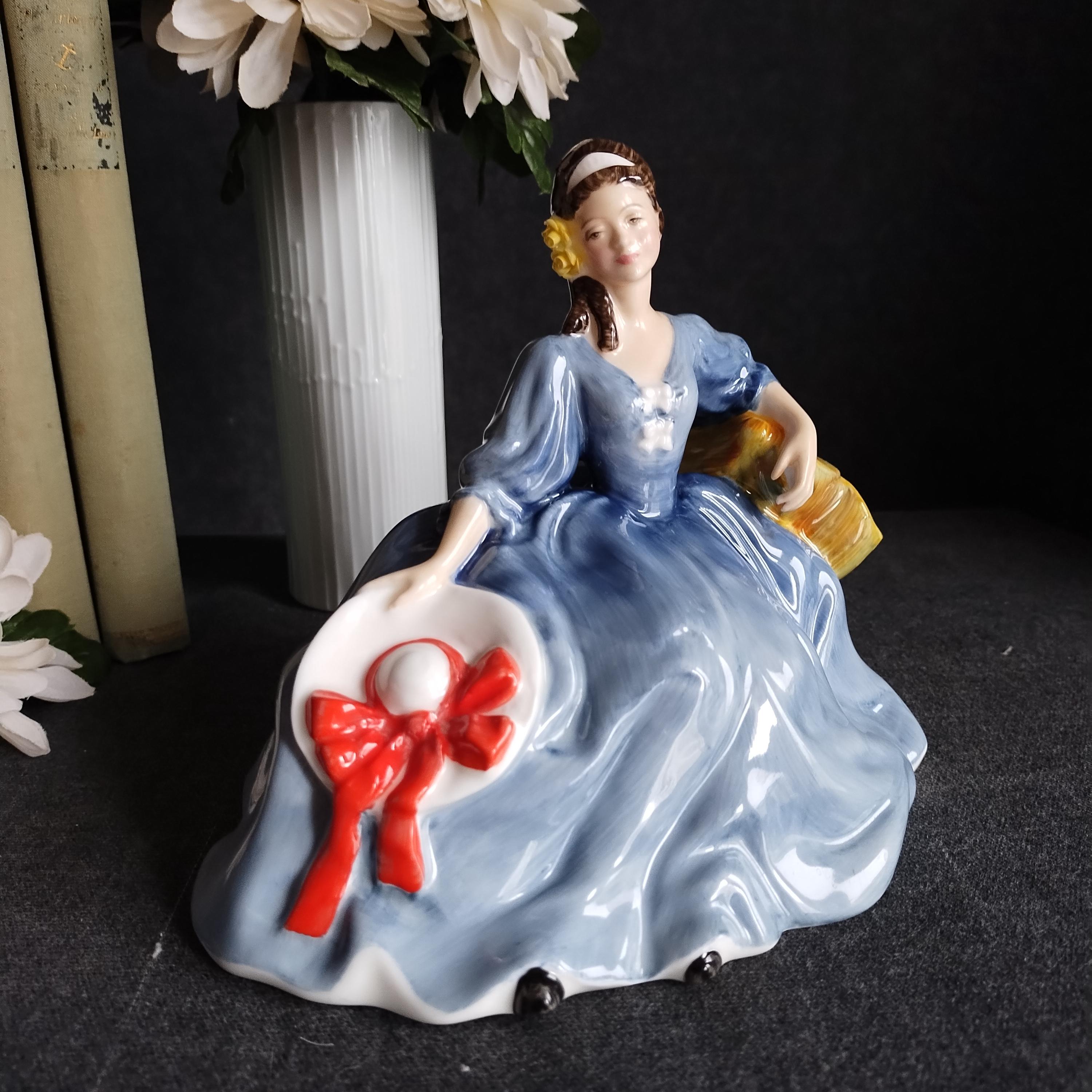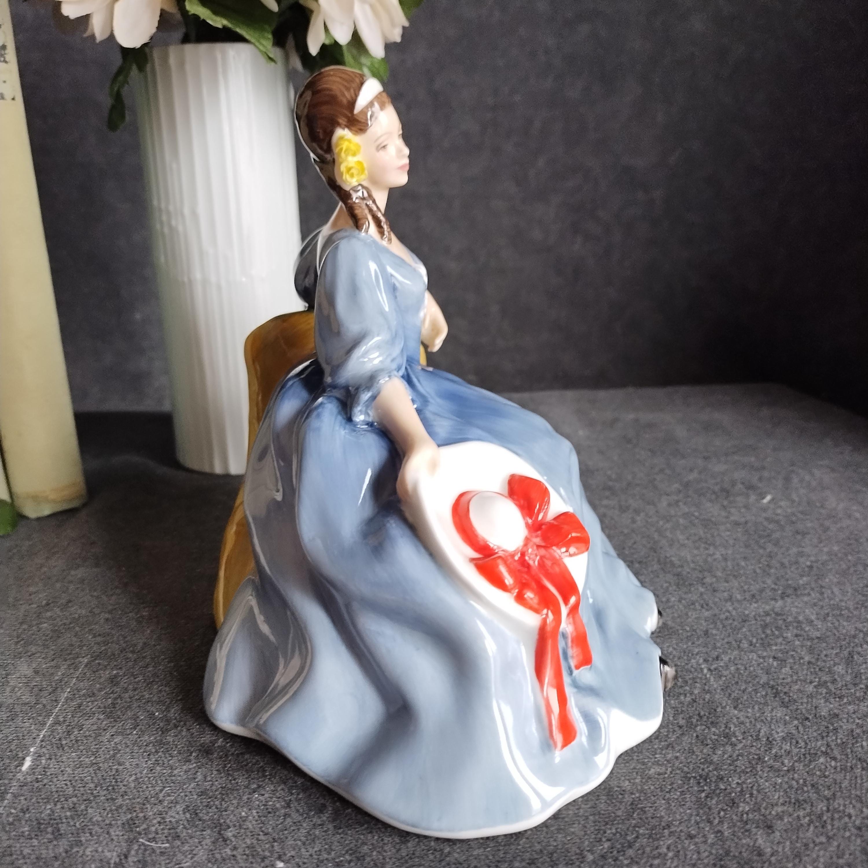 Elyse is wearing a flowing blue gown. She is featured seated on a tree and holding a white hat with red ribbon. Elegant yellow roses adorn her dark hair. Condition is excellent - no chips, cracks, repairs, or age related crazing to the glaze.