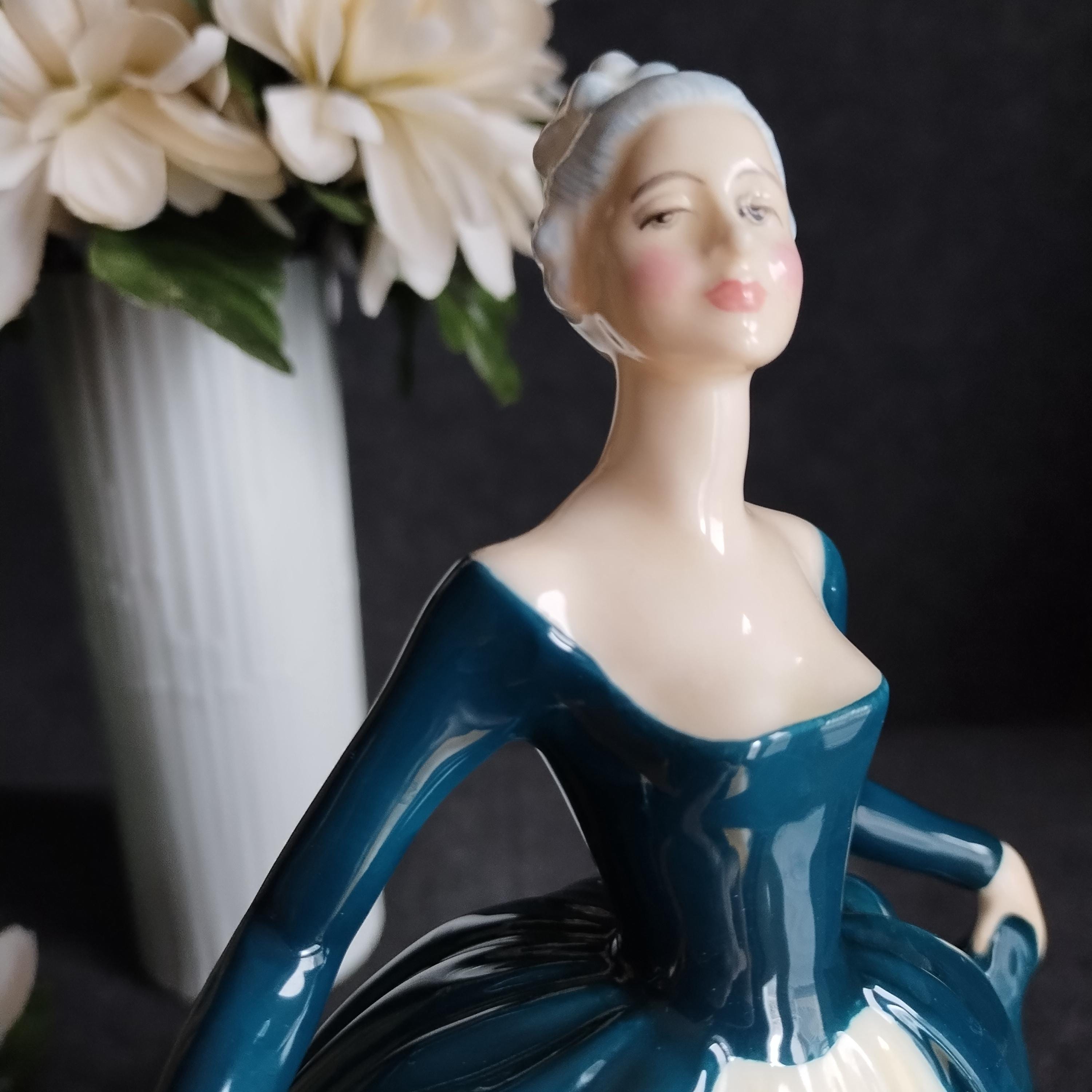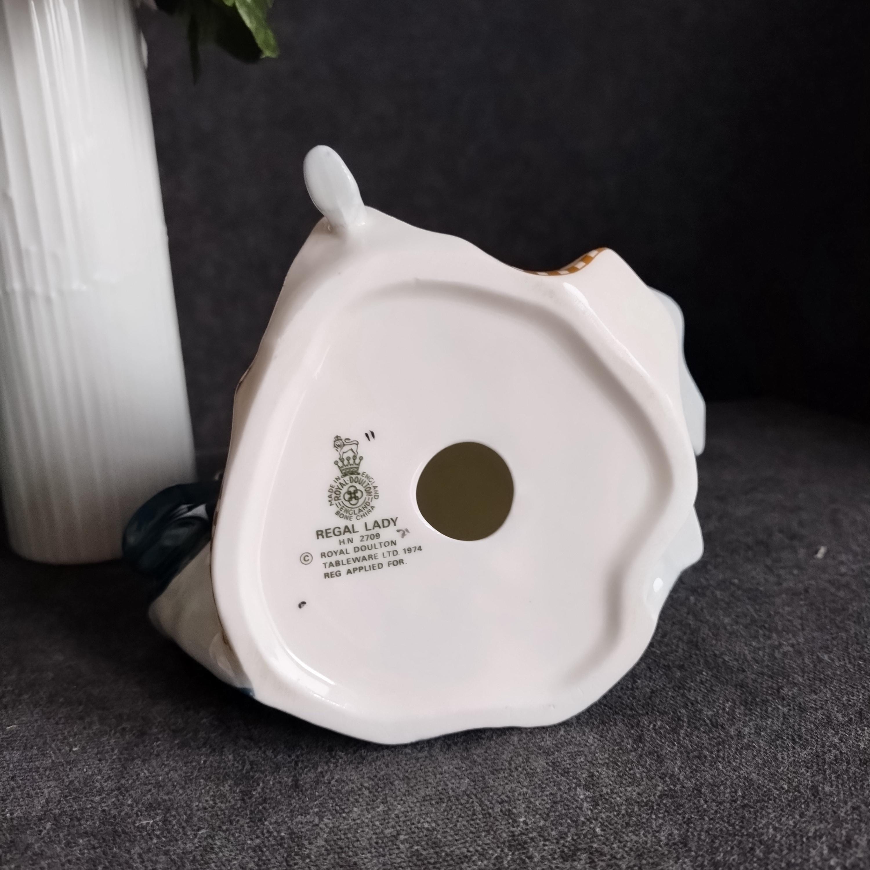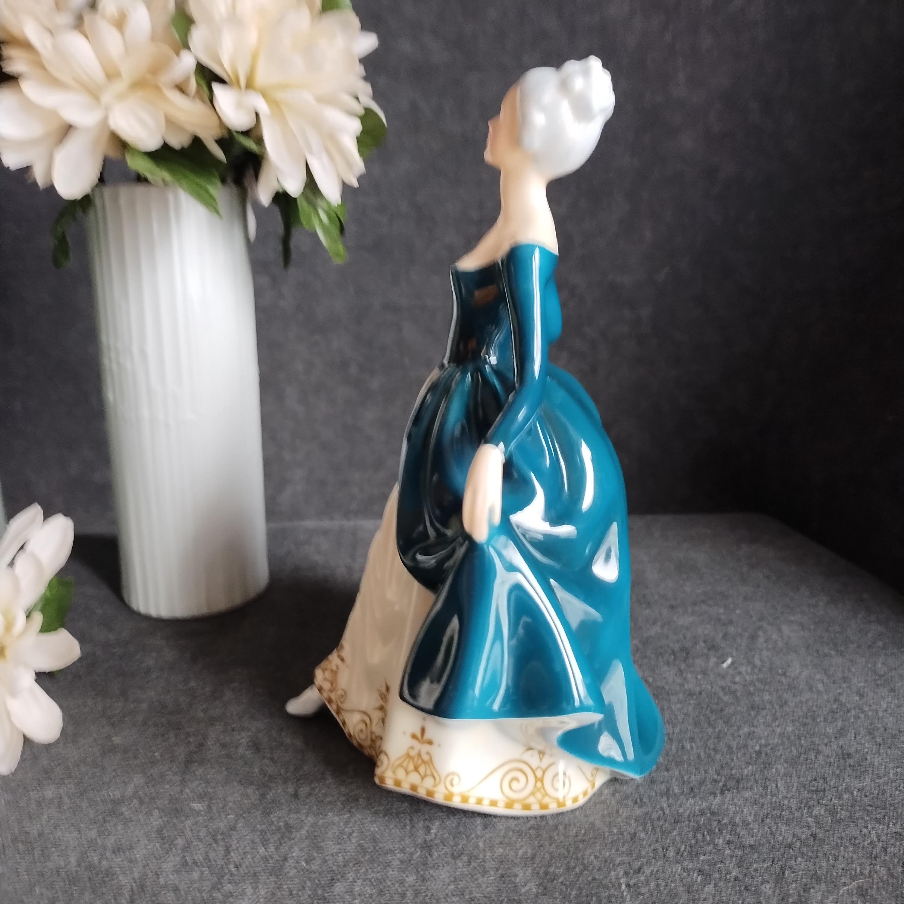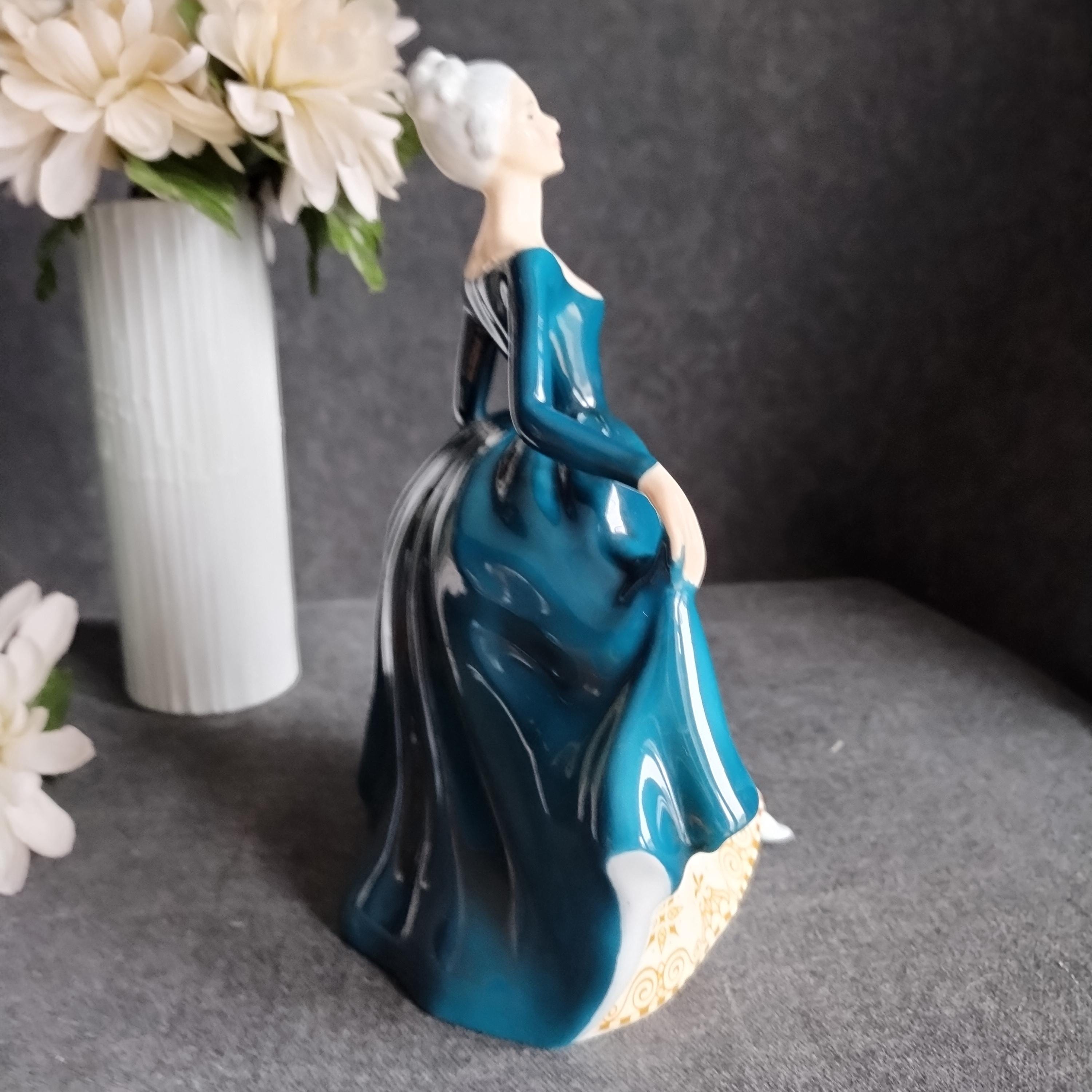 Regal Lady has silver-grey hair and is wearing a teal gown layered over a cream skirt. Lovely detailed gold design on the hemline. Condition is excellent no chips, cracks, repairs, or age-related crazing in the glaze.
