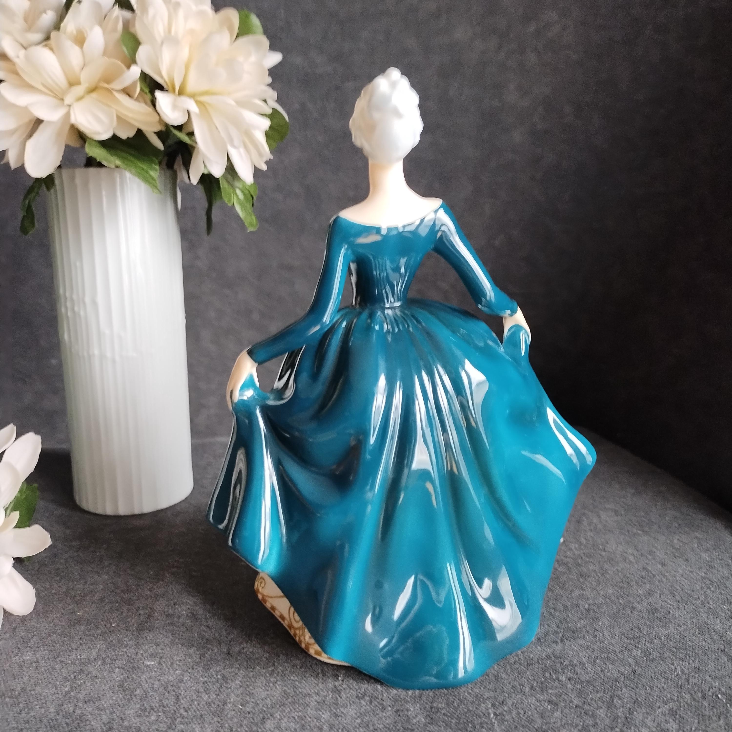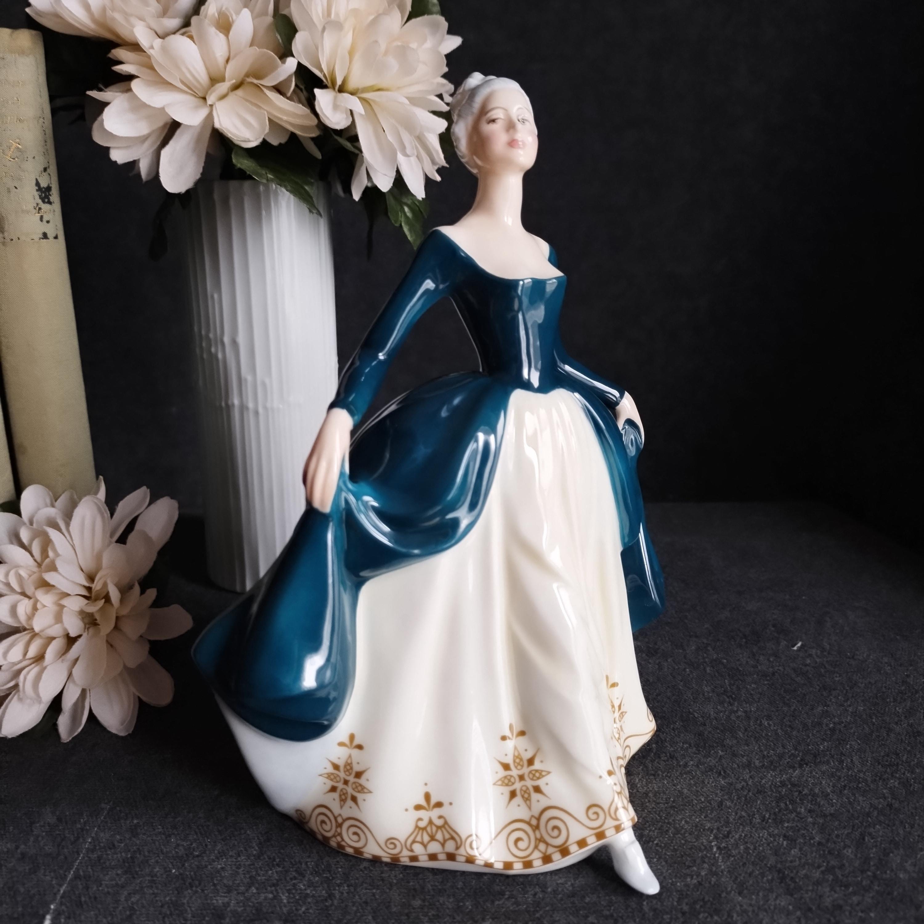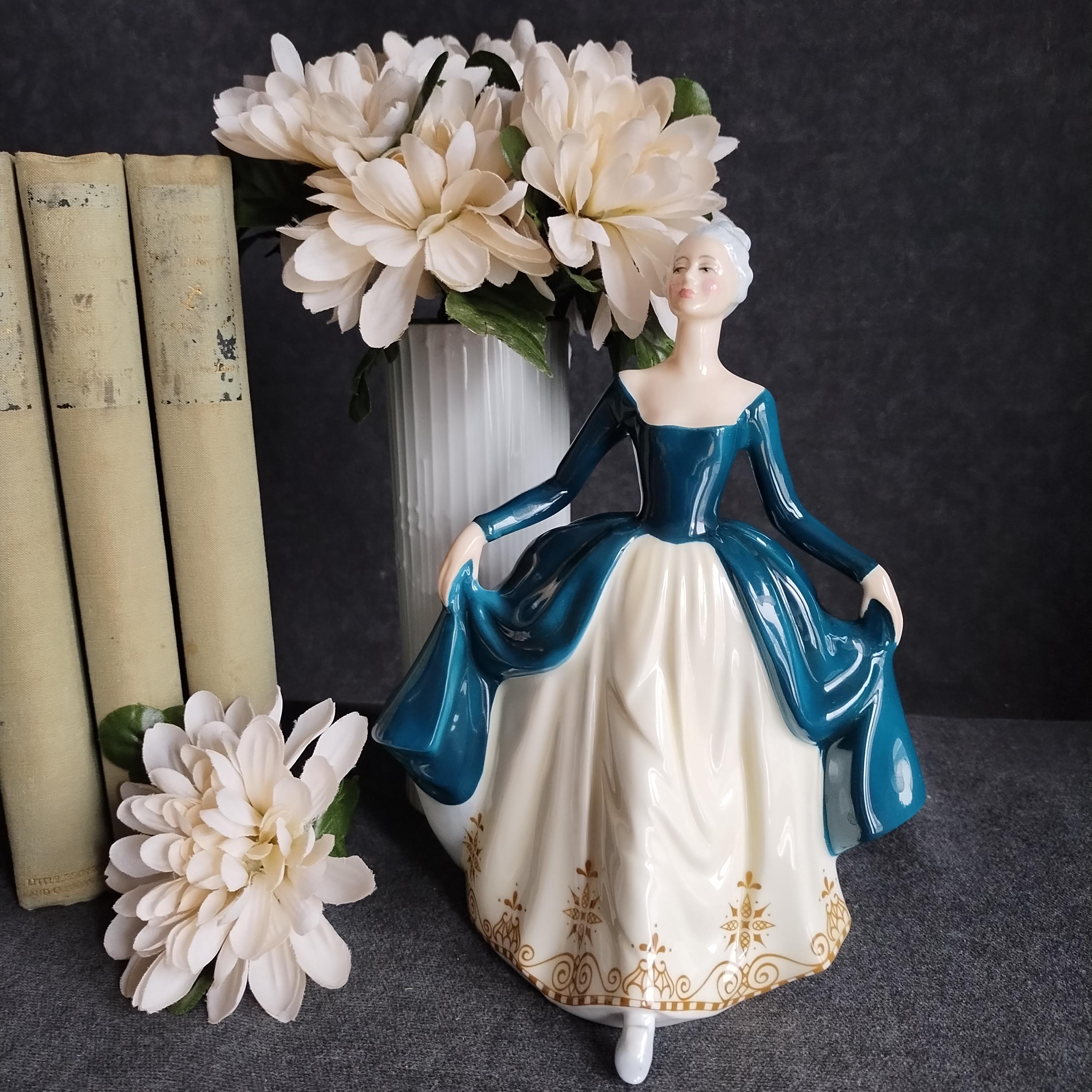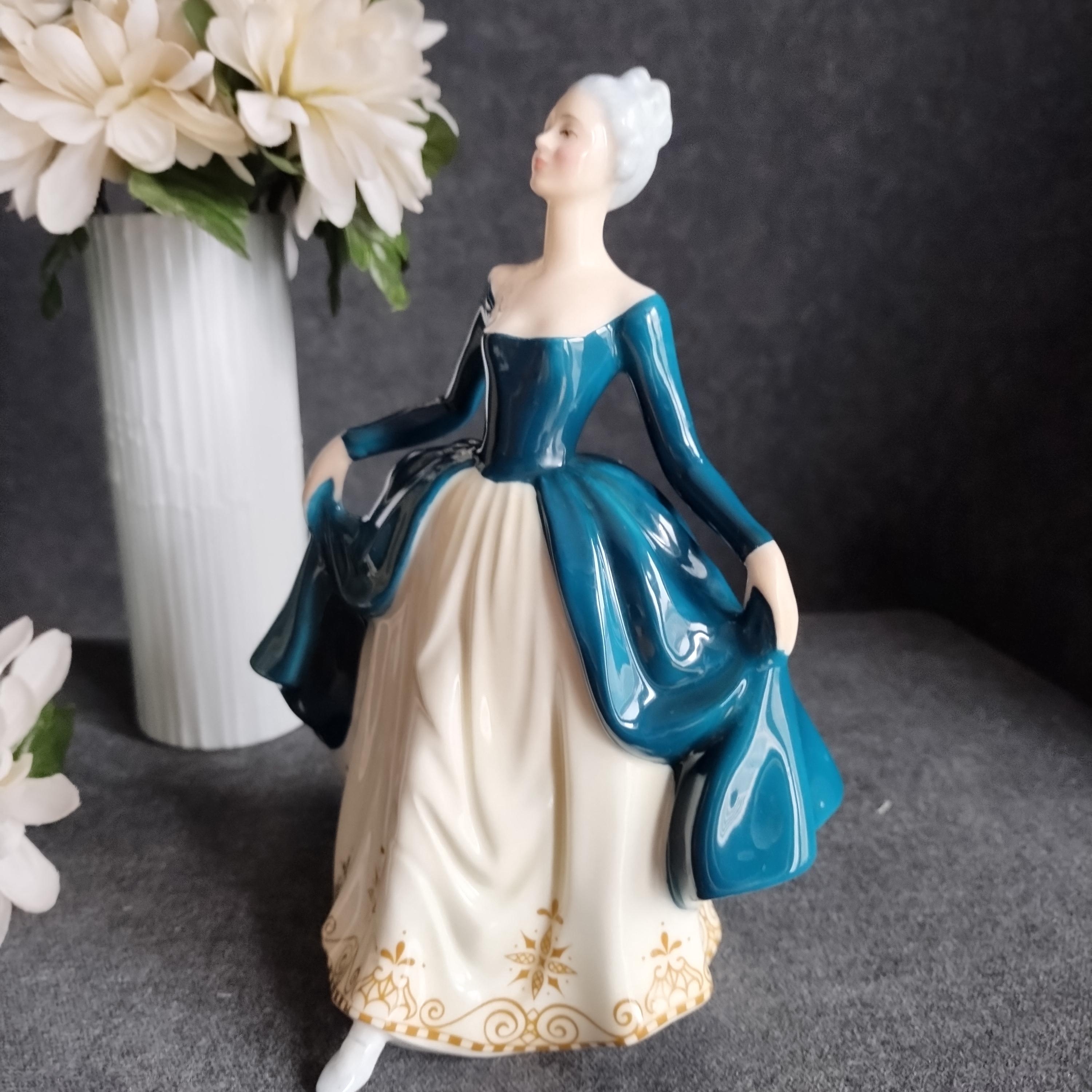 Regal Lady has silver-grey hair and is wearing a teal gown layered over a cream skirt. Lovely detailed gold design on the hemline. Condition is excellent no chips, cracks, repairs, or age-related crazing in the glaze.