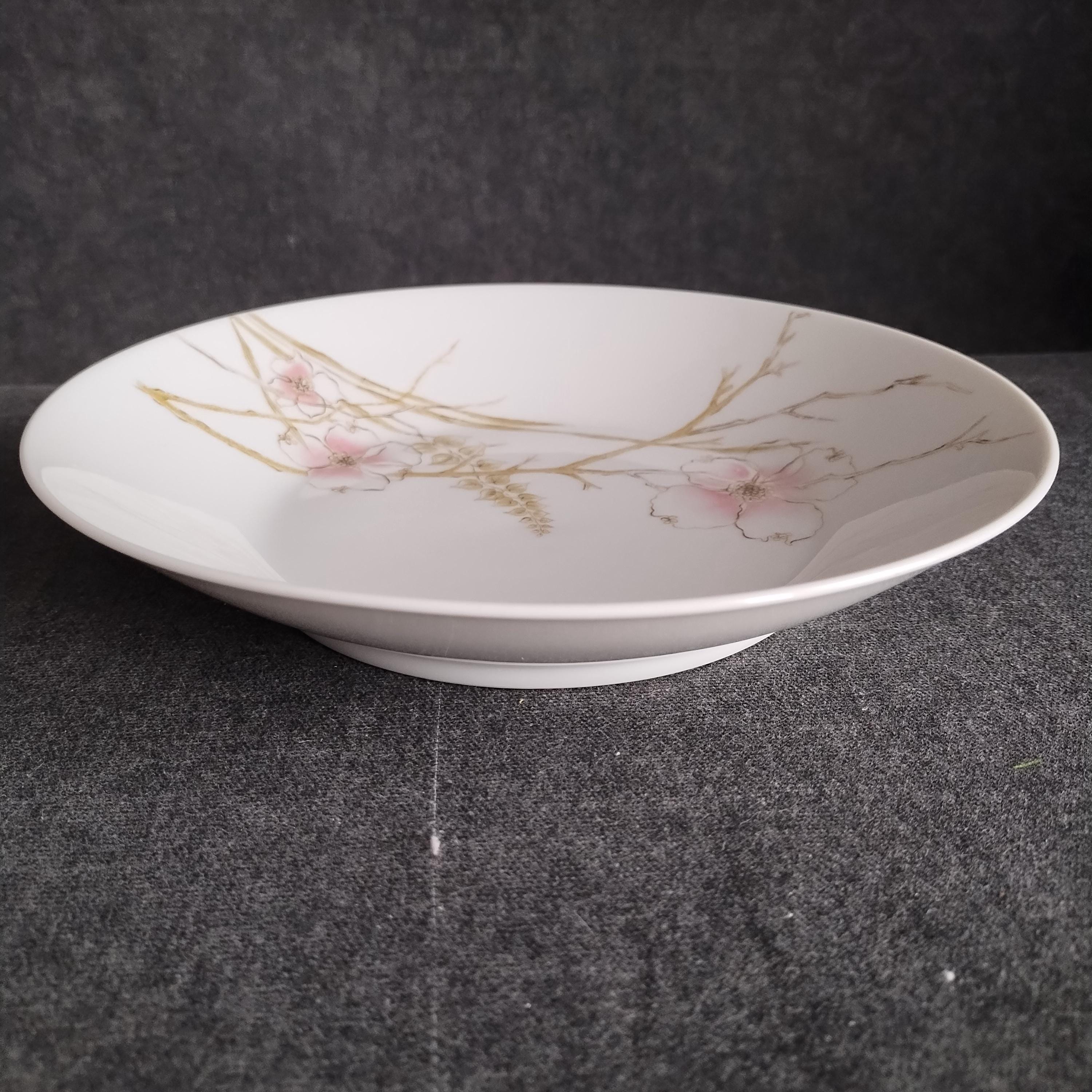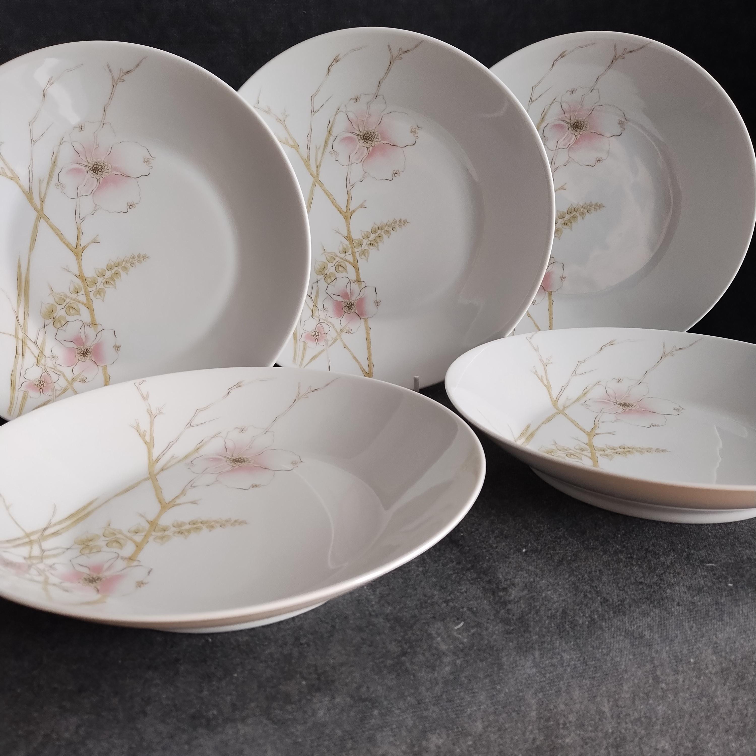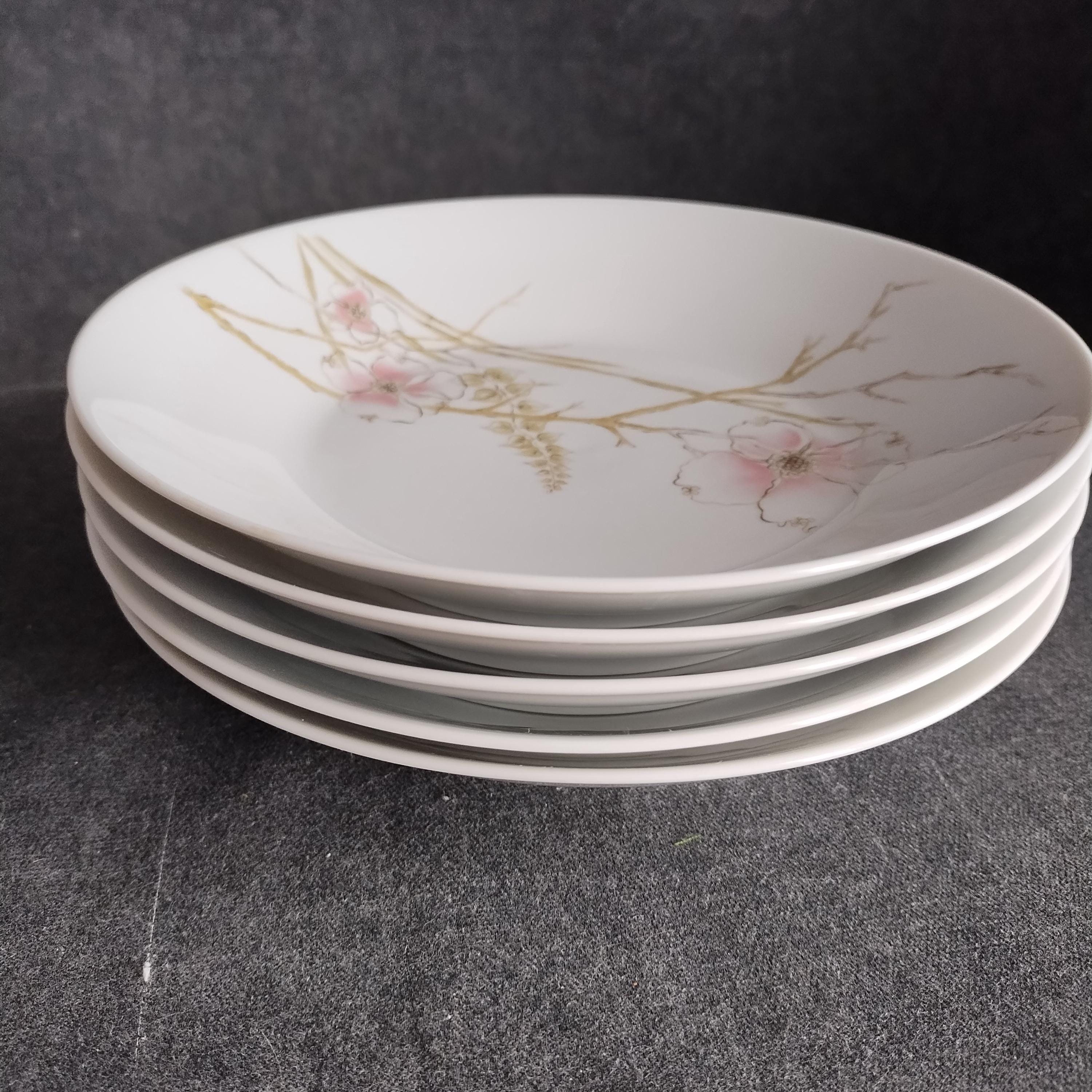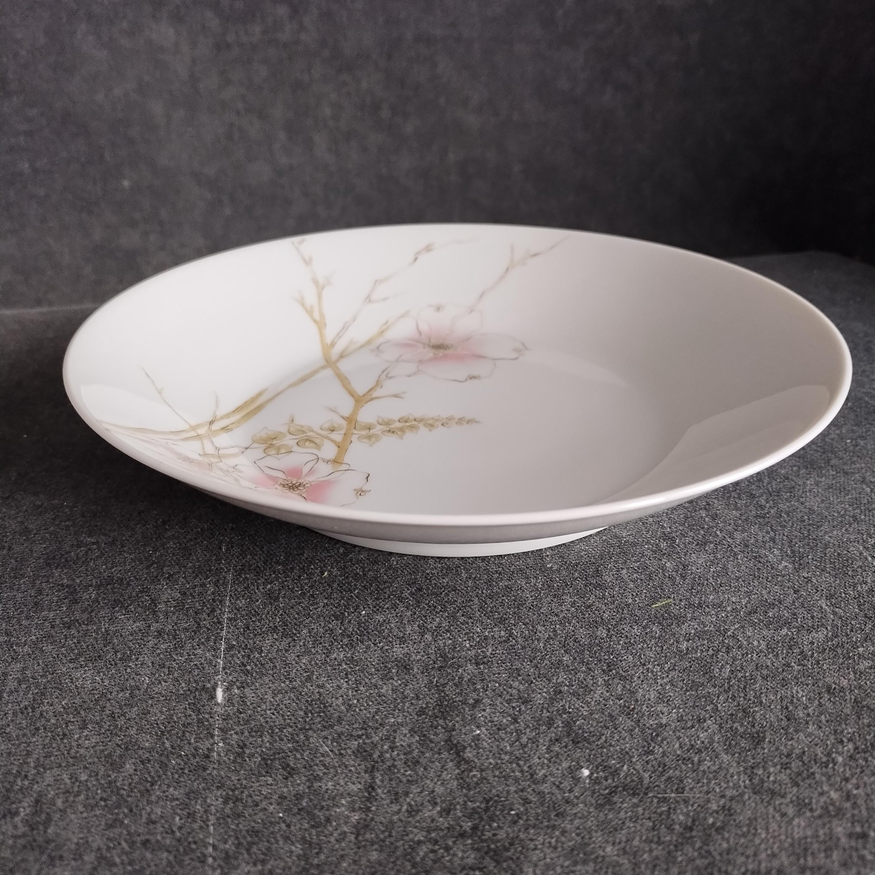 These Rosenthal bone china dishes will add a touch of luxury to your dining table. "BLUSH" features soft pink Dogwood blossoms and tan stems on a crisp white background. Manufactured in Germany from 1963 to 1964. Condition is excellent - no chips, cracks, repairs, or crazing. Minor surface wear consistant with age and very gentle use.